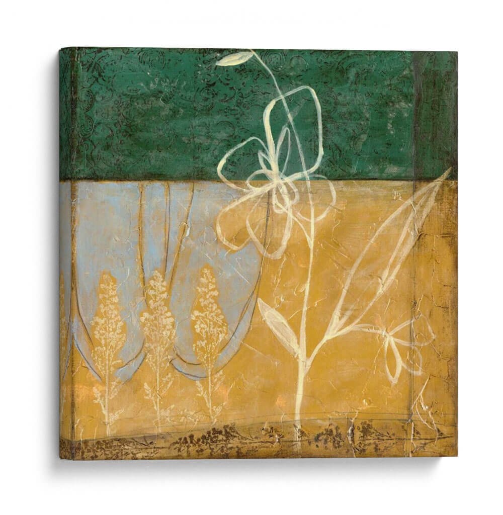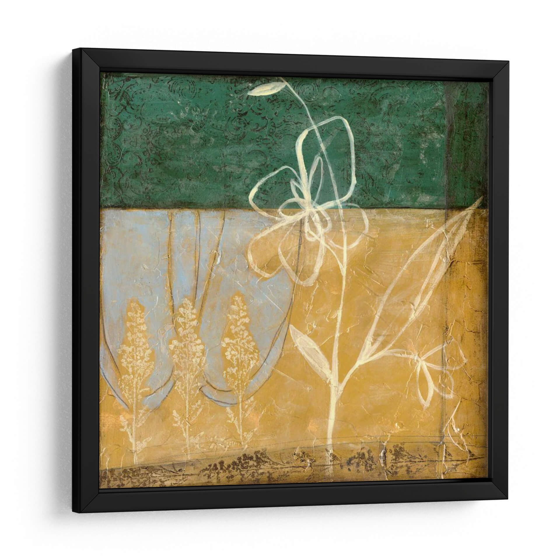 Sumérgete en la delicadeza de "Pequeñas Flores Silvestres Presionadas II", una cautivadora obra de arte que captura la esencia efímera de la naturaleza con un toque contemporáneo. La pieza presenta una composición dividida en bandas, donde un vibrante verde texturizado en la parte superior contrasta con un cálido fondo ocre y un suave azul que evoca el cielo o el agua. Sobre este lienzo, emergen delicados trazos blancos que delinean flores y tallos, con un estilo que recuerda a dibujos botánicos esquemáticos pero llenos de vida. Tres formaciones florales estilizadas en tonos claros se presentan en el centro, mientras que una flor principal, con pétalos etéreos, domina el lado derecho, sugiriendo movimiento y crecimiento. La artista Jennifer Goldberger utiliza una paleta de colores terrosos y naturales, complementada con el verde profundo y el azul claro, creando una atmósfera de tranquilidad y conexión con el exterior. Ideal para añadir un toque orgánico y artístico a cualquier sala de estar, dormitorio o estudio, este cuadro decorativo invita a la contemplación y aporta una sensación de serenidad y belleza sutil a tu hogar u oficina. Su estilo único lo convierte en una pieza de conversación, perfecta para quienes aprecian el arte botánico moderno y las composiciones evocadoras.