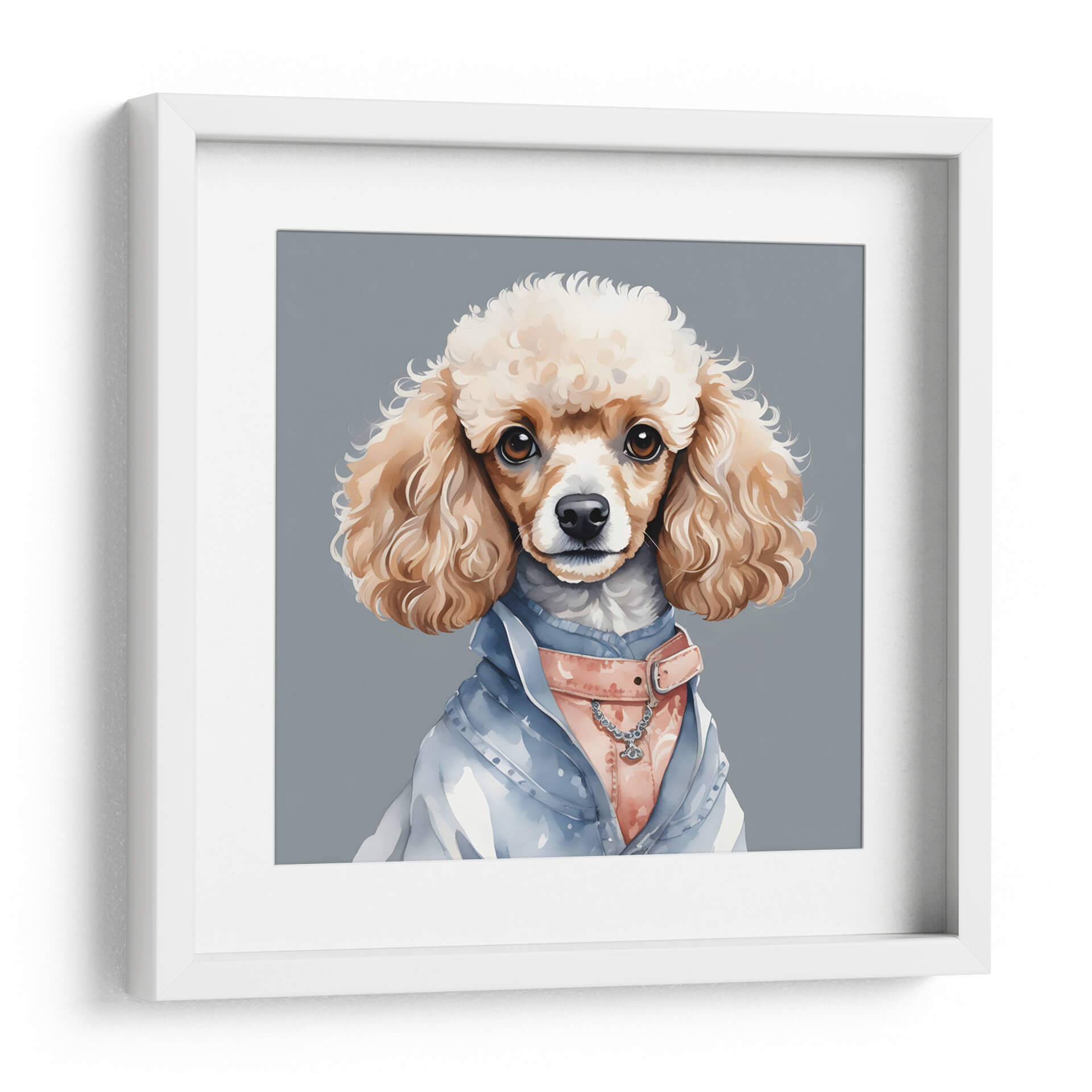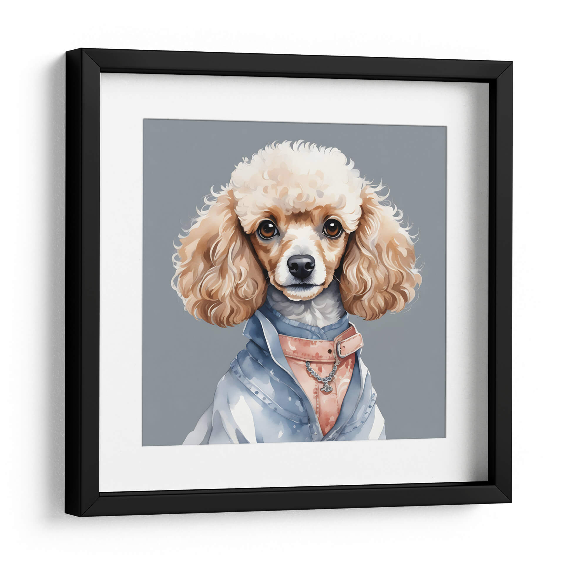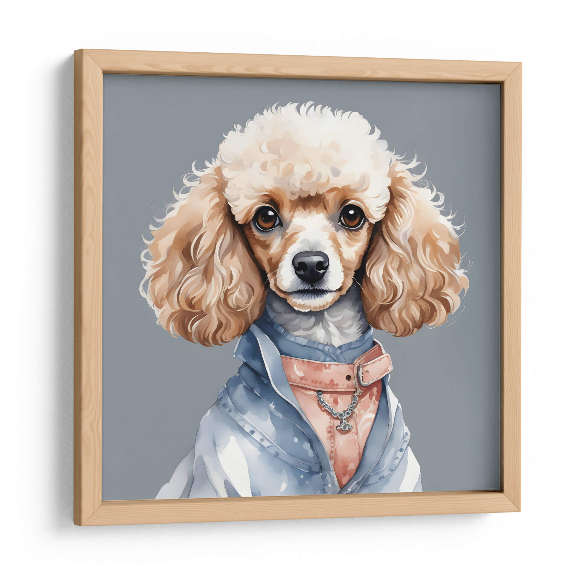 Este encantador cuadro decorativo presenta un retrato estilizado de un caniche hembra, capturando su esencia con un toque de moda y sofisticación. La obra se centra en el rostro expresivo del perro, con ojos grandes y curiosos que parecen invitar a la contemplación. Su pelaje, representado con trazos delicados que evocan la técnica de acuarela, se funde en tonos cálidos de caramelo y beige, contrastando sutilmente con el fondo de un gris sereno y moderno. El caniche viste una chaqueta vaquera informal sobre una blusa de color coral, adornada con un collar de cuero a juego y una fina cadena plateada, añadiendo un aire de tendencia y personalidad a la pieza. La paleta de colores es equilibrada, utilizando tonos suaves y una iluminación que realza los detalles, creando una atmósfera acogedora y a la vez elegante. Este cuadro decorativo es perfecto para añadir un punto de calidez y carácter a cualquier espacio, desde una sala de estar moderna hasta una oficina con un toque chic. Ideal para amantes de los perros y de las piezas de arte que combinan ternura con estilo contemporáneo.