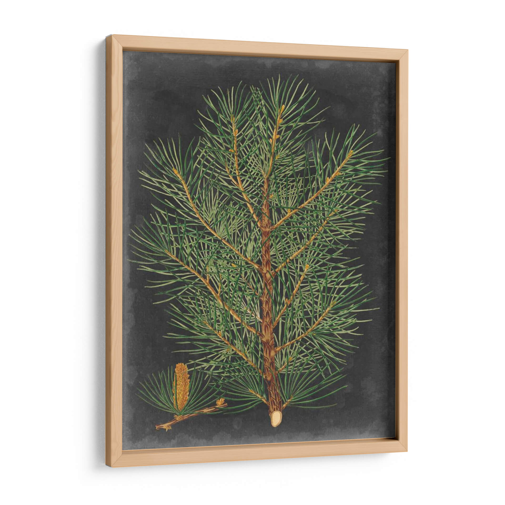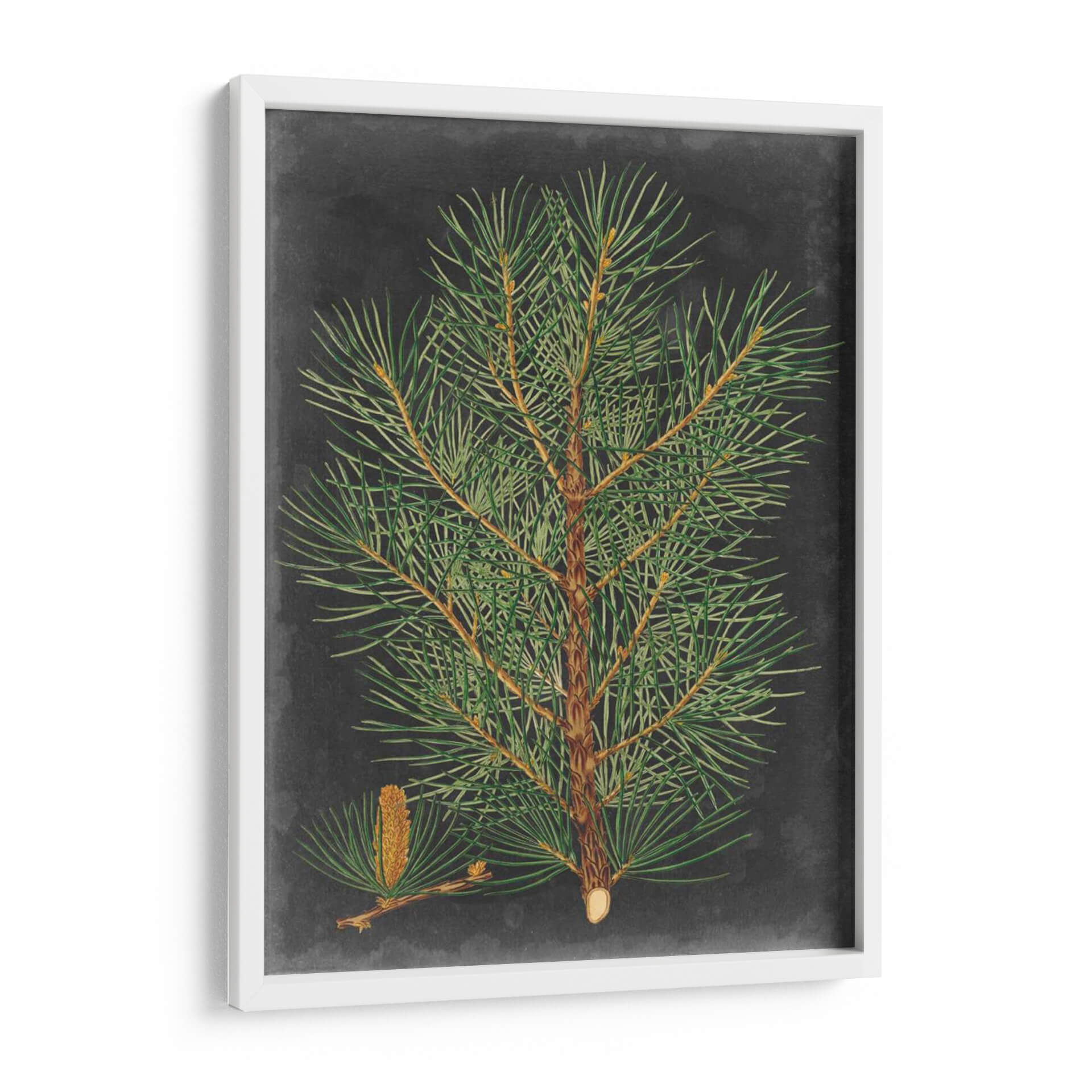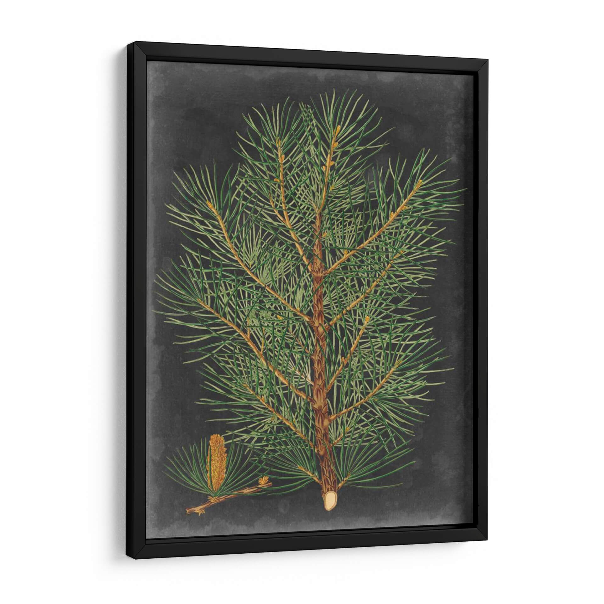 Sumérgete en la serena belleza de la naturaleza con este cautivador cuadro decorativo de una rama de pino, titulado "Pino Dramático II" por Vision Studio. La obra presenta una detallada ilustración botánica de una rama de pino frondosa, completa con sus agujas verdes vibrantes y un cono incipiente, todo ello sobre un fondo texturizado de pizarra gris oscuro. La rica paleta de verdes intensos y marrones terrosos, contrastada con el profundo fondo, crea una atmósfera de calma y elegancia natural. El estilo, que evoca a los grabados botánicos clásicos con un toque contemporáneo, aporta un aire de sofisticación atemporal a cualquier espacio. Este cuadro es ideal para quienes buscan infundir a sus hogares u oficinas una conexión con el mundo natural, añadiendo un toque de tranquilidad y refinamiento. Su composición centrada y los detalles intrincados lo convierten en un punto focal sereno y a la vez intrigante, perfecto para salas de estar, estudios o dormitorios que anhelan una dosis de naturaleza estilizada y un ambiente contemplativo. Un lienzo que captura la fuerza y la delicadeza del pino.