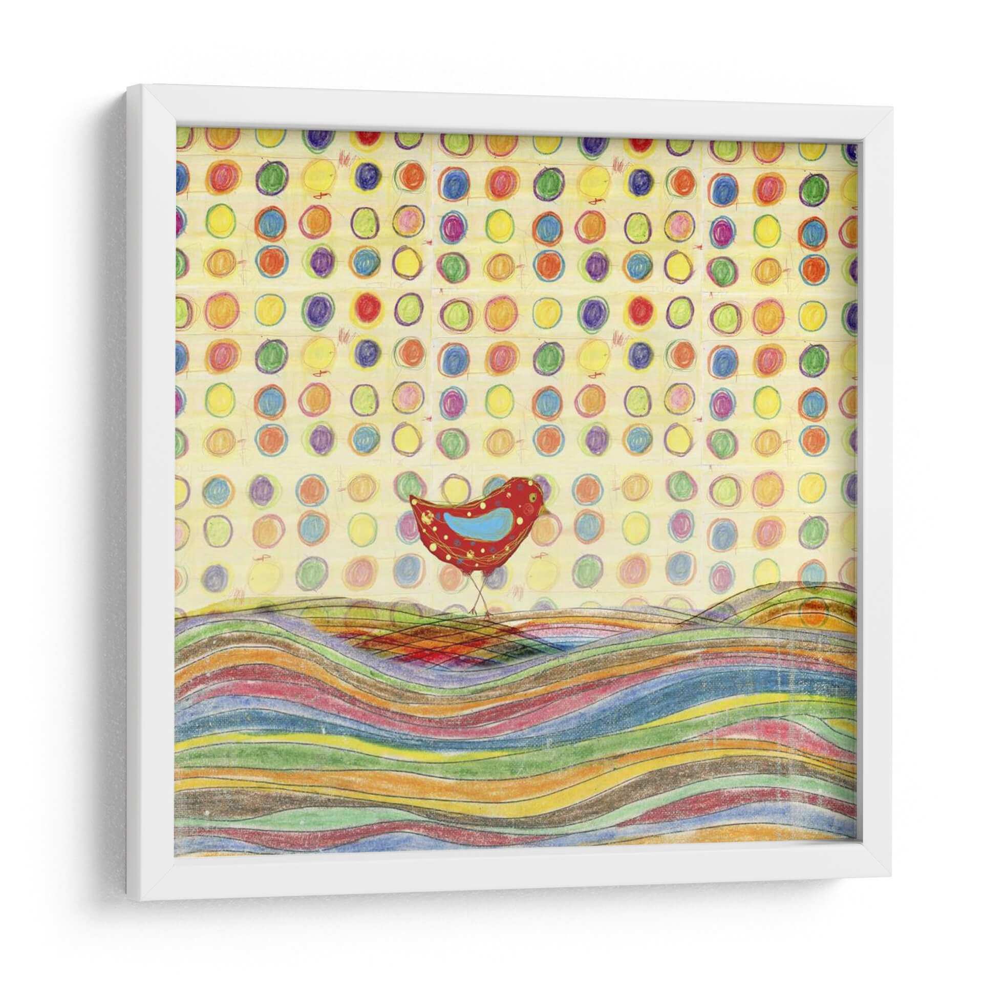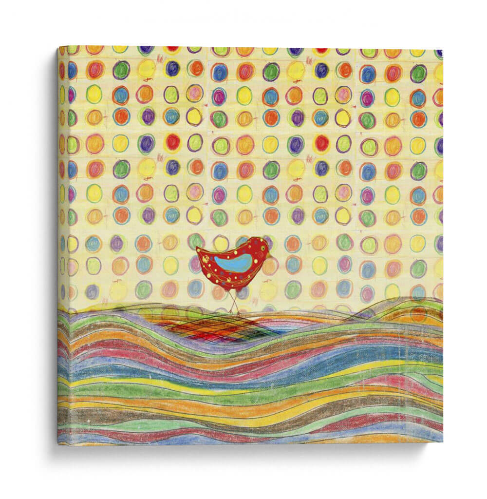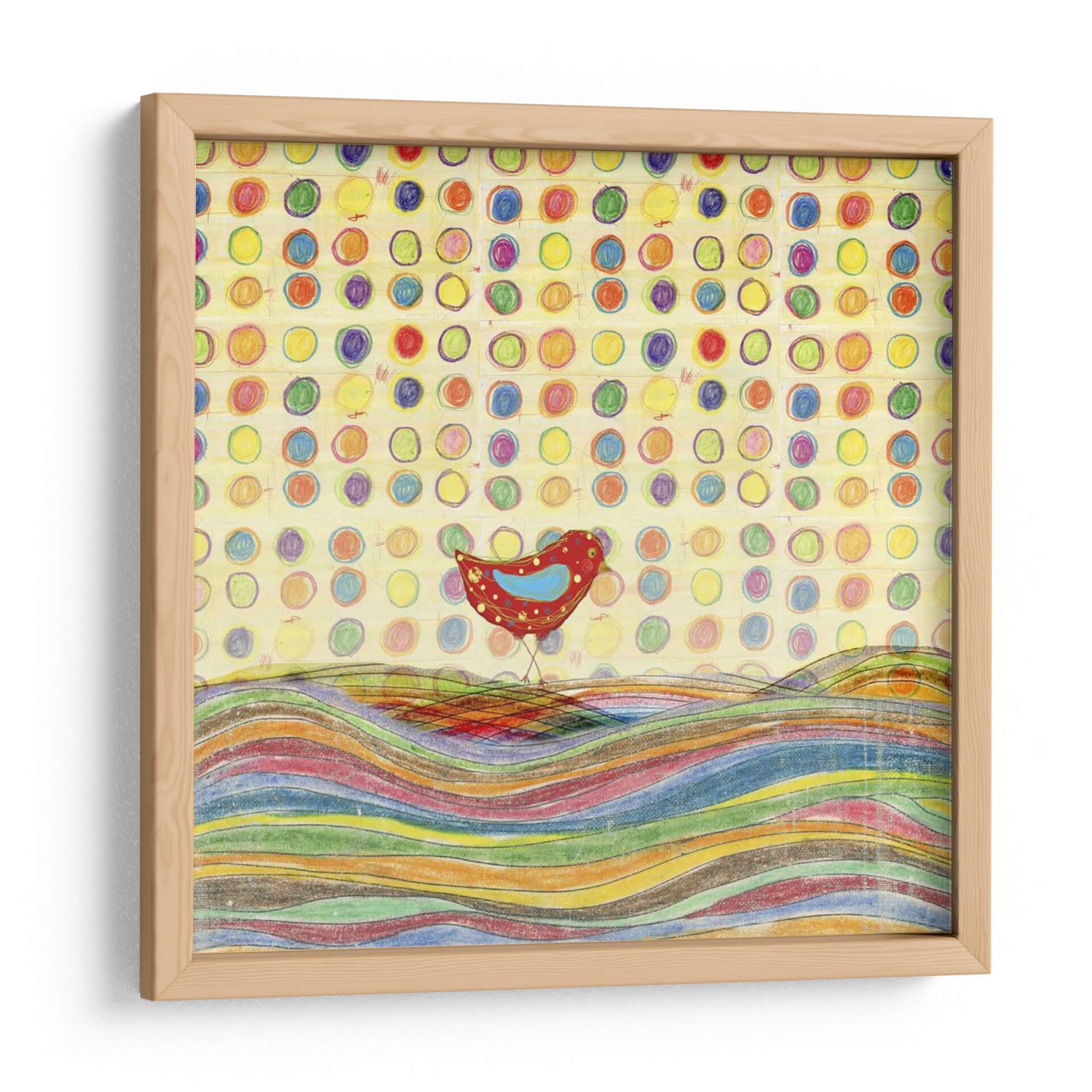 Sumérgete en un mundo de color y fantasía con "Plumas, Puntos Y Rayas Vii", una obra de arte contemporáneo de Ingrid Blixt que irradia alegría y originalidad. Esta pieza cautivadora presenta una composición vibrante donde un simpático pájaro rojo, con un corazón azul en el pecho, se alza sobre un paisaje ondulado de rayas multicolores. El fondo está adornado con un patrón repetitivo de círculos en tonos brillantes que evocan un cielo lleno de confeti o burbujas danzantes. La paleta de colores es exuberante y alegre, combinando amarillos cálidos, rojos intensos, azules profundos y una sinfonía de otros tonos que crean una atmósfera lúdica y optimista. El estilo, que combina elementos figurativos con abstracción y texturas sutiles, invita a la imaginación del espectador. "Plumas, Puntos Y Rayas Vii" es ideal para añadir un toque de personalidad y color a cualquier espacio, desde una sala de estar moderna hasta un cuarto infantil o una oficina creativa. Este cuadro decorativo es una invitación a la contemplación alegre y un recordatorio de la belleza que se encuentra en los detalles simples y coloridos de la vida.