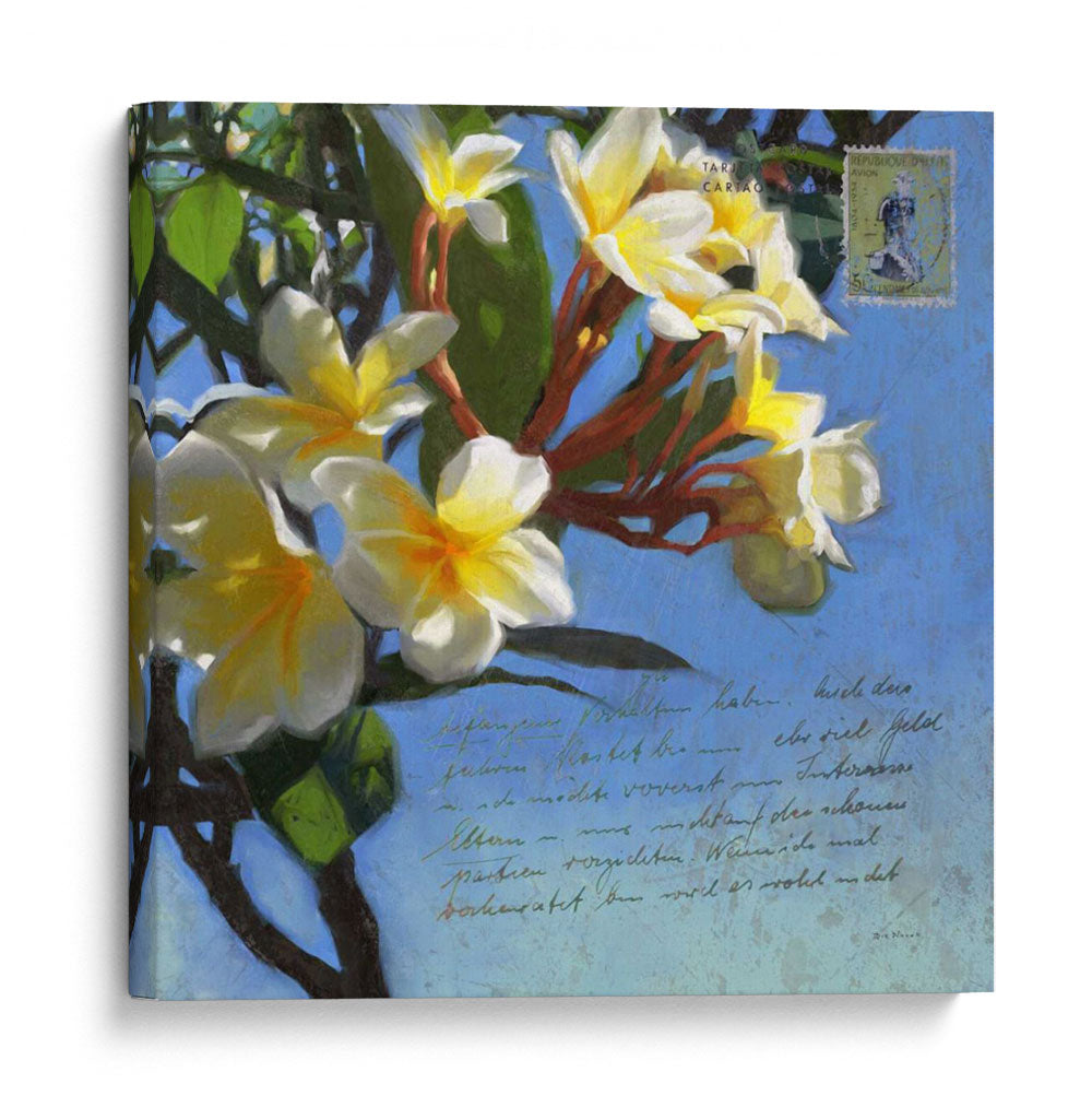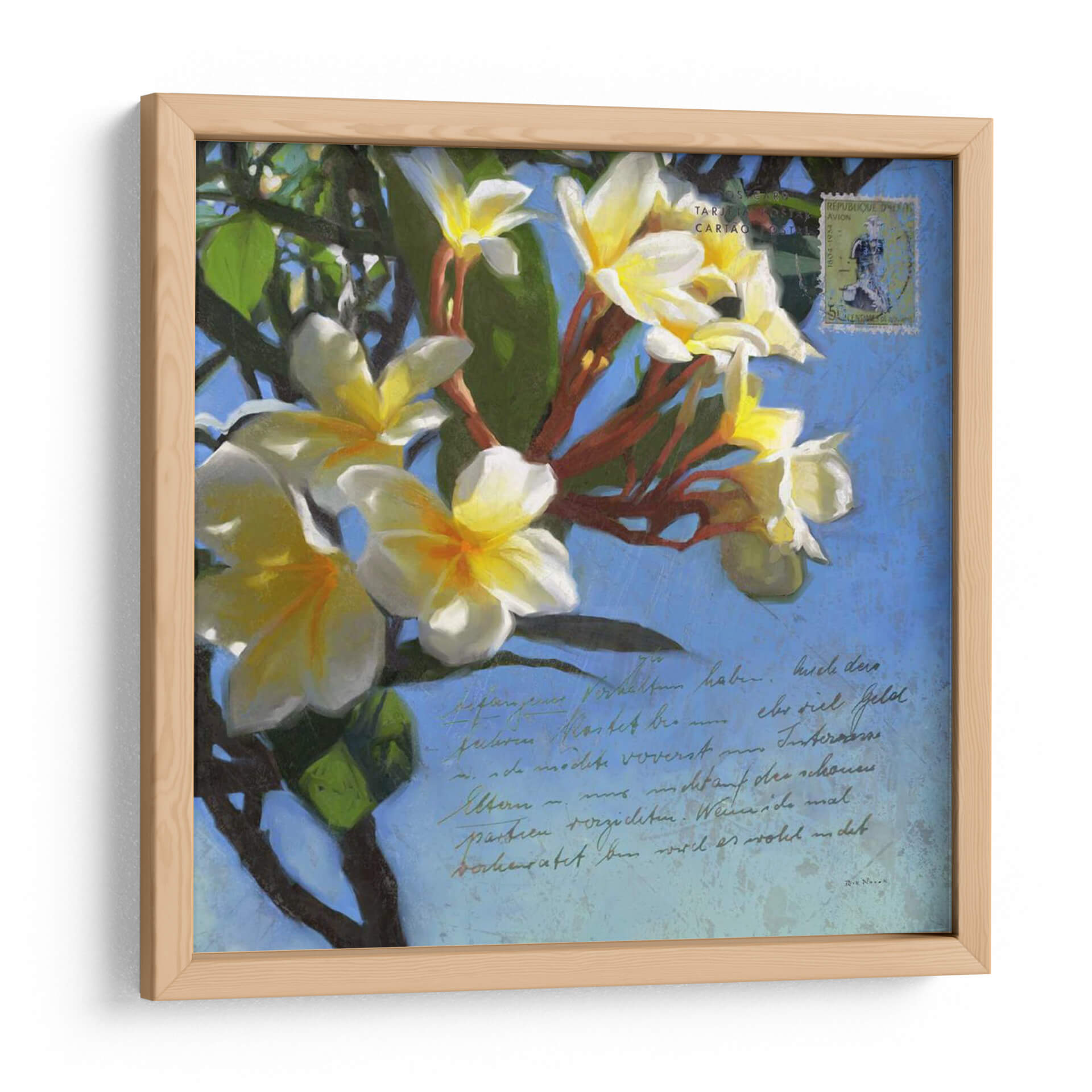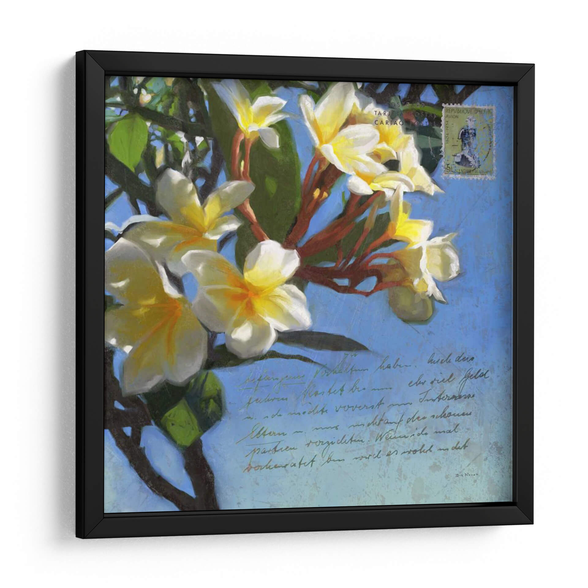 Este cautivador cuadro decorativo, "Plumeria Y Franqueo Iii" de Rick Novak, te transporta a un jardín tropical bañado por el sol con su vibrante representación de flores de plumeria. La obra destaca por su exquisita atención al detalle en los pétalos blancos y amarillos de las flores, contrastando armoniosamente con el profundo azul del cielo y las ricas hojas verdes. La composición se enriquece con un elemento único: una carta antigua o un fragmento de escritura en cursiva que añade una capa de misterio y nostalgia, evoca una sensación de tiempo detenido y la belleza de la comunicación escrita. Las pinceladas sugieren una técnica impresionista o postimpresionista, aportando textura y profundidad a la pieza, invitando al espectador a contemplar la fragilidad y la belleza efímera de la naturaleza. Ideal para añadir un toque de color y serenidad a cualquier espacio, desde una sala de estar luminosa hasta un dormitorio tranquilo o una oficina que busque inspiración. "Plumeria Y Franqueo Iii" es más que una simple decoración de pared; es una invitación a la reflexión y a la apreciación de la belleza en los detalles, perfecta para quienes buscan arte que cuente una historia y evoque emociones.