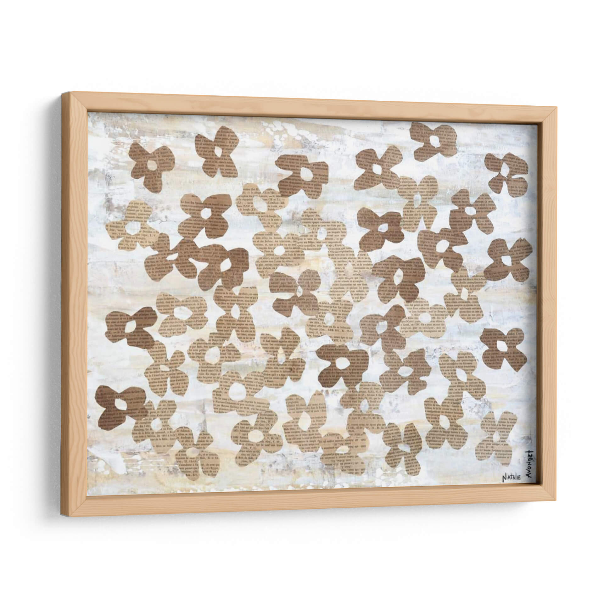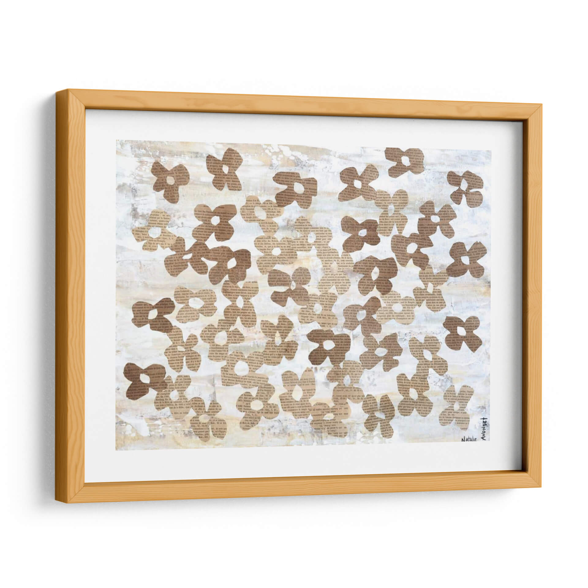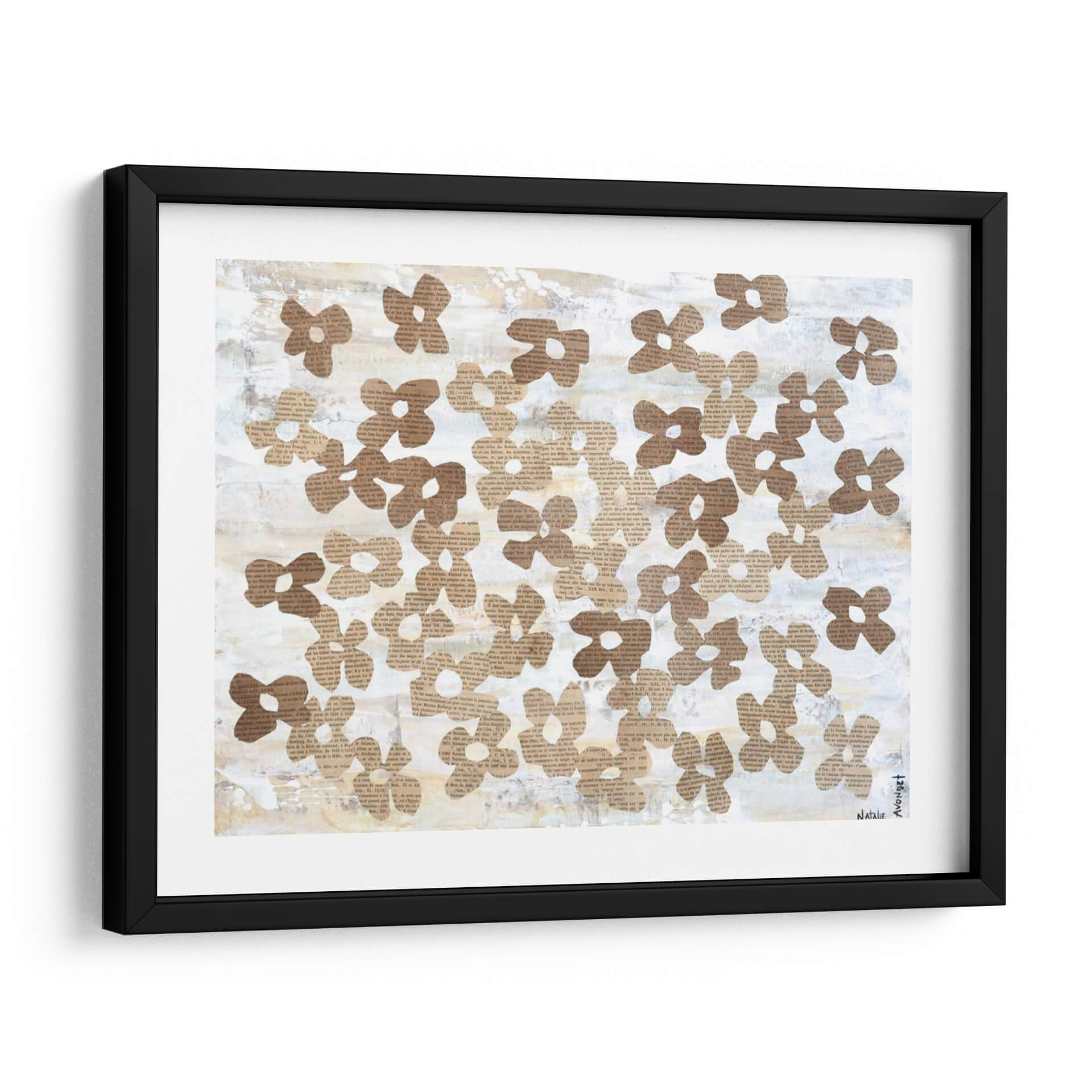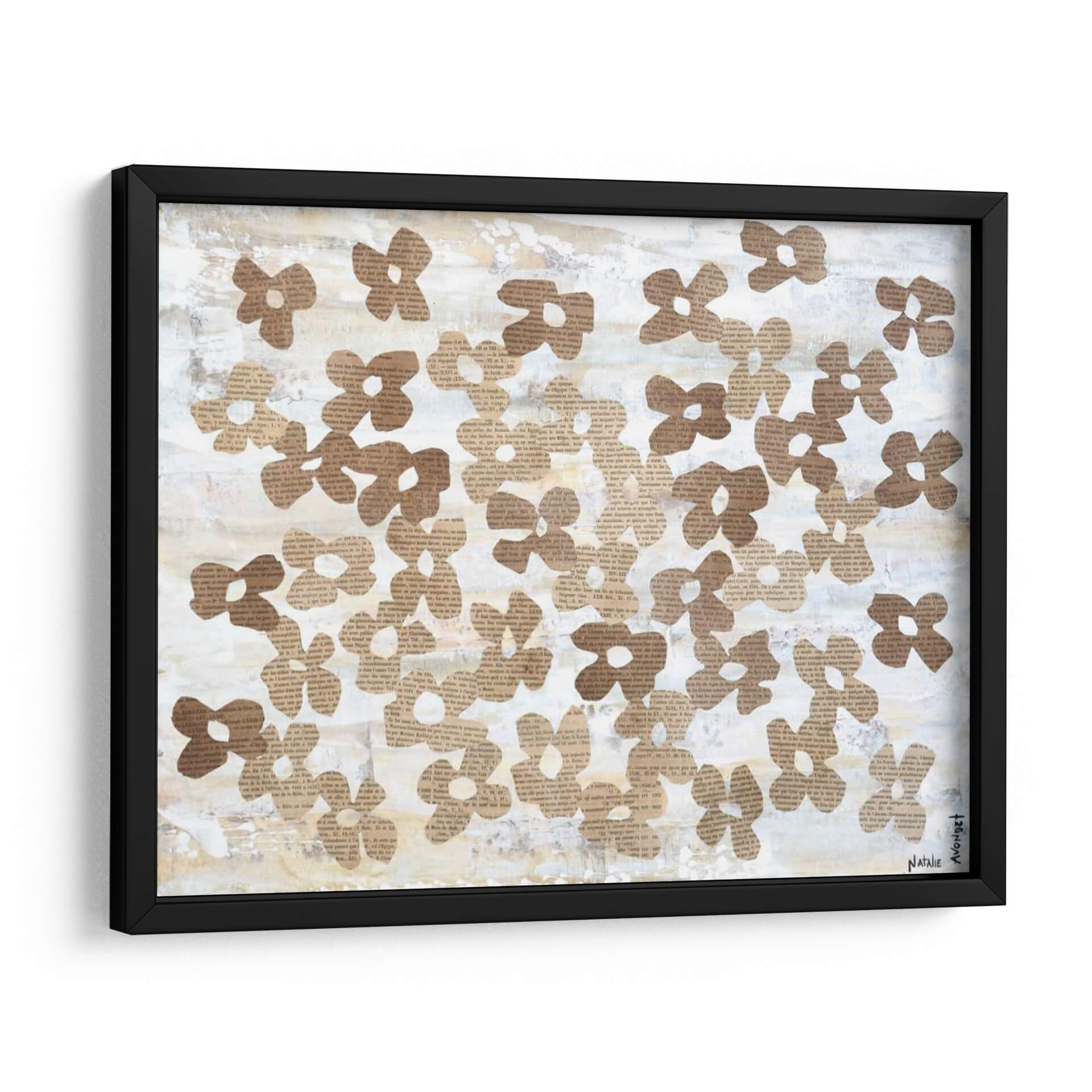 Embellece tu espacio con "Posías Estampadas I", una obra de arte cautivadora de Natalie Avondet. Esta pieza presenta un diseño intrincado de flores en tonos tierra superpuestas sobre un fondo texturizado que evoca páginas de libros antiguos. La paleta de colores, dominada por suaves tonos marrones y blancos cremosos con toques sutiles de ocre, crea una atmósfera de calma y nostalgia, perfecta para añadir un toque de serenidad a cualquier habitación. La composición abstracta y repetitiva de las flores, junto con la superposición de texto, añade profundidad y un elemento visual intrigante. Este cuadro decorativo es ideal para salas de estar, dormitorios o estudios, aportando un aire de sofisticación discreta y un toque de naturaleza estilizada. "Posías Estampadas I" es más que una simple decoración; es una invitación a la contemplación, fusionando elementos florales con la riqueza del lenguaje escrito, creando así una pieza única que resuena con calidez y elegancia. Su diseño versátil se integra a la perfección en decoraciones contemporáneas, rústicas o bohemias, convirtiéndose en un punto focal que inspira tranquilidad y admiración.