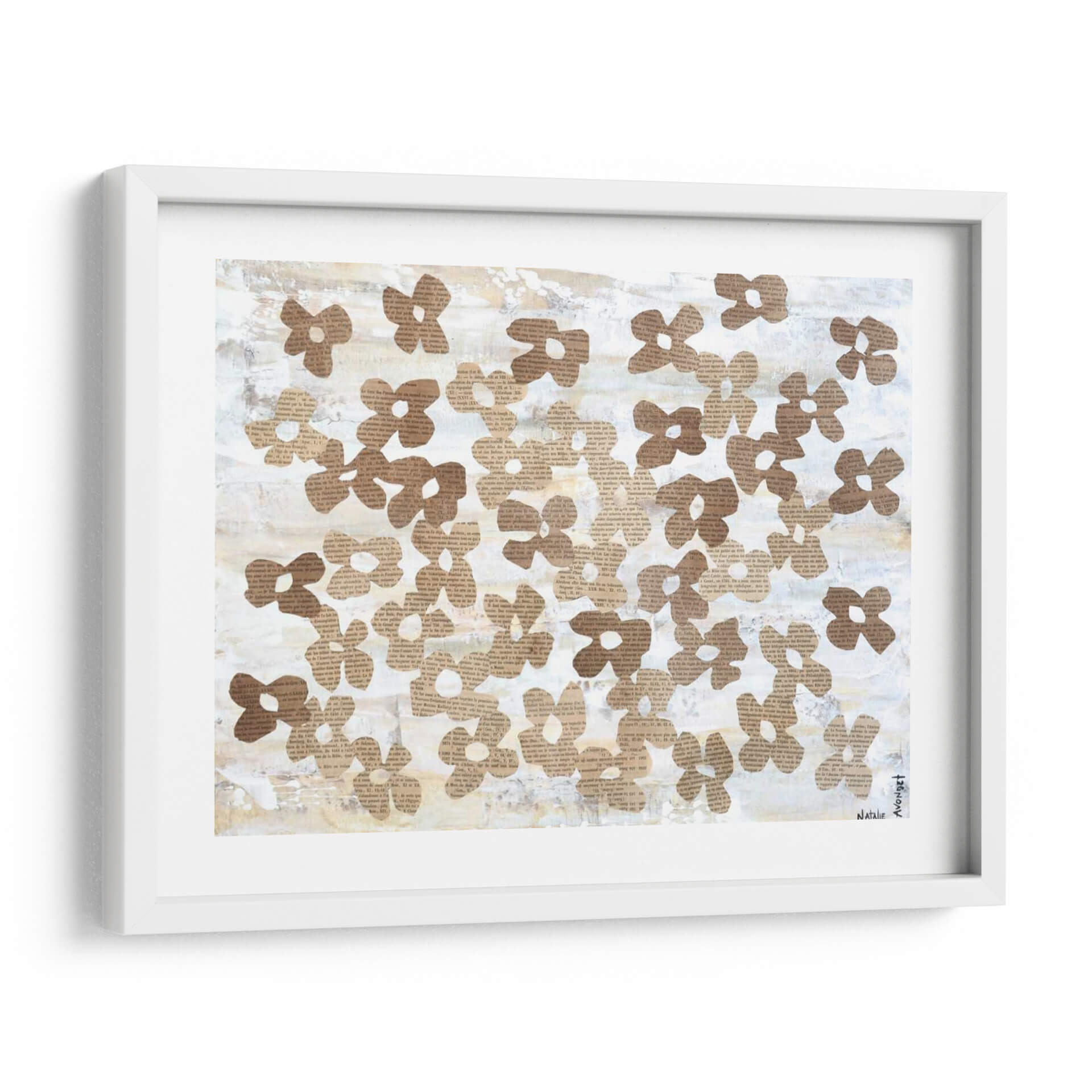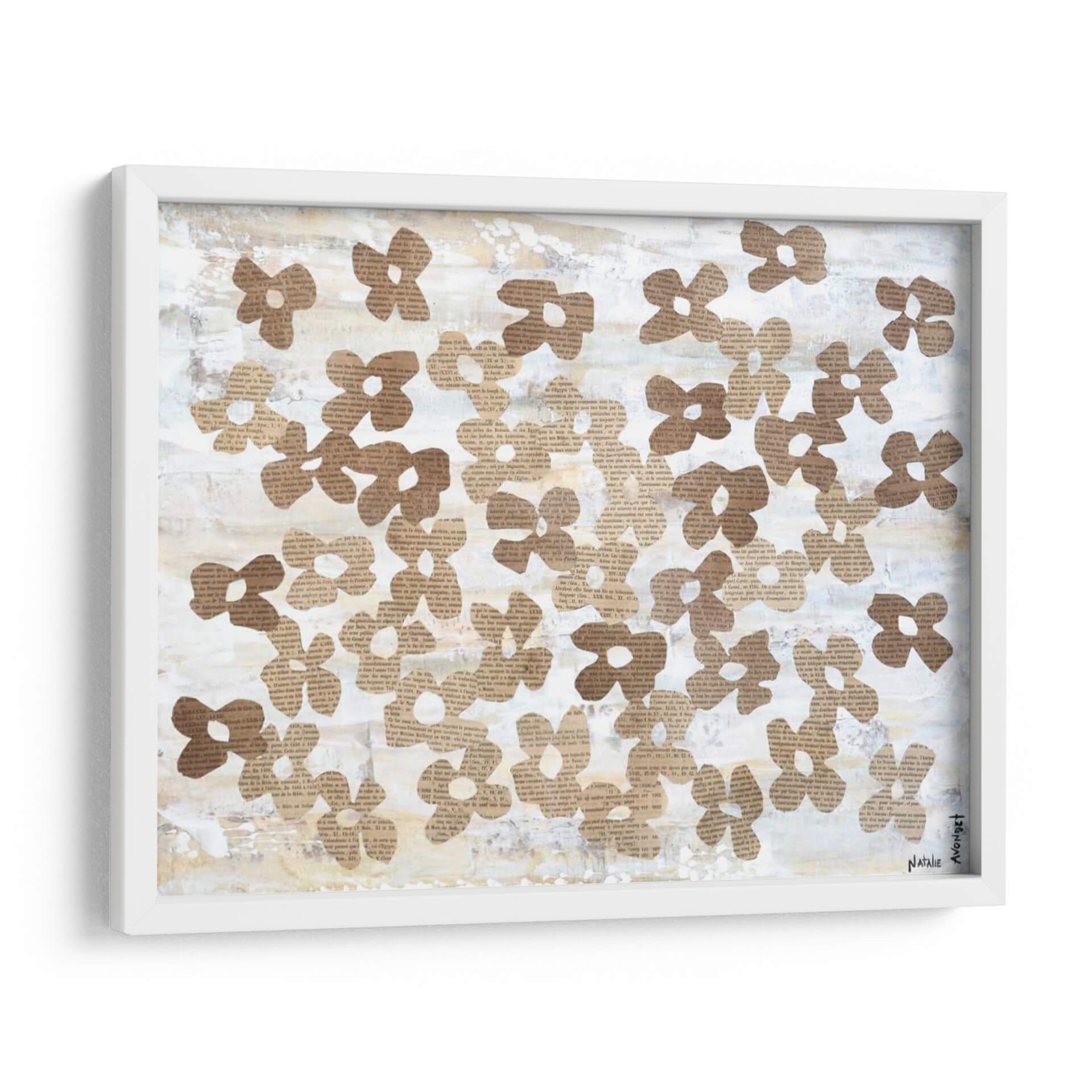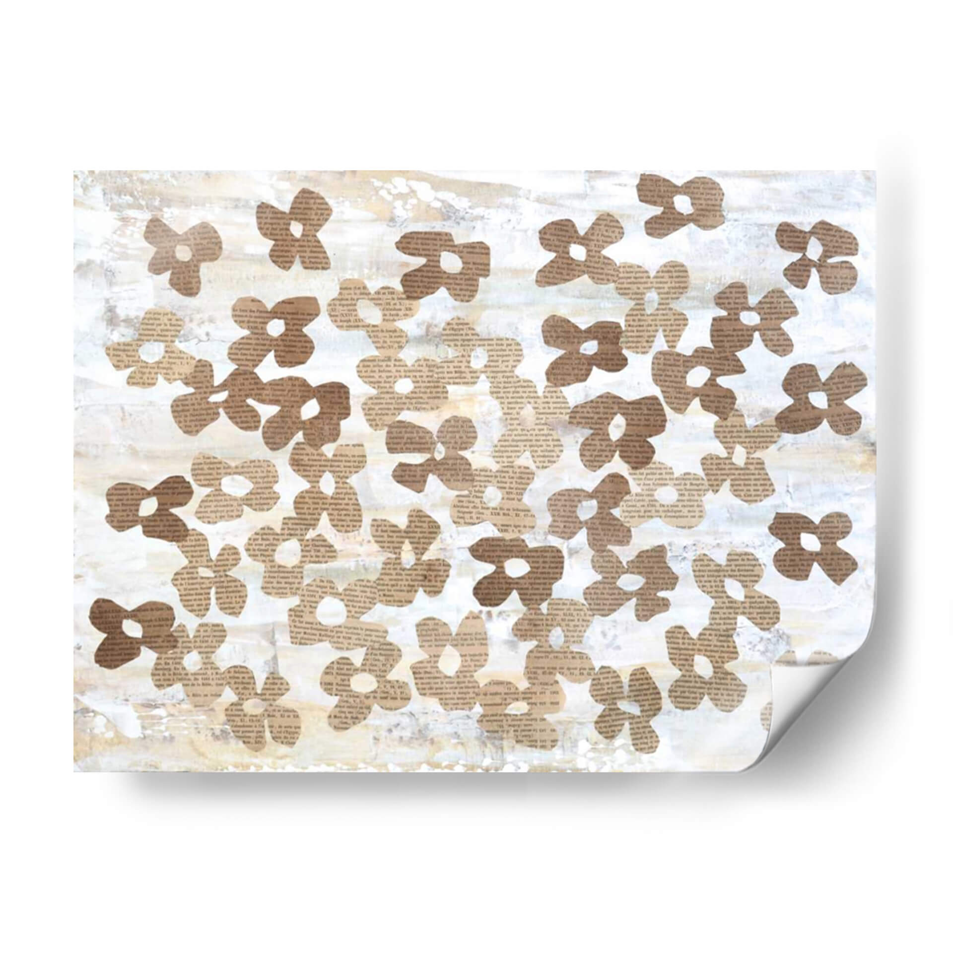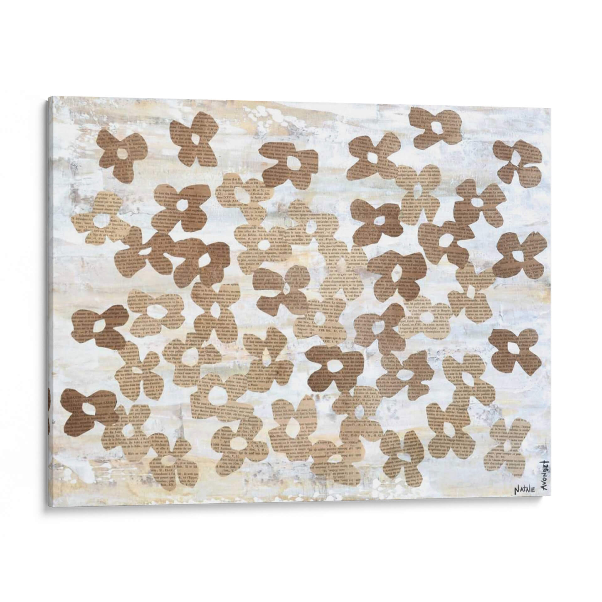 Embellece tu espacio con "Posías Estampadas I", una obra de arte cautivadora de Natalie Avondet. Esta pieza presenta un diseño intrincado de flores en tonos tierra superpuestas sobre un fondo texturizado que evoca páginas de libros antiguos. La paleta de colores, dominada por suaves tonos marrones y blancos cremosos con toques sutiles de ocre, crea una atmósfera de calma y nostalgia, perfecta para añadir un toque de serenidad a cualquier habitación. La composición abstracta y repetitiva de las flores, junto con la superposición de texto, añade profundidad y un elemento visual intrigante. Este cuadro decorativo es ideal para salas de estar, dormitorios o estudios, aportando un aire de sofisticación discreta y un toque de naturaleza estilizada. "Posías Estampadas I" es más que una simple decoración; es una invitación a la contemplación, fusionando elementos florales con la riqueza del lenguaje escrito, creando así una pieza única que resuena con calidez y elegancia. Su diseño versátil se integra a la perfección en decoraciones contemporáneas, rústicas o bohemias, convirtiéndose en un punto focal que inspira tranquilidad y admiración.