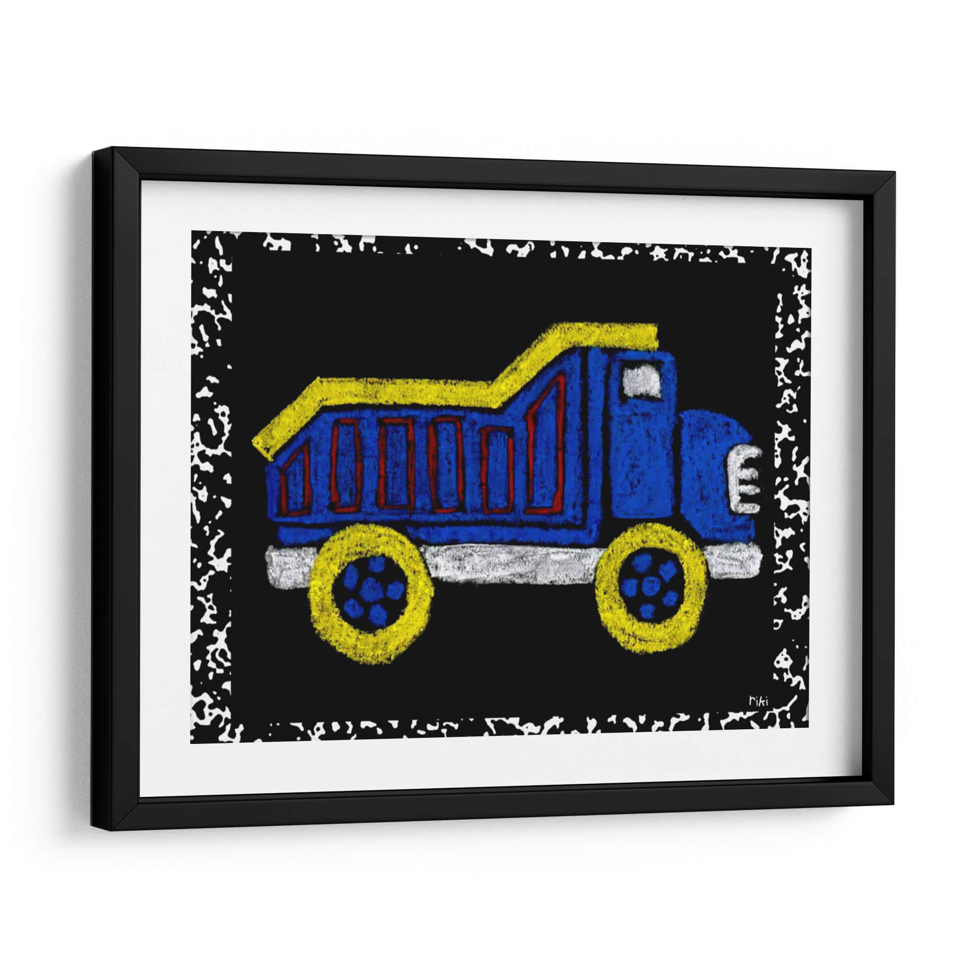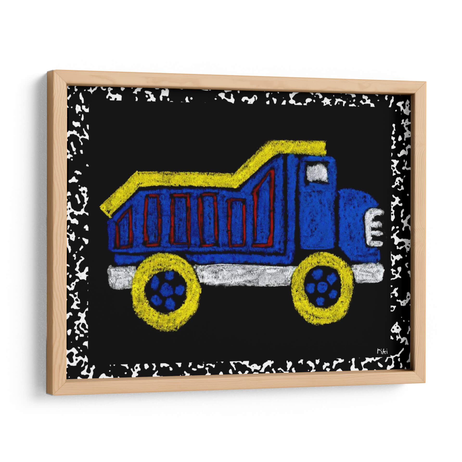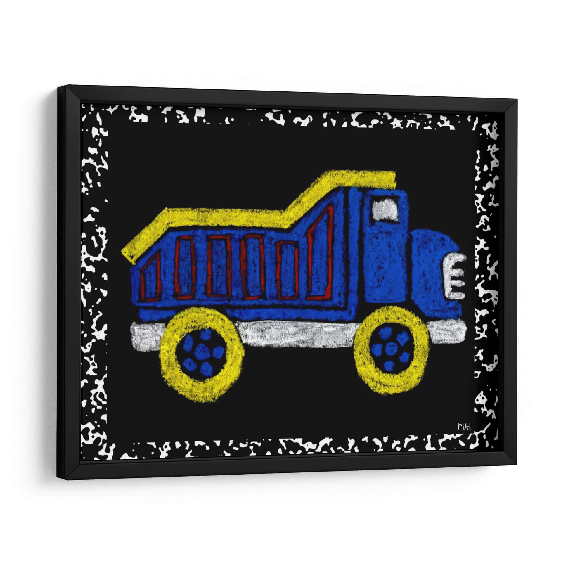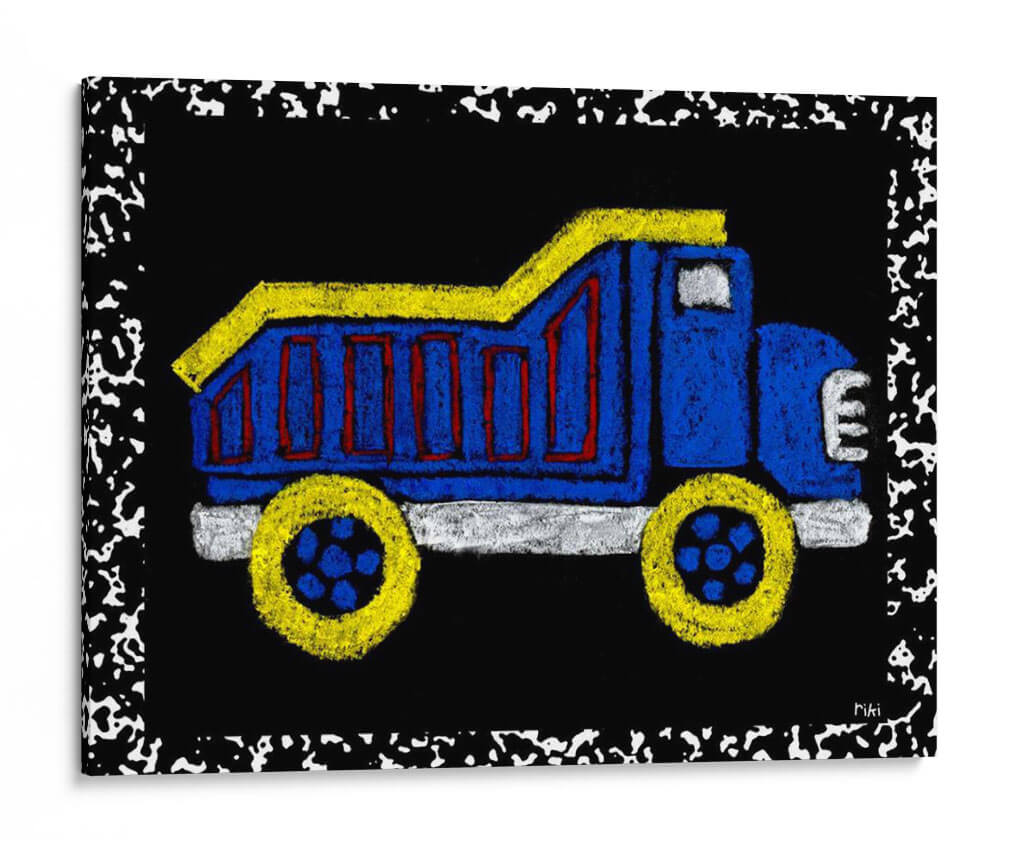 Este encantador cuadro decorativo, titulado 'Recreo II' por Chariklia Zarris, captura la nostalgia y la alegría de la infancia a través de una representación estilizada de un camión volquete. La obra se destaca por su vibrante paleta de colores, dominada por un audaz azul cobalto, acentos brillantes de amarillo y sutiles toques de rojo que delinean la estructura del vehículo. El fondo negro profundo crea un contraste llamativo, haciendo que los colores del camión resalten con una energía juguetona. El estilo recuerda a los dibujos infantiles o al arte popular, con líneas gruesas y una aplicación de color que evoca la textura del crayón o la tiza. La composición es frontal y clara, presentando el camión de perfil de una manera que es fácilmente reconocible y simpática. Es una pieza ideal para añadir un toque de diversión y color a una habitación infantil, una sala de juegos o incluso a un espacio de oficina que busque un ambiente más relajado y creativo. Este cuadro decorativo no solo embellece el espacio, sino que también evoca sentimientos de inocencia, aventura y recuerdos felices. Su simplicidad y el uso expresivo del color lo convierten en una adición atractiva y personalizable para cualquier decoración que busque un toque de originalidad y carácter.