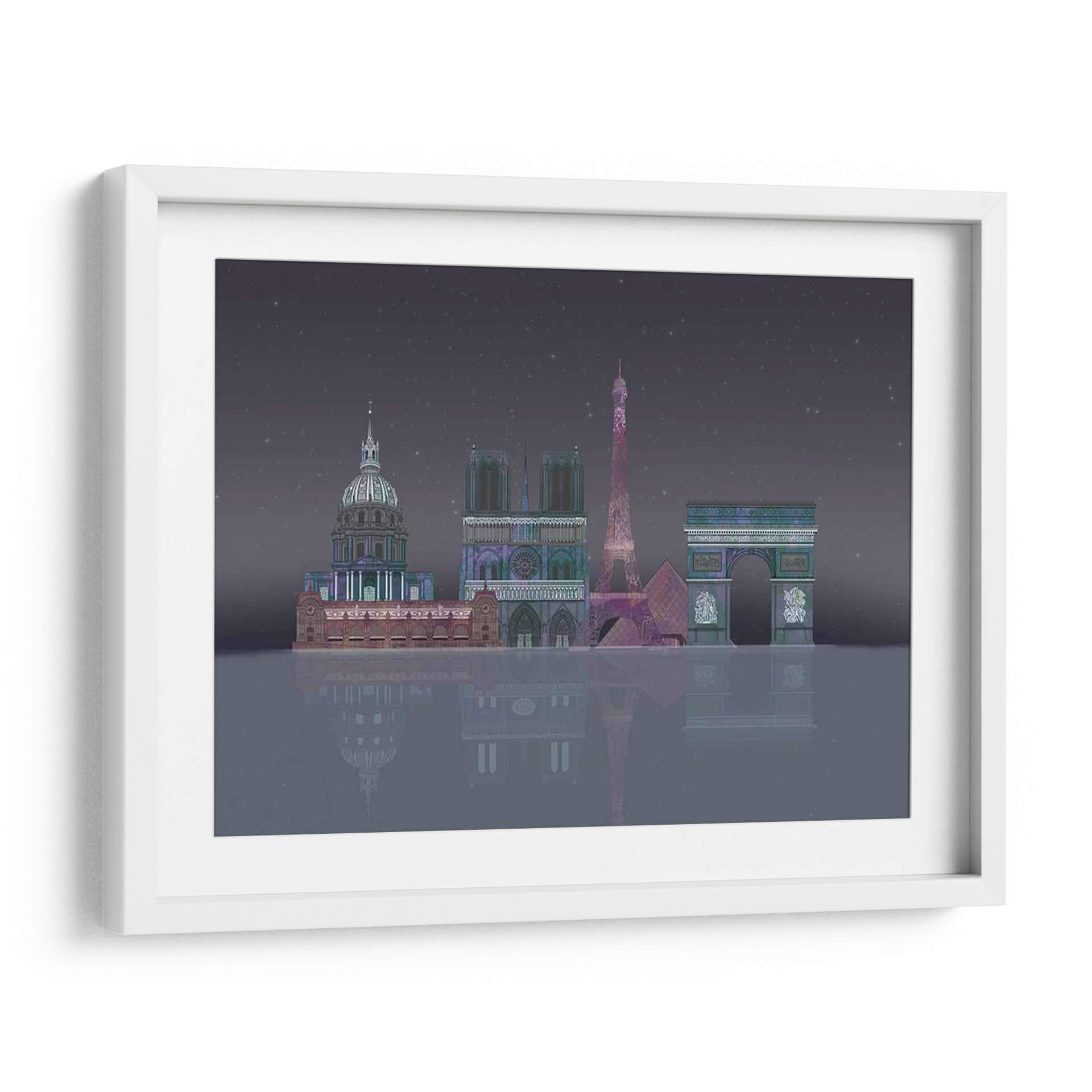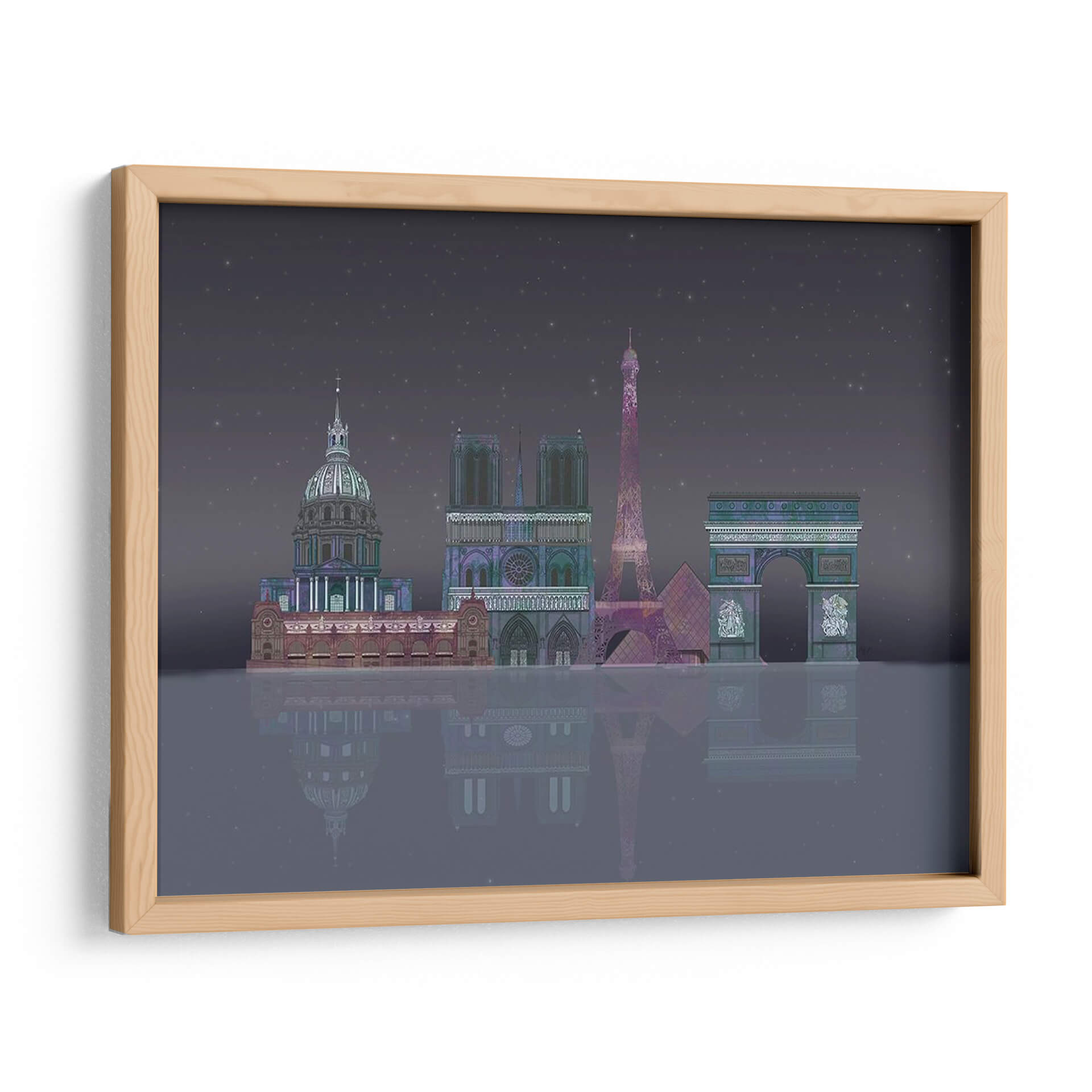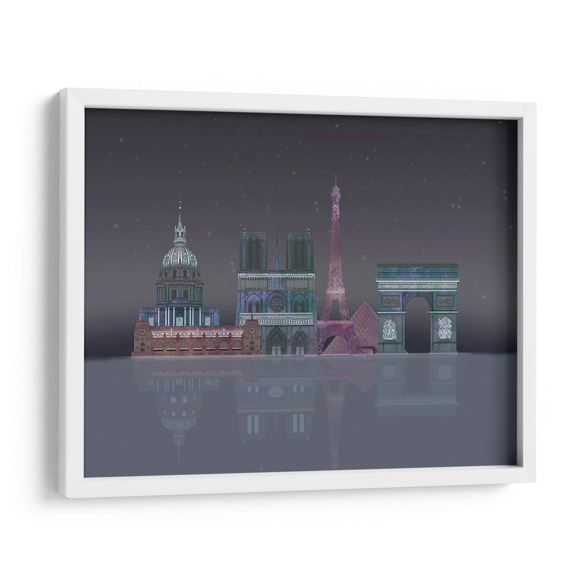 Sumérgete en la magia de la 'Noche Estrellada de París' con este cautivador cuadro decorativo, una obra de arte digital que captura la silueta icónica de la ciudad de la luz bajo un cielo estrellado. La representación estilizada de monumentos emblemáticos como la Torre Eiffel, Notre Dame y el Arco del Triunfo, bañados en una paleta de colores profundos y etéreos, evoca una sensación de misterio y romance nocturno. La detallada composición, con su reflejo sobre una superficie acuática imaginaria, añade una dimensión de profundidad y serenidad, invitando a la contemplación. Este cuadro es ideal para quienes buscan añadir un toque de elegancia y sofisticación a su hogar u oficina, transportándolos instantáneamente a las encantadoras calles parisinas. Perfecto para salones, dormitorios o estudios, esta pieza contemporánea se convertirá en el punto focal de cualquier espacio, despertando conversaciones y admiración. Su atmósfera única, entre lo onírico y lo arquitectónico, lo convierte en una adición memorable a tu colección de arte mural.