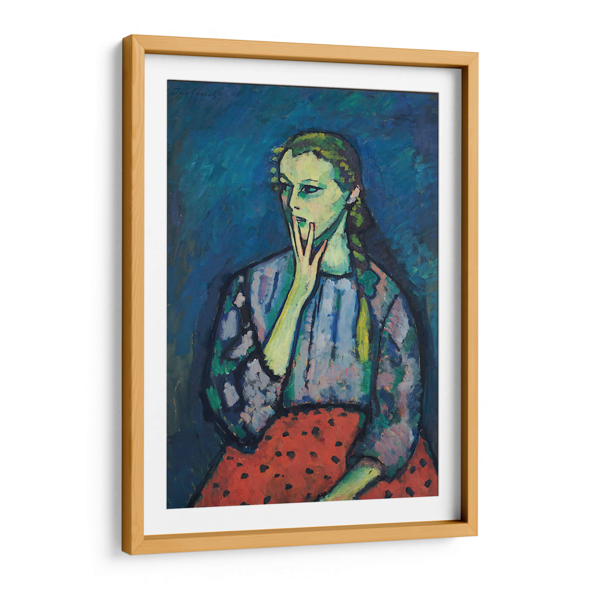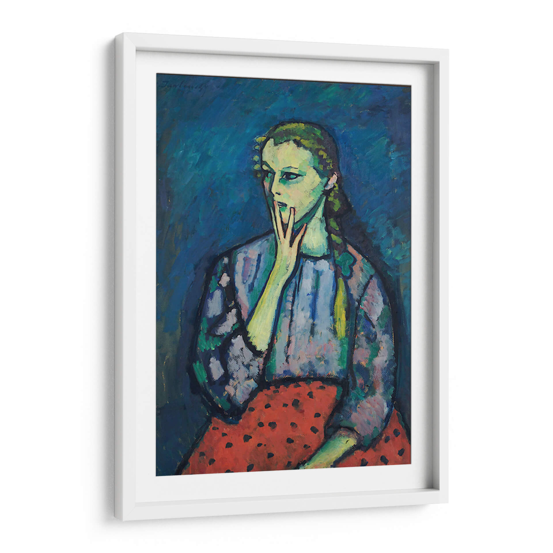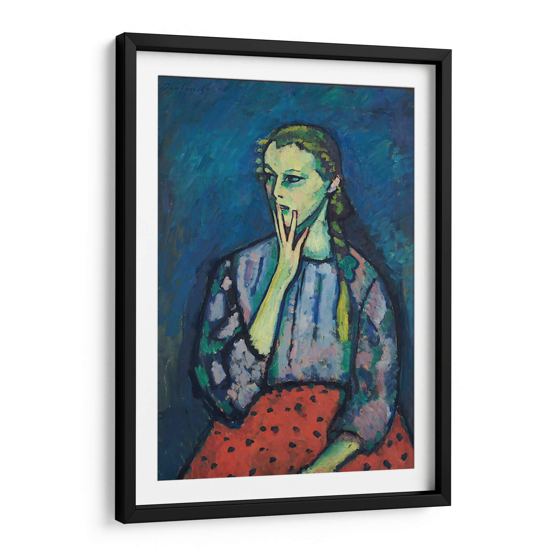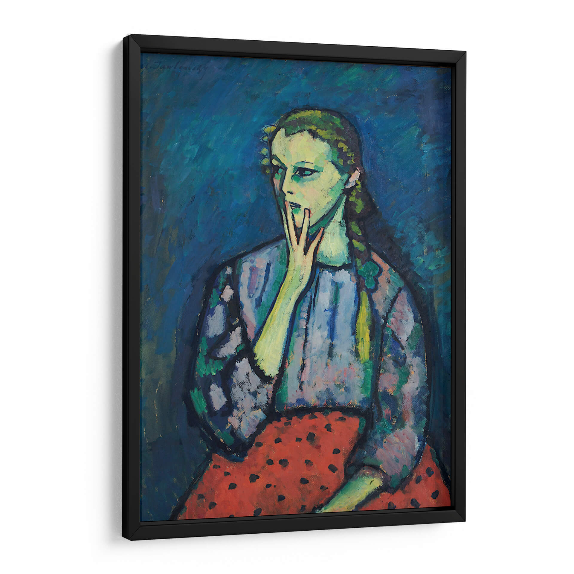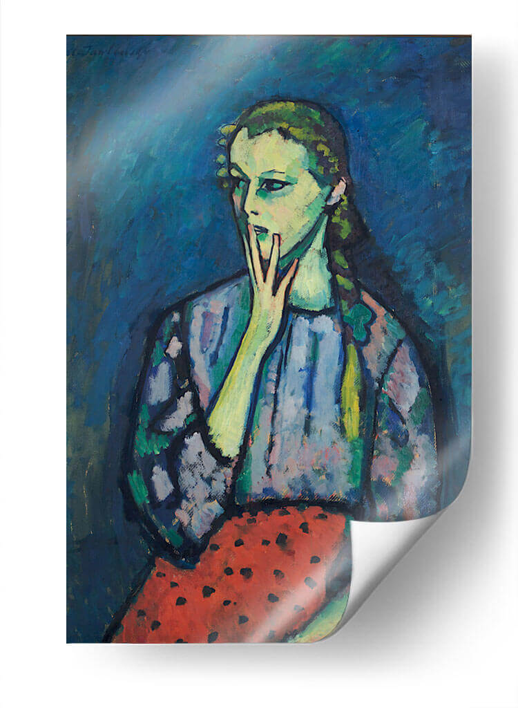 Sumérgete en la cautivadora expresión del "Retrato de una chica" de Alexej von Jawlensky, una obra que irradia introspección y un toque de melancolía. Este cuadro decorativo presenta una figura femenina enigmática, cuya mirada se desvía, mientras una mano se posa suavemente sobre su boca, invitando a la contemplación. La paleta de colores, dominada por profundos tonos de azul en el fondo, contrasta vívidamente con los tonos verdosos y amarillentos de la piel del sujeto, creando una atmósfera cargada de emoción. El vestido de la chica, con un patrón de manchas oscuras sobre un fondo azulado, y su falda roja con lunares negros, añaden un elemento de textura y vitalidad a la composición. El estilo, que recuerda al expresionismo alemán, utiliza pinceladas audaces y una representación no realista de las formas para transmitir un impacto emocional profundo. Esta pieza es ideal para espacios que buscan un toque de arte contemporáneo y reflexivo, como un estudio, una sala de estar o un dormitorio, aportando un punto focal intrigante y un diálogo visual que perdura. Añade profundidad y carácter a tu decoración con este retrato único.