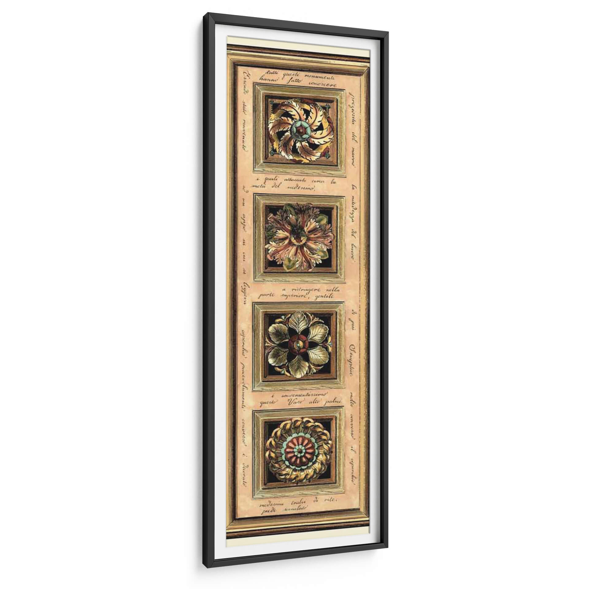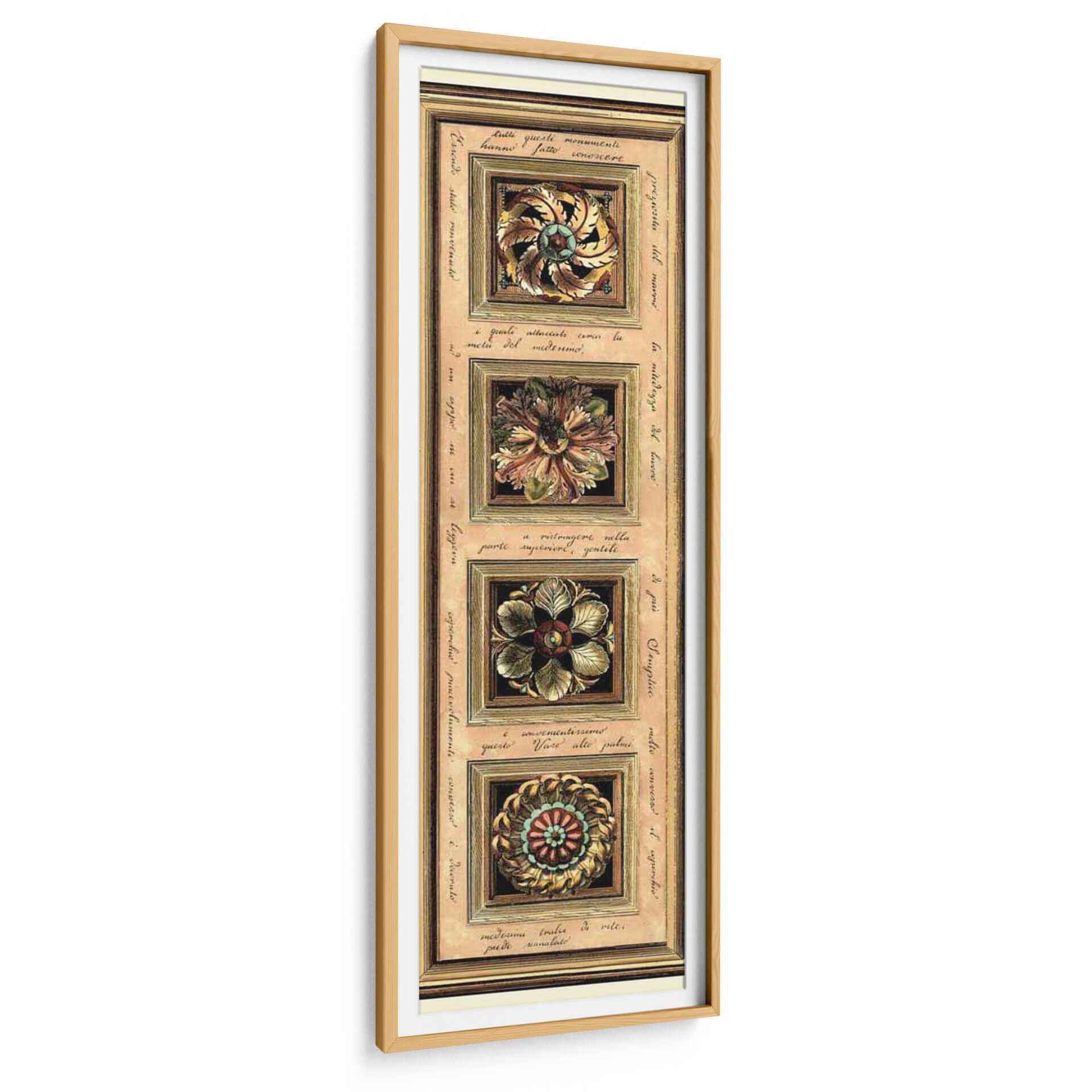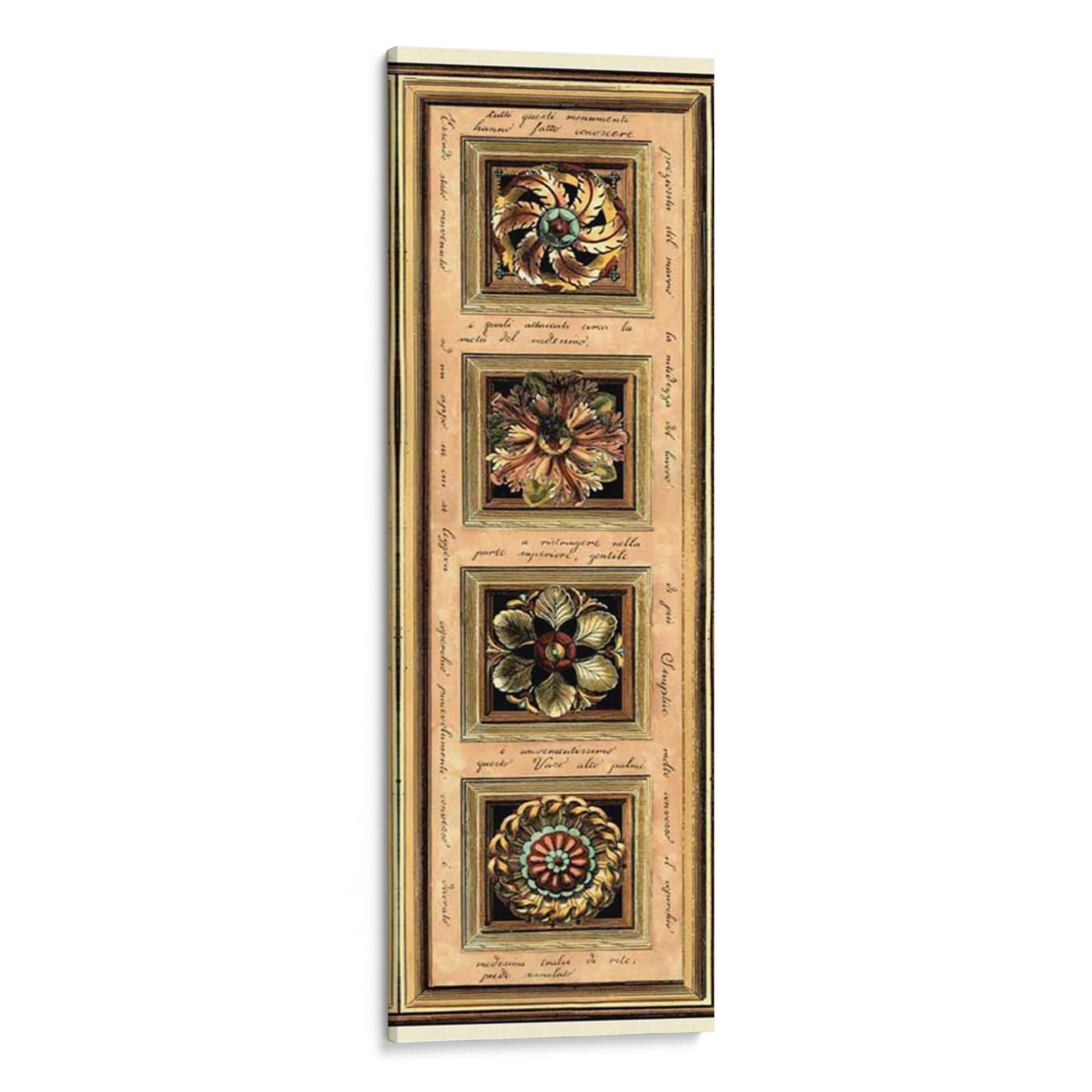 Sumérgete en la elegancia atemporal de "Rosette Panel II", una obra de arte decorativa que evoca la riqueza de los ornamentos clásicos. Este cuadro decorativo presenta una composición vertical que destaca cuatro medallones florales intrincados, cada uno con un diseño único y detallado que recuerda a rosetones y delicadas flores. La paleta de colores se centra en tonos tierra cálidos, dorados y toques de verde y rojo, creando una atmósfera de sofisticación y calidez. Las inscripciones en manuscrito antiguo que bordean los medallones añaden un aire de misterio y autenticidad histórica, transportando al espectador a otra época. "Rosette Panel II" es ideal para añadir un toque de refinamiento clásico y un punto focal de interés visual a cualquier espacio, desde salones elegantes y estudios hasta pasillos o incluso dormitorios que busquen un aire de distinción. Su diseño detallado y su paleta de colores armoniosa lo convierten en una pieza versátil, capaz de complementar tanto decoraciones tradicionales como interiores contemporáneos que buscan un contraste histórico.