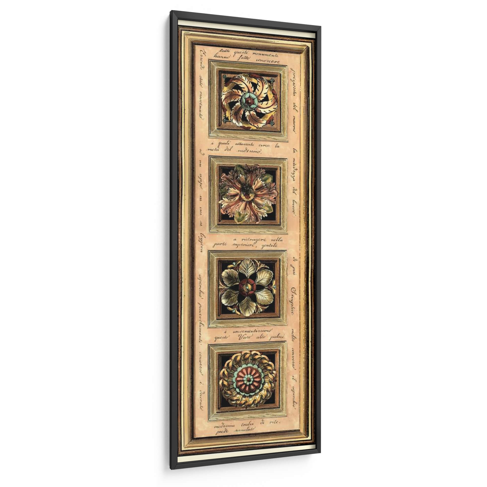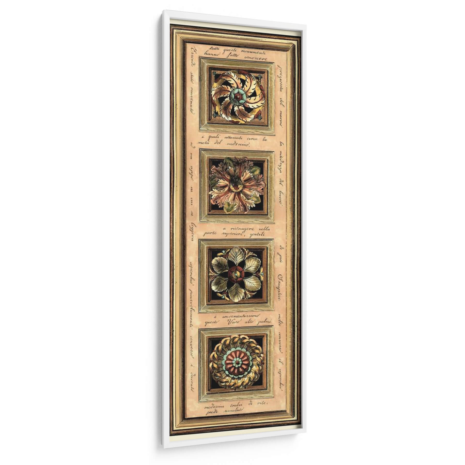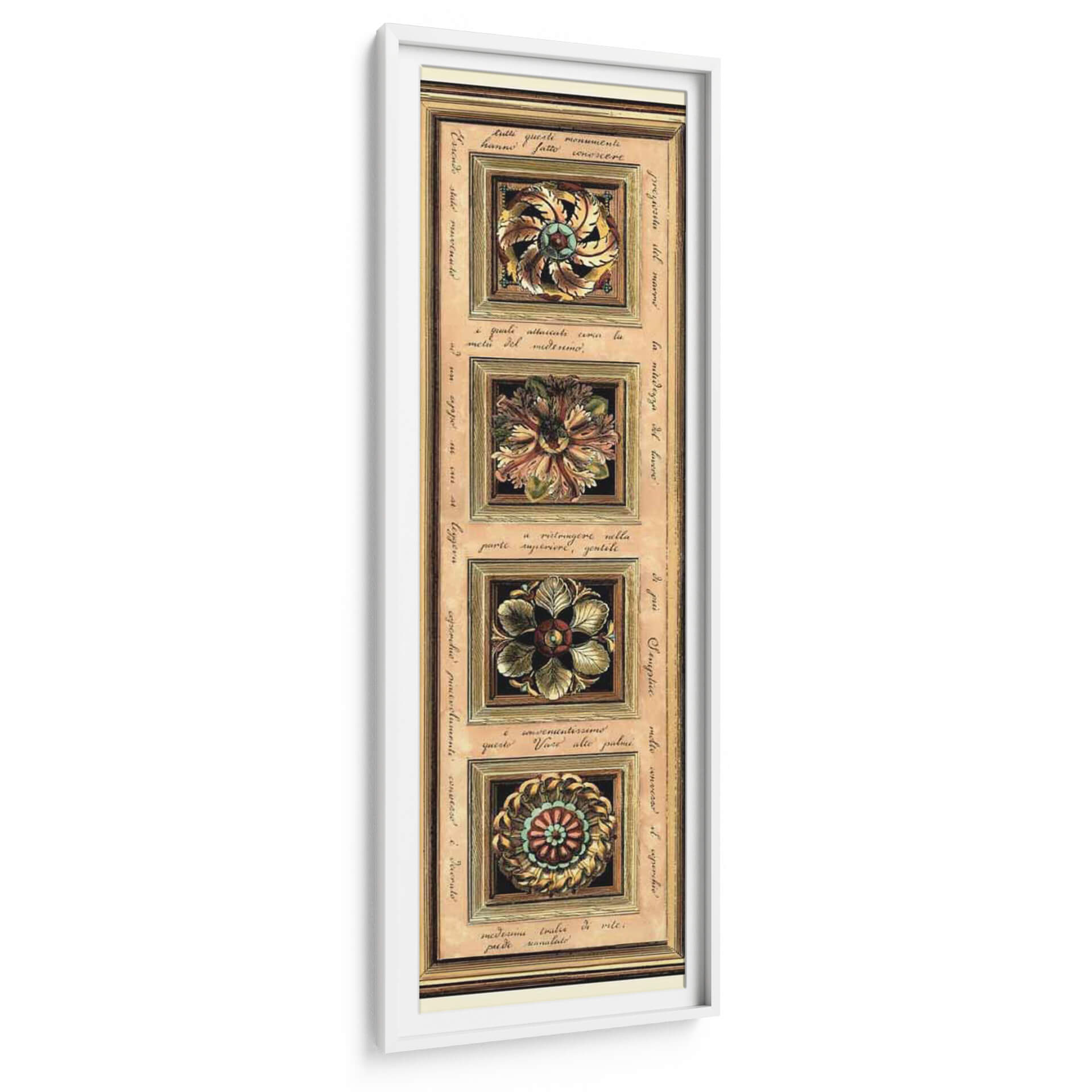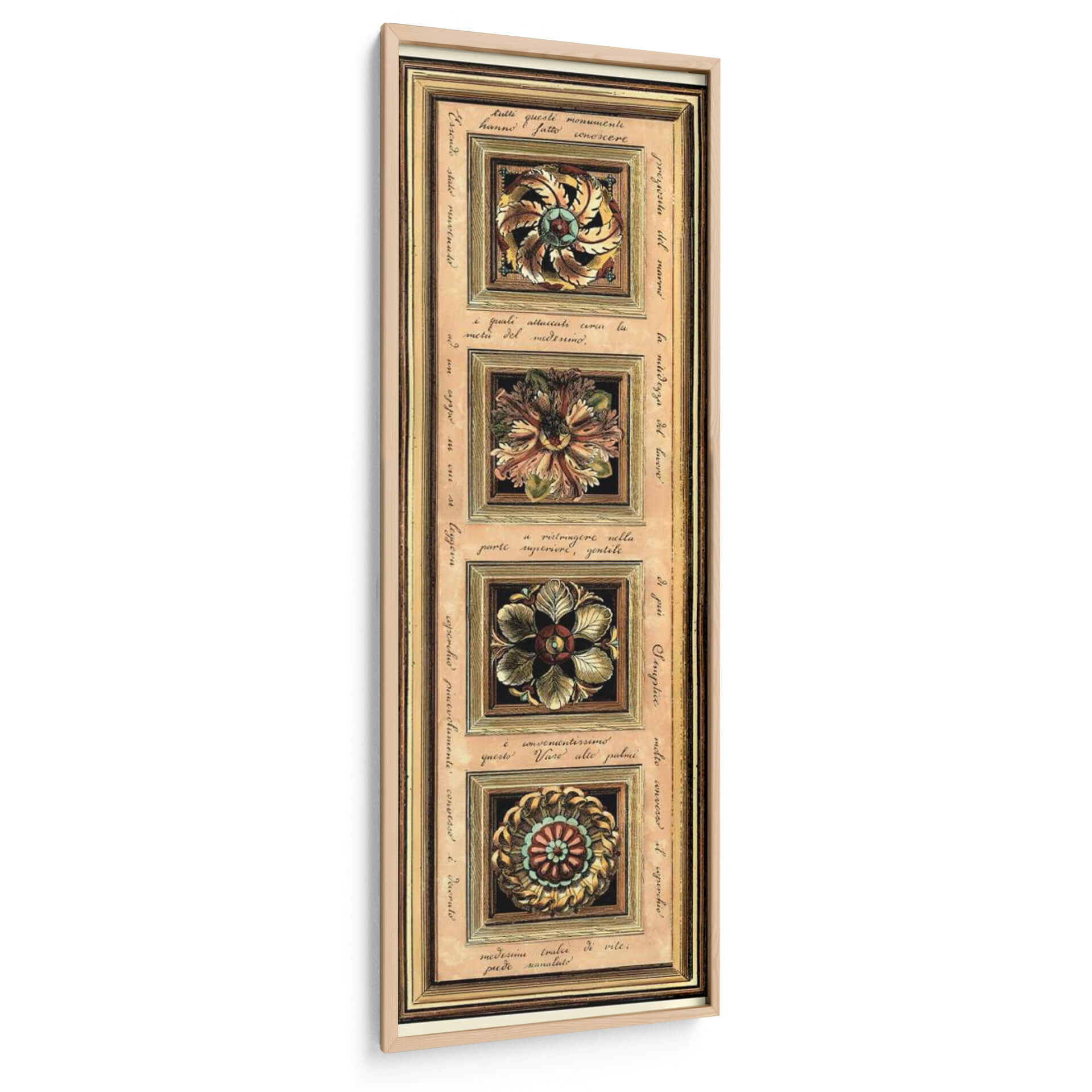 Sumérgete en la elegancia atemporal de "Rosette Panel II", una obra de arte decorativa que evoca la riqueza de los ornamentos clásicos. Este cuadro decorativo presenta una composición vertical que destaca cuatro medallones florales intrincados, cada uno con un diseño único y detallado que recuerda a rosetones y delicadas flores. La paleta de colores se centra en tonos tierra cálidos, dorados y toques de verde y rojo, creando una atmósfera de sofisticación y calidez. Las inscripciones en manuscrito antiguo que bordean los medallones añaden un aire de misterio y autenticidad histórica, transportando al espectador a otra época. "Rosette Panel II" es ideal para añadir un toque de refinamiento clásico y un punto focal de interés visual a cualquier espacio, desde salones elegantes y estudios hasta pasillos o incluso dormitorios que busquen un aire de distinción. Su diseño detallado y su paleta de colores armoniosa lo convierten en una pieza versátil, capaz de complementar tanto decoraciones tradicionales como interiores contemporáneos que buscan un contraste histórico.