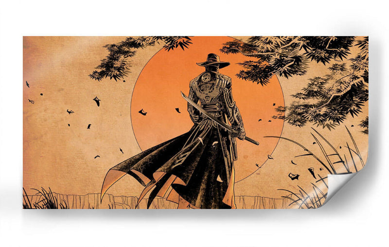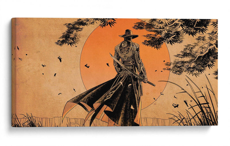 Sumérgete en la enigmática atmósfera de "Samurái Solitario", una obra de arte digital que evoca una profunda sensación de introspección y fuerza silenciosa. Esta pieza captura la imagen de un guerrero con un atuendo distintivo, de espaldas al espectador, contemplando un vasto paisaje bañado por la luz anaranjada de un sol poniente o naciente. El estilo artístico, que fusiona elementos de arte japonés tradicional con una estética moderna y algo sombría, crea un contraste fascinante. Las líneas audaces, la paleta de colores cálidos dominada por naranjas, ocres y negros, y la composición que sitúa al samurái como figura central contra un fondo abstracto y estilizado, invitan a la reflexión. Se percibe un aire de misterio y una narrativa implícita de soledad, resiliencia y el camino del guerrero. Este cuadro decorativo es perfecto para aquellos que buscan añadir un toque de profundidad y carácter a su hogar u oficina, especialmente en espacios que buscan un equilibrio entre lo moderno y lo clásico, o para quienes aprecian el arte con un fuerte componente narrativo y simbólico. Ideal para salones, estudios o espacios de trabajo que inspiren concentración y determinación.