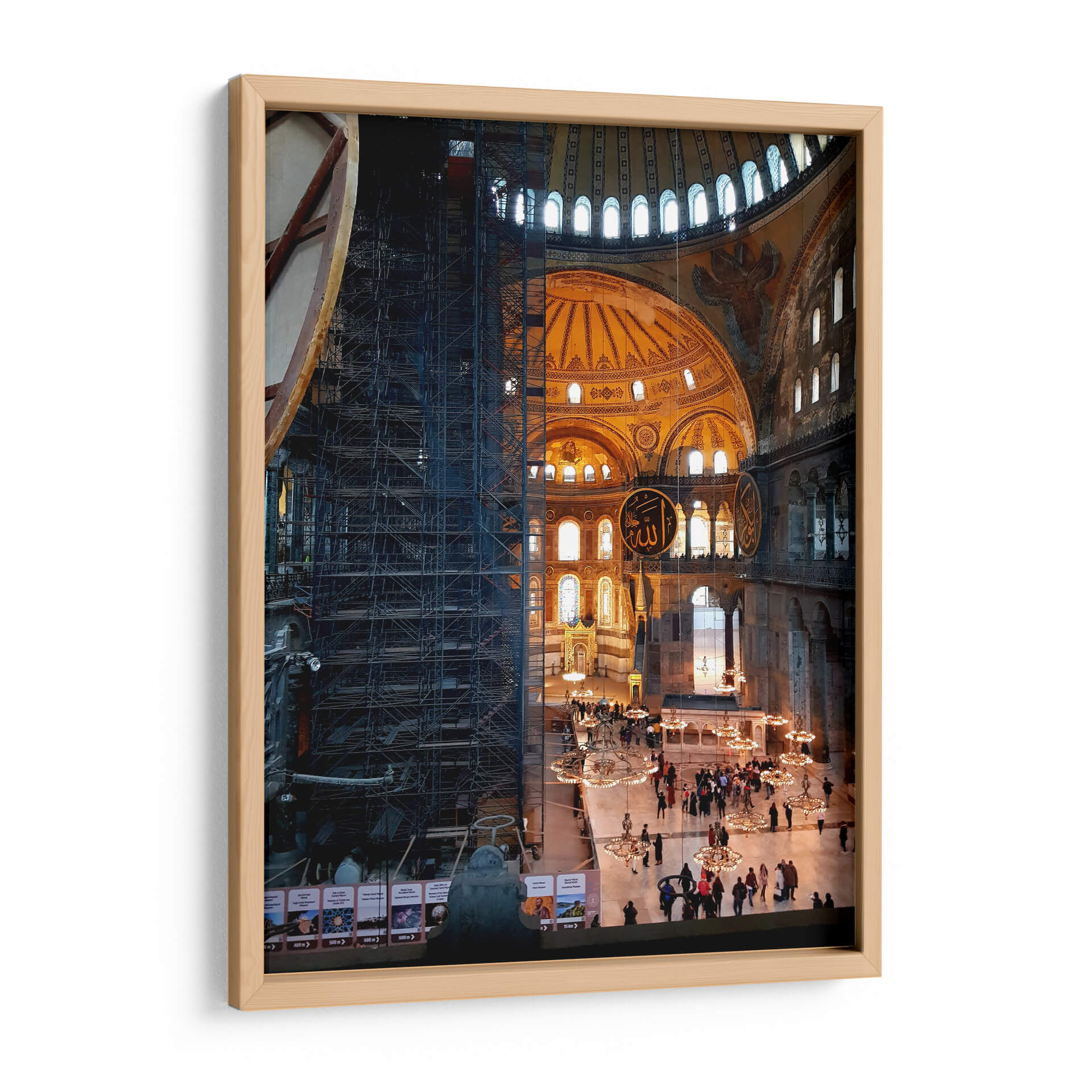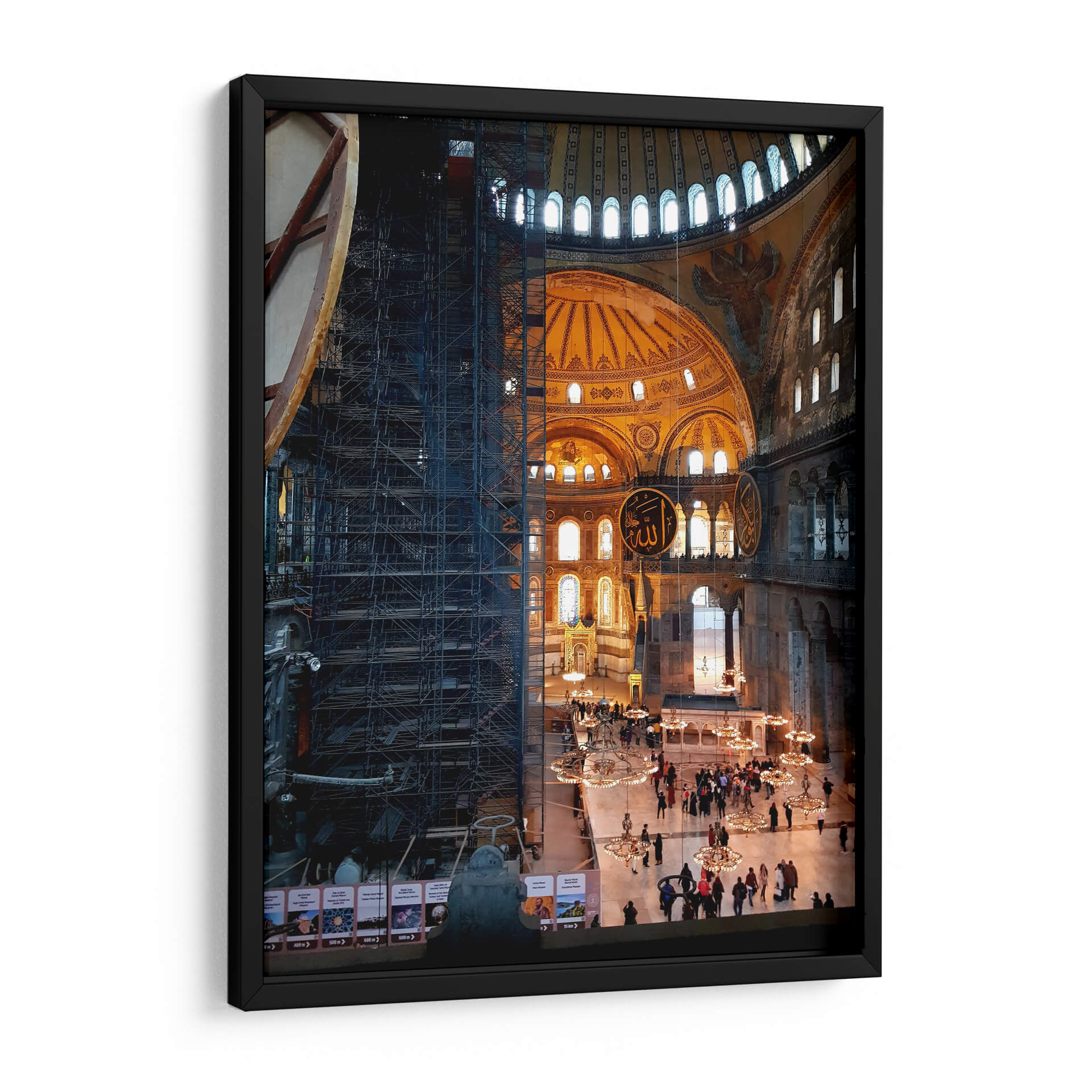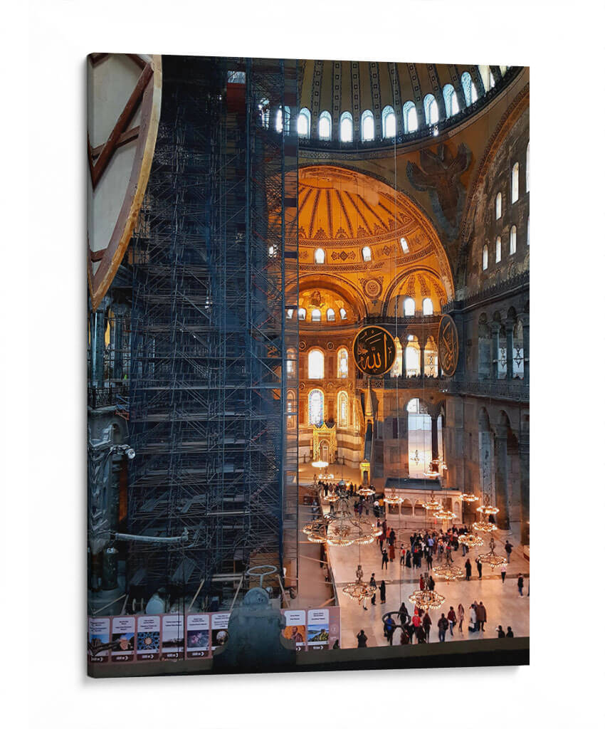 Sumérgete en la majestuosidad arquitectónica de "Santa Sofía" de Anivpaz, una obra de arte que captura la grandeza de uno de los edificios más icónicos del mundo. Esta pieza transporta al espectador al corazón de un espacio cargado de historia y espiritualidad, mostrando la imponente cúpula dorada iluminada por la luz cálida que se filtra a través de sus ventanales. La composición se divide sutilmente, presentando la imponente estructura con andamios en una sección, contrastando con la magnificencia expuesta en la otra. Los detalles intrincados de las lámparas colgantes y las inscripciones caligráficas añaden una capa de profundidad y misticismo. La paleta de colores, dominada por tonos dorados, ocres y sombras profundas, crea una atmósfera de reverencia y asombro. "Santa Sofía" es ideal para espacios que buscan evocar una sensación de historia, cultura y trascendencia, como un estudio, una sala de estar o un recibidor que aspire a la elegancia monumental. Añade un toque de esplendor histórico y espiritual a tu decoración con este cuadro decorativo que inspira contemplación y admiración. Es una ventana a la magnificencia arquitectónica y un recordatorio de la belleza que perdura a través de los siglos.