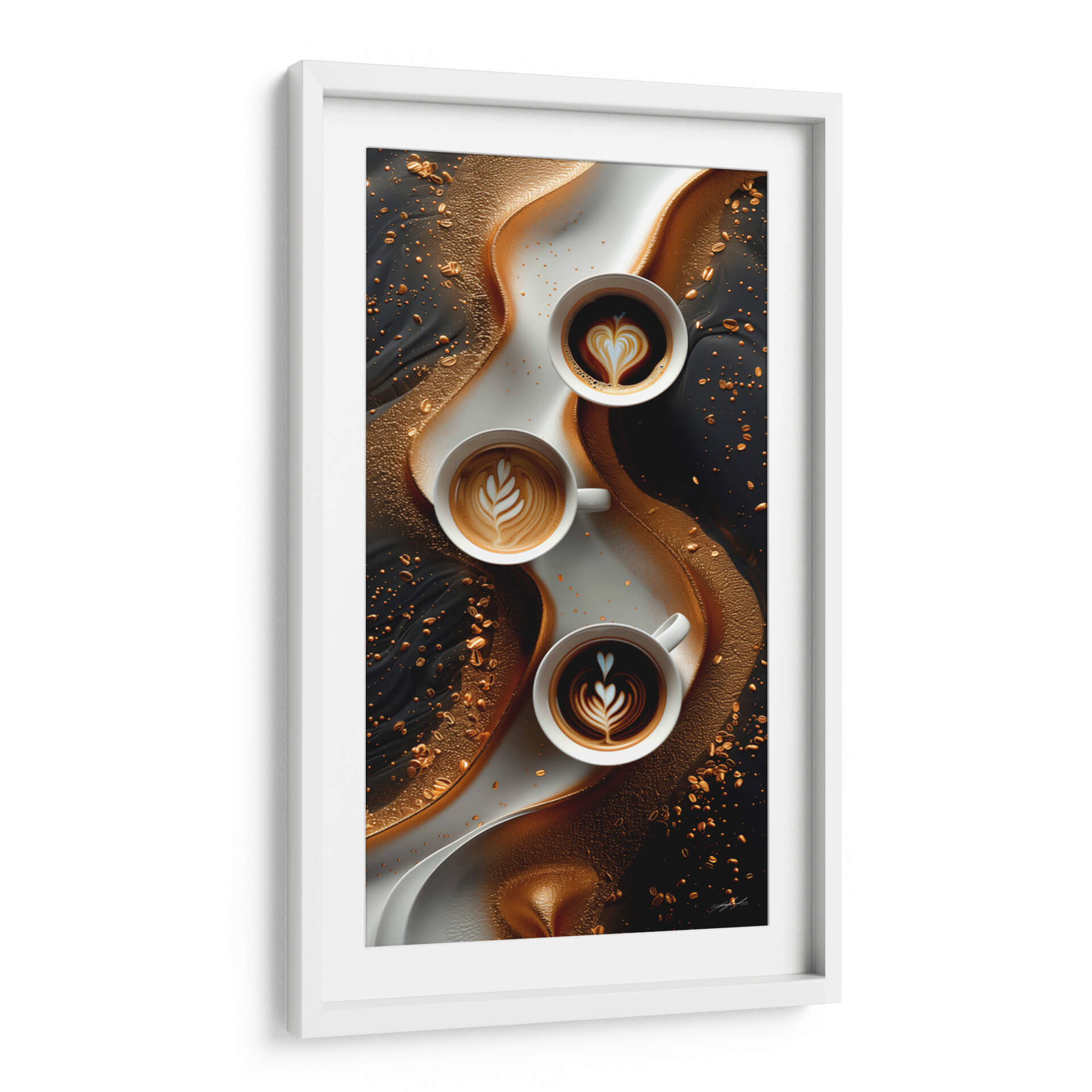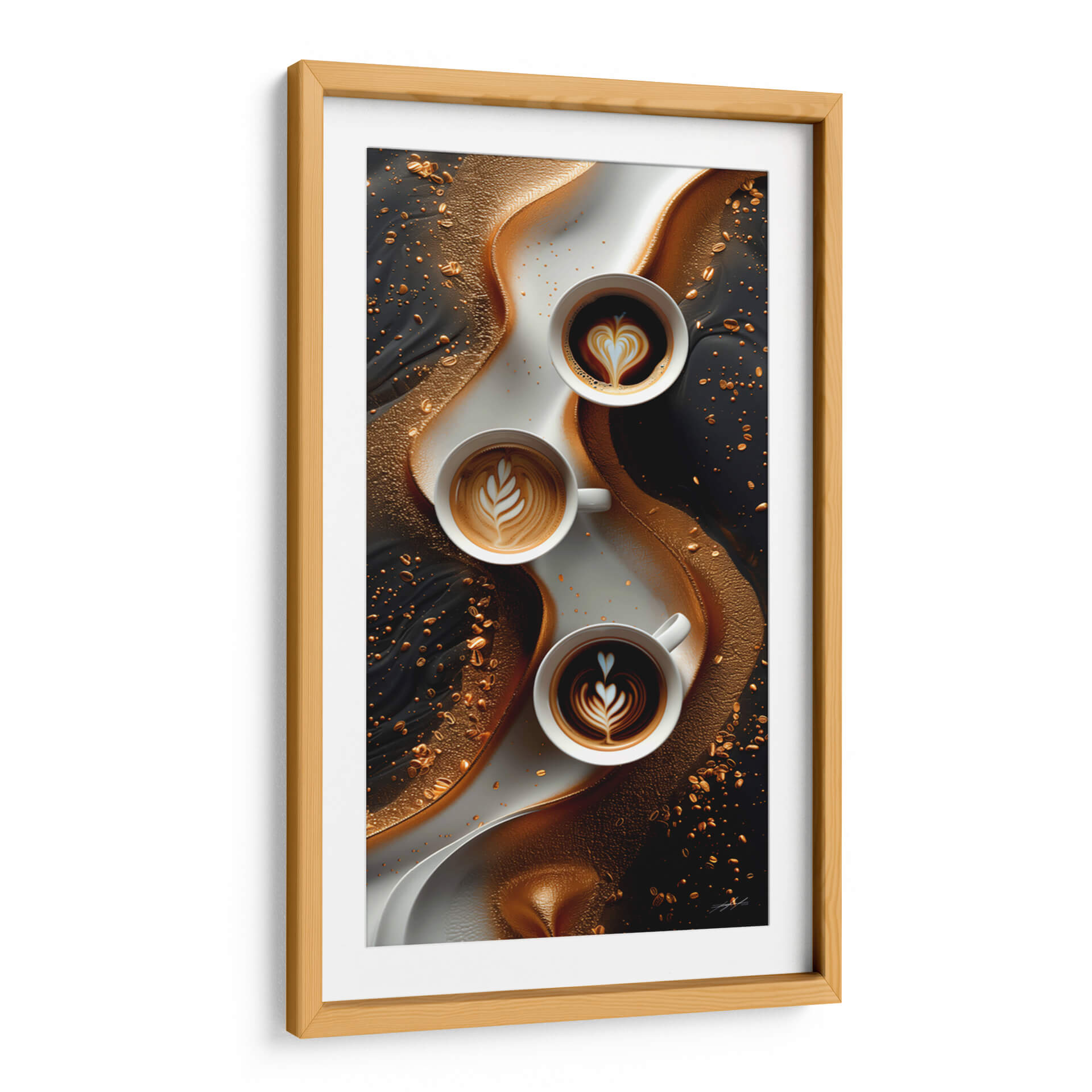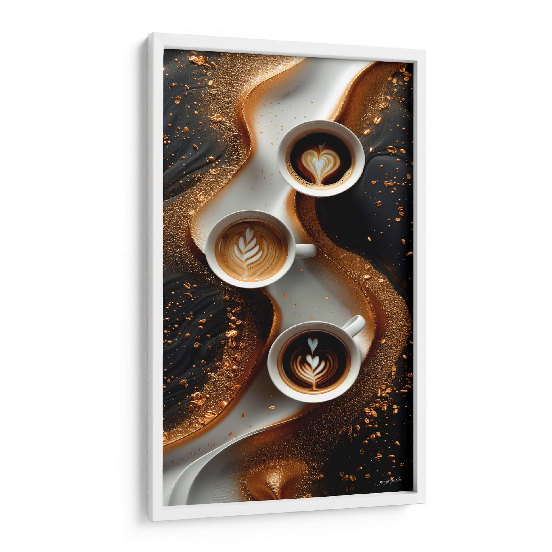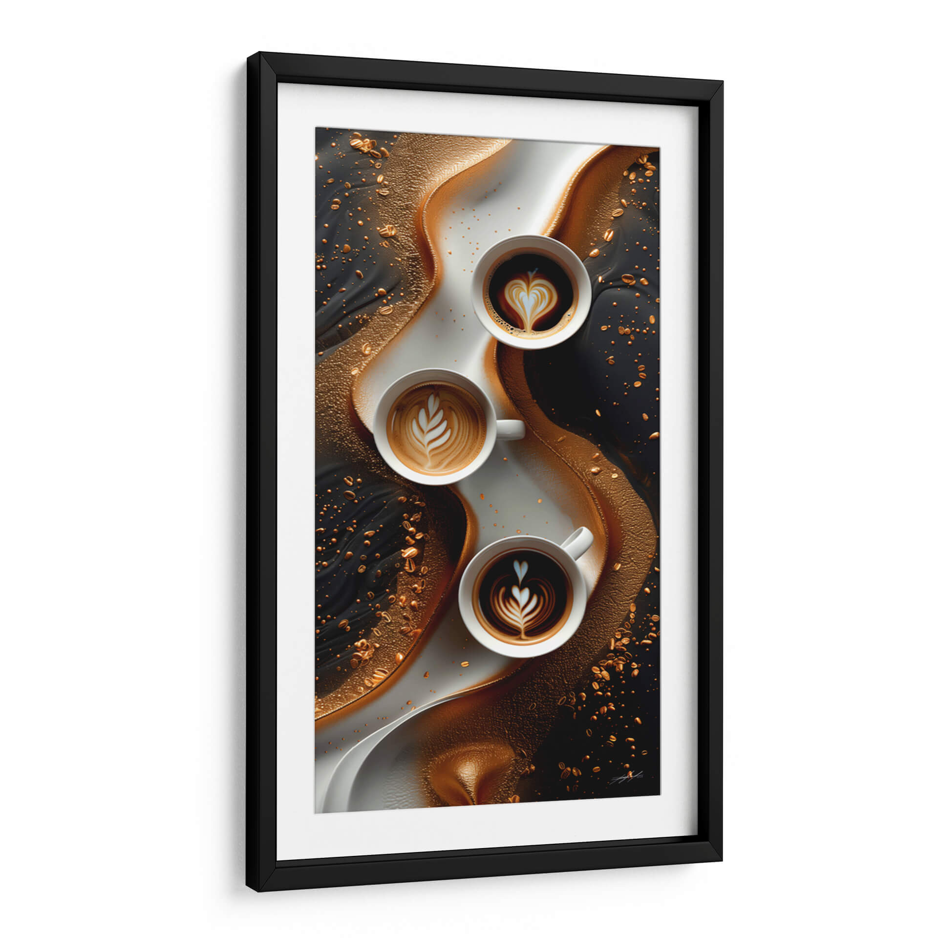 Sumérgete en la exquisita experiencia del "Sentimiento Café - 3", una obra de arte digital que captura la esencia del café con una elegancia surrealista y lujosa. Este cuadro decorativo presenta tres tazas de café perfectamente preparadas, cada una con intrincados diseños de 'latte art' que evocan calidez y sofisticación. La paleta de colores se centra en tonos profundos de negro, contrastados por fluidas curvas doradas y blancos cremosos, salpicados con granos de café que parecen flotar en un ambiente etéreo. La composición, con sus formas orgánicas y texturas ricas, crea una sensación de movimiento y profundidad, invitando al espectador a contemplar la belleza en los detalles. Ideal para amantes del café, cocinas modernas, o para añadir un toque de indulgencia y arte contemporáneo a tu sala de estar u oficina. Esta pieza transformará cualquier espacio en un santuario de estilo y buen gusto, ofreciendo una experiencia visual que deleita y inspira.