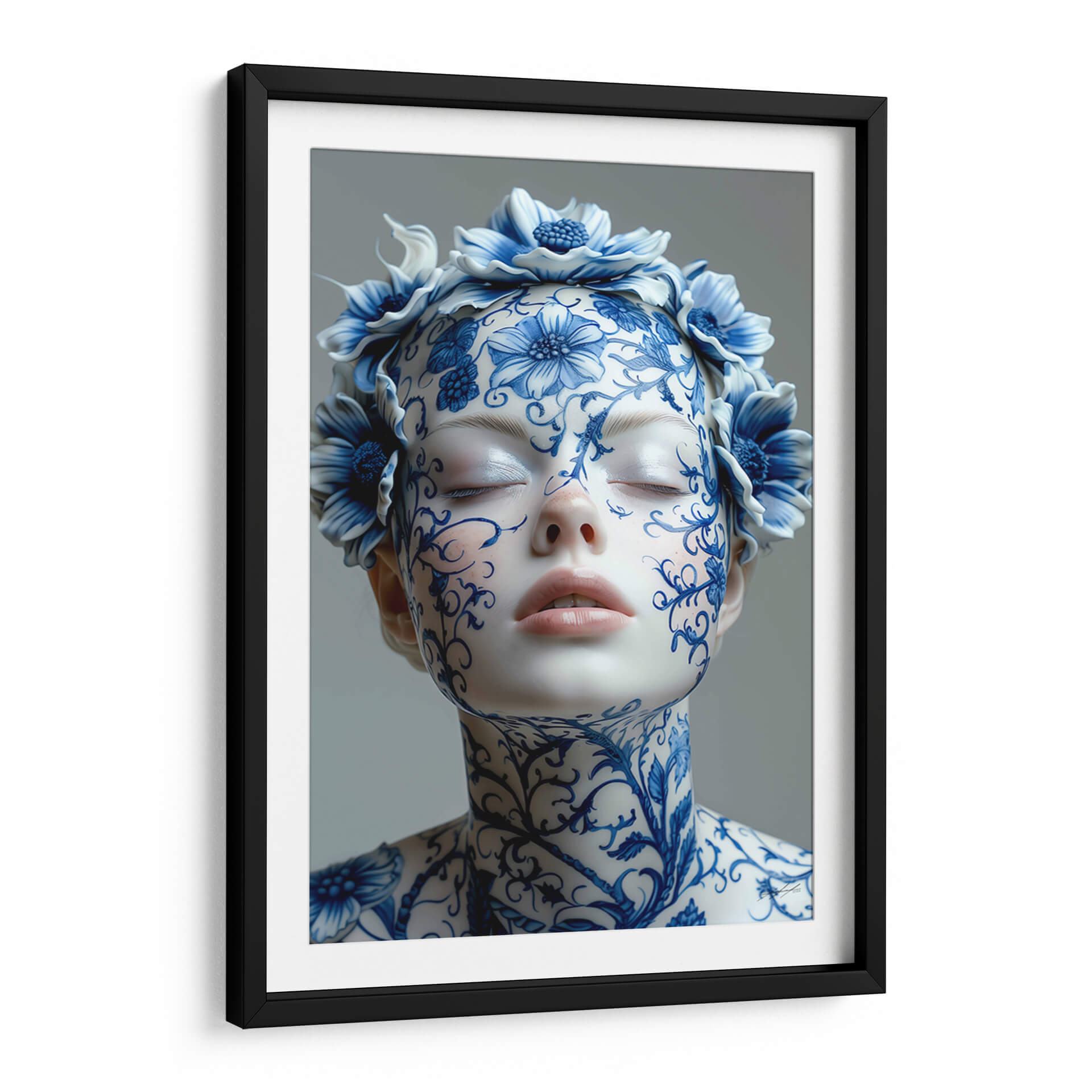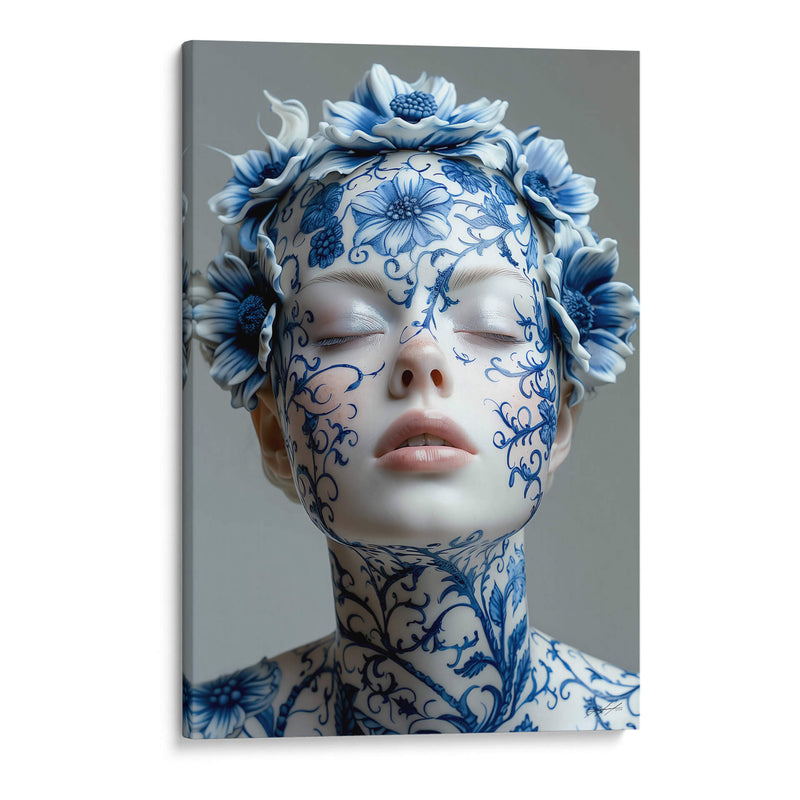 Sumérgete en la delicadeza y el misterio con "Sentimiento de Porcelana - 2", una obra de arte contemporáneo que evoca la belleza atemporal de la cerámica de Delft en un lienzo cautivador. Este cuadro decorativo presenta el rostro sereno de una figura femenina, cuya piel parece estar adornada con intrincados patrones florales y volutas en un vibrante azul cobalto sobre un fondo blanco prístino. Las flores que coronan su cabeza y se entrelazan por su cuello y rostro crean una atmósfera etérea, fusionando la fragilidad de la porcelana con la vitalidad de la naturaleza. La paleta de colores, dominada por el contraste del azul intenso y el blanco puro, junto con sutiles toques rosados en los labios, aporta una sensación de calma y sofisticación. El estilo, que mezcla elementos figurativos con un diseño casi abstracto en los patrones, invita a la contemplación. Ideal para quienes buscan añadir un toque de elegancia clásica con una interpretación moderna a sus espacios, este cuadro decorativo es perfecto para salones, dormitorios o estudios, aportando serenidad y un punto de intriga visual que no pasará desapercibido.