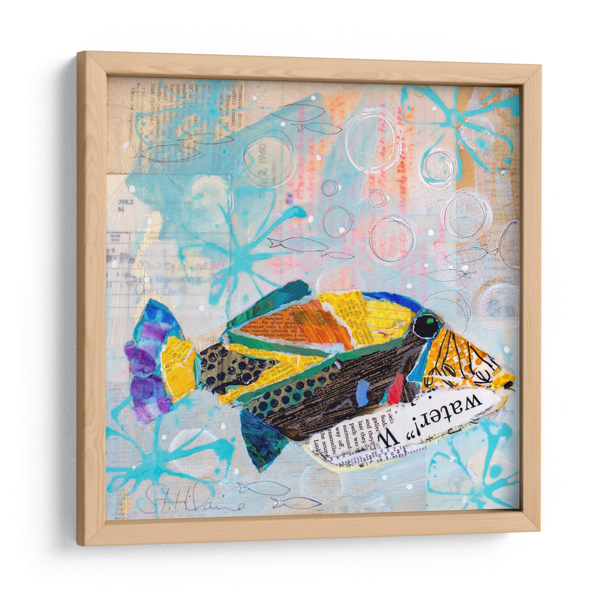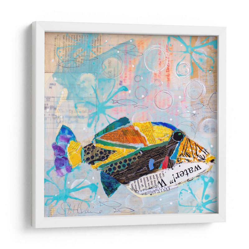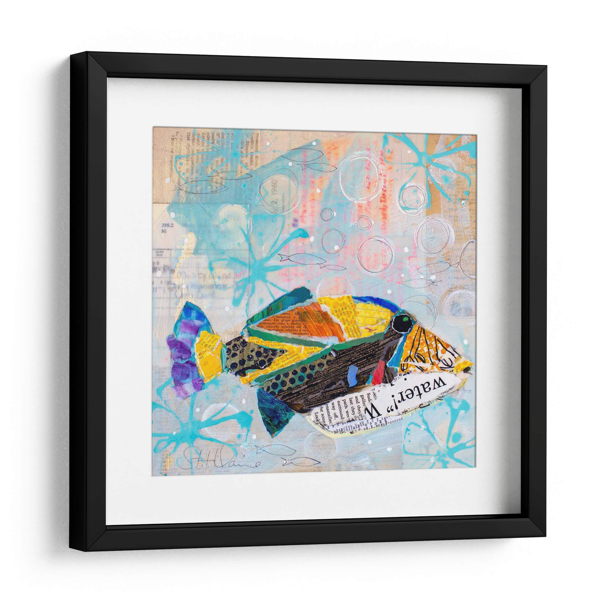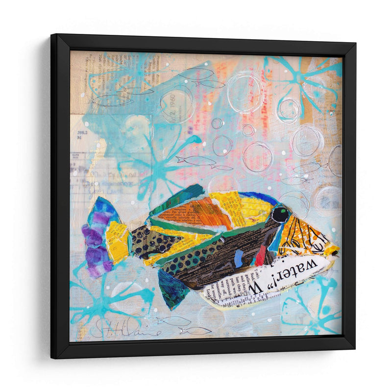 Sumérgete en las profundidades marinas con este vibrante cuadro decorativo de un pez tropical, una obra de arte textil y collage que captura la esencia del océano con una explosión de color y textura. La artista Elizabeth St. Hilaire utiliza recortes de periódico, pintura y tela para dar vida a esta criatura marina, creando un efecto visual dinámico y lleno de detalles. El pez, con sus escamas de papel amarillento, azul eléctrico, naranja vibrante y toques púrpuras, emerge sobre un fondo etéreo con acuarelas celestes y motivos de burbujas y estrellas de mar estilizadas. La composición, que evoca un mundo submarino juguetón y sereno, invita a la contemplación y añade un toque de originalidad a cualquier espacio. "Siempre Mirando Hacia Arriba V" es ideal para quienes buscan una pieza que combine la fascinación por la vida marina con un enfoque artístico moderno y audaz. Perfecto para decorar salas de estar, dormitorios o estudios, este cuadro decorativo transformará tu pared en una ventana a un ecosistema lleno de vida y color, aportando una energía positiva y una dosis de fantasía a tu hogar.