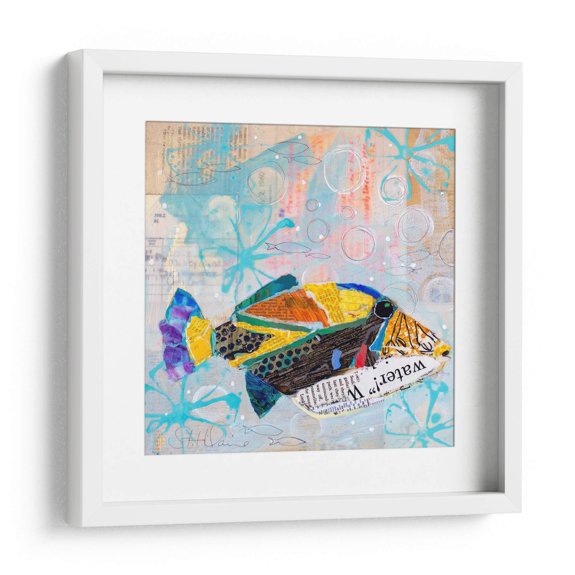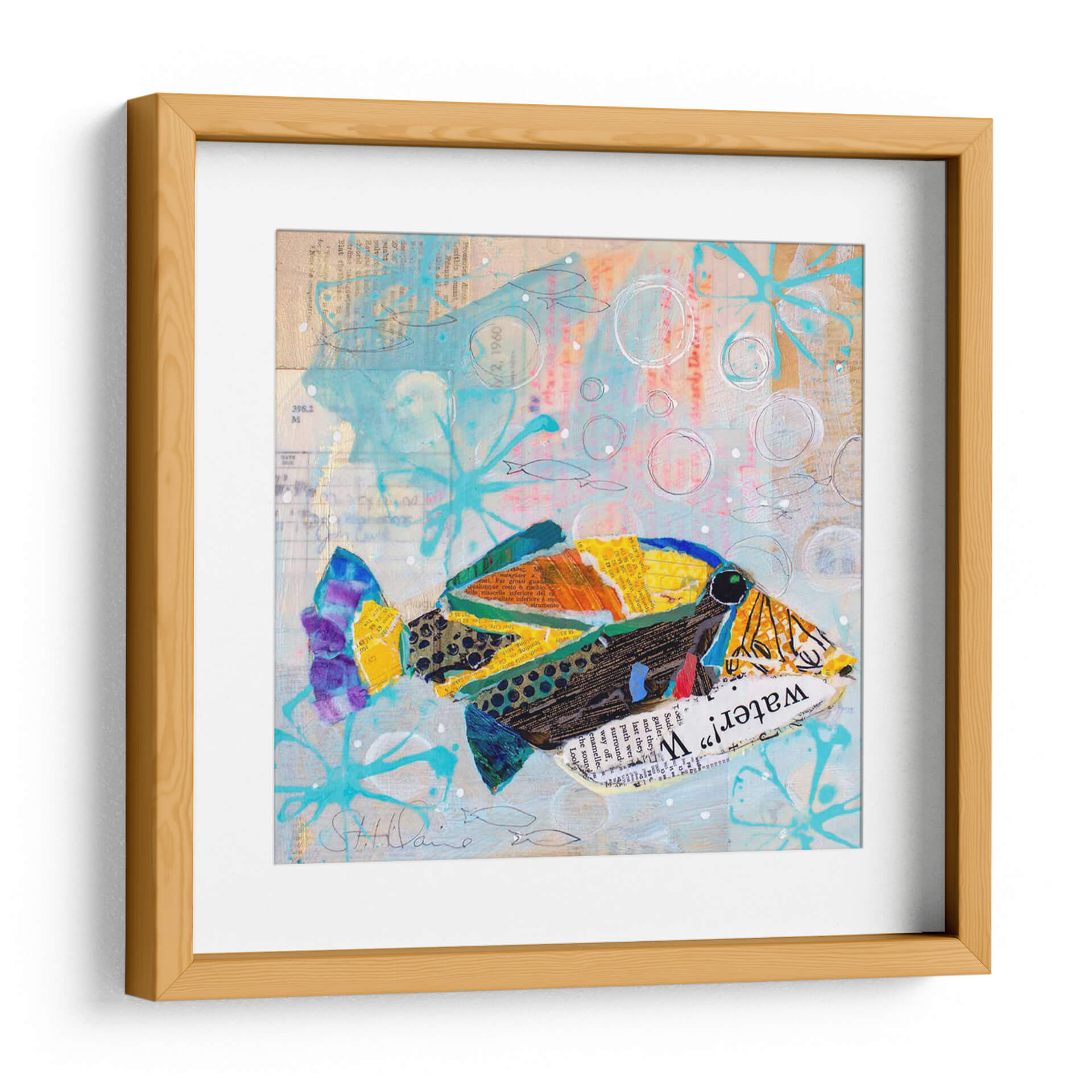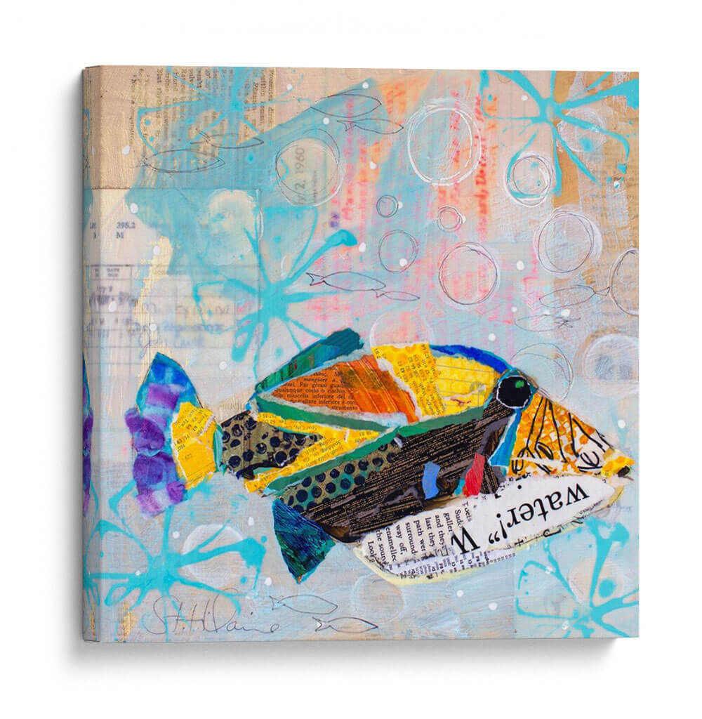 Sumérgete en las profundidades marinas con este vibrante cuadro decorativo de un pez tropical, una obra de arte textil y collage que captura la esencia del océano con una explosión de color y textura. La artista Elizabeth St. Hilaire utiliza recortes de periódico, pintura y tela para dar vida a esta criatura marina, creando un efecto visual dinámico y lleno de detalles. El pez, con sus escamas de papel amarillento, azul eléctrico, naranja vibrante y toques púrpuras, emerge sobre un fondo etéreo con acuarelas celestes y motivos de burbujas y estrellas de mar estilizadas. La composición, que evoca un mundo submarino juguetón y sereno, invita a la contemplación y añade un toque de originalidad a cualquier espacio. "Siempre Mirando Hacia Arriba V" es ideal para quienes buscan una pieza que combine la fascinación por la vida marina con un enfoque artístico moderno y audaz. Perfecto para decorar salas de estar, dormitorios o estudios, este cuadro decorativo transformará tu pared en una ventana a un ecosistema lleno de vida y color, aportando una energía positiva y una dosis de fantasía a tu hogar.