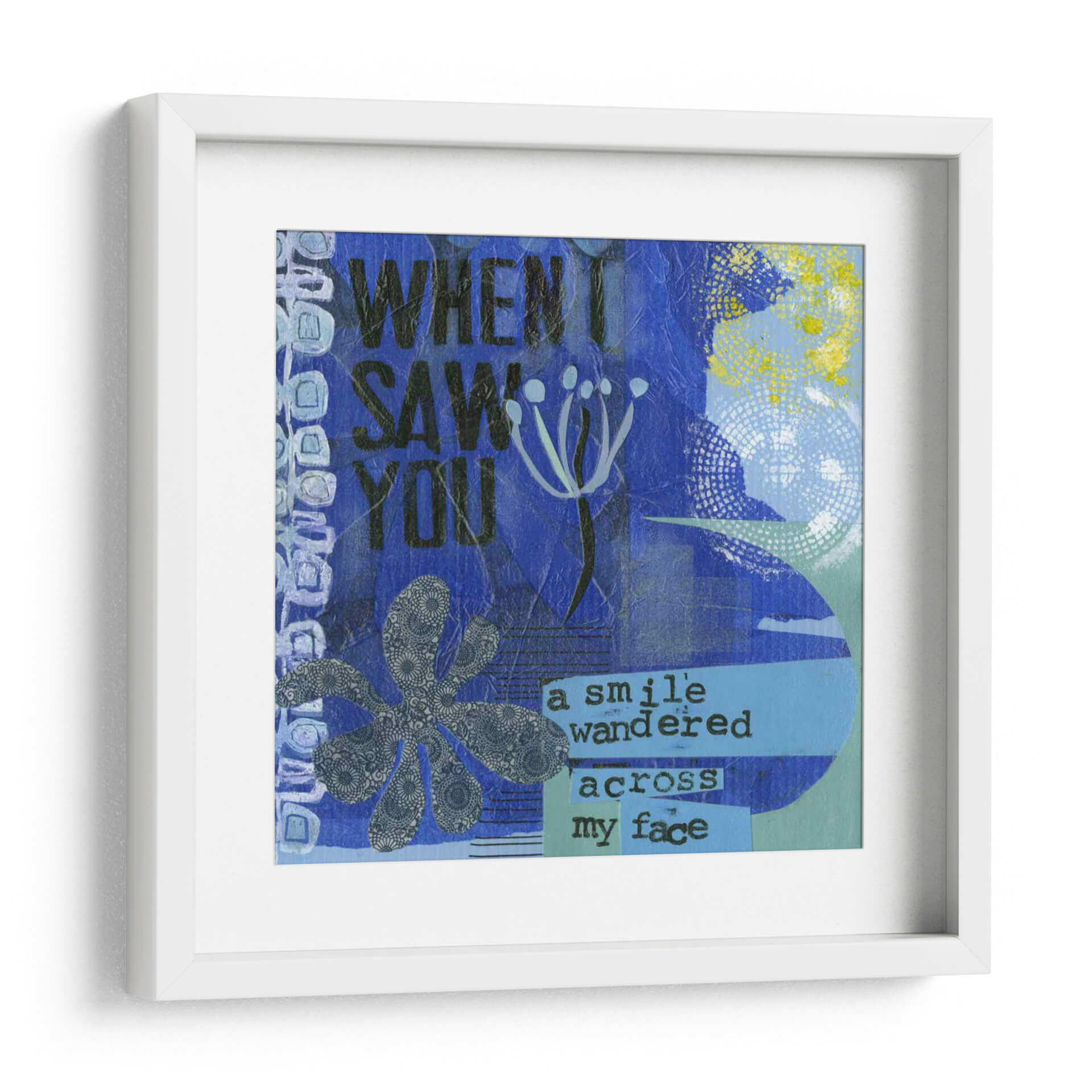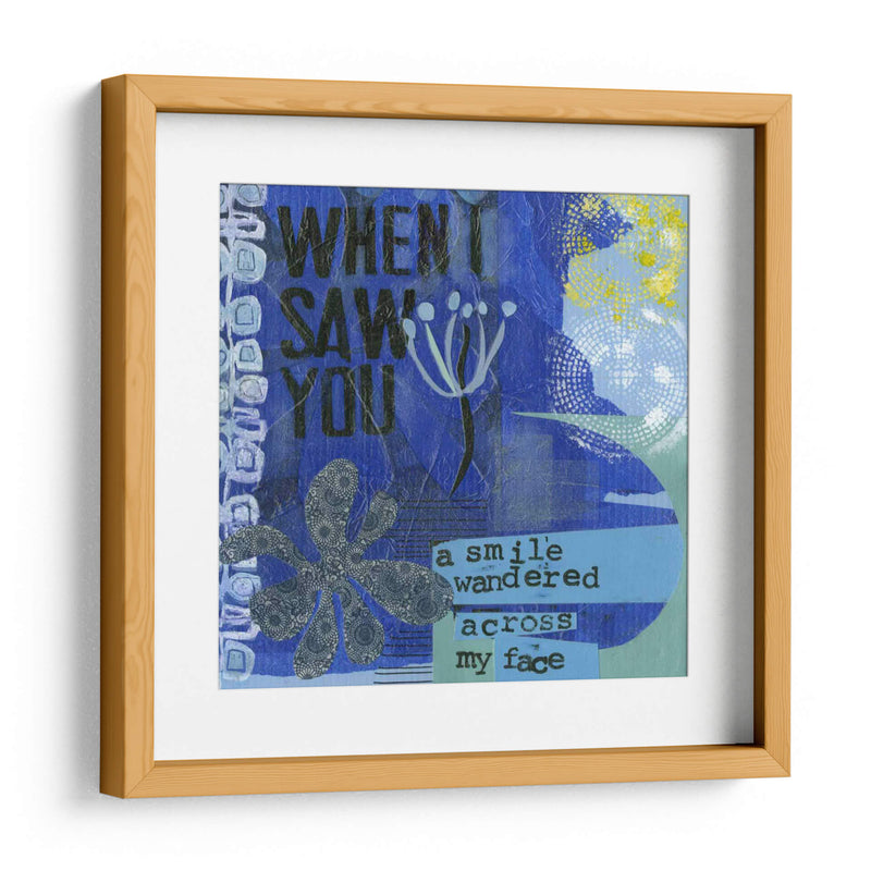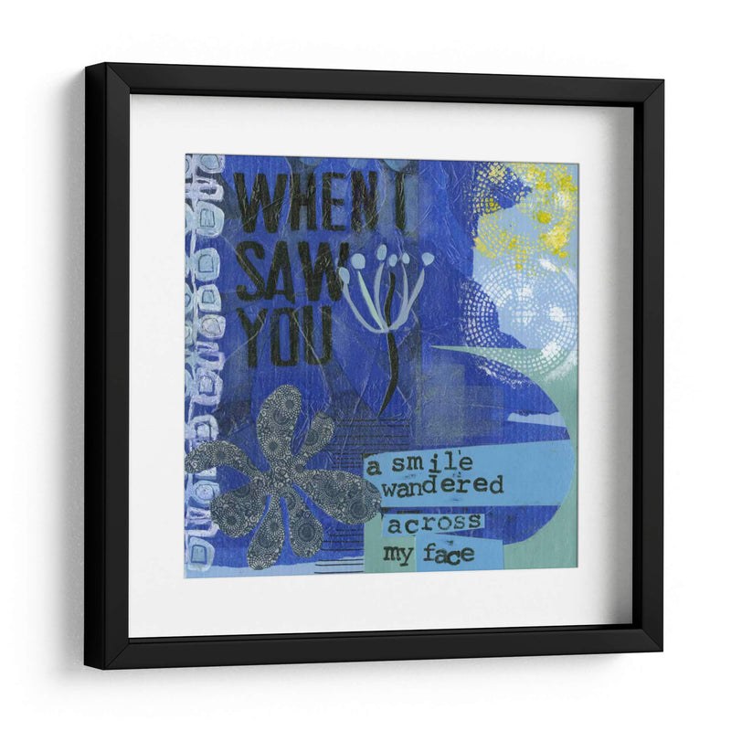 Sumérgete en la calidez y la positividad de "Sonrisa I", una cautivadora obra de arte de Deborah Velasquez que captura la esencia de un momento de alegría pura. Esta pieza, con su vibrante paleta de azules profundos, acentuados por toques de amarillo soleado y delicados patrones florales, crea una atmósfera de serenidad y optimismo. La composición abstracta, enriquecida con texturas visuales y elementos de collage, invita a la contemplación, mientras que la sutil inscripción "a smile wandered across my face" añade una capa de narración personal y relatable. Ideal para añadir un toque de inspiración y color a cualquier espacio, desde un acogedor hogar hasta una oficina moderna, este cuadro decorativo es una celebración de la felicidad simple. Su estilo único y contemporáneo lo convierte en un punto focal perfecto, capaz de transformar un ambiente y evocar emociones positivas en quienes lo contemplan. Descubre la belleza de la expresión artística y deja que "Sonrisa I" ilumine tu día y tu decoración.