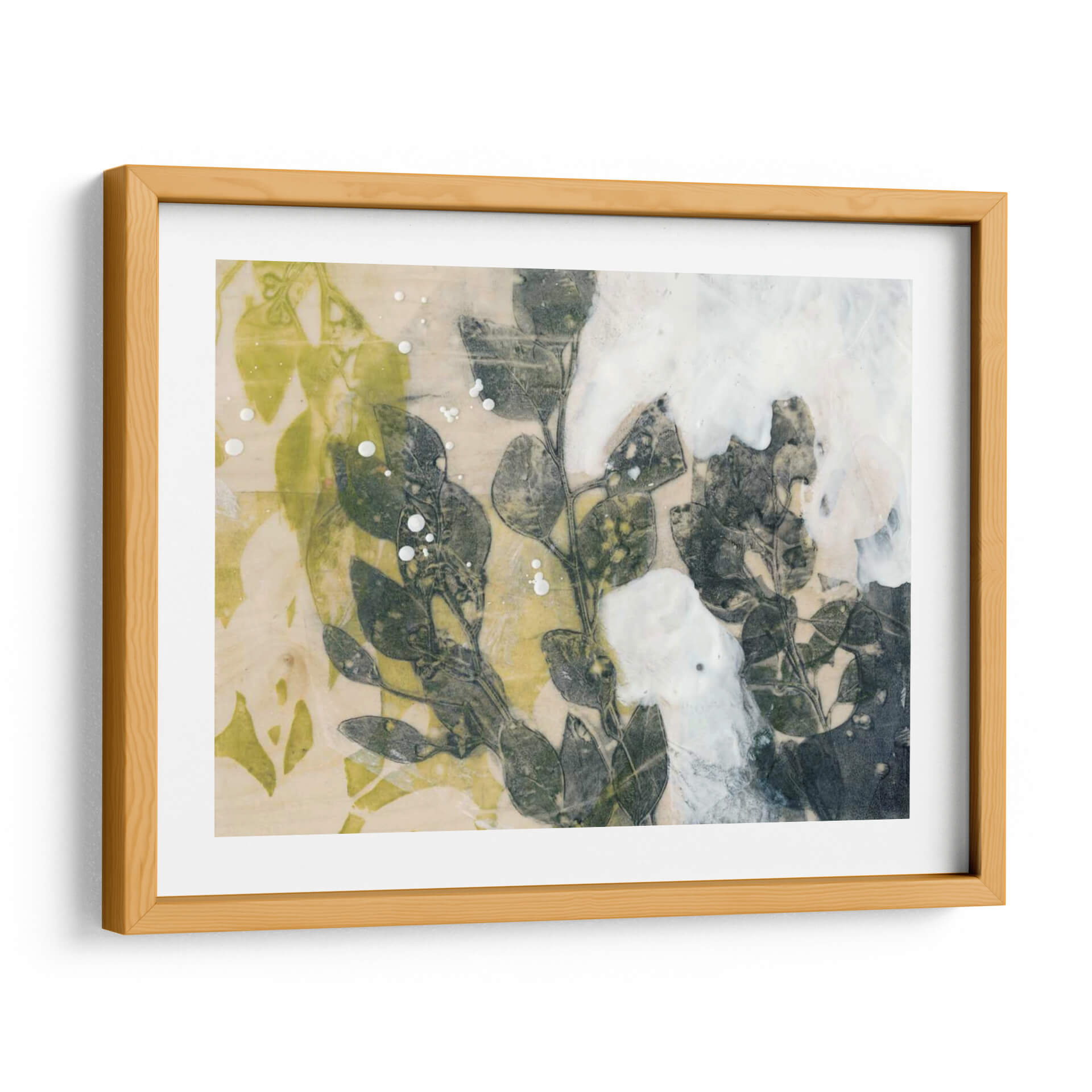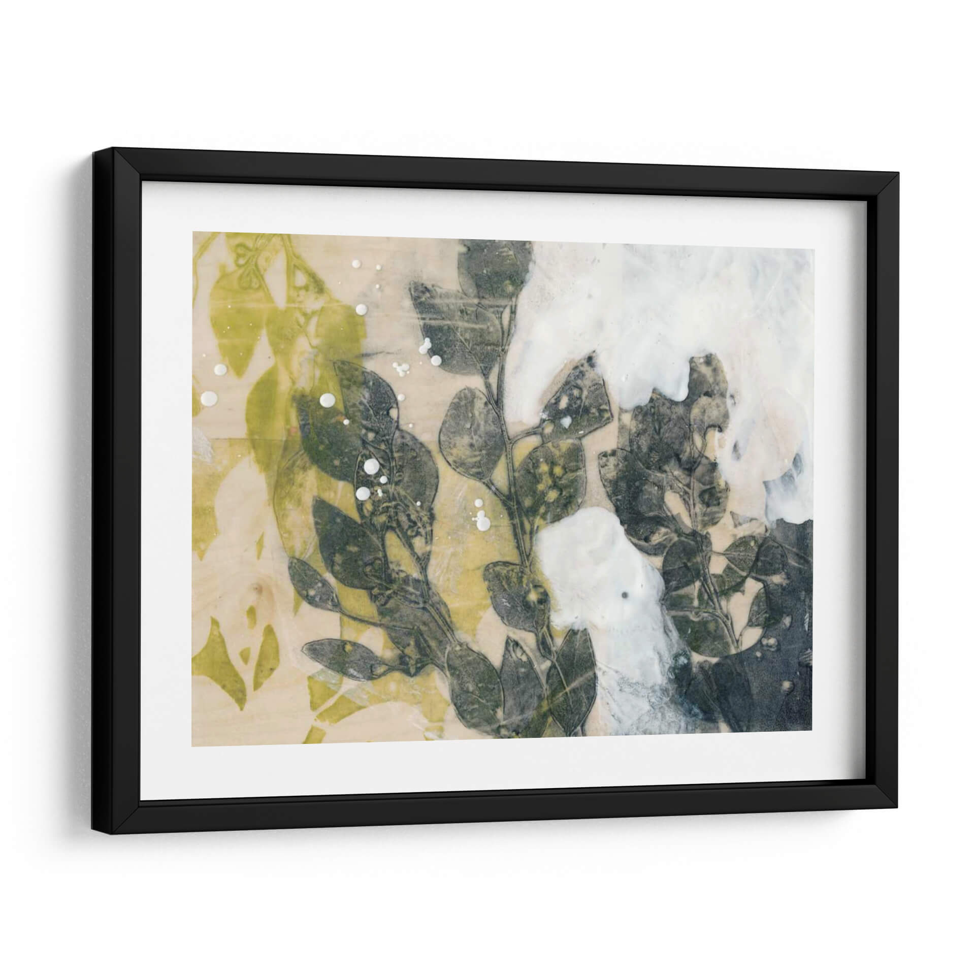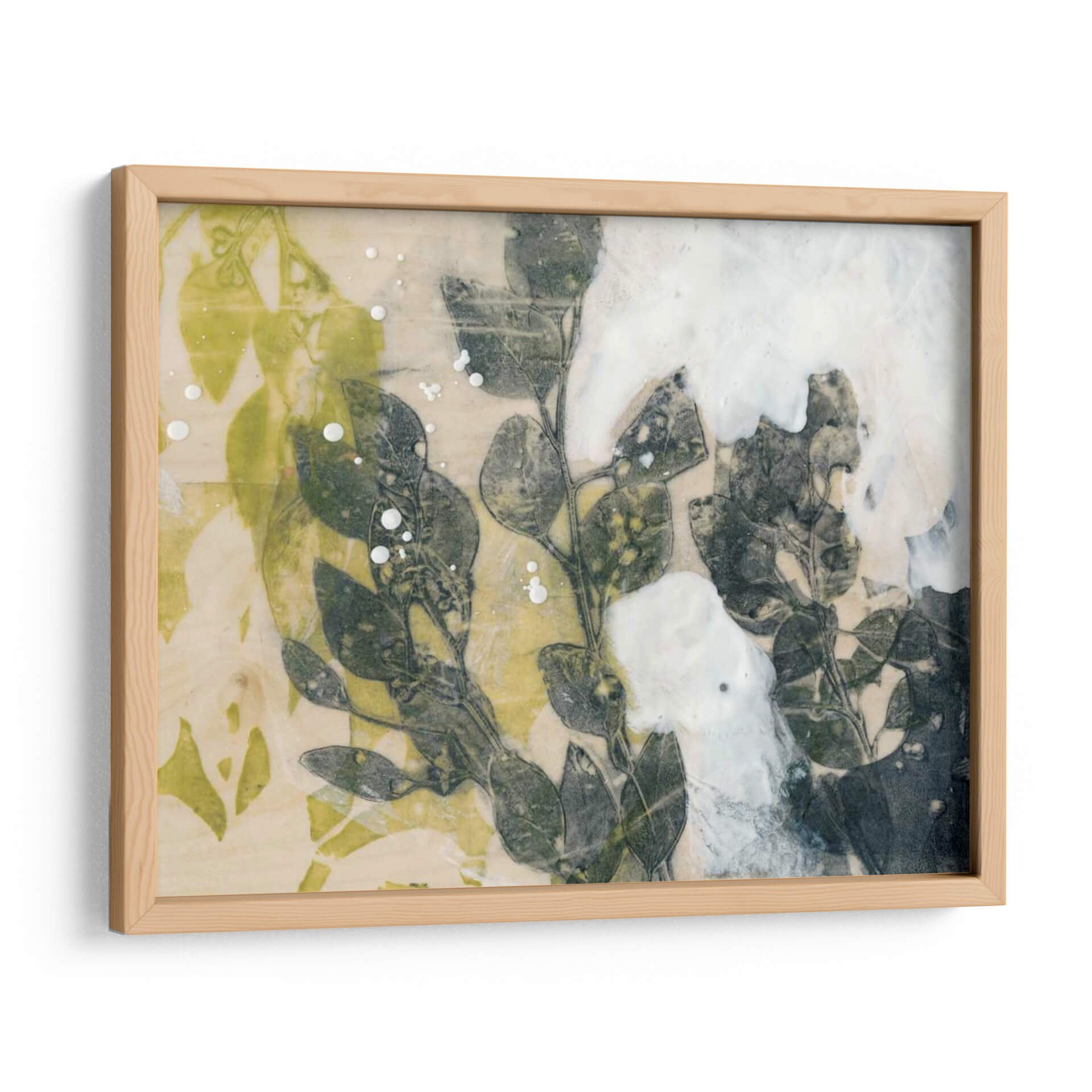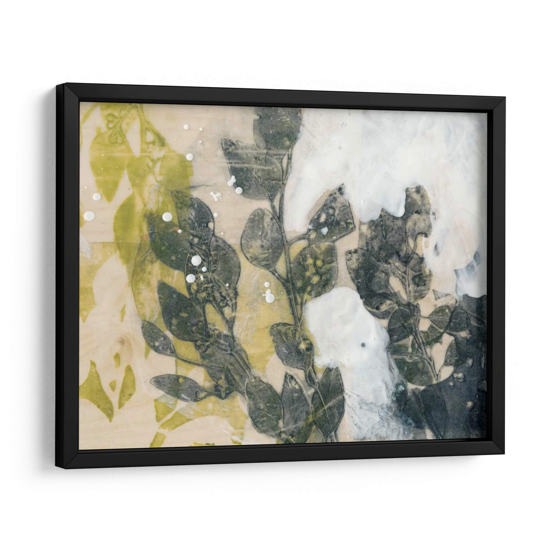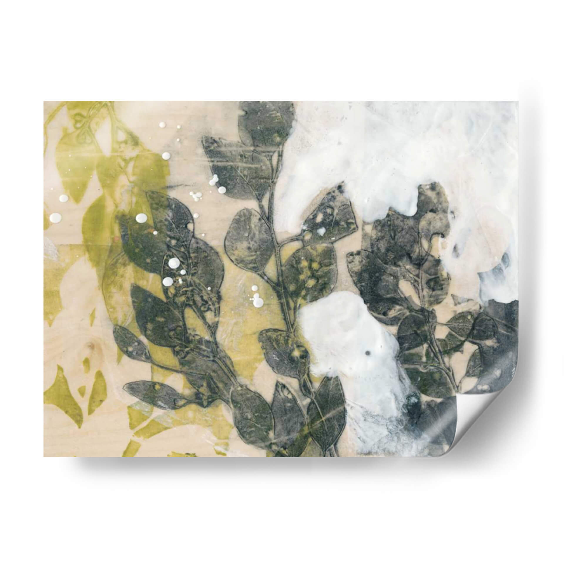 Sumérgete en la serenidad natural con "Spray De Hoja I", una obra de arte contemporáneo de Jennifer Goldberger que captura la delicadeza de la botánica en una composición evocadora. Este cuadro decorativo presenta un estudio detallado de hojas y ramas en tonos verdes profundos y grises, contrastando sutilmente con un fondo texturizado en crema y toques vibrantes de amarillo verdoso. La técnica utilizada, que parece imitar un proceso de impresión o transferencia, aporta una cualidad etérea y orgánica a la pieza, realzada por salpicaduras de blanco que sugieren rocío o movimiento. La atmósfera general es de calma y contemplación, invitando a la introspección y a la conexión con la naturaleza. Ideal para espacios que buscan un toque de sofisticación orgánica y serenidad, como salas de estar, dormitorios o estudios. "Spray De Hoja I" es más que una decoración; es una ventana a la belleza efímera del mundo natural, perfecta para quienes aprecian el arte botánico moderno y la sutileza cromática en sus ambientes. Su estilo abstracto y detallado permite que encaje en diversas decoraciones, aportando un elemento de diseño único y atemporal.