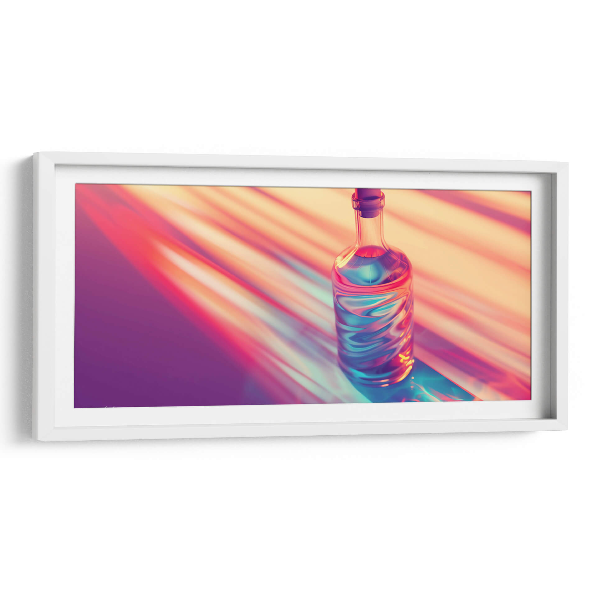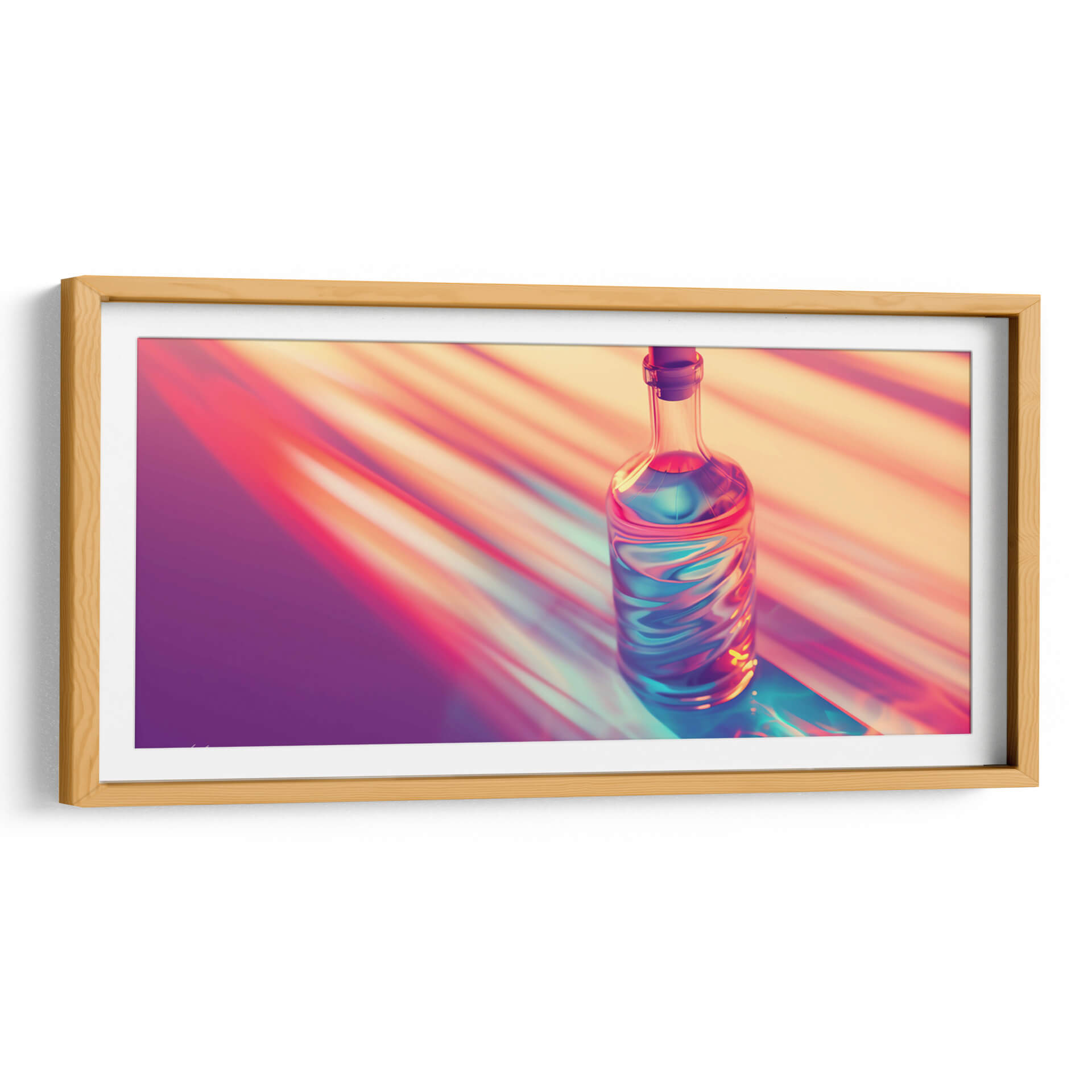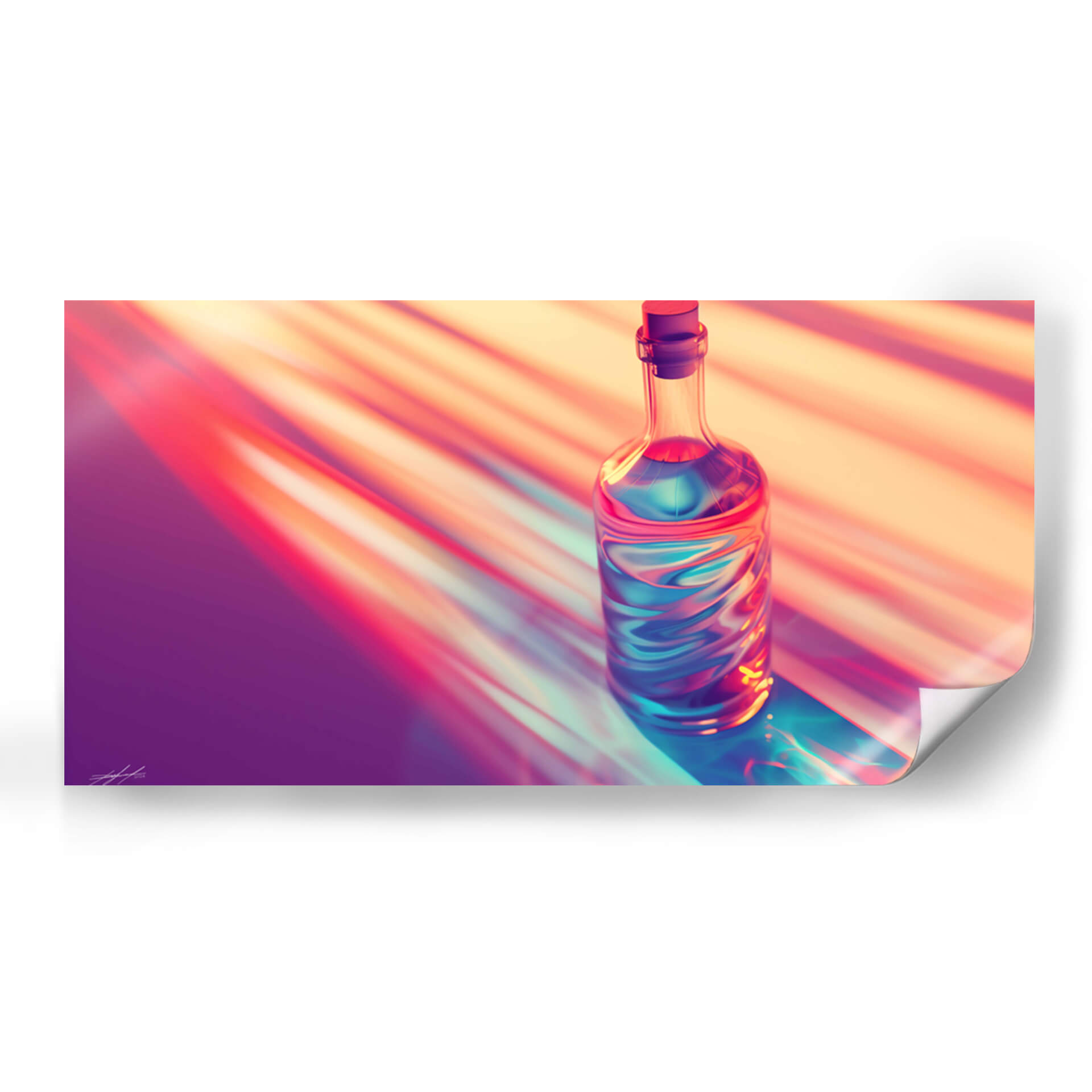 Sumérgete en la atmósfera hipnótica de "Sueño de un Bar - 8", una obra de arte digital que captura la esencia de un momento efímero y vibrante. Este cuadro decorativo presenta una botella de vidrio transparente, cuyo contenido líquido parece danzar con reflejos iridiscentes, capturando la luz de una manera etérea. El fondo se desdibuja en un caleidoscopio de colores cálidos y fríos, donde los tonos morados profundos se funden con rojos intensos, naranjas brillantes y toques de azul eléctrico, creando un efecto de movimiento y profundidad cautivador. Las líneas de luz diagonales que atraviesan la composición añaden una dinámica única, evocando la sensación de rayos de sol filtrándose o el resplandor de luces nocturnas. El estilo abstracto y surrealista de la pieza, junto con su paleta de colores audaz y contrastante, la convierte en un punto focal ideal para espacios modernos, salas de estar, bares o estudios que buscan un toque de originalidad y sofisticación. Esta pieza invita a la contemplación, sugiriendo historias y sensaciones que van más allá de lo aparente, transformando cualquier pared en una ventana a un mundo de ensueño. Es perfecta para quienes aprecian el arte contemporáneo que juega con la percepción y la emoción, añadiendo carácter y un estallido de color a su decoración.