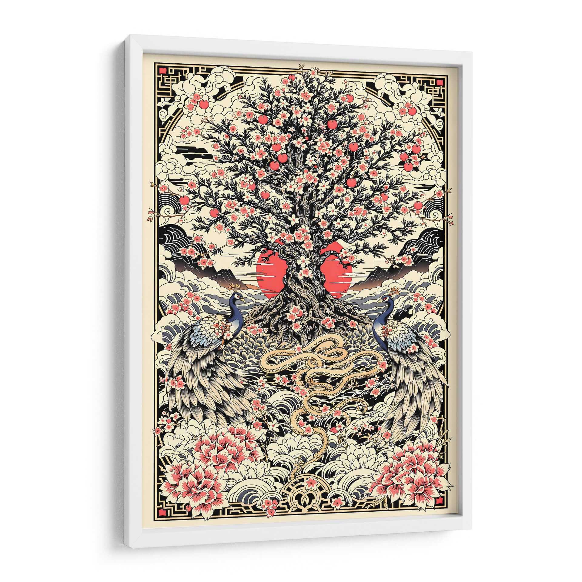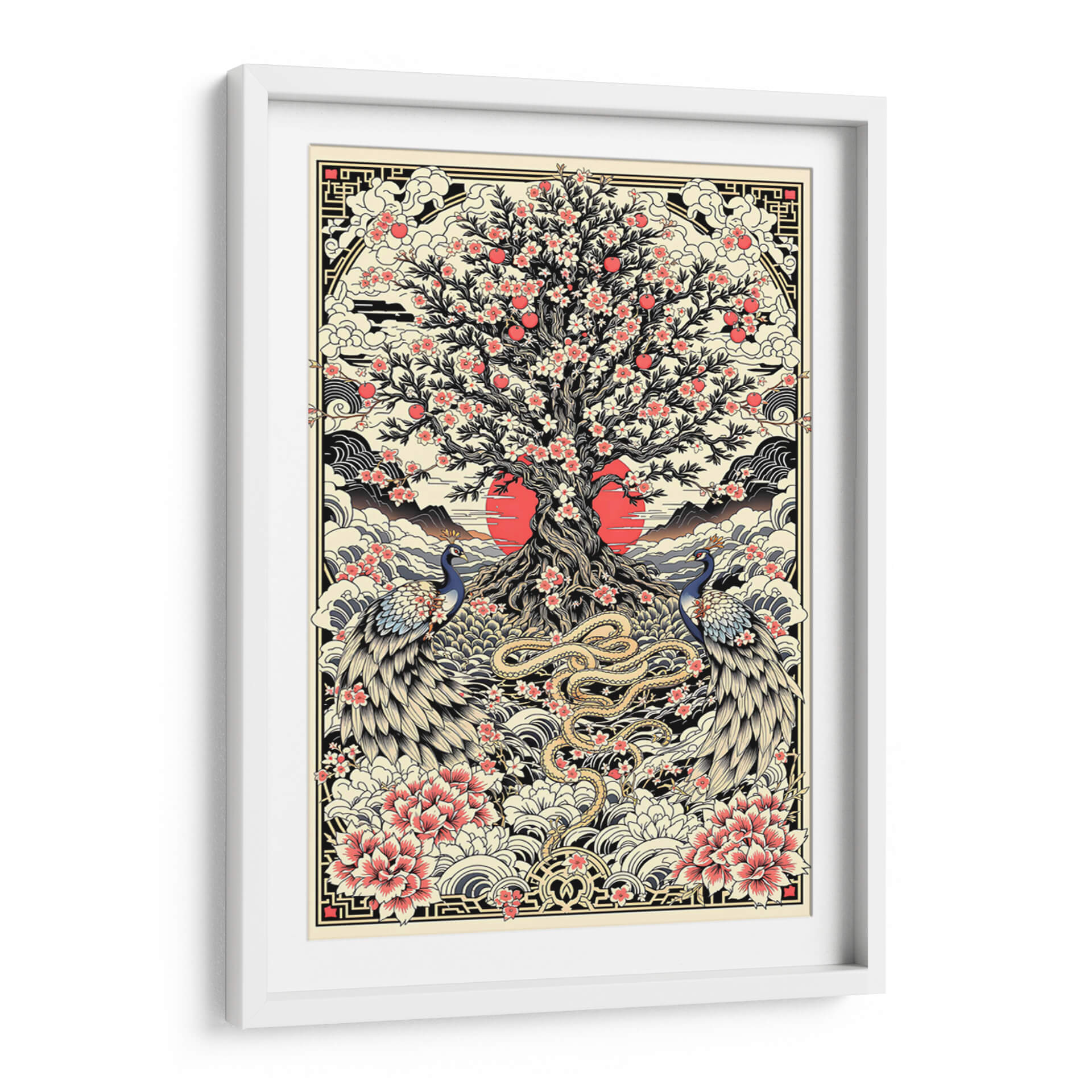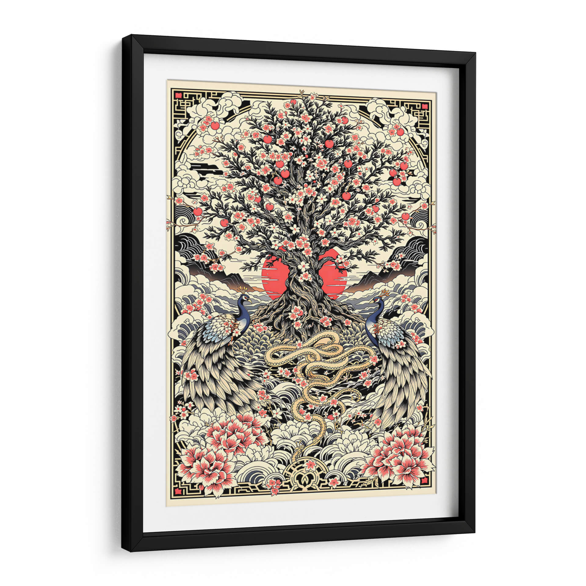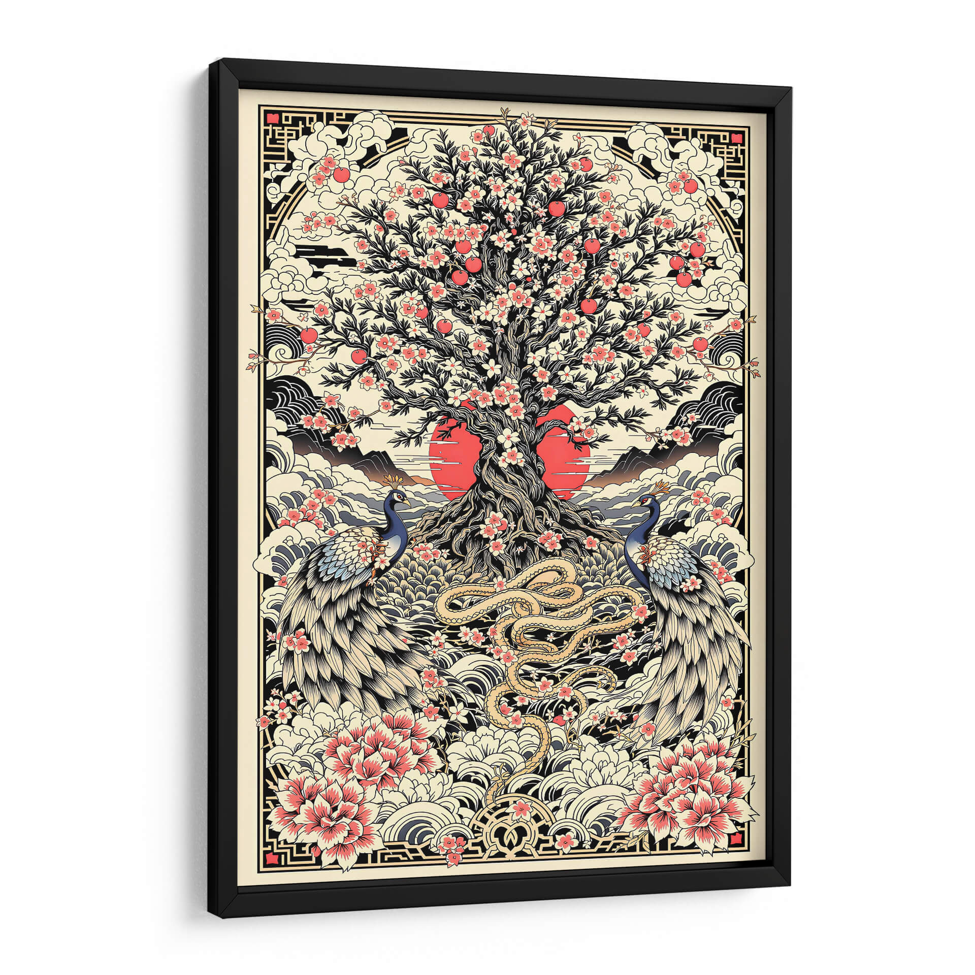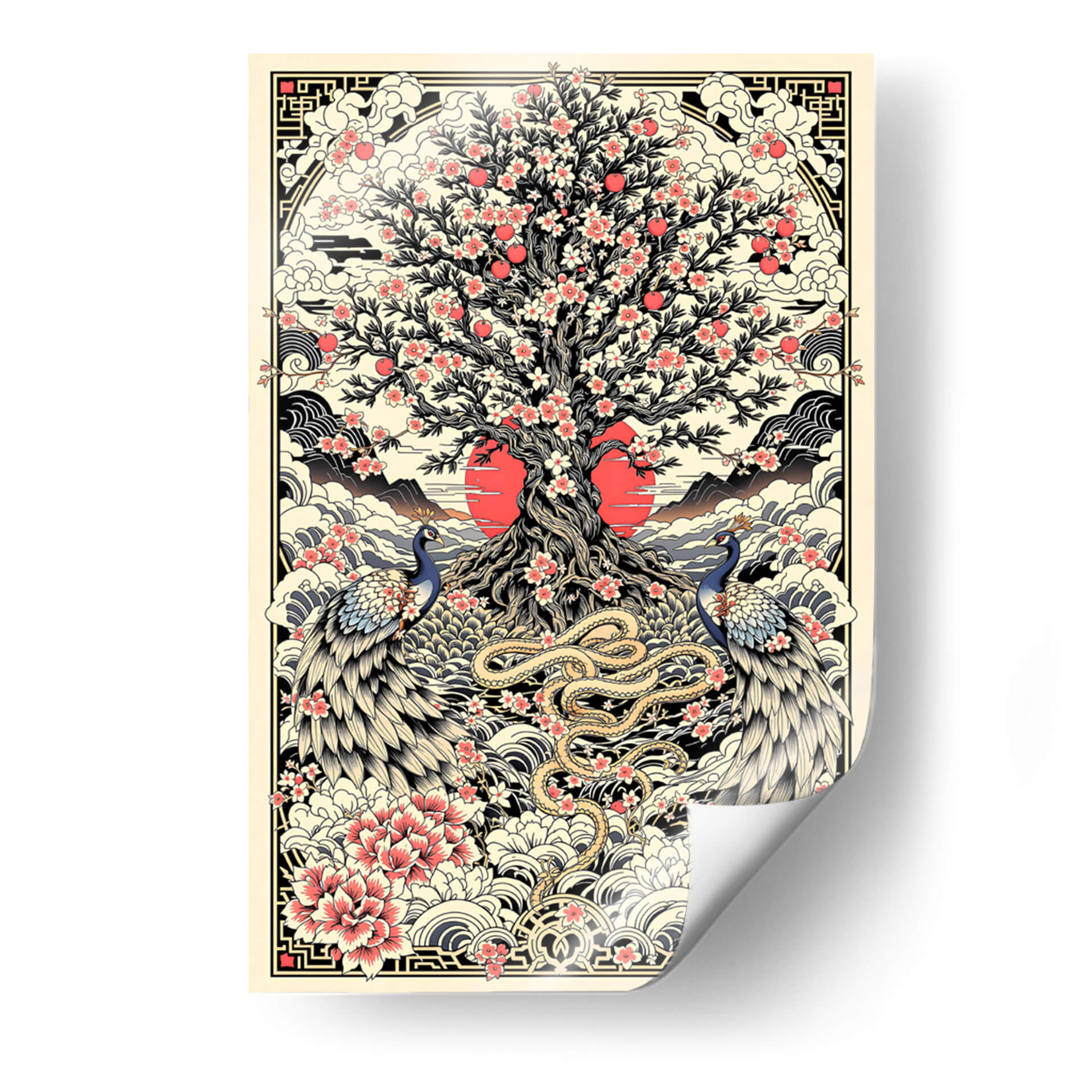 Sumérgete en la mística oriental con este cautivador cuadro decorativo, "Tattoo Art 005", de DEA Digital Esoteric Art. La obra despliega un árbol de la vida exuberante, cargado de frutos y flores rosadas, coronado por un sol rojo incandescente y envuelto en nubes estilizadas. A sus pies, dos majestuosos pavos reales observan el entrelazamiento de una serpiente dorada, mientras grandes peonías y flores más pequeñas completan la escena en un despliegue de color y simbolismo. Los tonos predominantes son el crema, el negro, el rojo vibrante y toques de azul y dorado, creando una atmósfera de equilibrio entre lo terrenal y lo espiritual. El intrincado diseño, con bordes ornamentados y un estilo que evoca el arte tradicional japonés y la estética del tatuaje, lo convierte en una pieza ideal para quienes buscan añadir un toque de elegancia exótica, misterio y serenidad a sus espacios. Perfecto para salones, dormitorios o estudios que deseen una declaración visual impactante y llena de significado.