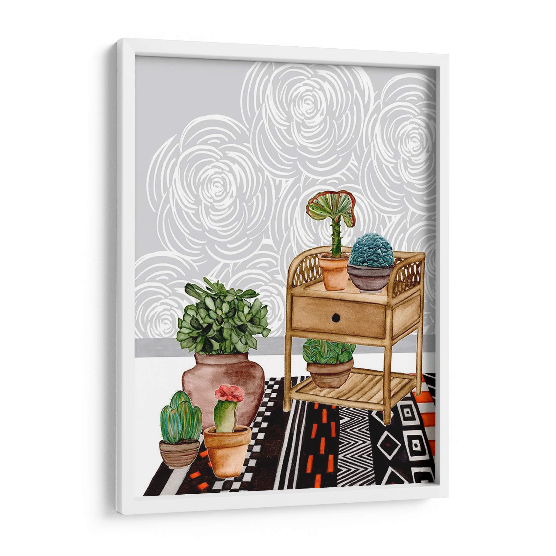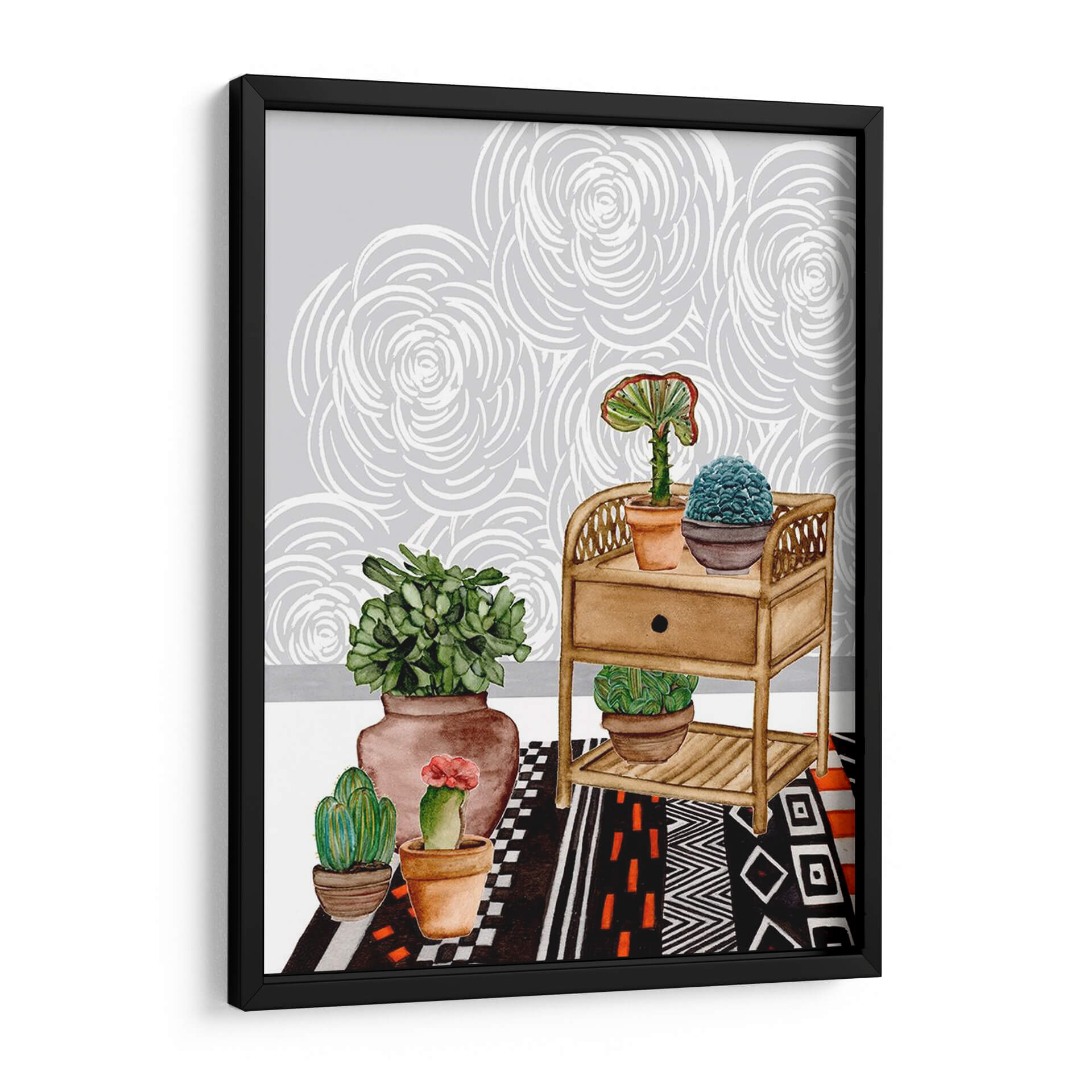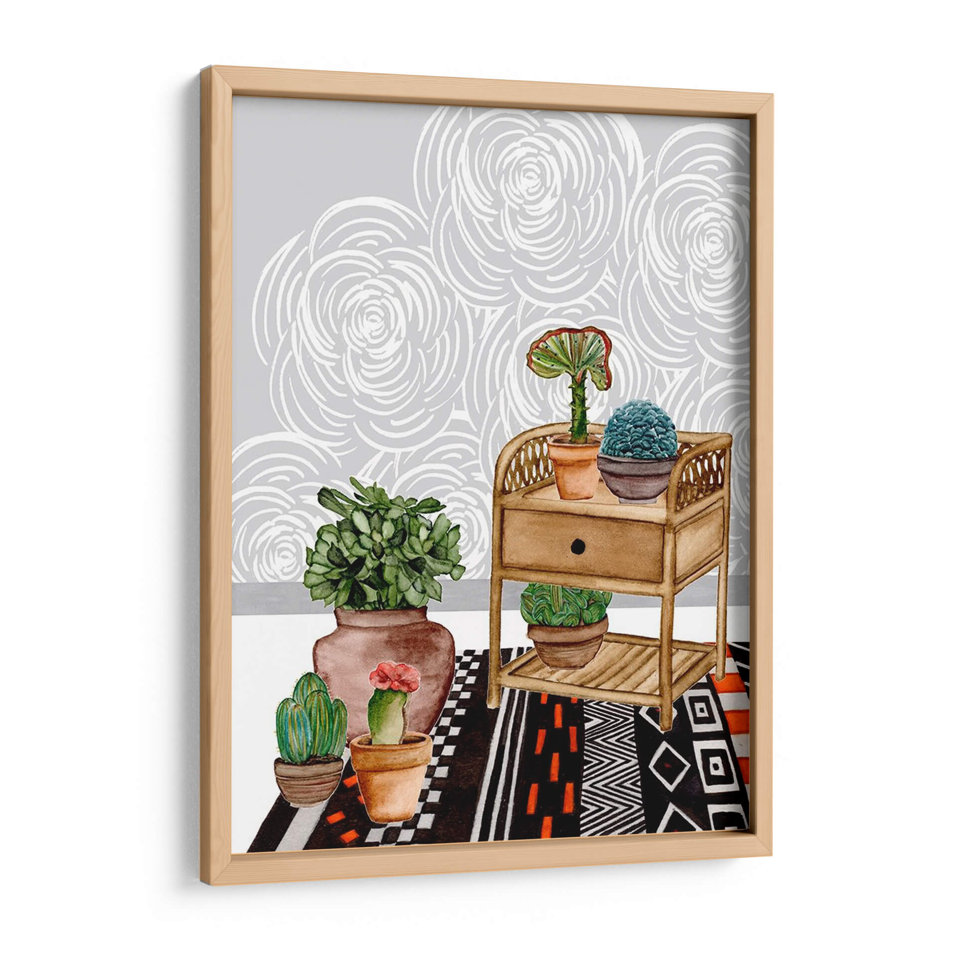 Sumérgete en la serenidad del desierto con "Tejidos Del Desierto II", una cautivadora obra de arte de Melissa Wang. Esta pieza evoca la tranquilidad de un oasis interior, presentando una armoniosa composición de suculentas y cactus dispuestas sobre una alfombra de patrones geométricos. Los tonos tierra predominantes y los sutiles toques de verde y naranja crean una atmósfera cálida y acogedora, perfecta para añadir vida a cualquier rincón de tu hogar u oficina. El fondo texturizado con delicadas formas florales en gris suave aporta profundidad y un aire contemporáneo, complementando la vibrante escena de la naturaleza. Ideal para quienes buscan infundir un espíritu bohemio y natural en su decoración, este cuadro decorativo es una invitación a la calma y la conexión con el entorno. Su estilo de acuarela detallada y su composición equilibrada lo convierten en una adición versátil para salas de estar, dormitorios o estudios, aportando una dosis de frescura y sofisticación.