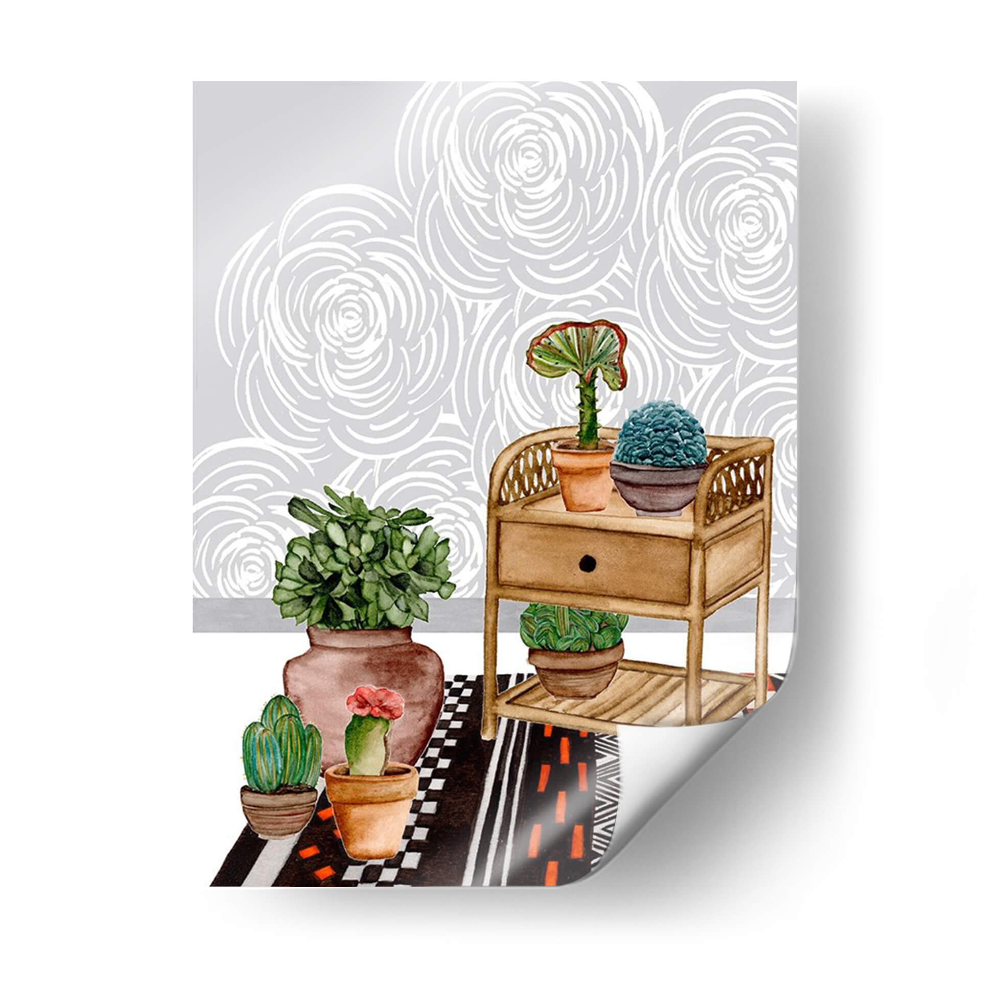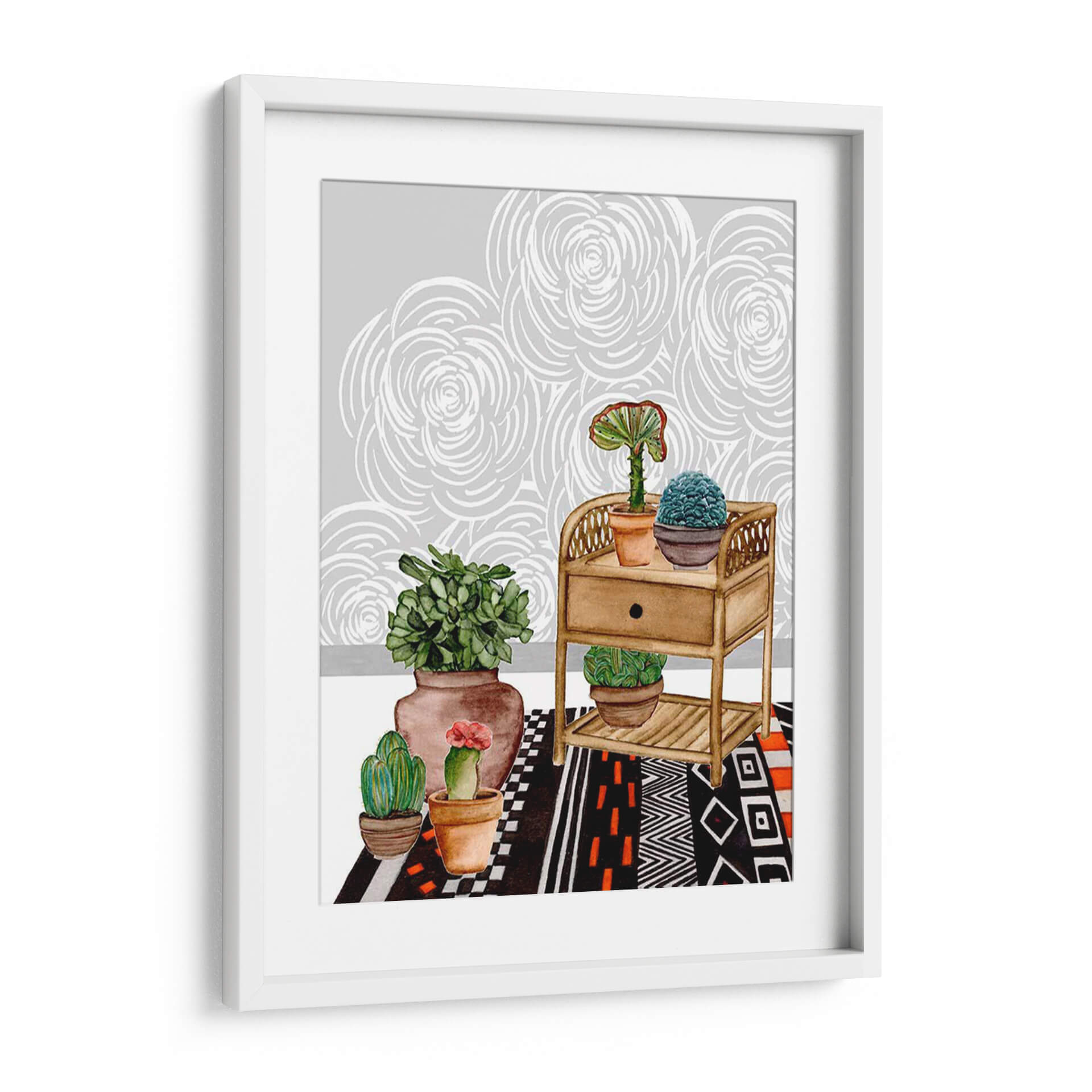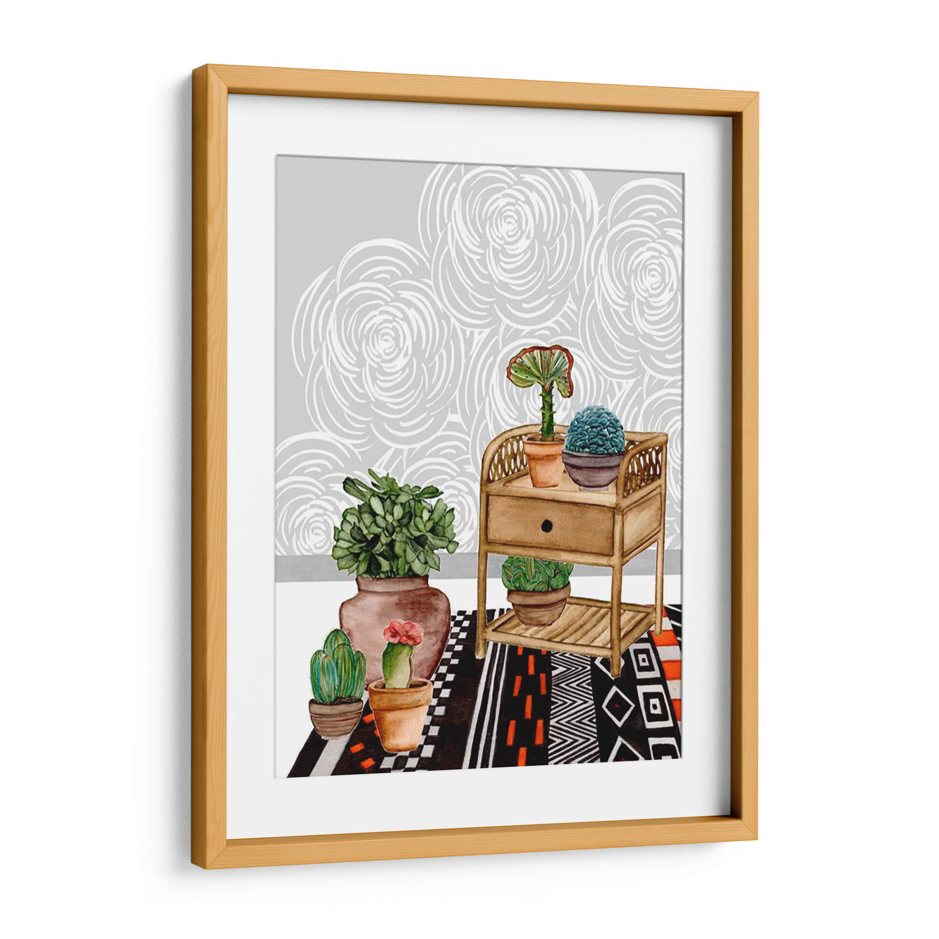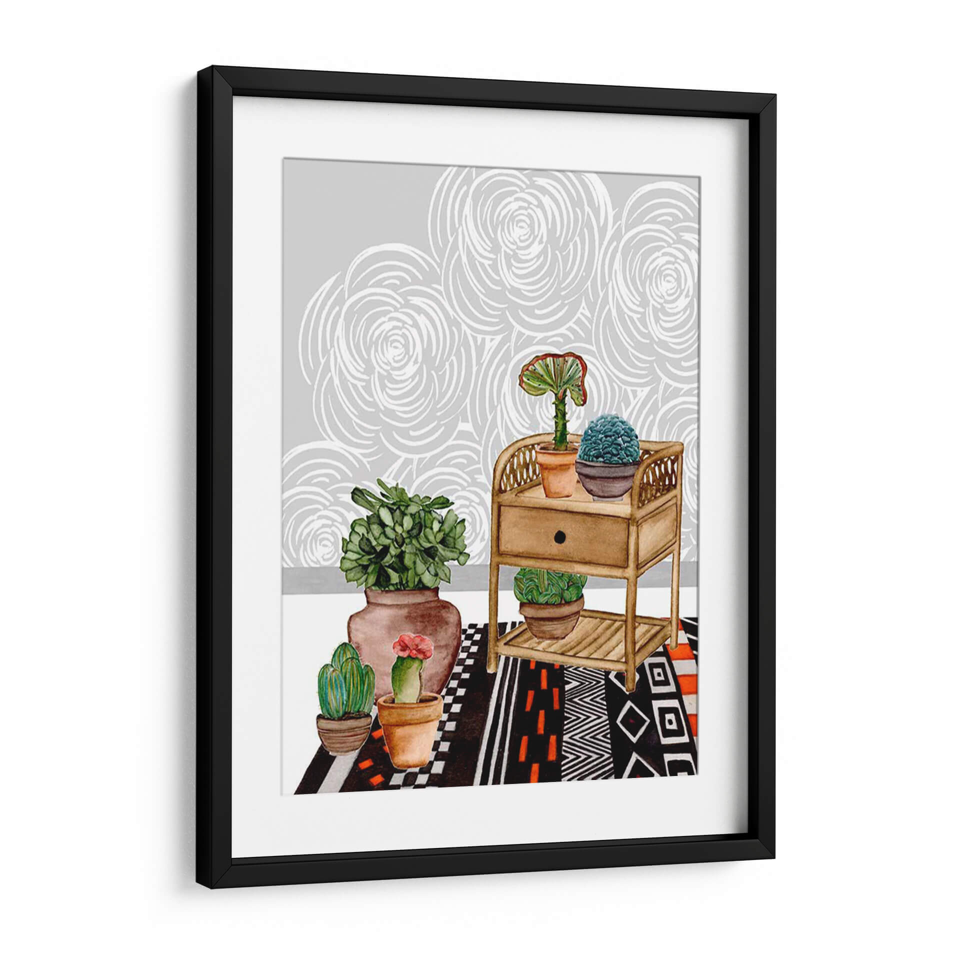 Sumérgete en la serenidad del desierto con "Tejidos Del Desierto II", una cautivadora obra de arte de Melissa Wang. Esta pieza evoca la tranquilidad de un oasis interior, presentando una armoniosa composición de suculentas y cactus dispuestas sobre una alfombra de patrones geométricos. Los tonos tierra predominantes y los sutiles toques de verde y naranja crean una atmósfera cálida y acogedora, perfecta para añadir vida a cualquier rincón de tu hogar u oficina. El fondo texturizado con delicadas formas florales en gris suave aporta profundidad y un aire contemporáneo, complementando la vibrante escena de la naturaleza. Ideal para quienes buscan infundir un espíritu bohemio y natural en su decoración, este cuadro decorativo es una invitación a la calma y la conexión con el entorno. Su estilo de acuarela detallada y su composición equilibrada lo convierten en una adición versátil para salas de estar, dormitorios o estudios, aportando una dosis de frescura y sofisticación.