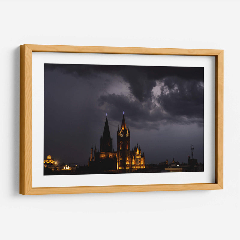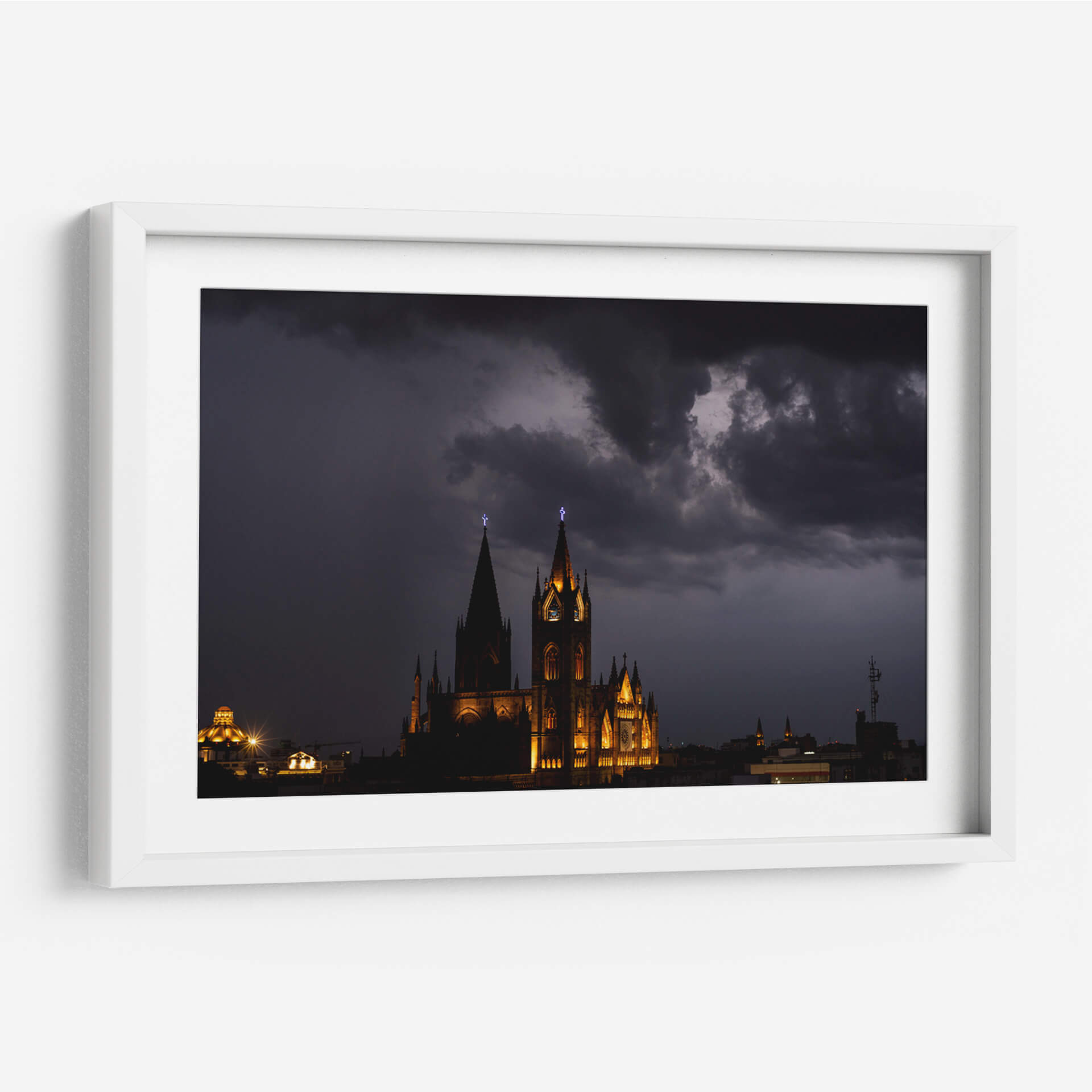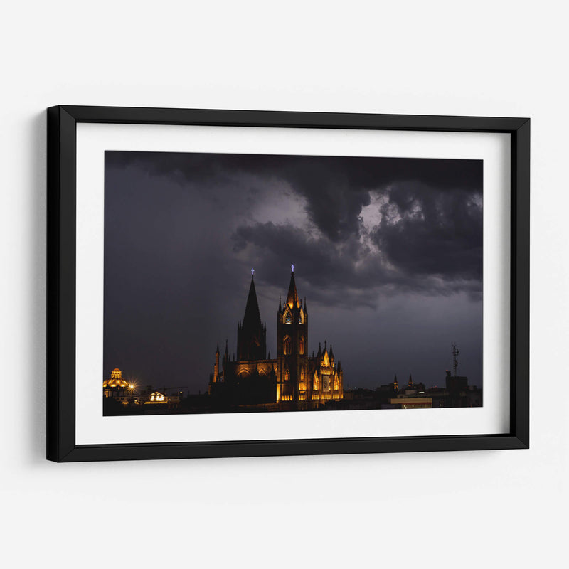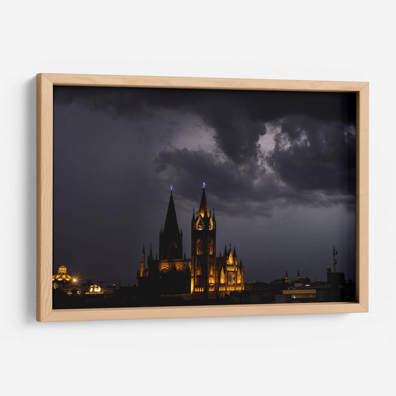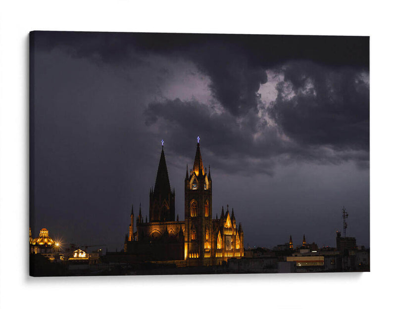 Sumérgete en la majestuosidad nocturna de Guadalajara con este impactante cuadro decorativo del Templo Expiatorio, capturado por el artista Jaime López Portillo. La obra presenta la imponente arquitectura gótica del templo iluminada por luces cálidas y doradas, contrastando dramáticamente con un cielo oscuro y tormentoso. Las nubes densas y dramáticas crean una atmósfera de misterio y poder, mientras que las luces del templo emanan una sensación de esperanza y espiritualidad. Las agujas se elevan hacia el firmamento, coronadas por cruces que brillan con una luz etérea, añadiendo un toque celestial a la escena terrenal. La composición, que incluye el horizonte de la ciudad con edificios iluminados, ancla la majestuosidad del templo en su entorno urbano, invitando a la contemplación de la fe y la arquitectura en el corazón de la metrópoli. Este cuadro decorativo es perfecto para quienes buscan infundir sus espacios con una sensación de grandeza, historia y un toque de drama místico. Ideal para salones, estudios o entradas, aportando un punto focal de conversación y reflexión.