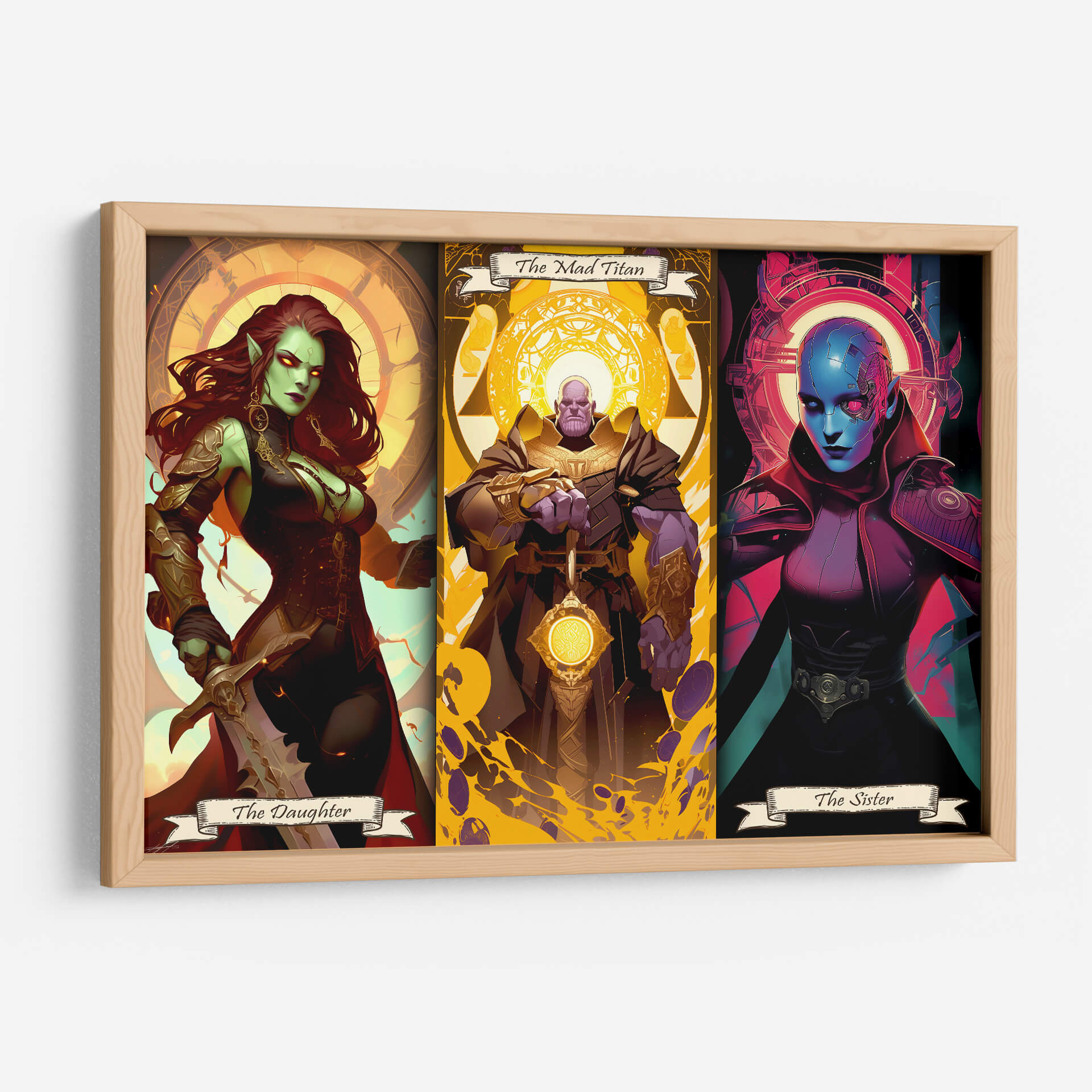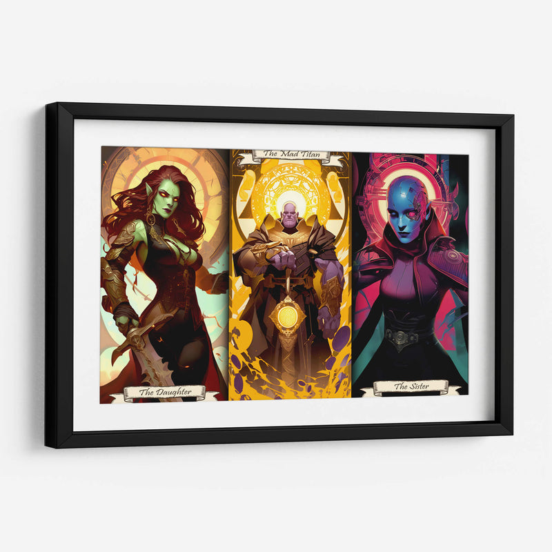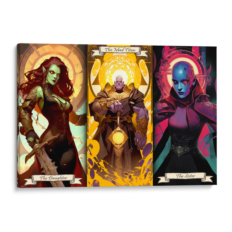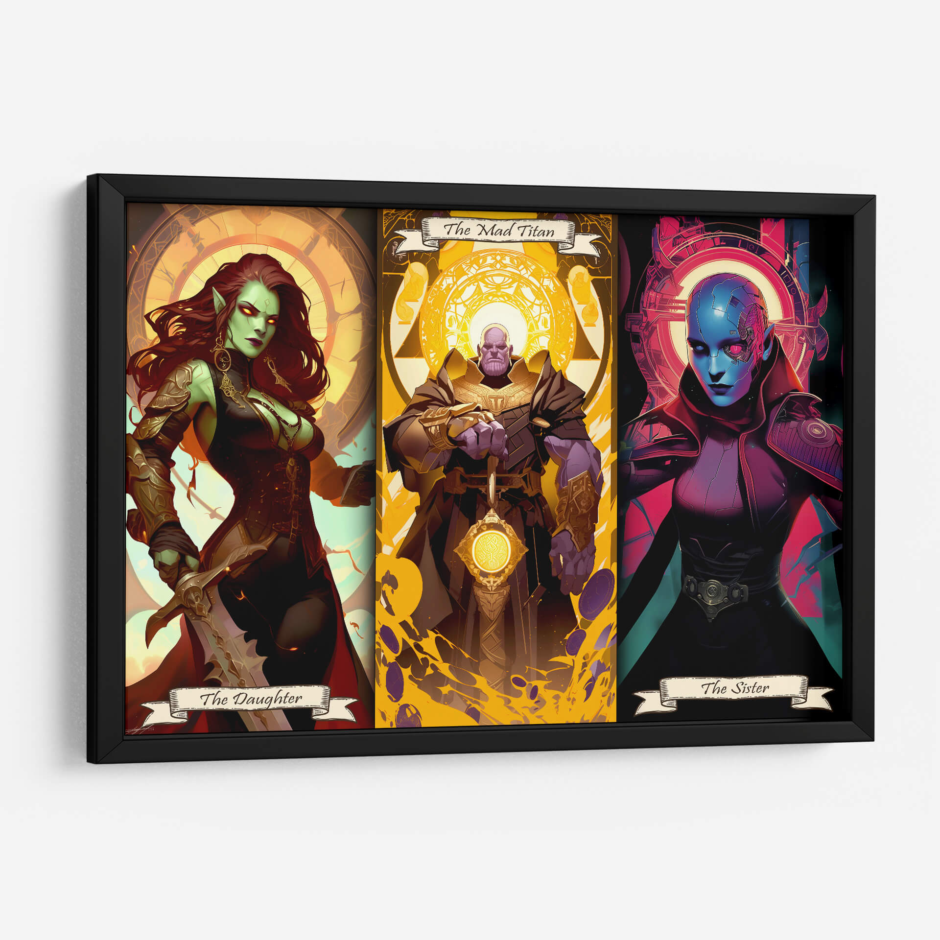 Sumérgete en el universo épico con este impresionante cuadro decorativo "The Mad Titan" del artista DeLaVegaGaming. Esta obra maestra tríptica captura la esencia de personajes icónicos con un estilo de ilustración digital vibrante y detallado. En el panel izquierdo, "The Daughter" emerge con una fuerza imponente, su piel verde y mirada penetrante adornada con detalles dorados y armadura intrincada, empuñando una espada que sugiere poder y determinación. El panel central presenta al imponente "The Mad Titan", una figura majestuosa con su armadura dorada y un orbe brillante que irradia energía cósmica, evocando una sensación de control y destino. Finalmente, "The Sister" en el panel derecho, con su piel azul y un aura futurista, se muestra en un contraste de luces rosadas y moradas, simbolizando misterio y una avanzada tecnología. La paleta de colores es rica y contrastante, pasando de los tonos cálidos y dorados del centro a los verdes intensos y los azules fríos de los extremos, creando un equilibrio visual dinámico. Este cuadro decorativo es ideal para quienes buscan añadir un toque de fantasía, poder y narrativa a su sala de estar, oficina o cualquier espacio que desee un punto focal audaz y lleno de carácter. Perfecto para los aficionados a la ciencia ficción y el arte de personajes.