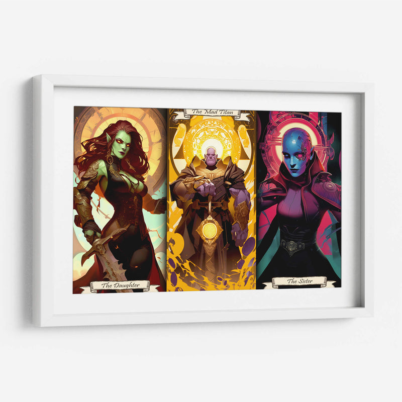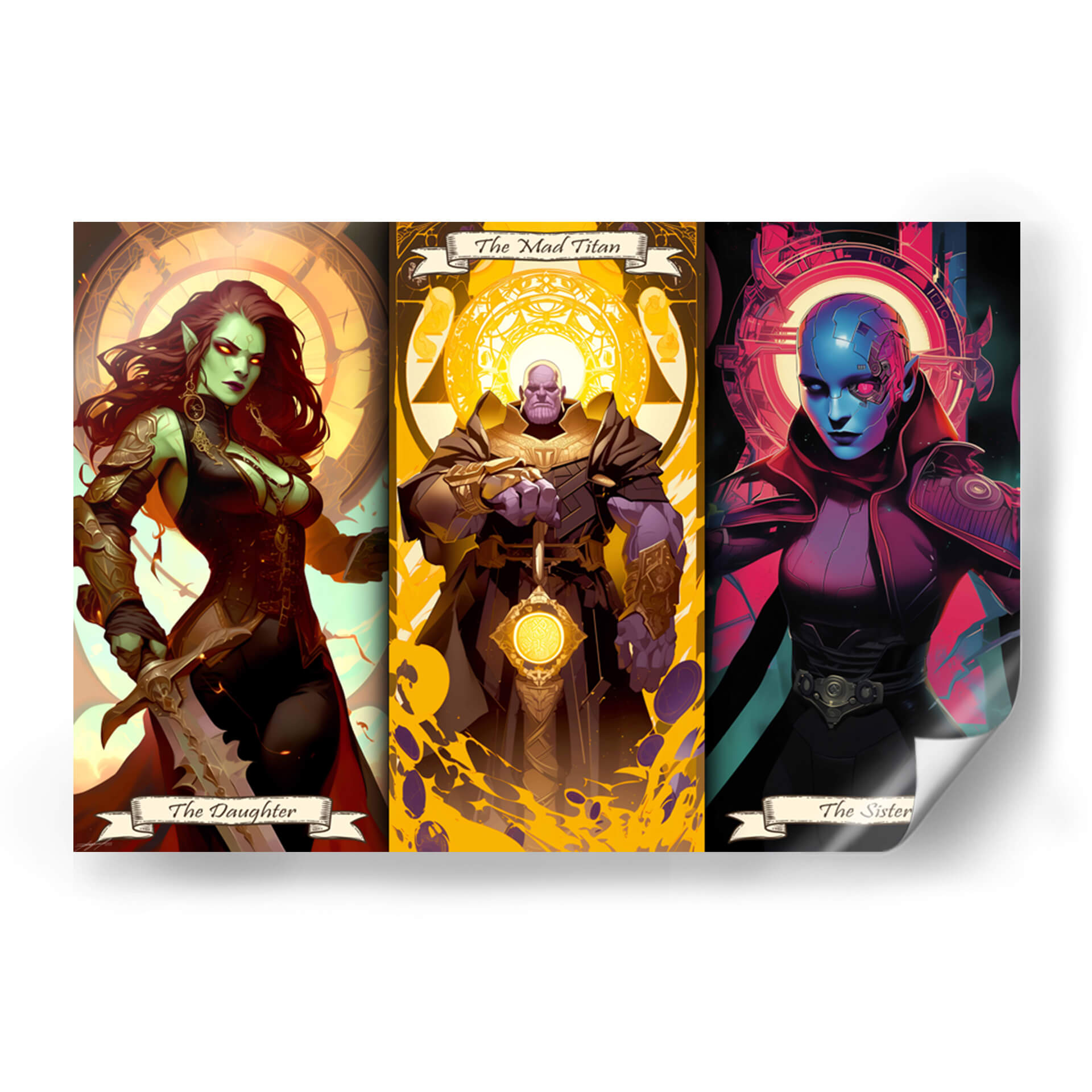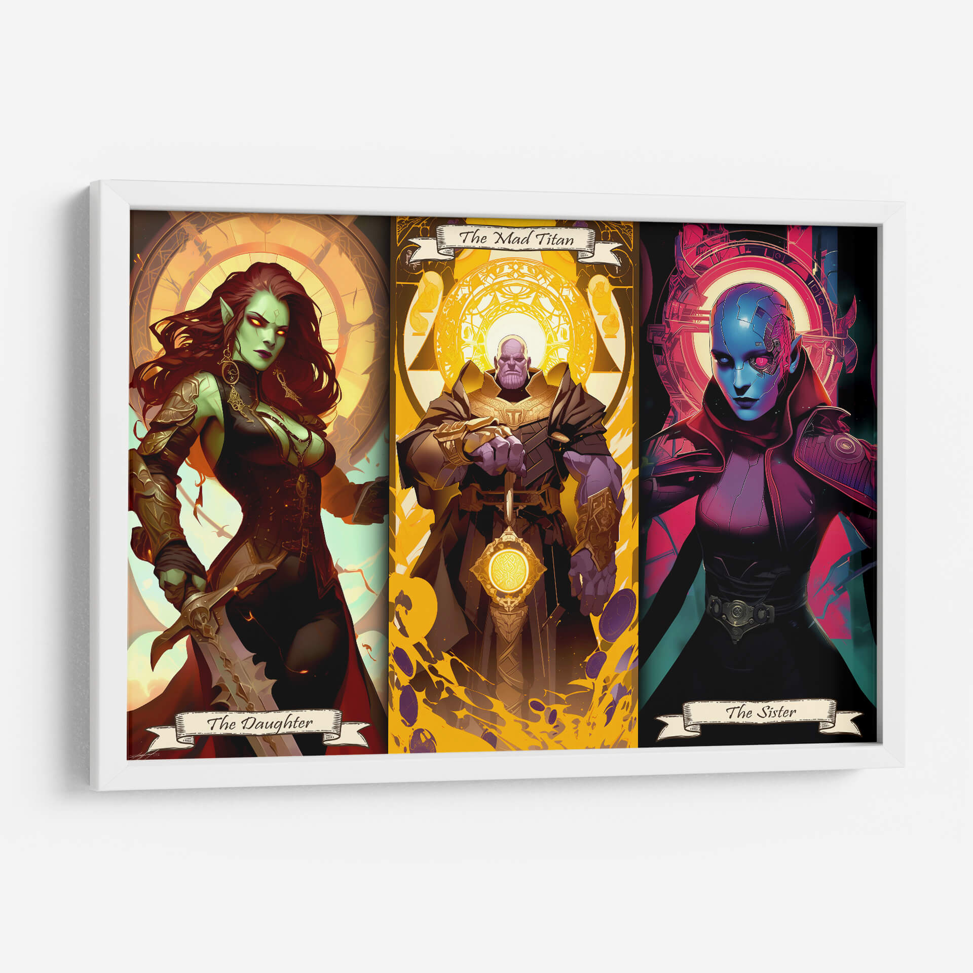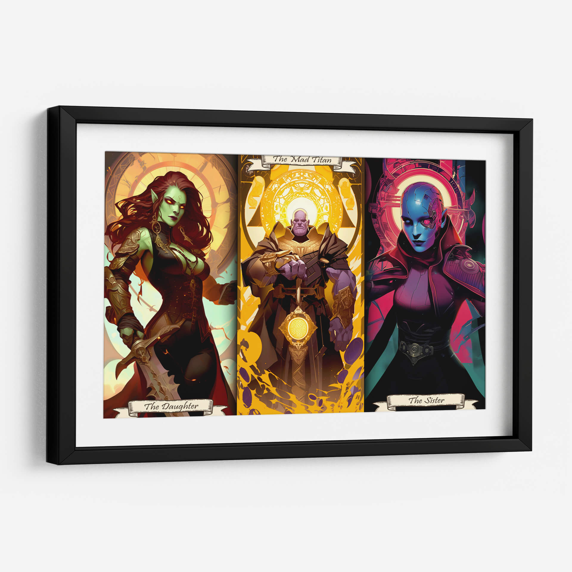 Sumérgete en el universo épico con este impresionante cuadro decorativo "The Mad Titan" del artista DeLaVegaGaming. Esta obra maestra tríptica captura la esencia de personajes icónicos con un estilo de ilustración digital vibrante y detallado. En el panel izquierdo, "The Daughter" emerge con una fuerza imponente, su piel verde y mirada penetrante adornada con detalles dorados y armadura intrincada, empuñando una espada que sugiere poder y determinación. El panel central presenta al imponente "The Mad Titan", una figura majestuosa con su armadura dorada y un orbe brillante que irradia energía cósmica, evocando una sensación de control y destino. Finalmente, "The Sister" en el panel derecho, con su piel azul y un aura futurista, se muestra en un contraste de luces rosadas y moradas, simbolizando misterio y una avanzada tecnología. La paleta de colores es rica y contrastante, pasando de los tonos cálidos y dorados del centro a los verdes intensos y los azules fríos de los extremos, creando un equilibrio visual dinámico. Este cuadro decorativo es ideal para quienes buscan añadir un toque de fantasía, poder y narrativa a su sala de estar, oficina o cualquier espacio que desee un punto focal audaz y lleno de carácter. Perfecto para los aficionados a la ciencia ficción y el arte de personajes.