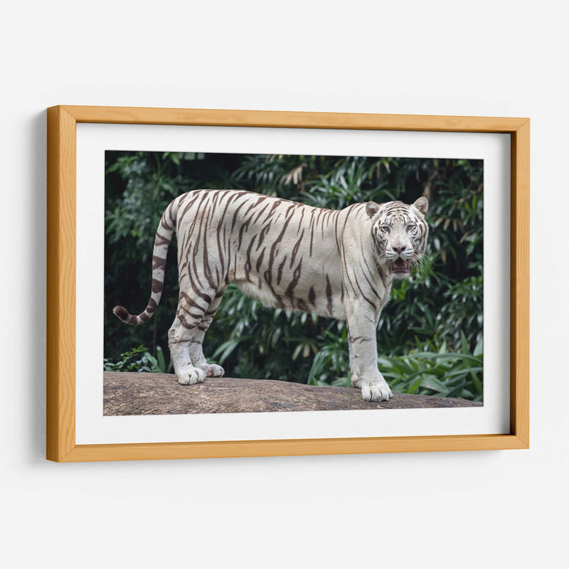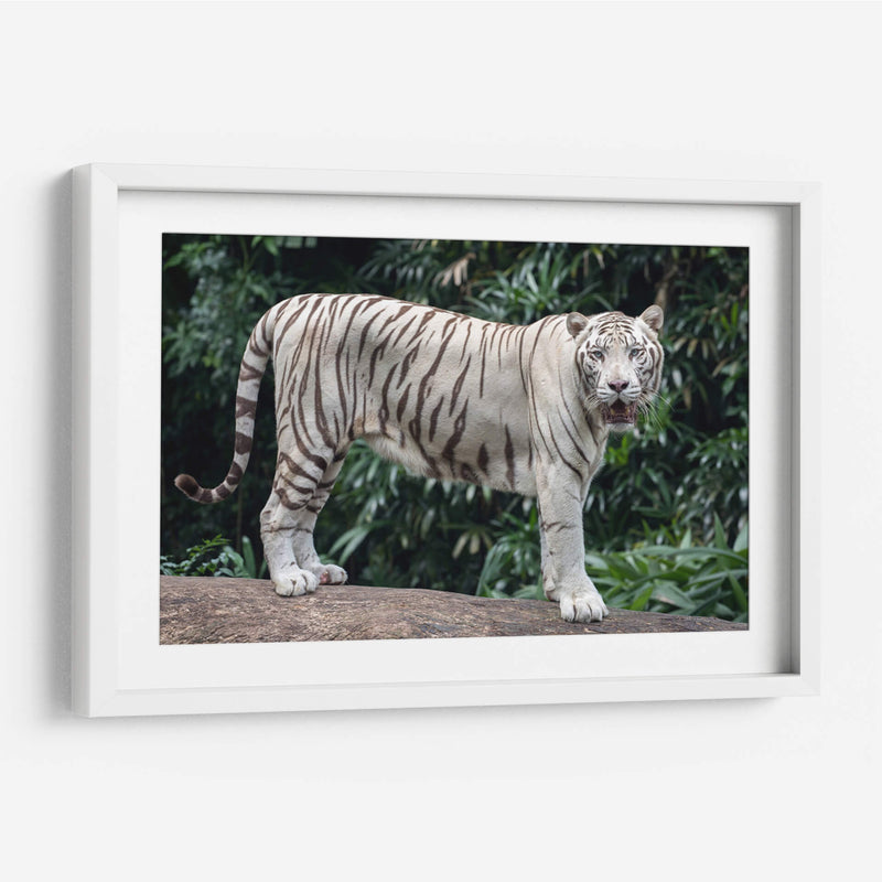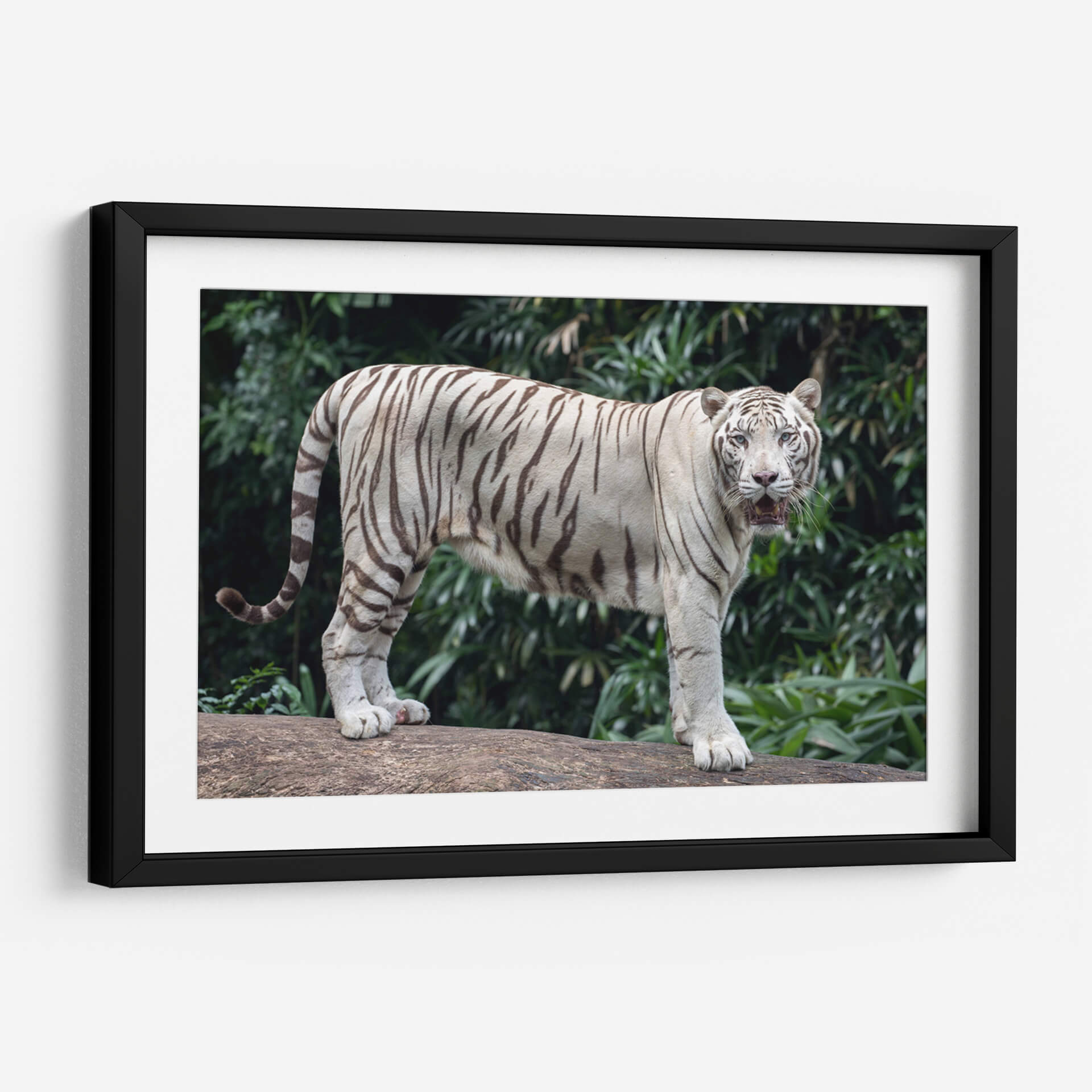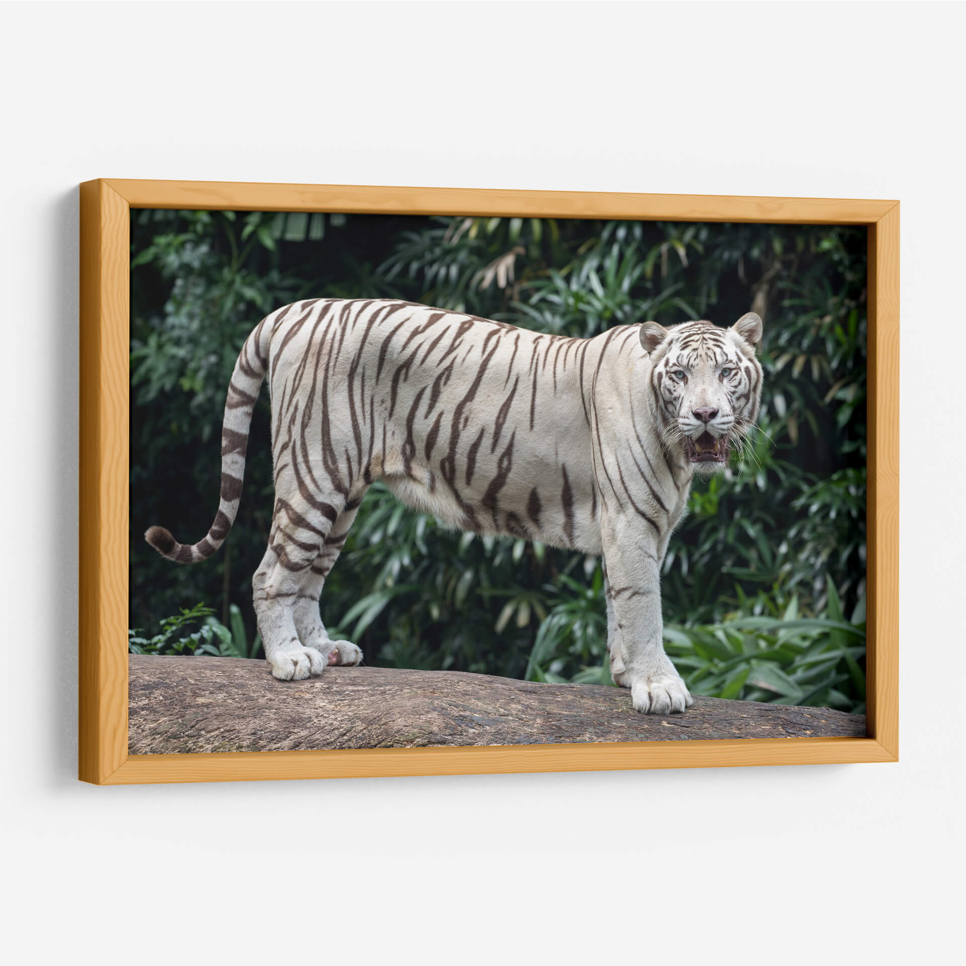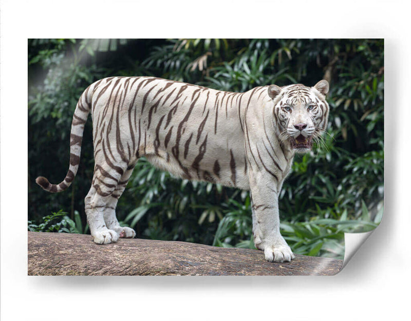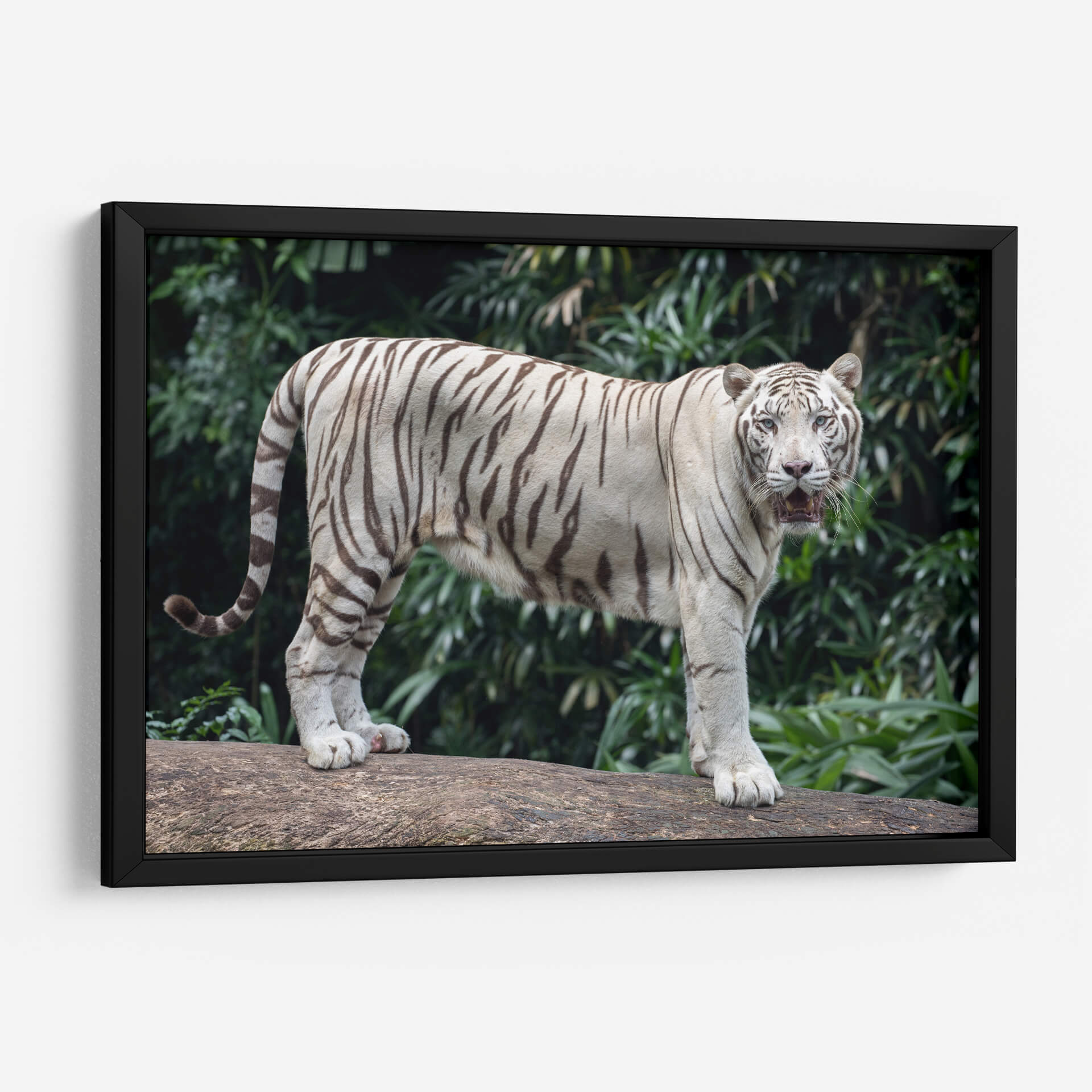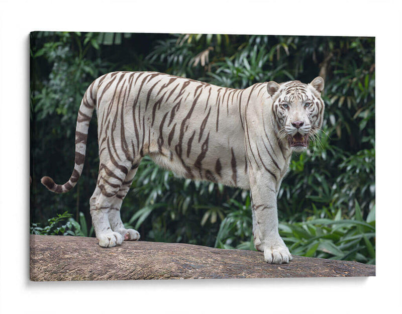 Captura la majestuosidad y el poder de la naturaleza con este impresionante lienzo de "Tigre Blanco". La obra presenta a un magnífico tigre blanco de pie sobre un tronco, rodeado por un exuberante follaje verde que crea un contraste cautivador. Los detalles de sus rayas oscuras sobre su pelaje pálido son vívidos y realistas, invitando al espectador a admirar su belleza salvaje. La mirada penetrante del tigre, directa hacia el observador, evoca una sensación de conexión profunda y respeto. La paleta de colores se centra en tonos de blanco, negro y verde, transmitiendo una atmósfera de serenidad y misterio. El estilo fotográfico y la composición centrada en el animal lo convierten en una pieza de arte contemporáneo ideal para transformar cualquier espacio. Perfecto para salas de estar, dormitorios o estudios que buscan un toque de elegancia salvaje y un punto focal que despierte conversaciones. Este lienzo de tigre blanco es más que una simple decoración; es una declaración de fuerza, belleza y la indómita esencia de la vida silvestre.