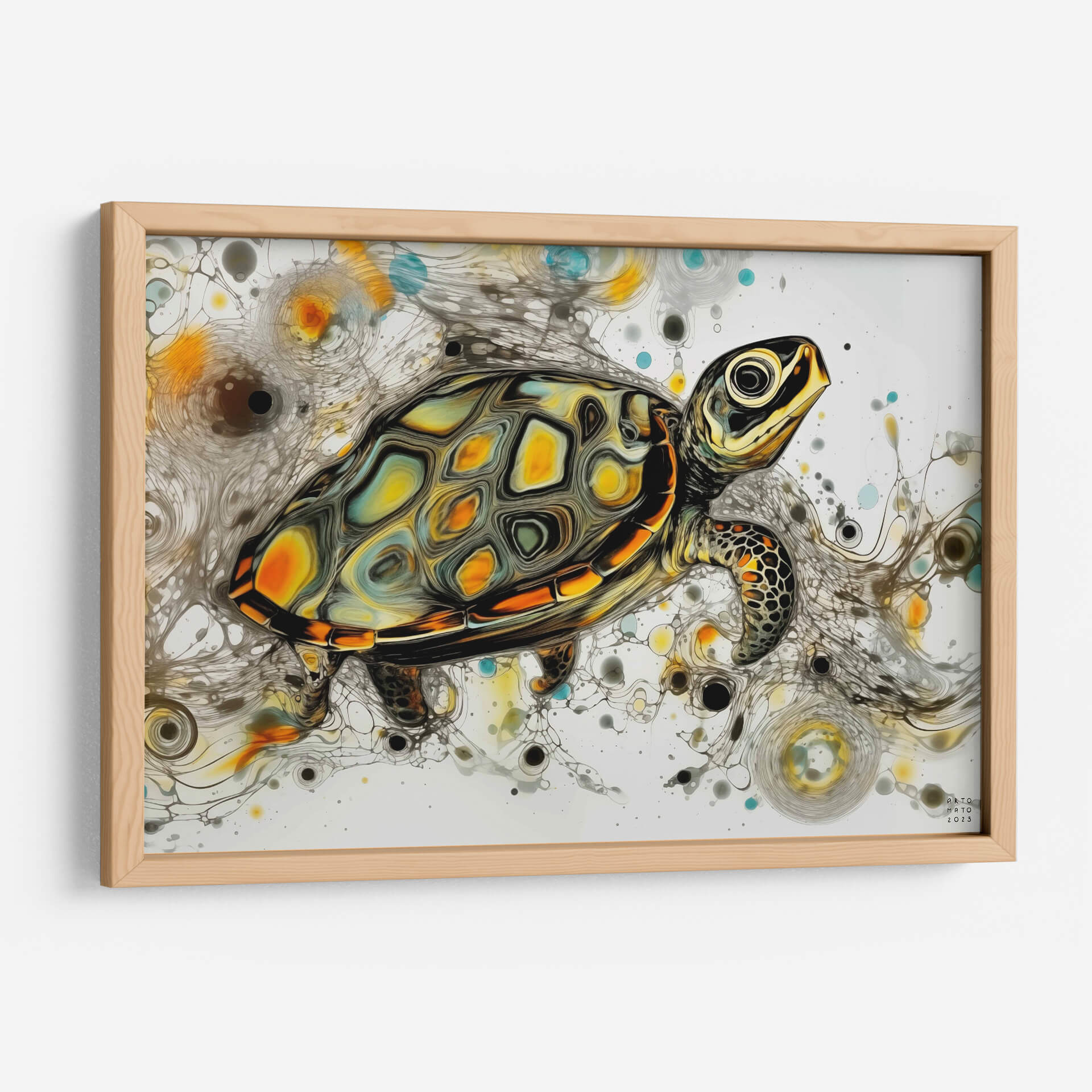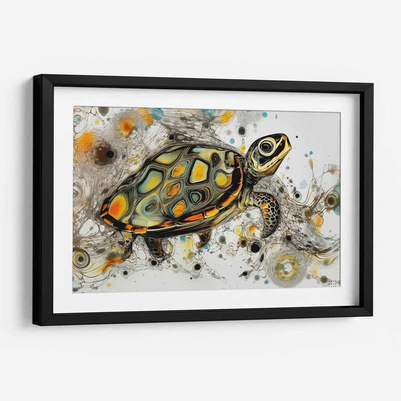 Sumérgete en la serenidad y el movimiento con este cautivador cuadro decorativo de "Tortuga Marina" del artista Artomato. Esta obra de arte digital captura la majestuosidad de una tortuga marina navegando a través de un vibrante mar de formas abstractas y texturas fluidas. La paleta de colores, dominada por cálidos tonos ocres y amarillos, contrastados con toques de turquesa y grises dinámicos, evoca una sensación de armonía y vitalidad. La técnica de fluidos utilizada crea un efecto hipnótico, con remolinos y salpicaduras que sugieren la profundidad y la inmensidad del océano. El estilo es contemporáneo y abstracto, con una composición que guía la mirada hacia la figura central de la tortuga, dotándola de protagonismo y presencia. Este cuadro es una pieza ideal para añadir un toque de naturaleza y arte moderno a tu sala de estar, dormitorio o estudio. Transmite calma, resiliencia y la belleza del mundo marino, invitando a la contemplación y al bienestar. Perfecto para amantes de la vida marina y el arte abstracto, este cuadro decorativo transformará cualquier espacio en una galería personal llena de inspiración y estilo.