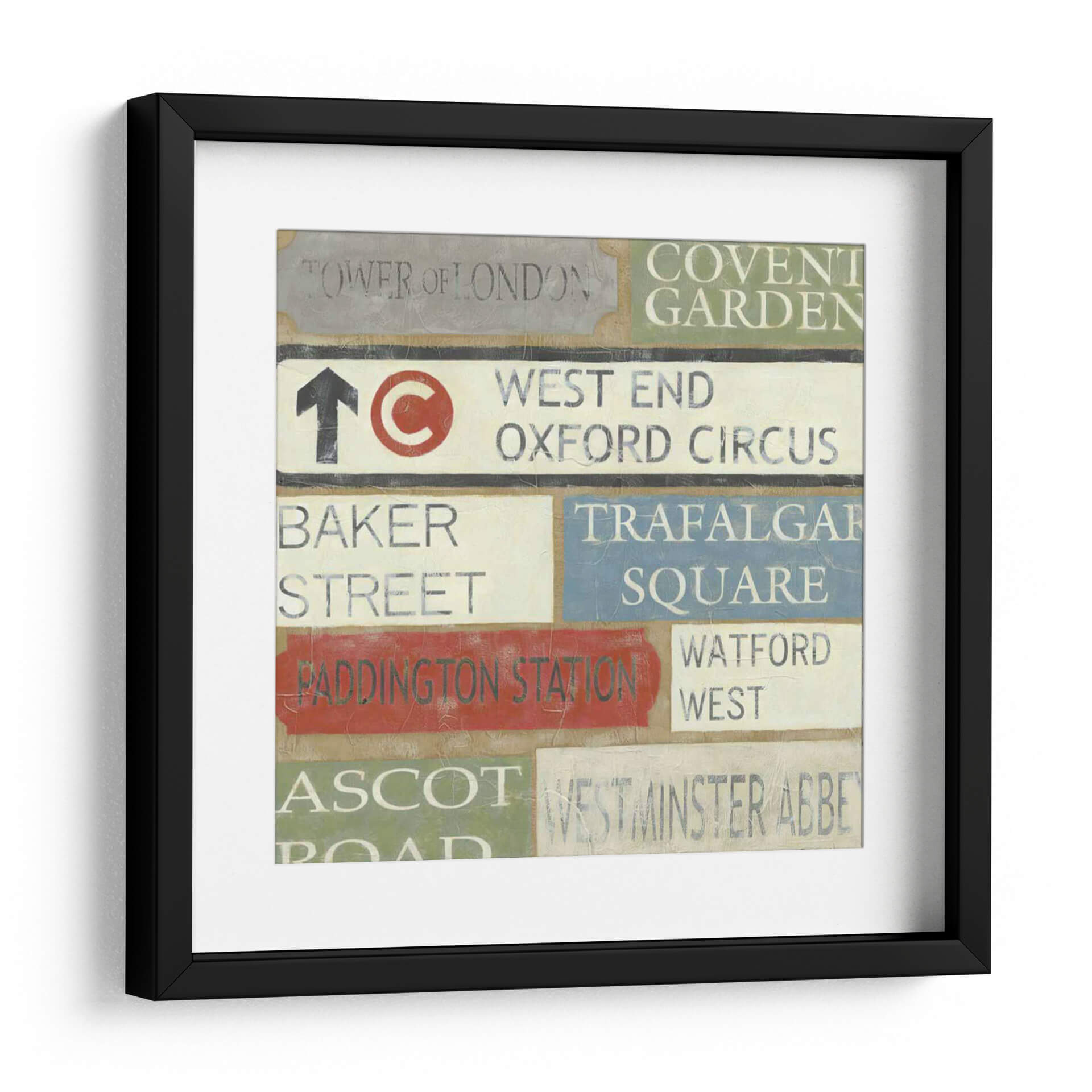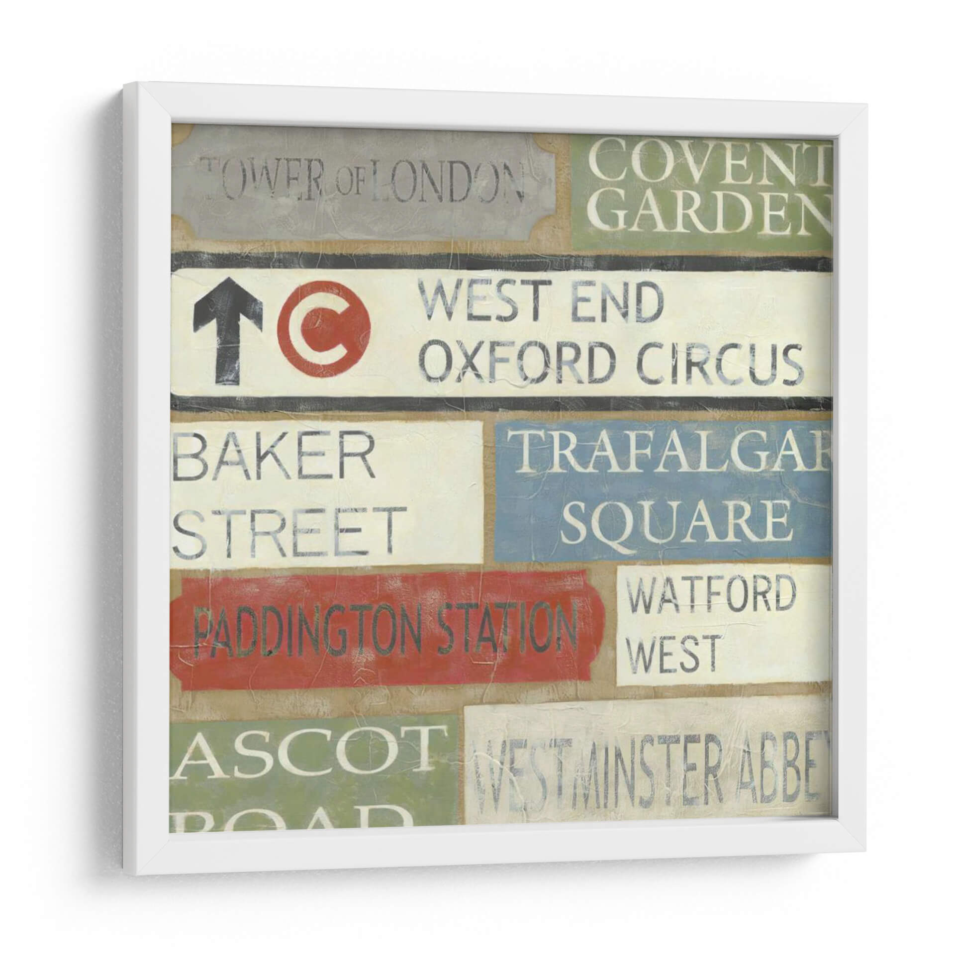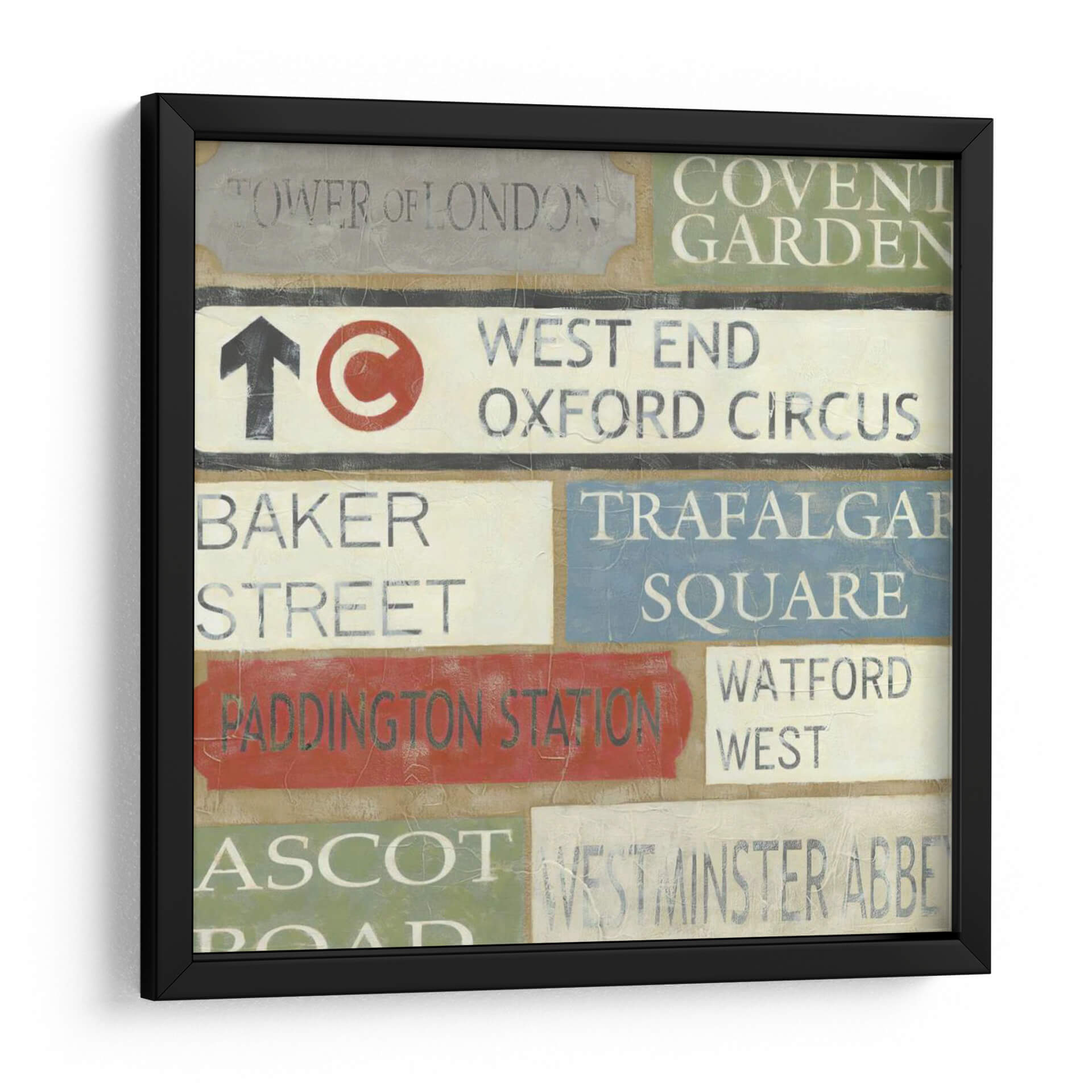 Embárcate en un viaje visual a través del corazón de Londres con este cautivador cuadro decorativo titulado 'Tour De Londres' del artista Chariklia Zarris. Esta obra evoca la esencia de la emblemática ciudad, presentando una composición dinámica de señales de tráfico y nombres de lugares icónicos como 'Tower of London', 'Covent Garden', 'West End', 'Oxford Circus', 'Baker Street', 'Trafalgar Square', 'Paddington Station', 'Watford West', 'Ascot' y 'Westminster Abbey'. La paleta de colores, que combina tonos tierra, grises, blancos, rojos vibrantes y azules serenos, crea una atmósfera nostálgica y urbana a la vez. El estilo, que recuerda a la pintura vintage y al arte conceptual, hace de este cuadro una pieza versátil, perfecta para añadir un toque de carácter y sofisticación a cualquier espacio, ya sea una sala de estar moderna, un estudio o una oficina con temática de viajes. Imagina cómo las texturas y la tipografía desgastada de estas señales de Londres aportarán una narrativa única a tus paredes, invitando a la conversación y al recuerdo de experiencias urbanas. Este cuadro decorativo es más que una simple imagen; es una invitación a explorar y a sentir la energía de una de las ciudades más fascinantes del mundo, convirtiendo tu hogar en un reflejo de tus aspiraciones y recuerdos.