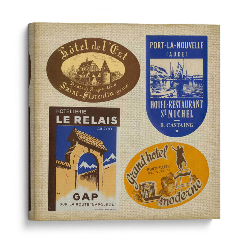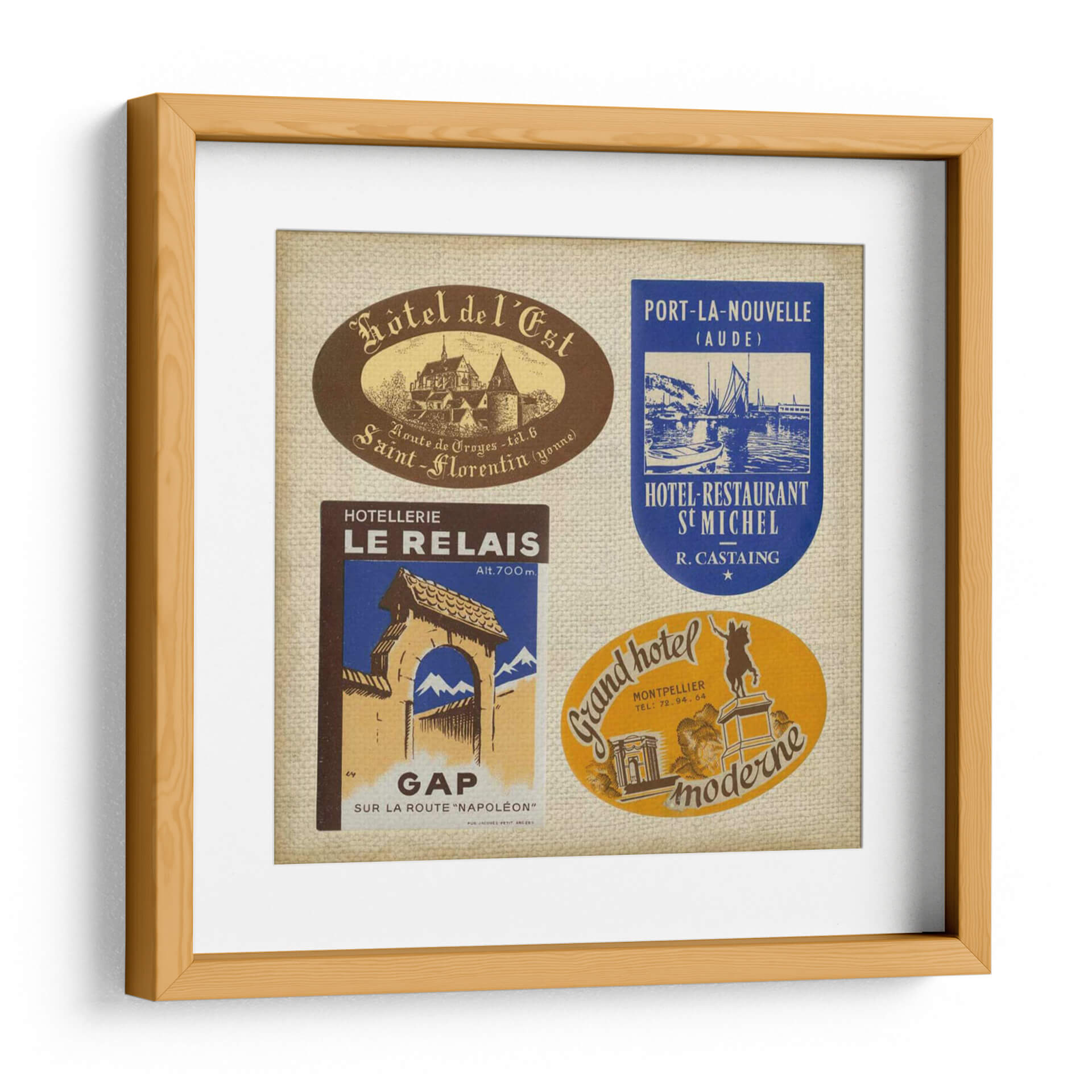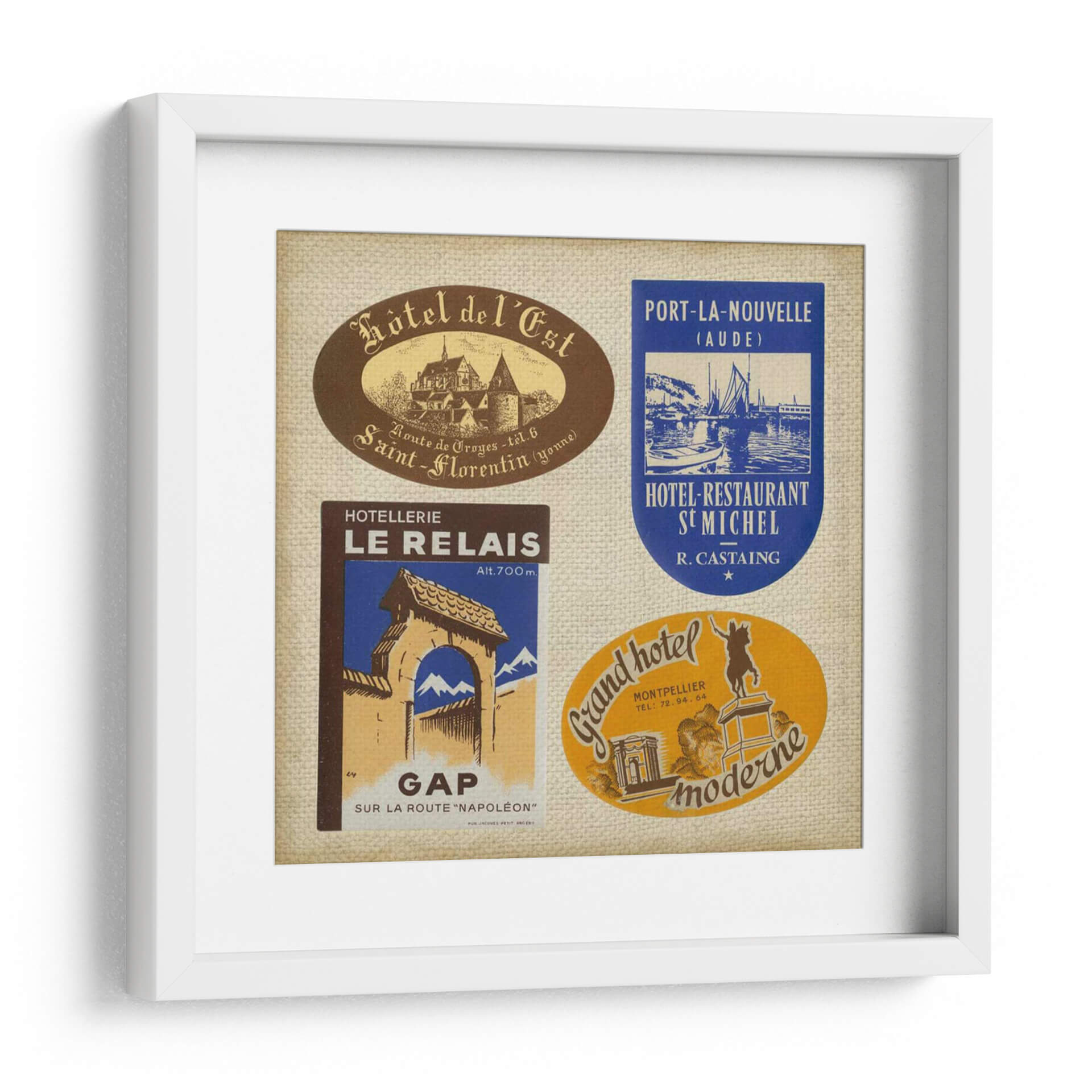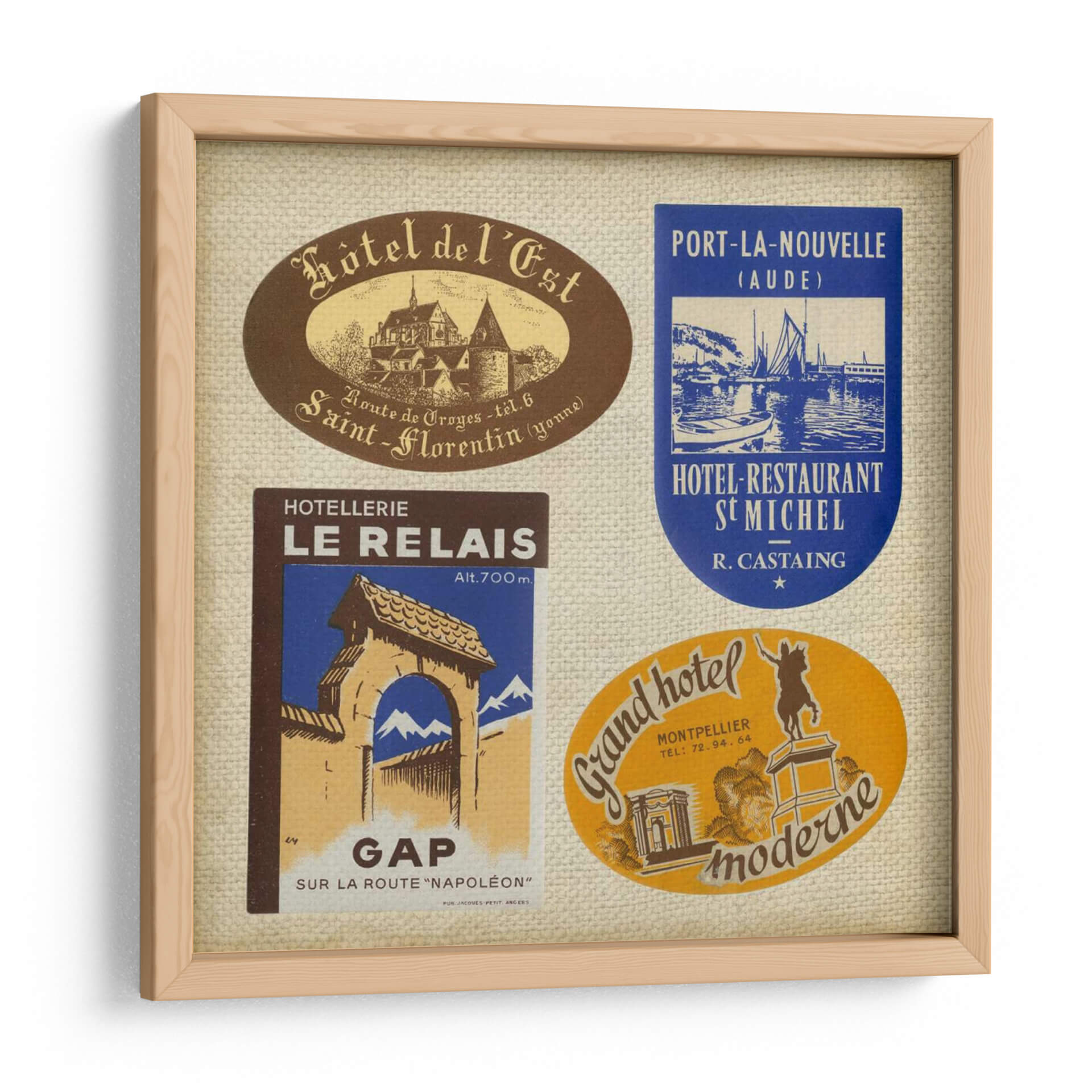 Este cautivador cuadro decorativo, 'Travel Collage Vintage II' de Vision Studio, es una oda nostálgica a los viajes y la historia. La obra presenta un collage de epígrafes antiguos, cada uno evocando la esencia de destinos y establecimientos franceses de antaño. Observamos emblemas que anuncian hoteles y restaurantes, con ilustraciones detalladas de castillos, puertos marítimos pintorescos y paisajes montañosos, como el icónico arco de GAP. La paleta de colores, dominada por tonos tierra, azules profundos y acentos de crema y ocre, crea una atmósfera retro y sofisticada. Cada etiqueta de viaje, con su tipografía distintiva y diseño gráfico vintage, cuenta una historia de exploración y descubrimiento, invitando a revivir la época dorada del turismo. Este cuadro es perfecto para añadir un toque de elegancia vintage y un aire de aventura a cualquier espacio, ya sea una sala de estar, un estudio o una oficina. Su composición, que recuerda a un álbum de recuerdos o un mapa de carreteras antiguo, atraerá a amantes de la historia, viajeros y aquellos que aprecian el diseño gráfico retro. El estilo collage y la temática de viajes lo convierten en una pieza única para coleccionistas y decoradores que buscan arte con carácter y narrativa.