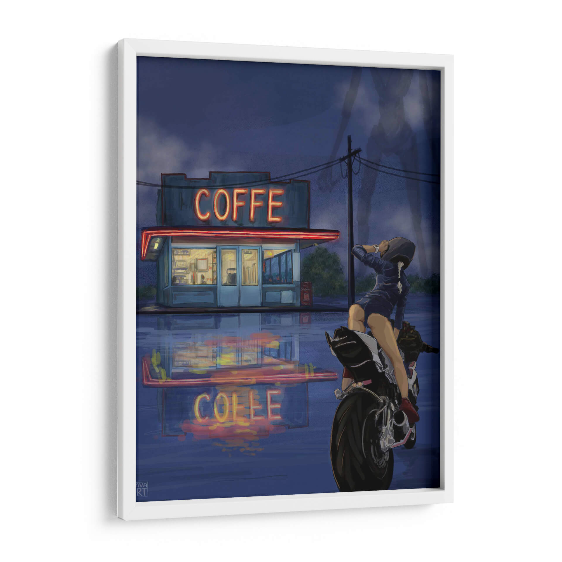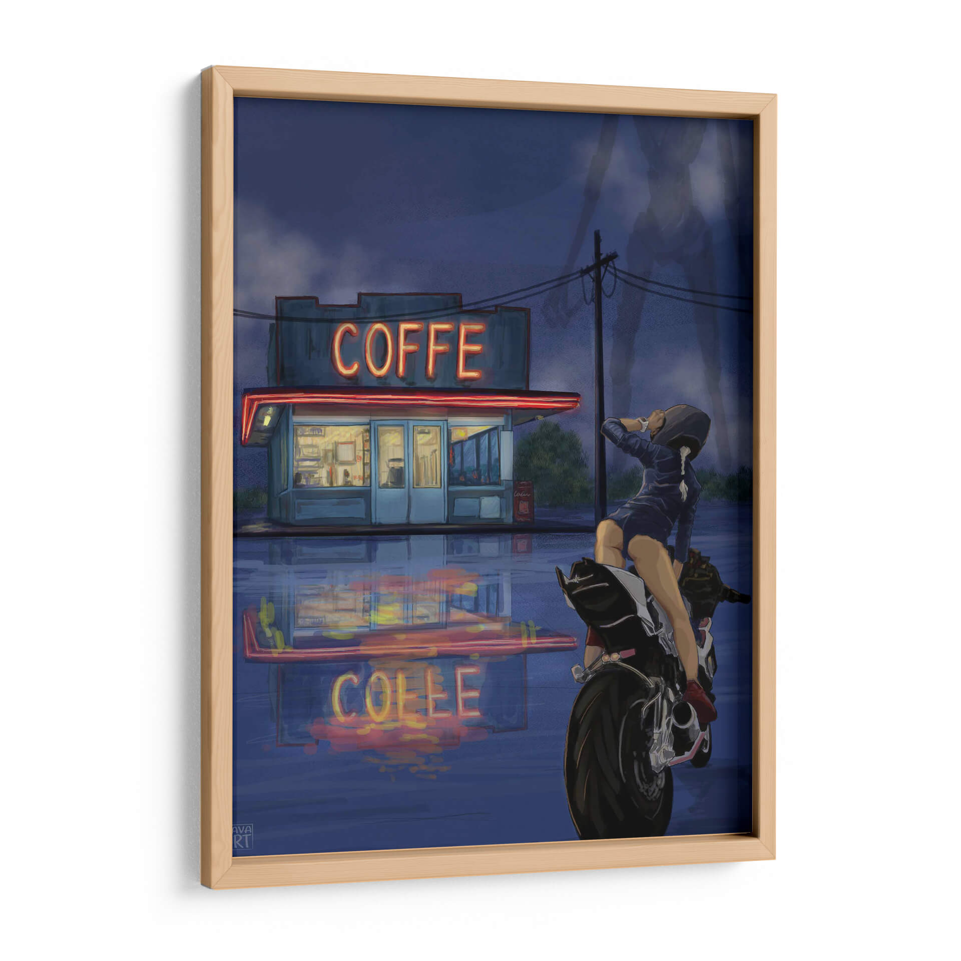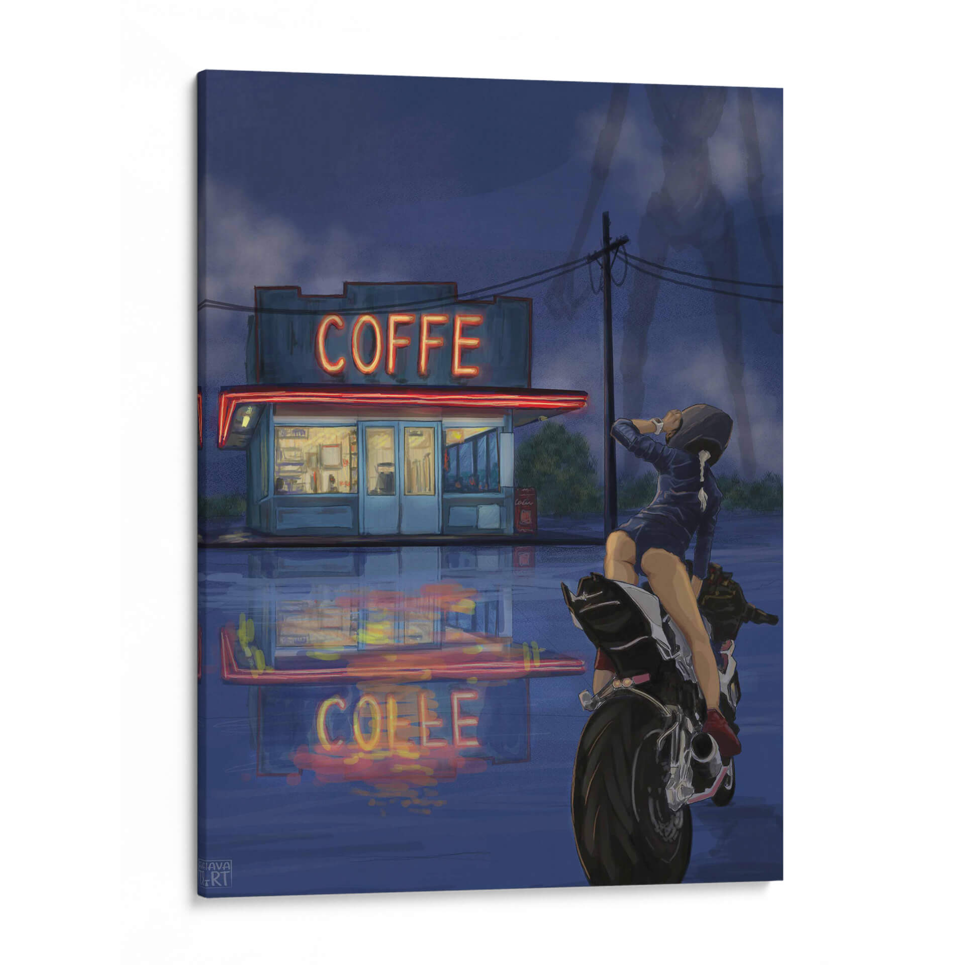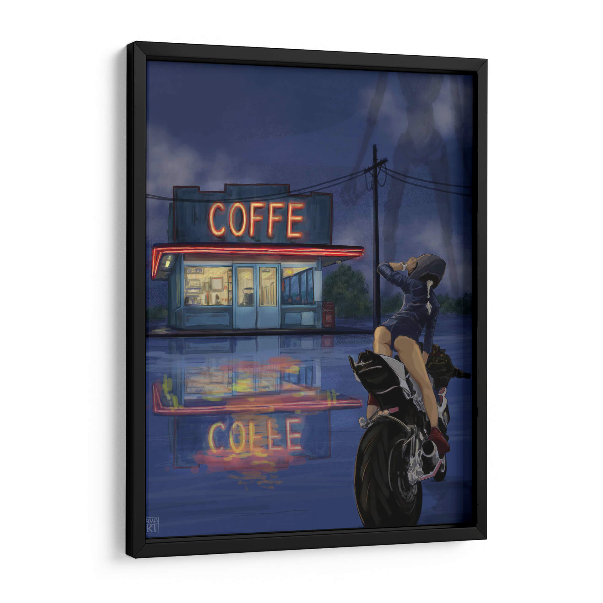 Sumérgete en la atmósfera nocturna y melancólica de "Última Parada", una obra de arte que captura un momento de introspección en una noche lluviosa. La pieza presenta un icónico puesto de café iluminado por neones vibrantes, cuyo reflejo danza sobre el asfalto mojado, creando un juego de luces cautivador. En primer plano, una figura en motocicleta, con una pose reflexiva, añade un toque de misterio y modernidad a la escena. Los tonos oscuros y profundos de la noche se ven contrastados por los destellos cálidos del letrero de "COFFE" y las luces interiores, evocando una sensación de refugio y pausa en un mundo en movimiento. Este cuadro decorativo es perfecto para añadir un punto focal intrigante a tu sala de estar, un toque de carácter a tu oficina o una atmósfera evocadora a tu dormitorio. El estilo distintivo de Chava.art combina elementos del realismo con una sensibilidad contemporánea, resultando en una pieza que invita a la contemplación y al diálogo. Ideal para amantes de las escenas urbanas, motocicletas y la estética retro-futurista, "Última Parada" es más que una simple decoración; es una invitación a detenerse y reflexionar.
