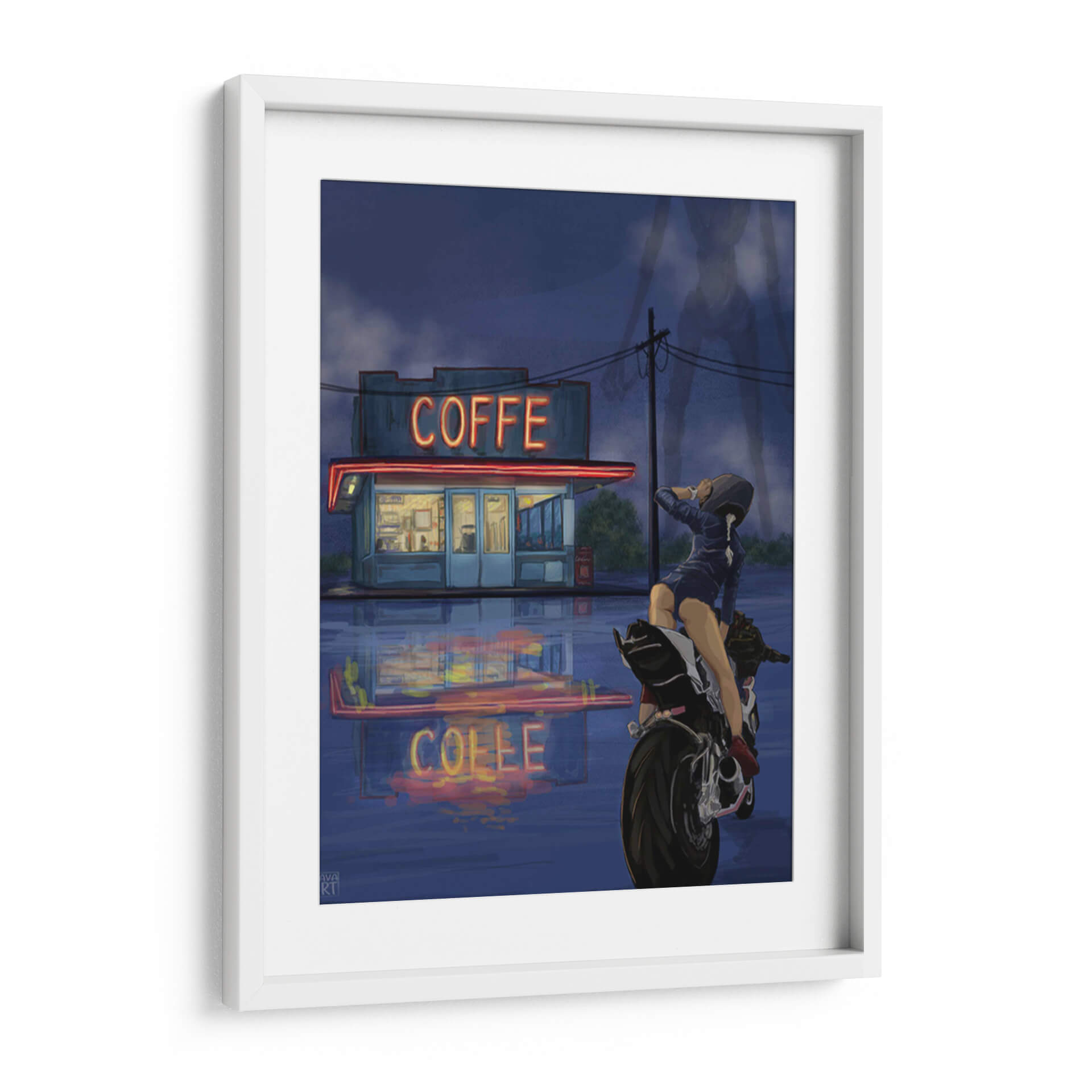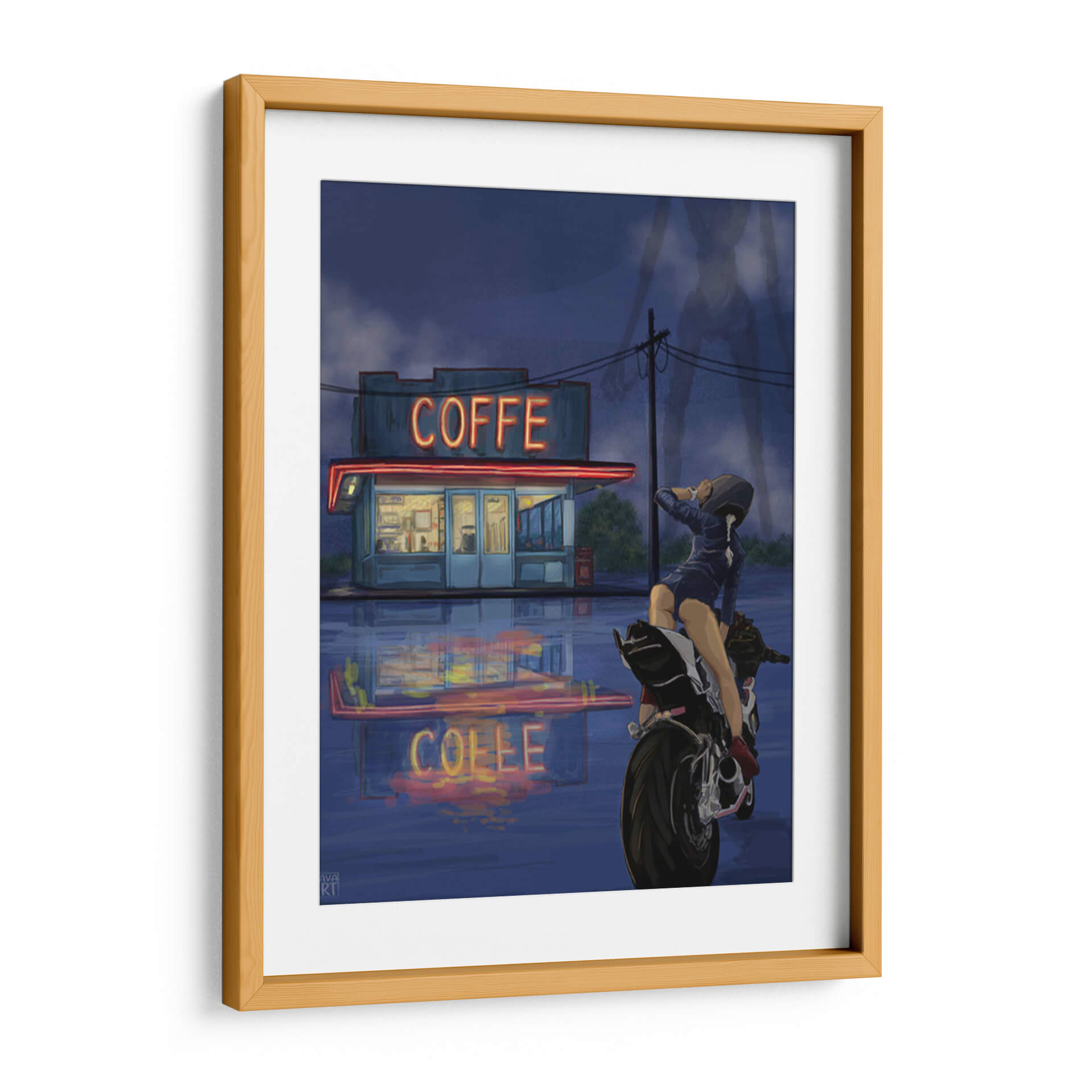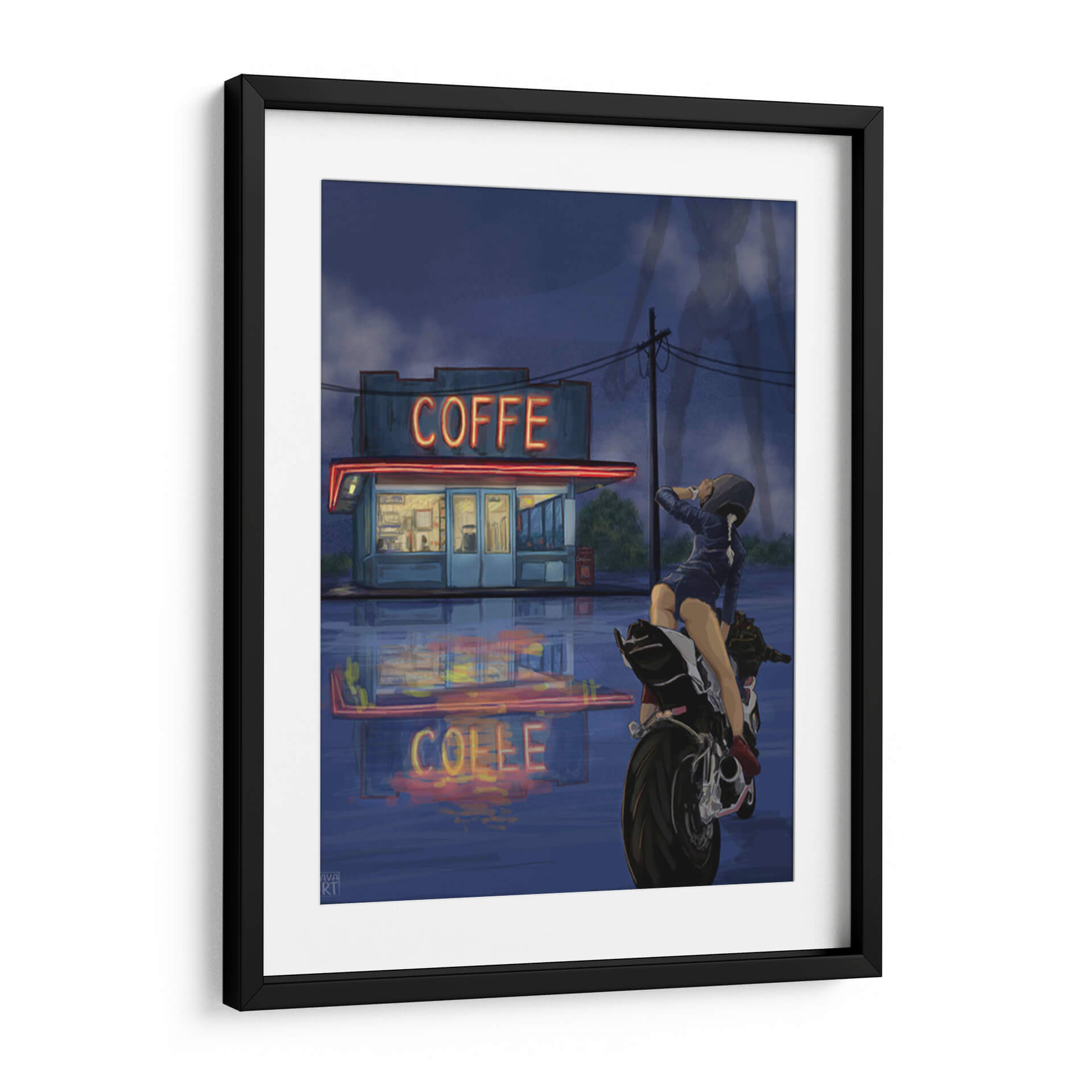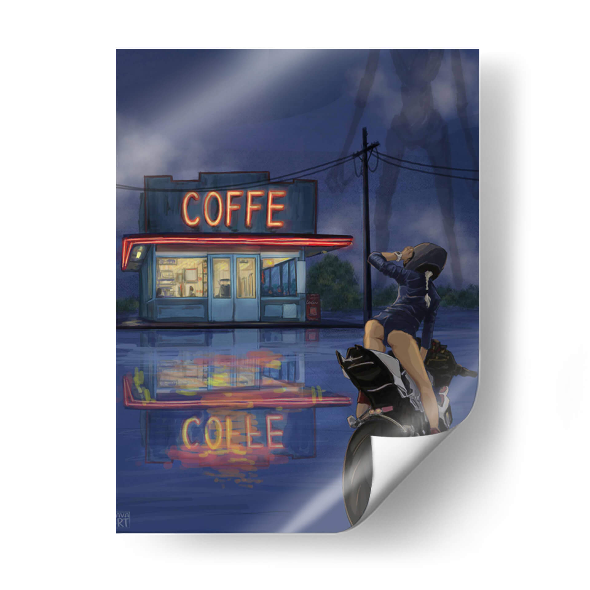 Sumérgete en la atmósfera nocturna y melancólica de "Última Parada", una obra de arte que captura un momento de introspección en una noche lluviosa. La pieza presenta un icónico puesto de café iluminado por neones vibrantes, cuyo reflejo danza sobre el asfalto mojado, creando un juego de luces cautivador. En primer plano, una figura en motocicleta, con una pose reflexiva, añade un toque de misterio y modernidad a la escena. Los tonos oscuros y profundos de la noche se ven contrastados por los destellos cálidos del letrero de "COFFE" y las luces interiores, evocando una sensación de refugio y pausa en un mundo en movimiento. Este cuadro decorativo es perfecto para añadir un punto focal intrigante a tu sala de estar, un toque de carácter a tu oficina o una atmósfera evocadora a tu dormitorio. El estilo distintivo de Chava.art combina elementos del realismo con una sensibilidad contemporánea, resultando en una pieza que invita a la contemplación y al diálogo. Ideal para amantes de las escenas urbanas, motocicletas y la estética retro-futurista, "Última Parada" es más que una simple decoración; es una invitación a detenerse y reflexionar.