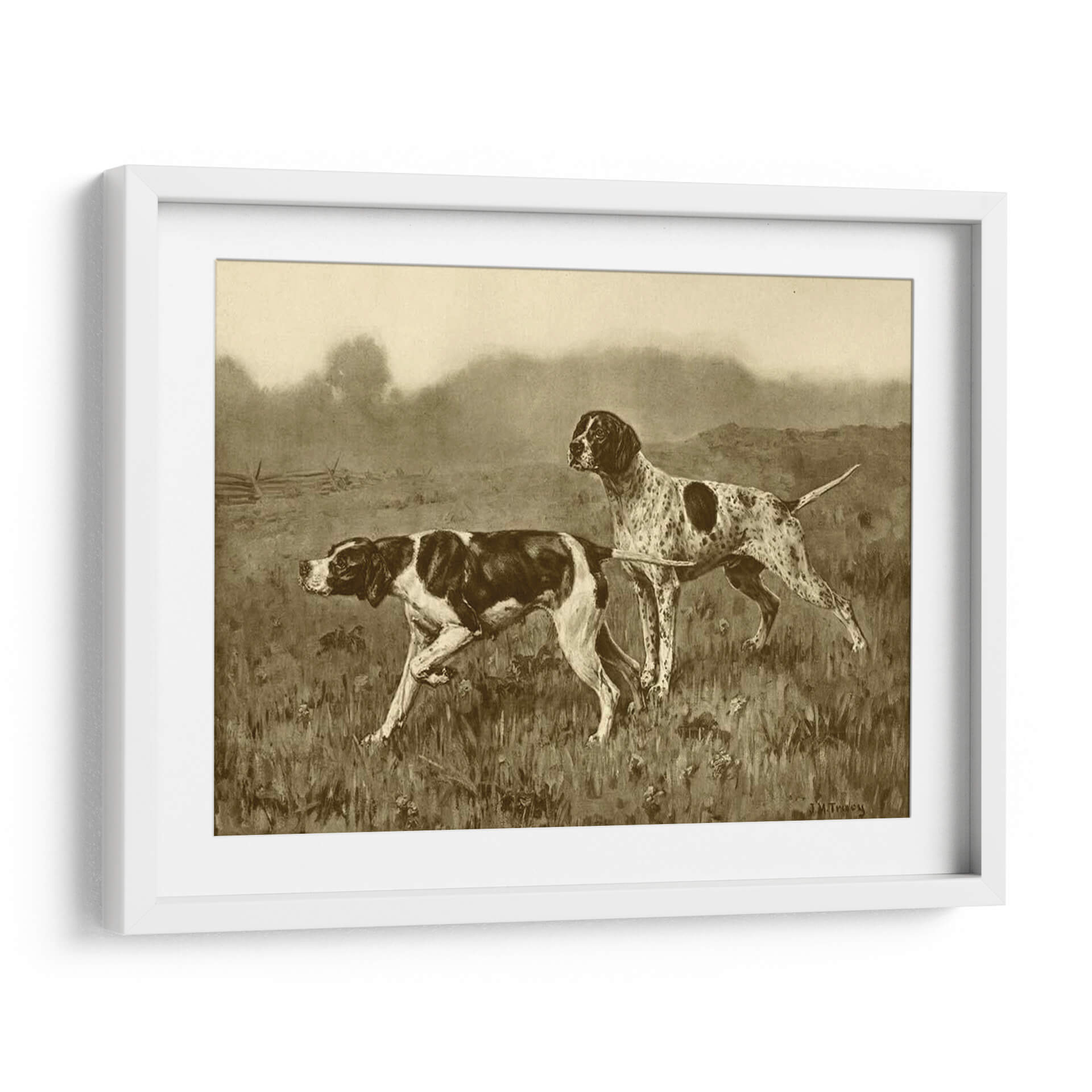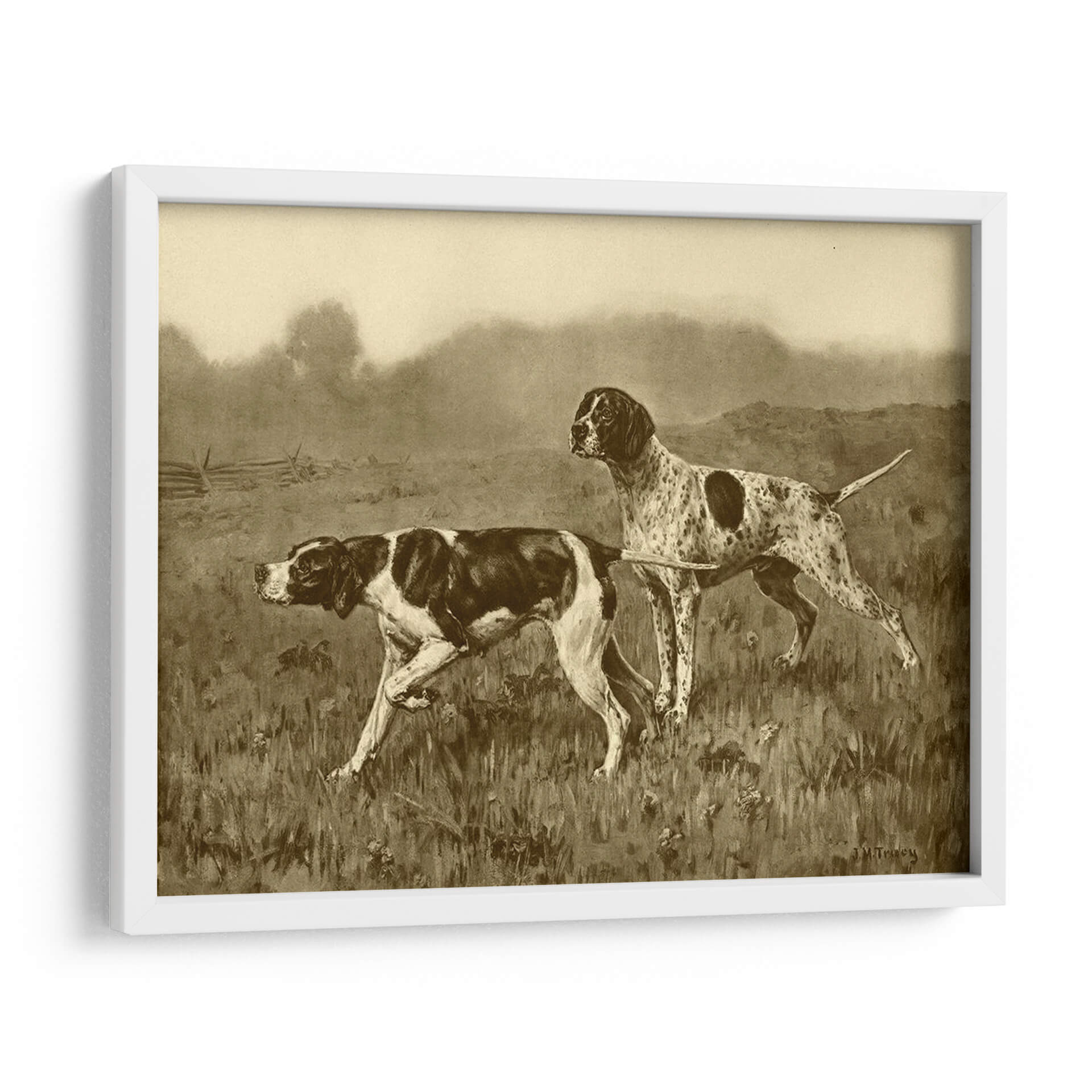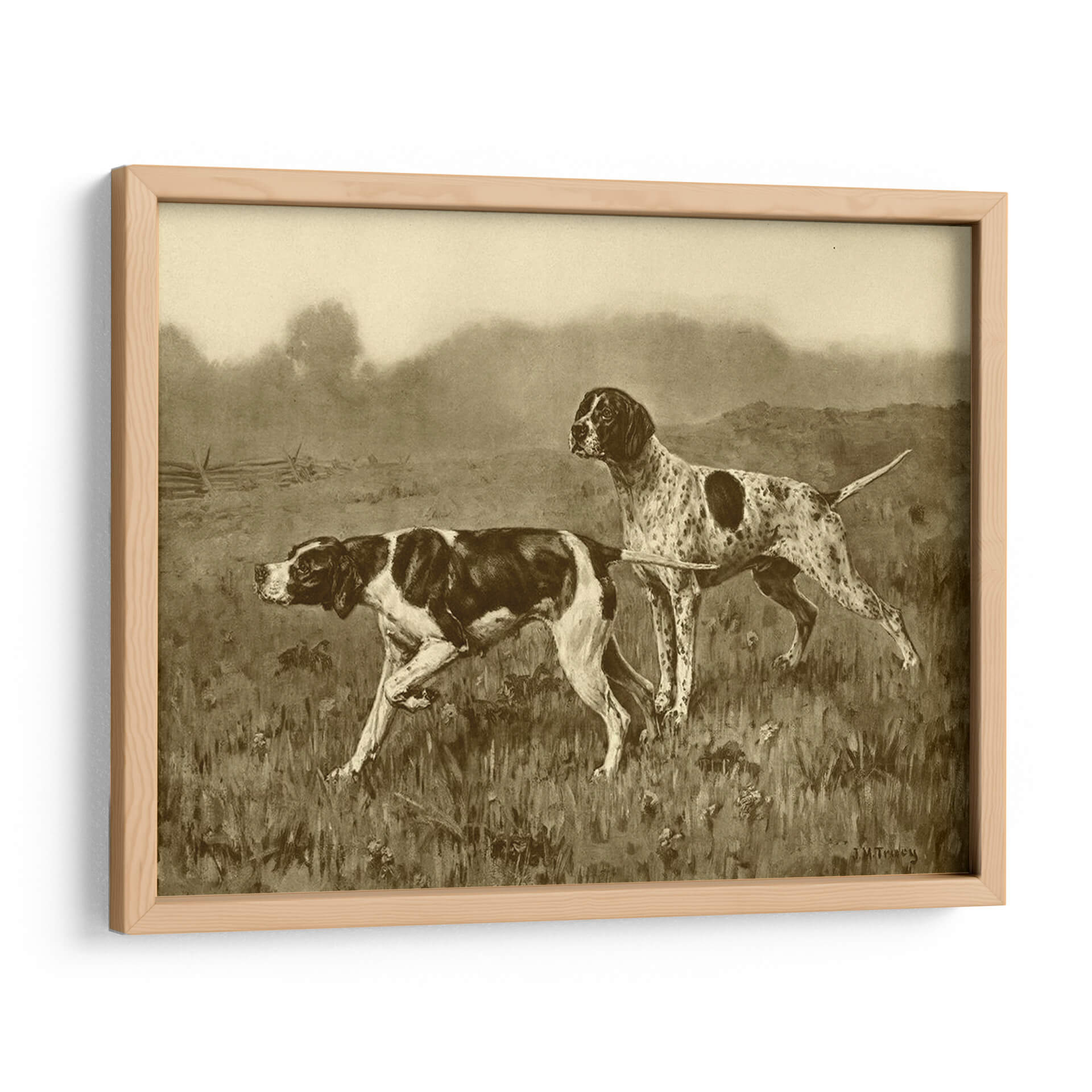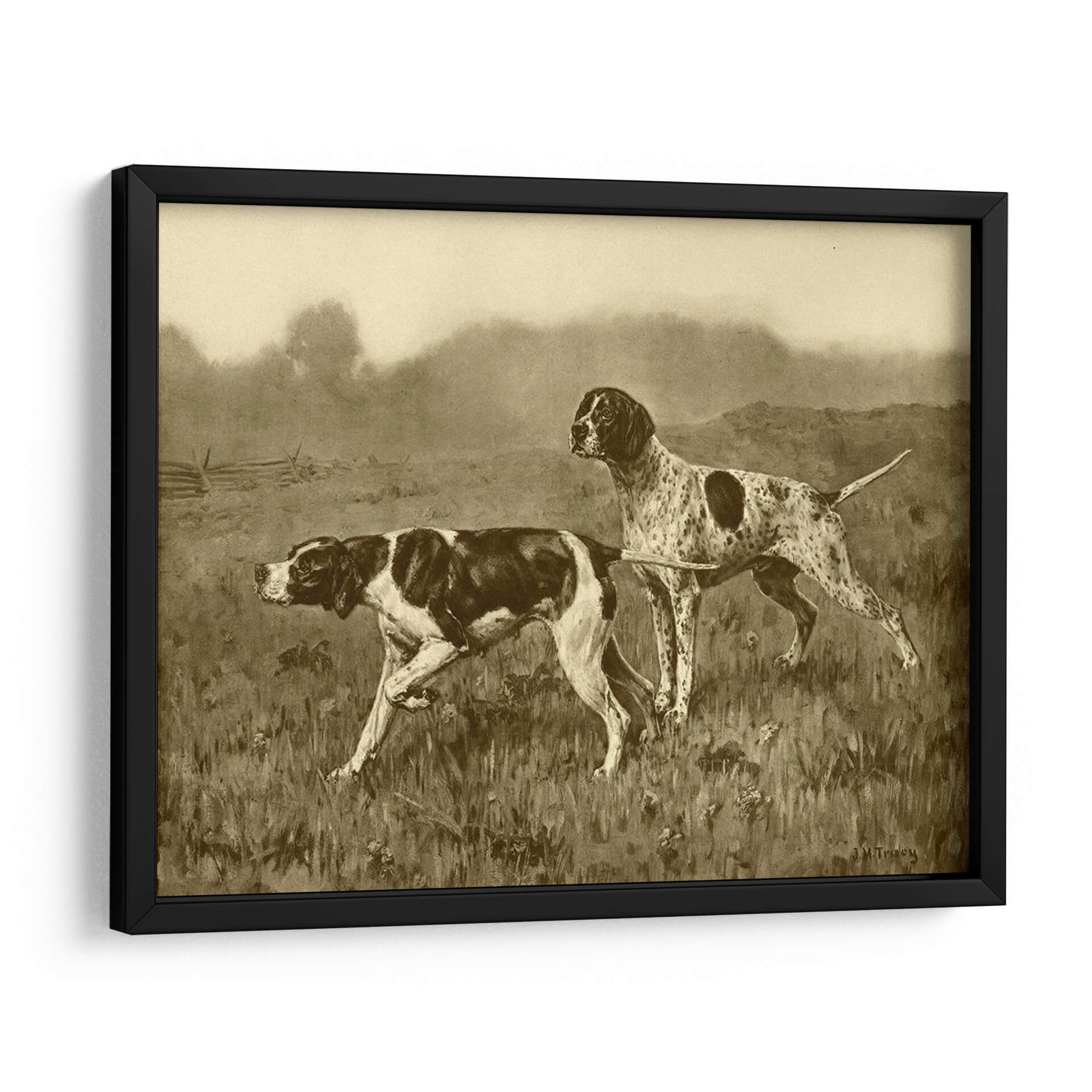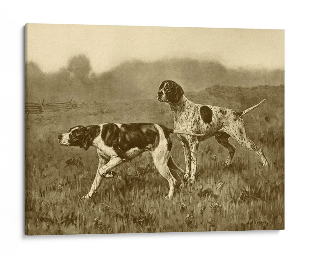 Captura la esencia de la naturaleza y la lealtad con "Un Doble Punto", una obra maestra de J.M. Tracey que evoca la atmósfera serena de una mañana de campo. Este cuadro decorativo presenta dos perros de caza, posiblemente pointers, en plena acción, explorando un paisaje rústico con una valla de madera y colinas difuminadas al fondo. La paleta de colores sepia, con sus tonos cálidos y terrosos, crea una sensación de nostalgia y atemporalidad, perfecta para añadir un toque de calidez y carácter a cualquier espacio. La composición, con los perros en primer plano y el paisaje sugerido al fondo, guía la mirada del espectador y transmite una sensación de movimiento y expectación. Ideal para amantes de los animales, cazadores o aquellos que aprecian el arte clásico y realista, esta pieza es un acento visual perfecto para salas de estar, estudios o incluso oficinas, aportando una historia silenciosa y elegante. Transforma tu hogar en un santuario de paz y estilo con este evocador cuadro decorativo que celebra la conexión entre el hombre, el animal y la naturaleza.