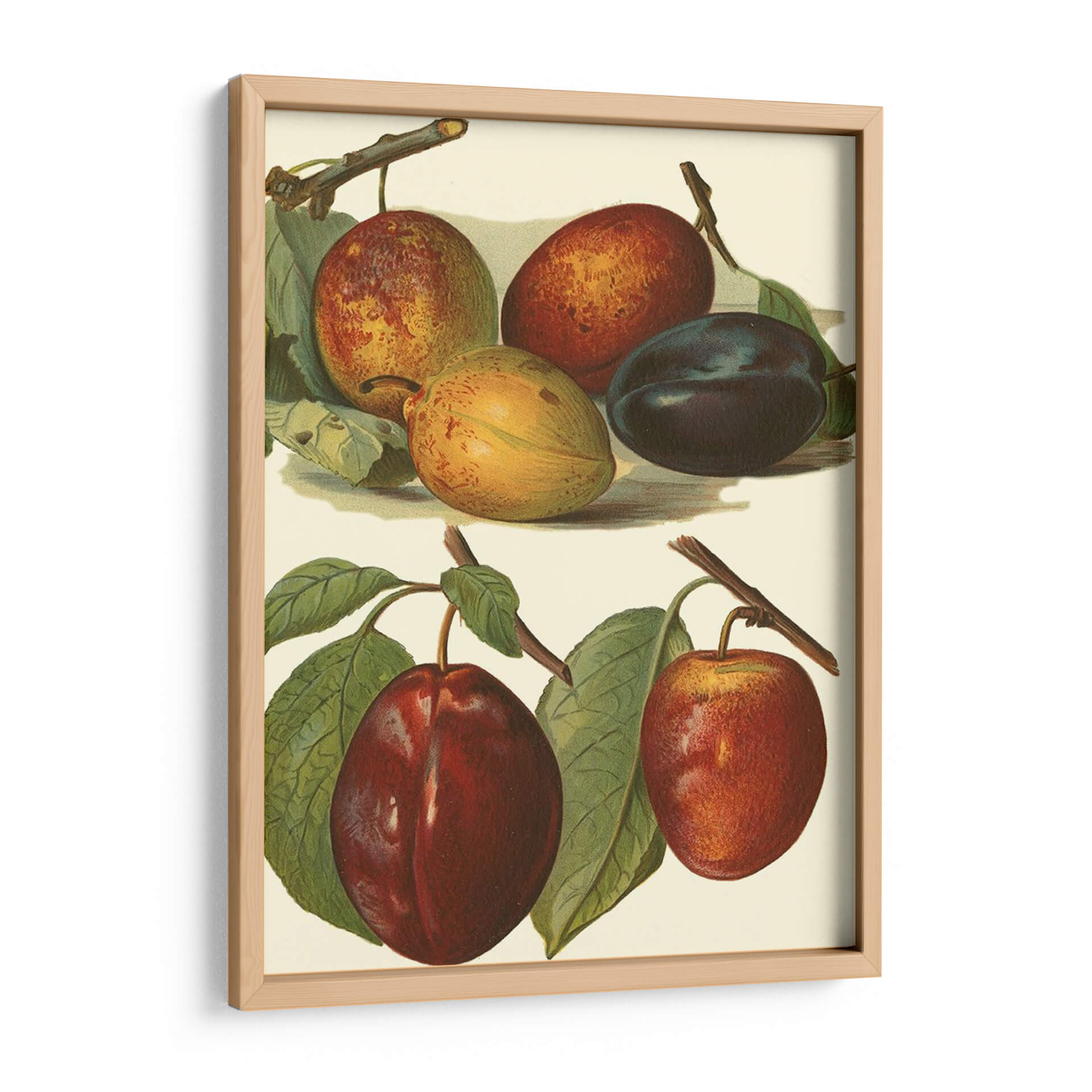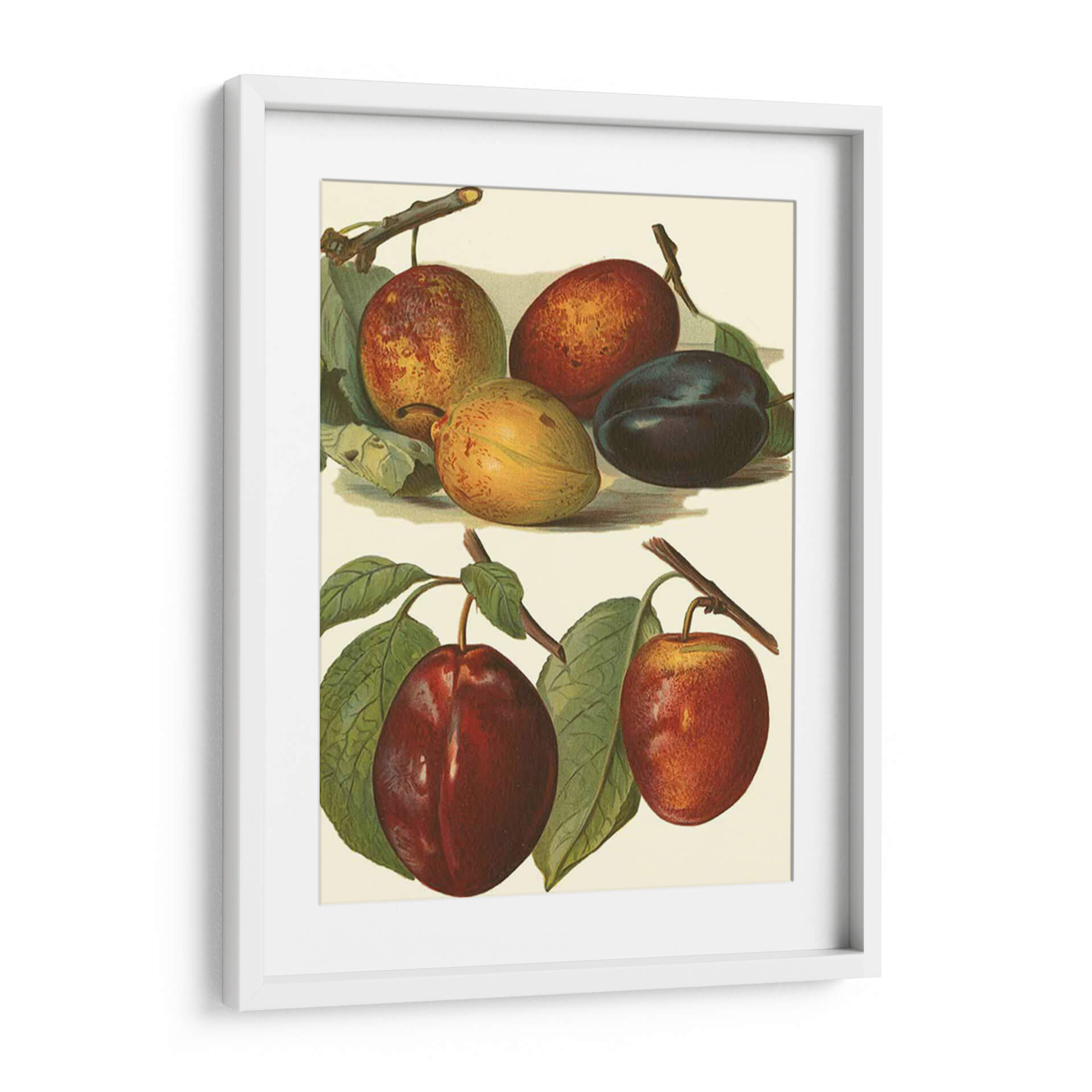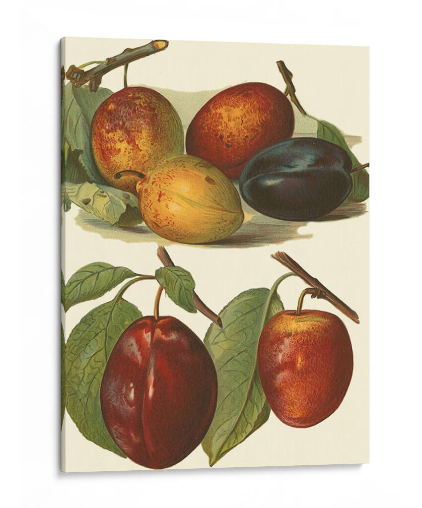 Este exquisito cuadro decorativo, titulado 'Variedades De Ciruela I' y creado por el artista John Wright, captura la belleza botánica de las ciruelas en diversas etapas de madurez y color. La obra presenta una composición detallada y delicada, donde destacan las diferentes tonalidades de las ciruelas: desde el verde amarillento de las inmaduras hasta los ricos rojos y púrpuras profundos de las maduras. Las hojas verdes vibrantes y las ramas sutiles añaden un toque de realismo y frescura a la escena. La paleta de colores, centrada en tonos tierra, rojos intensos y púrpuras, crea una atmósfera cálida y natural, evocando la abundancia y la riqueza de la naturaleza. Con un estilo que recuerda a las ilustraciones botánicas clásicas, este cuadro es perfecto para añadir un toque de elegancia rústica y sofisticación a cocinas, comedores o cualquier espacio que busque una conexión con la naturaleza. Su detallada representación lo convierte en un punto focal intrigante y una pieza que invita a la contemplación, ideal para quienes aprecian el arte con motivos frutales y un acabado de alta calidad.