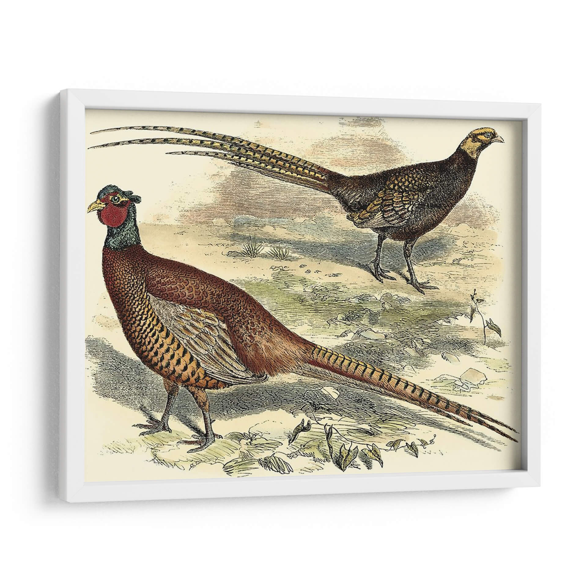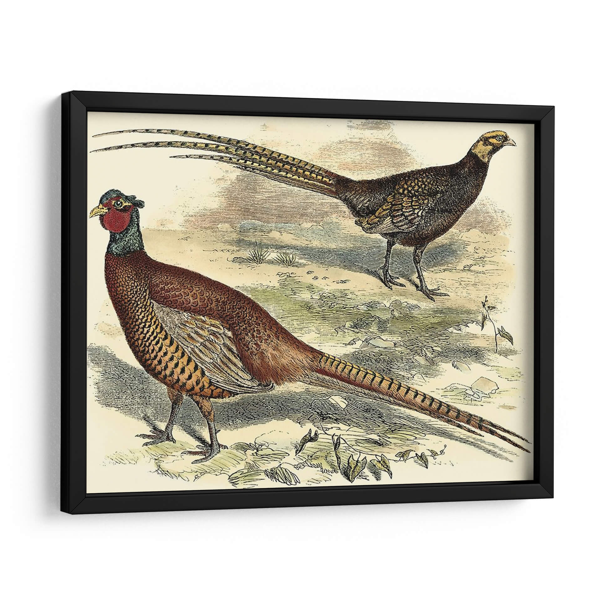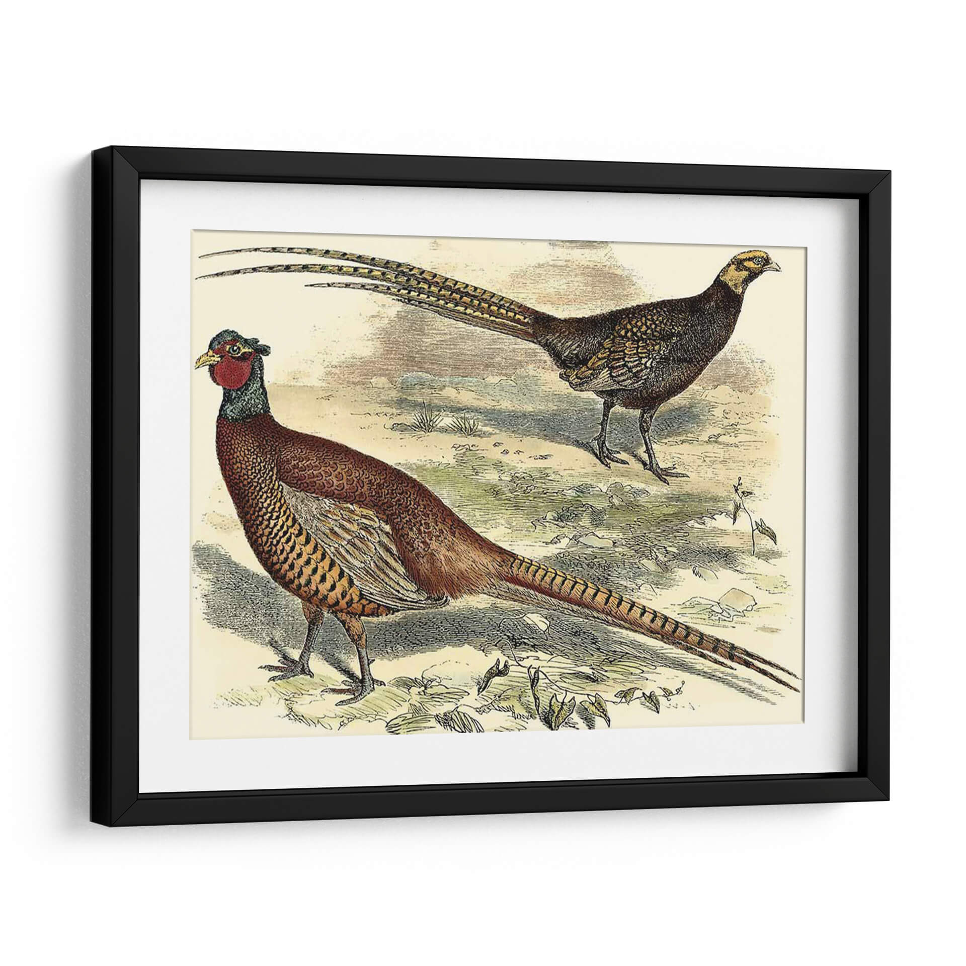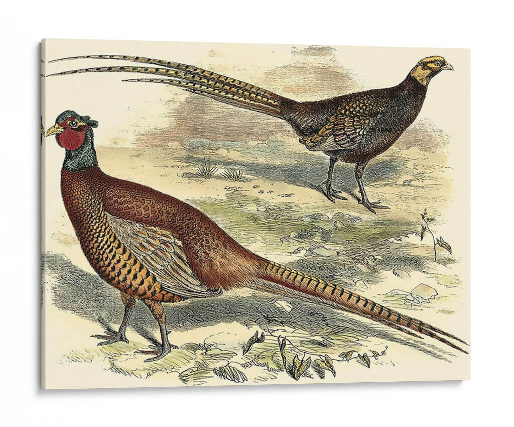 Emb uevoce la majestuosidad de la naturaleza con este impresionante cuadro decorativo "Variedades Faisanes V", una obra de Vision Studio que captura la elegancia y el detalle de estas magníficas aves. La pieza presenta dos faisanes en su hábitat natural, uno de ellos con su característico plumaje rojizo y la larga cola desplegada, mientras que el otro, de tonos más oscuros, observa con atención. La paleta de colores, dominada por tonos tierra, ocres y toques de rojo y verde, evoca una atmósfera serena y orgánica, transportando la esencia del campo a tu hogar. El estilo, que recuerda a las ilustraciones científicas clásicas, aporta un toque de sofisticación y un aire nostálgico, ideal para espacios que buscan un punto de interés natural y refinado. Este cuadro decorativo es perfecto para añadir un toque de vida y color a salones, comedores o incluso estudios, creando un ambiente acogedor y lleno de personalidad. Su detallada representación y composición equilibrada lo convierten en una pieza versátil que complementa tanto decoraciones rústicas como modernas, convirtiéndose en un foco de conversación y admiración.