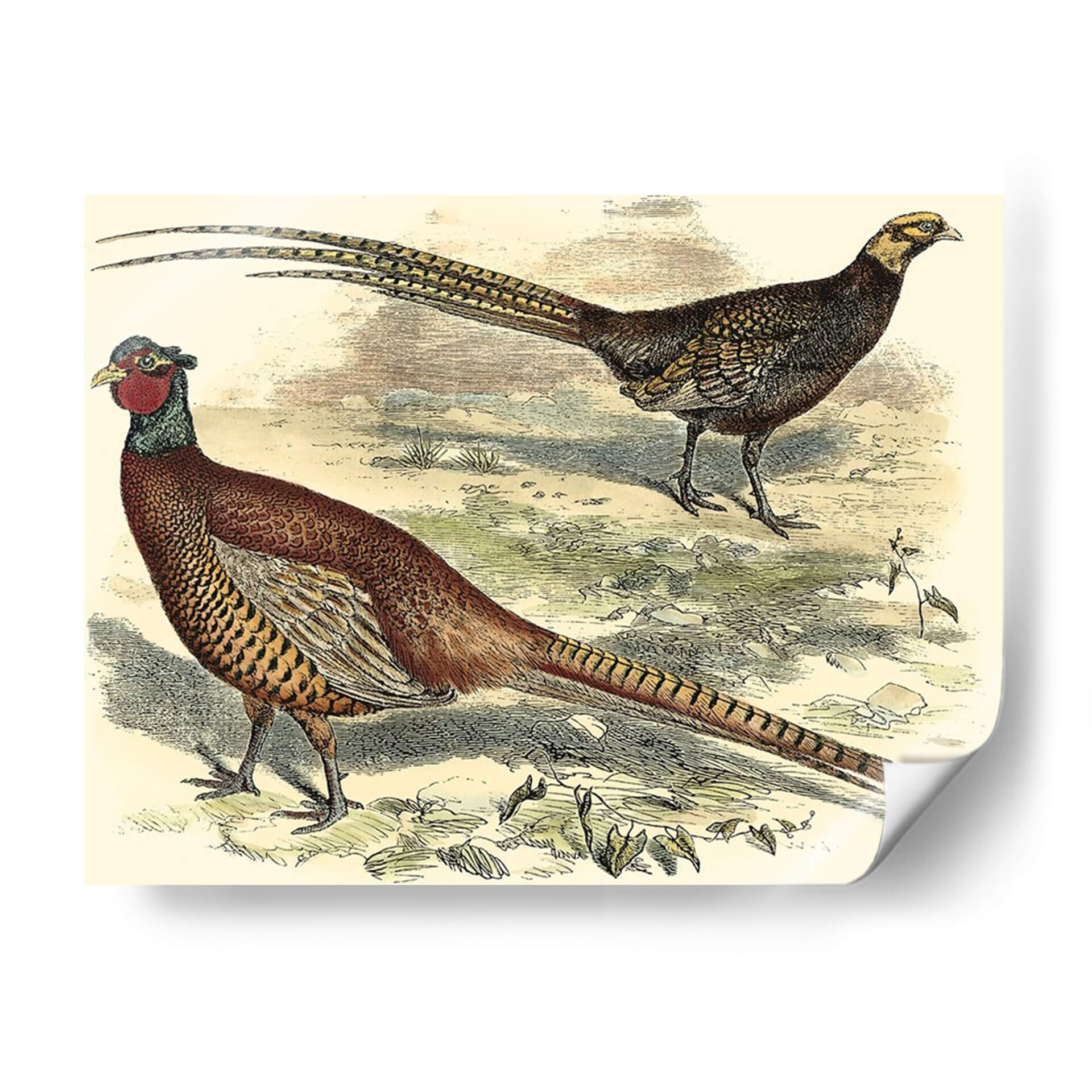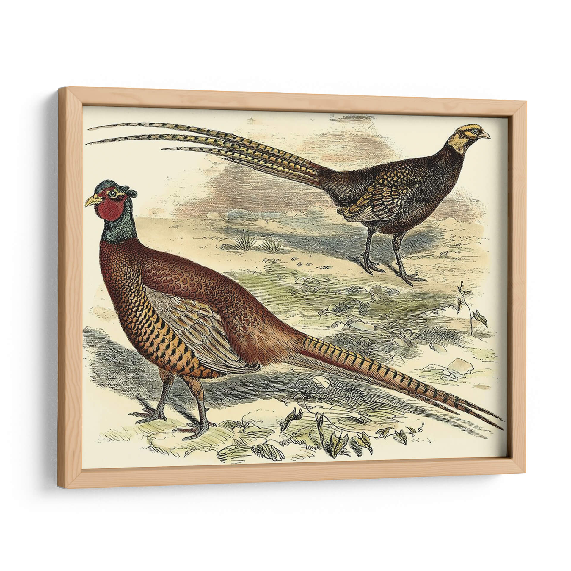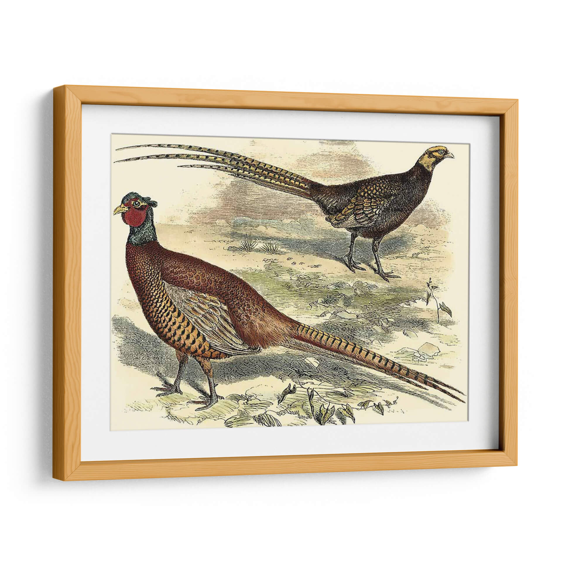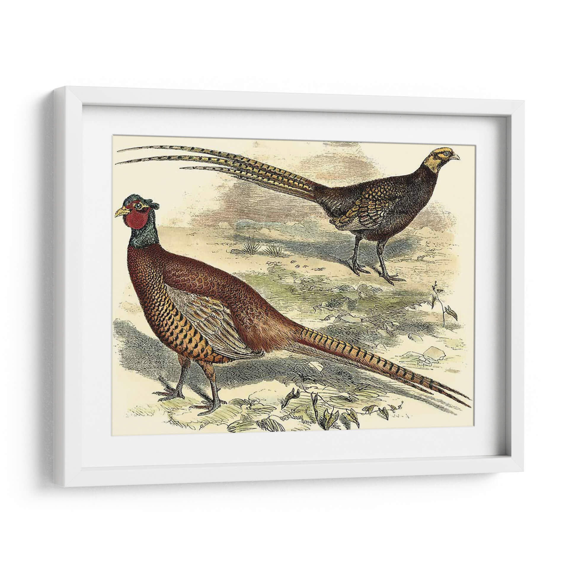 Emb uevoce la majestuosidad de la naturaleza con este impresionante cuadro decorativo "Variedades Faisanes V", una obra de Vision Studio que captura la elegancia y el detalle de estas magníficas aves. La pieza presenta dos faisanes en su hábitat natural, uno de ellos con su característico plumaje rojizo y la larga cola desplegada, mientras que el otro, de tonos más oscuros, observa con atención. La paleta de colores, dominada por tonos tierra, ocres y toques de rojo y verde, evoca una atmósfera serena y orgánica, transportando la esencia del campo a tu hogar. El estilo, que recuerda a las ilustraciones científicas clásicas, aporta un toque de sofisticación y un aire nostálgico, ideal para espacios que buscan un punto de interés natural y refinado. Este cuadro decorativo es perfecto para añadir un toque de vida y color a salones, comedores o incluso estudios, creando un ambiente acogedor y lleno de personalidad. Su detallada representación y composición equilibrada lo convierten en una pieza versátil que complementa tanto decoraciones rústicas como modernas, convirtiéndose en un foco de conversación y admiración.