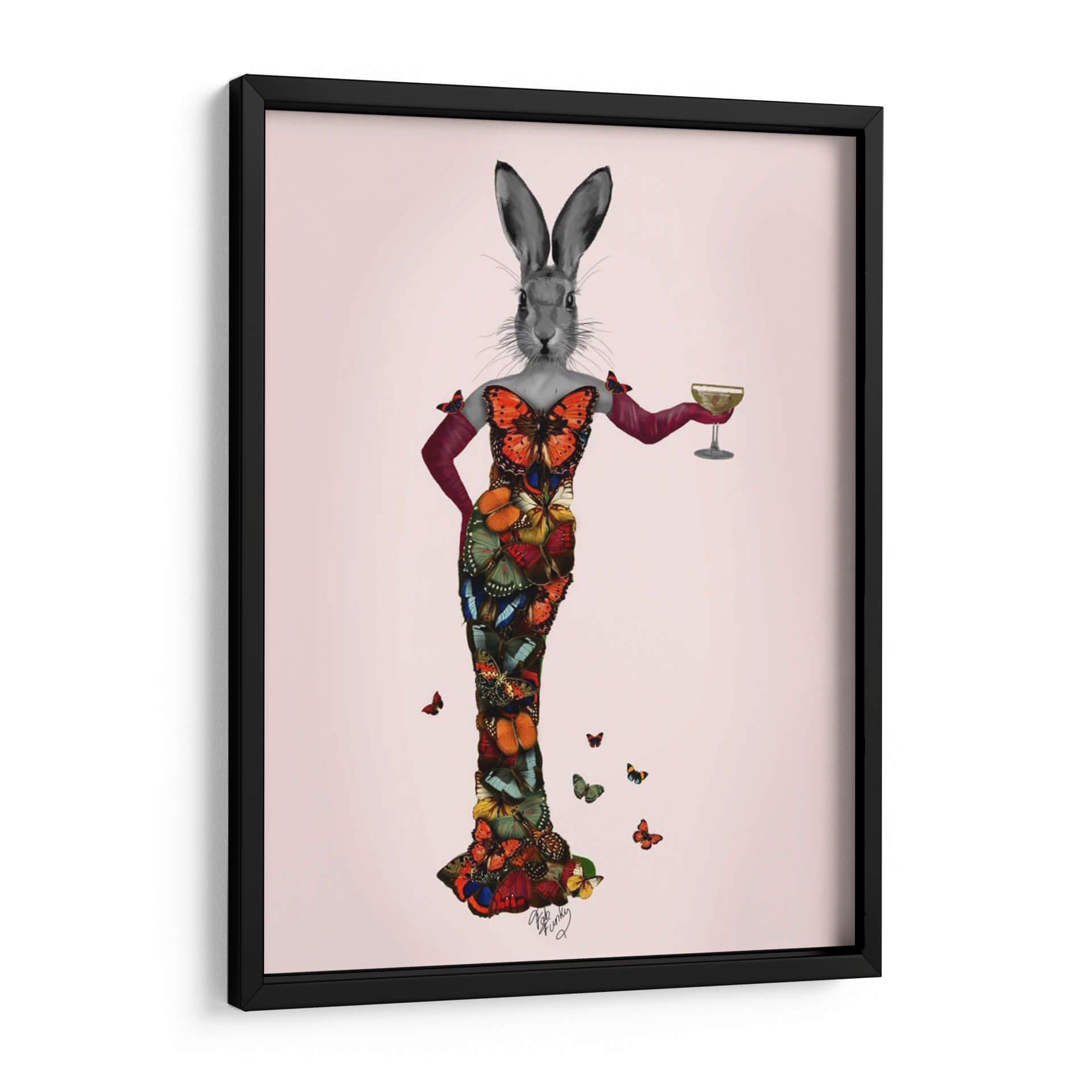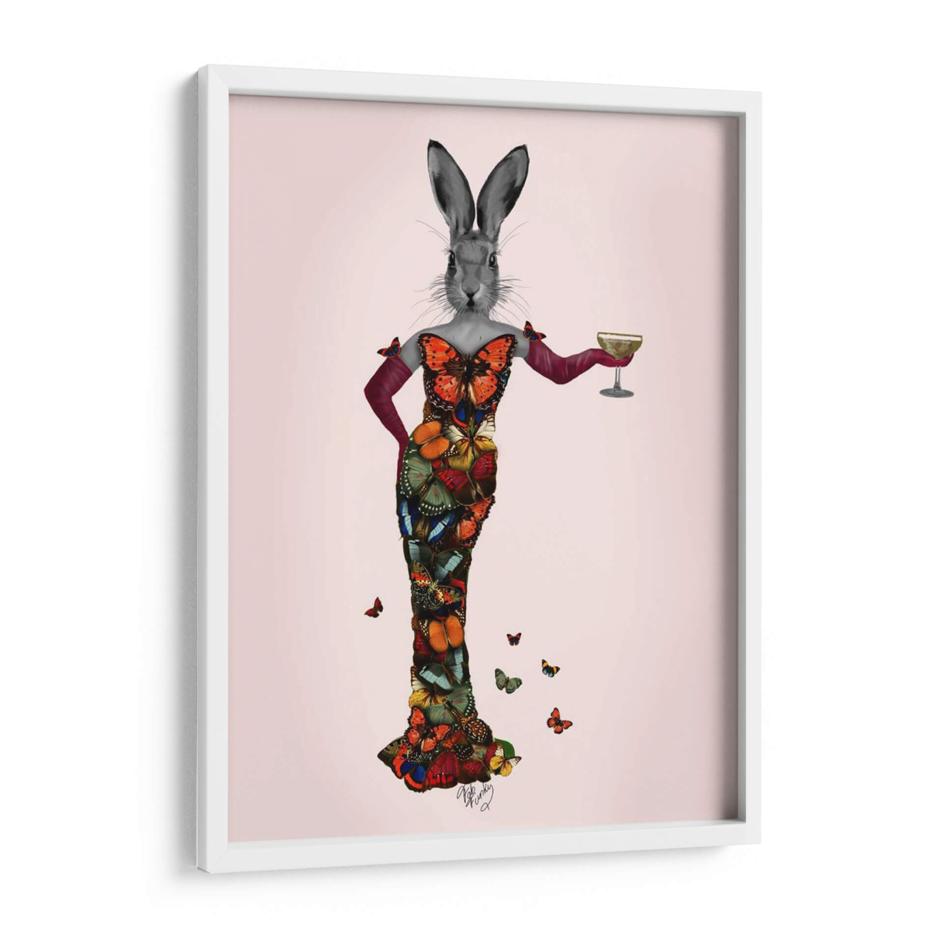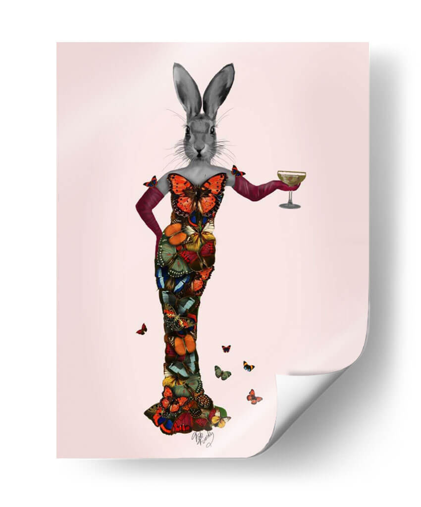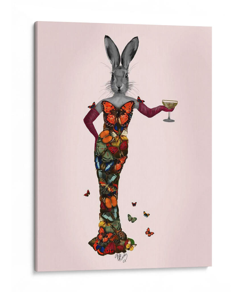 Sumérgete en el encantador mundo de "Vestido de Mariposa de Conejo", una obra de arte digital que fusiona la delicadeza de la naturaleza con una elegancia surrealista. Este cuadro decorativo presenta un conejo con cabeza de carácter propio, ataviado con un impresionante vestido confeccionado enteramente de mariposas vibrantes y detalladas. La paleta de colores es rica y diversa, con tonos intensos de naranja, azul, verde y rojo que contrastan maravillosamente sobre un fondo suavemente rosado. El estilo, una mezcla cautivadora de surrealismo y collage digital, crea una pieza única que evoca una sensación de fantasía juguetona y sofisticación inesperada. Las mariposas, símbolo de transformación y belleza, otorgan a la obra una dimensión etérea y cautivadora. Este cuadro es perfecto para añadir un toque de originalidad y color a cualquier espacio, desde una sala de estar moderna hasta un dormitorio chic o una oficina creativa. Su composición, centrada en la figura principal con mariposas dispersas alrededor, atrae la mirada y genera conversación, convirtiéndose en un punto focal memorable y lleno de personalidad. Ideal para quienes buscan decoración de pared que desafíe lo convencional y celebre la maravilla del mundo natural con un giro artístico audaz y encantador.