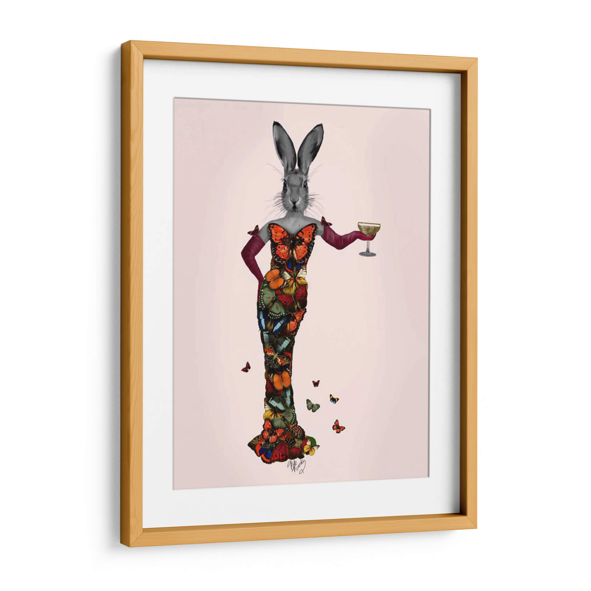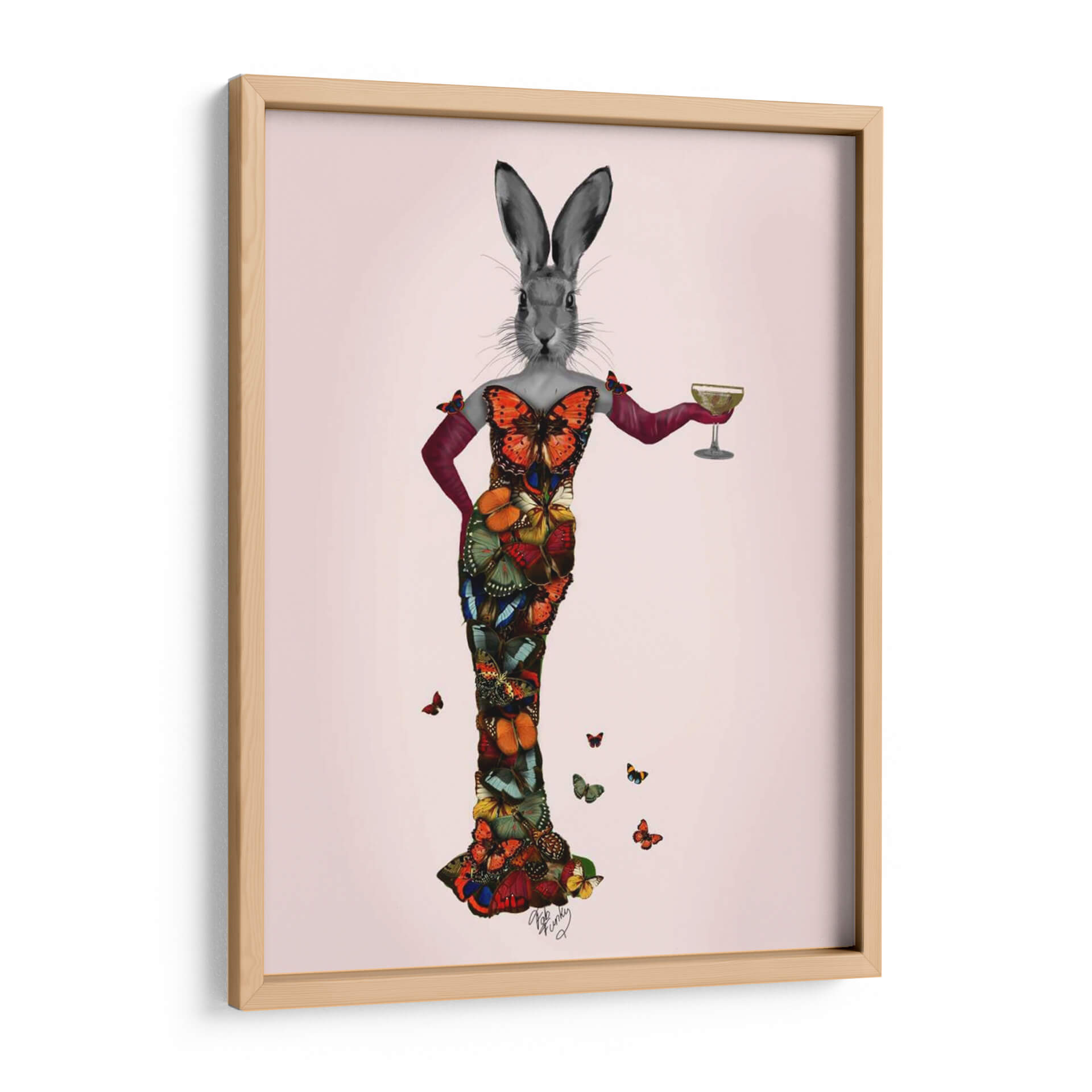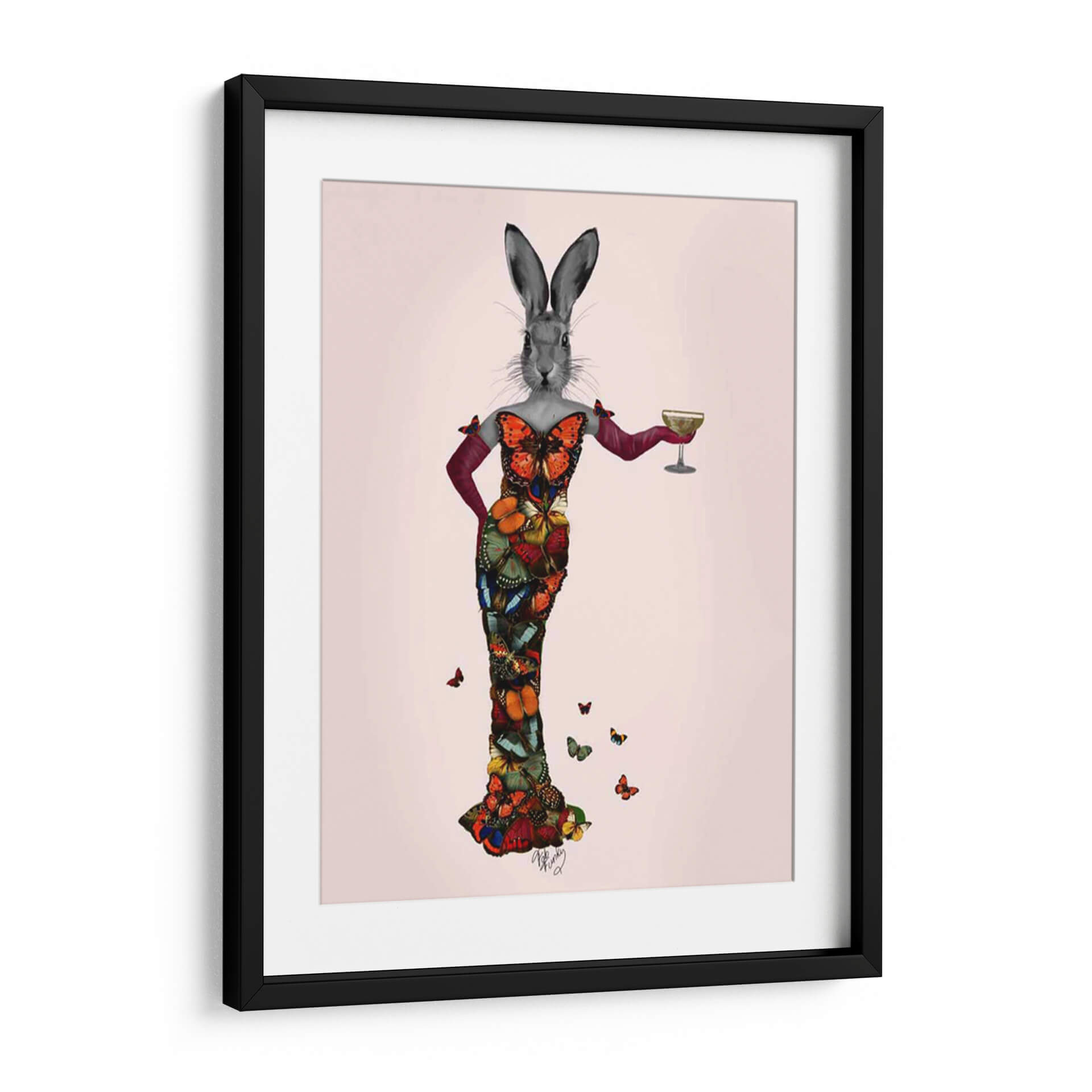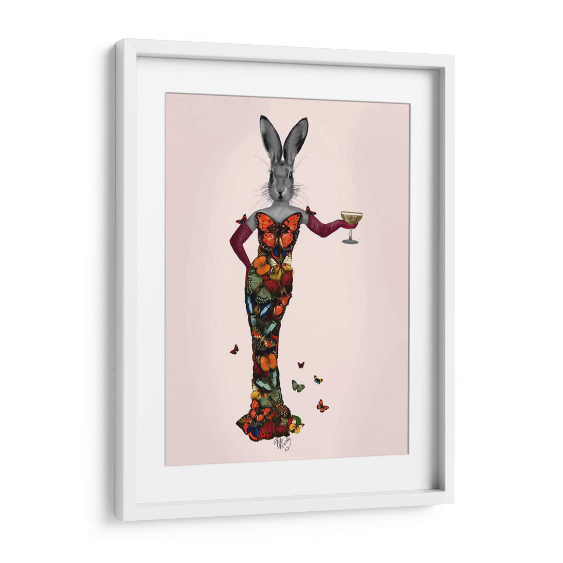 Sumérgete en el encantador mundo de "Vestido de Mariposa de Conejo", una obra de arte digital que fusiona la delicadeza de la naturaleza con una elegancia surrealista. Este cuadro decorativo presenta un conejo con cabeza de carácter propio, ataviado con un impresionante vestido confeccionado enteramente de mariposas vibrantes y detalladas. La paleta de colores es rica y diversa, con tonos intensos de naranja, azul, verde y rojo que contrastan maravillosamente sobre un fondo suavemente rosado. El estilo, una mezcla cautivadora de surrealismo y collage digital, crea una pieza única que evoca una sensación de fantasía juguetona y sofisticación inesperada. Las mariposas, símbolo de transformación y belleza, otorgan a la obra una dimensión etérea y cautivadora. Este cuadro es perfecto para añadir un toque de originalidad y color a cualquier espacio, desde una sala de estar moderna hasta un dormitorio chic o una oficina creativa. Su composición, centrada en la figura principal con mariposas dispersas alrededor, atrae la mirada y genera conversación, convirtiéndose en un punto focal memorable y lleno de personalidad. Ideal para quienes buscan decoración de pared que desafíe lo convencional y celebre la maravilla del mundo natural con un giro artístico audaz y encantador.