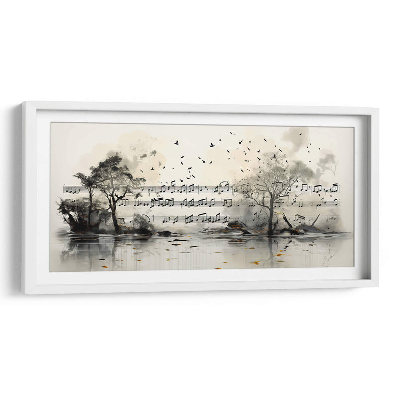 Sumérgete en la sinfonía visual de 'Viento y Música', una obra de arte contemporáneo que fusiona la naturaleza con la melodía. Cecilia Flores crea un paisaje onírico donde las notas musicales fluyen como el viento entre árboles oscuros y reflejos acuáticos. La paleta de colores, dominada por tonos neutros, grises y toques de ocre, evoca una atmósfera de serenidad y contemplación, salpicada por la energía efímera de aves en vuelo. Esta pieza abstracta pero evocadora es ideal para quienes buscan un cuadro decorativo que inspire calma y creatividad. Perfecta para añadir un punto focal artístico a salones modernos, estudios o espacios de trabajo que necesiten un toque de sofisticación etérea. 'Viento y Música' no es solo una decoración, es una invitación a sentir la armonía del universo en tu hogar, un diálogo silencioso entre la tierra, el aire y el sonido. Su composición horizontal la hace versátil para diversos muros, transformando cualquier ambiente en una galería personal llena de significado y belleza sutil.