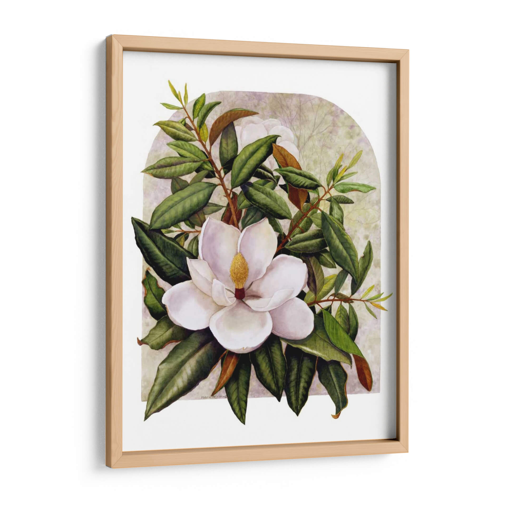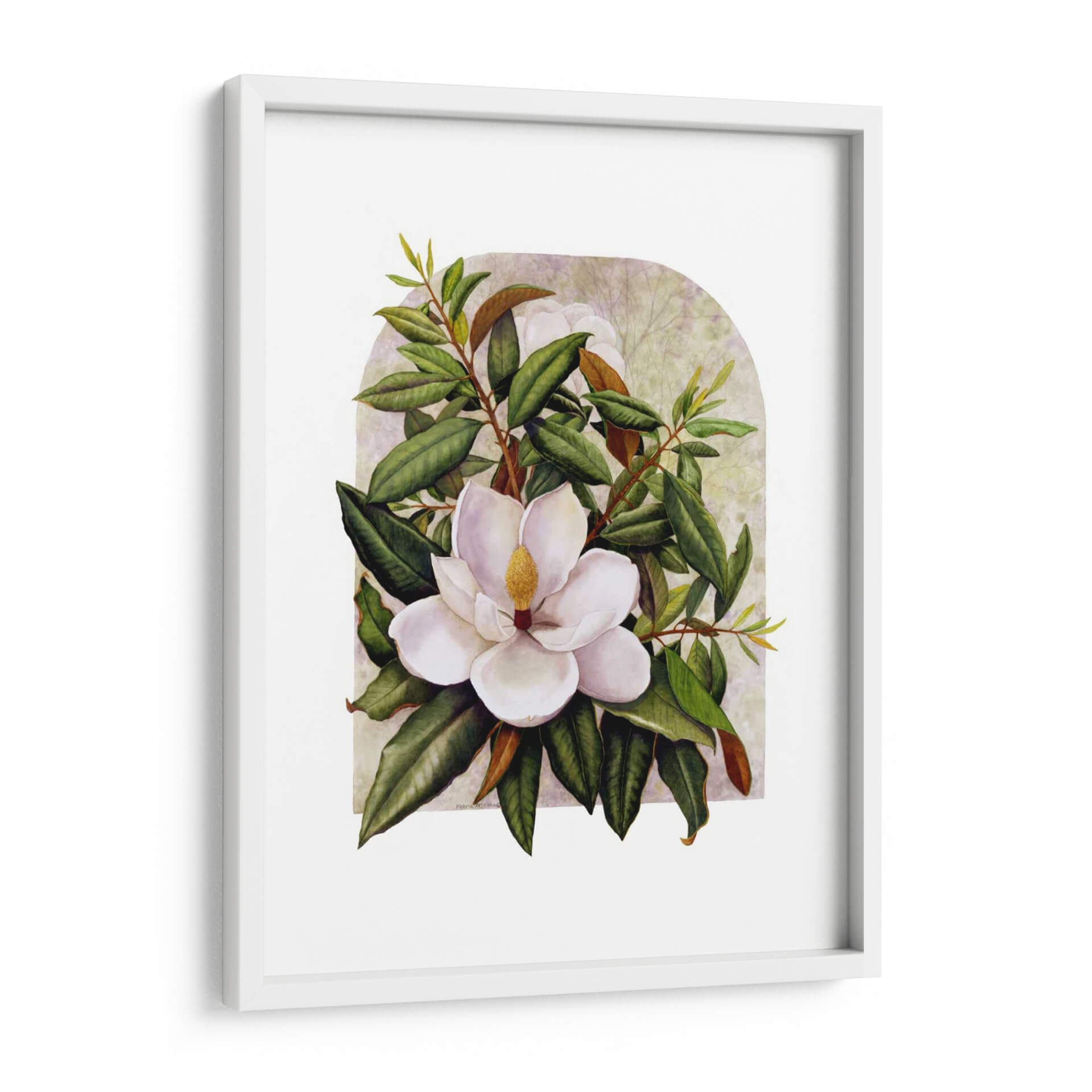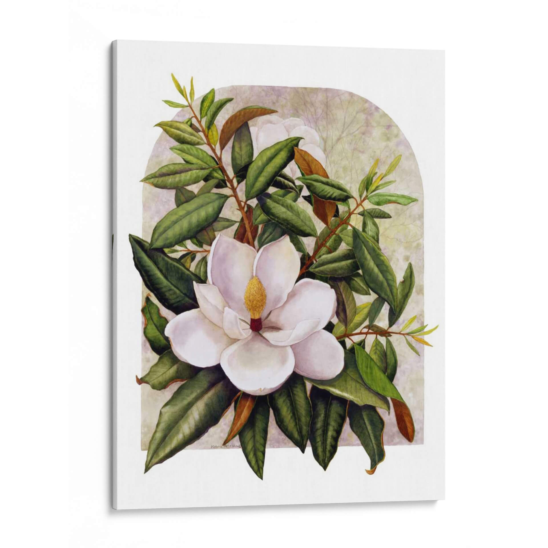 Embellece tu espacio con la delicadeza atemporal de "Viñeta Magnolia", una obra de arte que captura la esencia de una flor icónica con una técnica exquisita. La artista Marcia Matcham nos presenta un primer plano detallado de una magnolio en plena floración, rodeada de exuberantes hojas verdes y sutiles ramas. La paleta de colores se centra en blancos puros para el pétalo principal, contrastando elegantemente con los verdes profundos del follaje y toques de marrón terroso en algunas hojas, creando una atmósfera de serenidad y naturaleza pura. El estilo realista con un toque etéreo, realzado por un fondo texturizado en tonos pastel y un arco suave, aporta profundidad y sofisticación. Este cuadro decorativo es perfecto para añadir un toque de elegancia botánica a cualquier habitación, desde la sala de estar hasta un dormitorio o incluso una oficina, evocando calma y la belleza efímera de la naturaleza. Su composición centrada y detallada lo convierte en un punto focal exquisito, ideal para quienes buscan arte inspirador y tranquilizador que eleve su decoración. "Viñeta Magnolia" no es solo una imagen, es una ventana a la serenidad y la sofisticación natural, ideal para añadir un toque de la naturaleza a tu hogar.