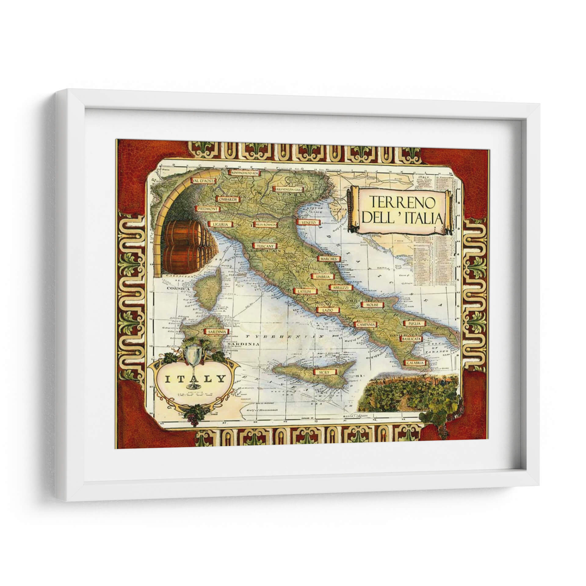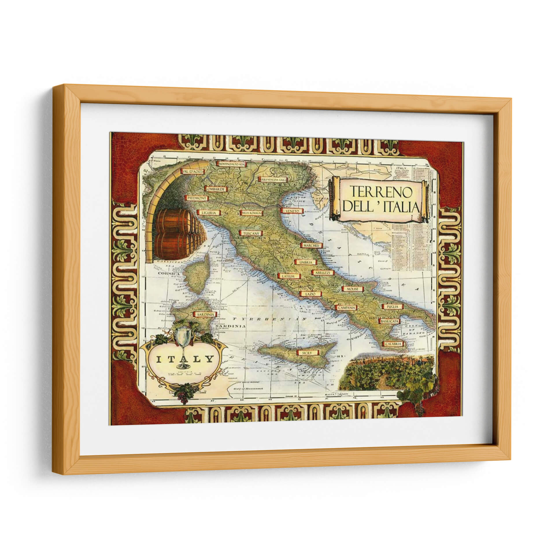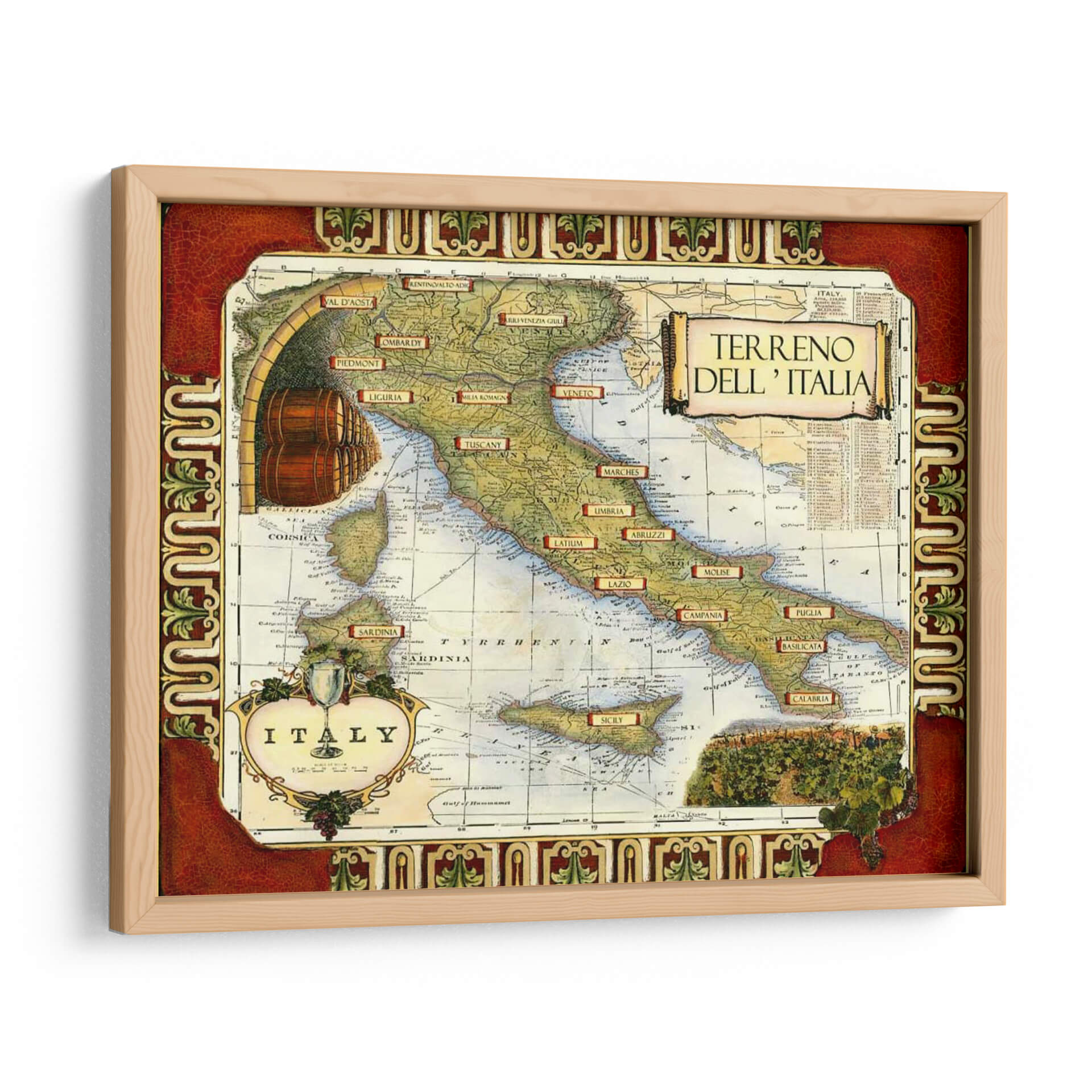 Descubre la esencia de Italia con este cautivador cuadro decorativo que fusiona geografía y enología. La obra "Vino Mapa De Italia" presenta un detallado mapa de la península italiana, destacando sus regiones vinícolas y rutas del vino con una estética vintage y evocadora. Los colores terrosos, verdes y los sutiles toques de ocre transportan a un ambiente cálido y tradicional, ideal para amantes del vino y la cultura italiana. El diseño se enriquece con ilustraciones de barriles de vino y viñedos, añadiendo profundidad y carácter a la pieza. Este cuadro es perfecto para dar un toque de sofisticación y un aire de 'dolce vita' a tu cocina, sala de estar, bar privado o estudio. Su estilo retro y la temática vinícola lo convierten en un punto focal que invita a la conversación y al disfrute. Añade un pedazo de la herencia italiana a tu decoración y celebra la pasión por el vino en cada rincón de tu hogar.