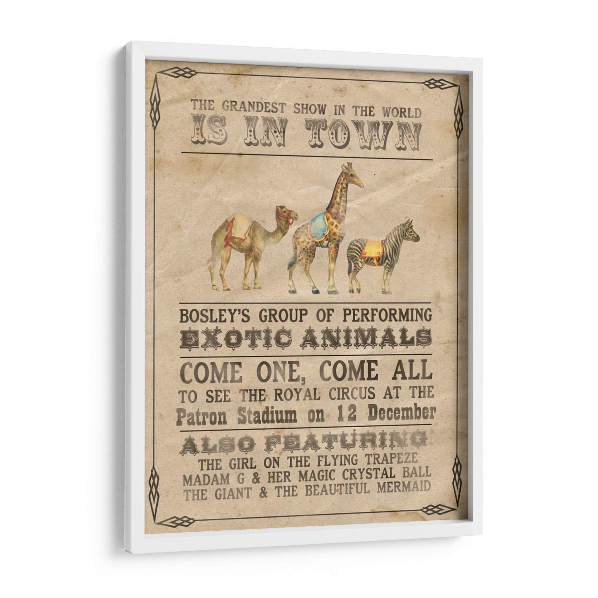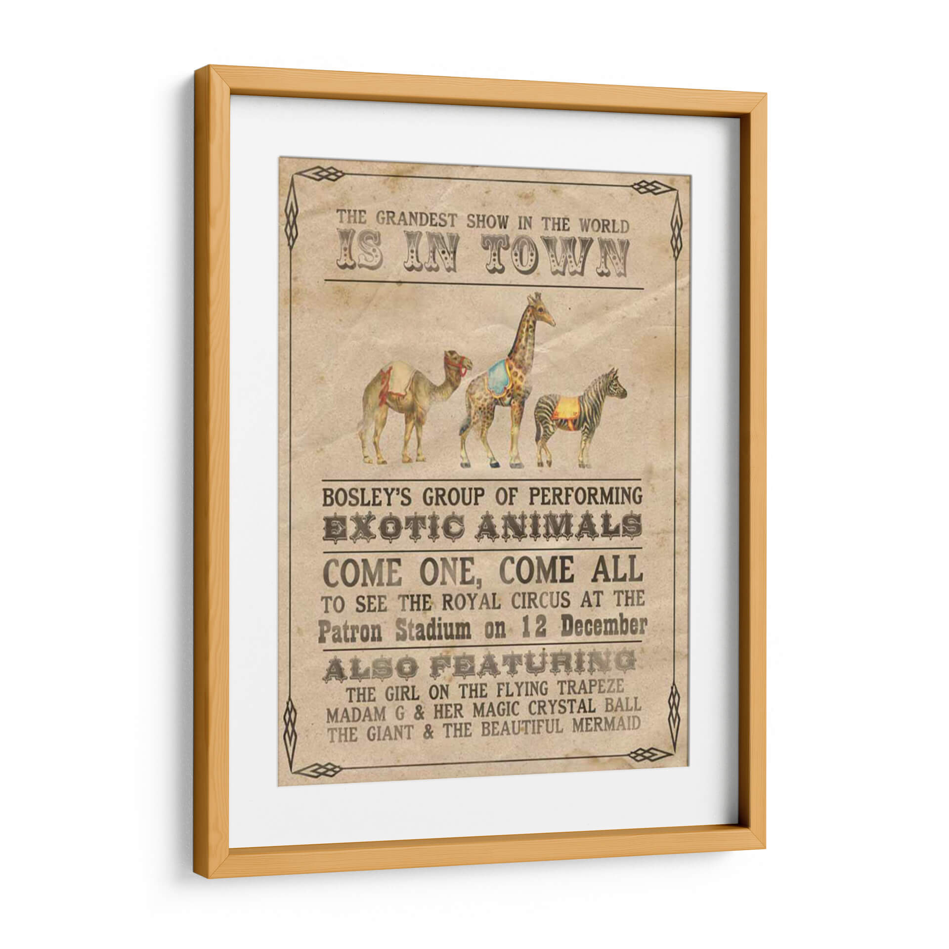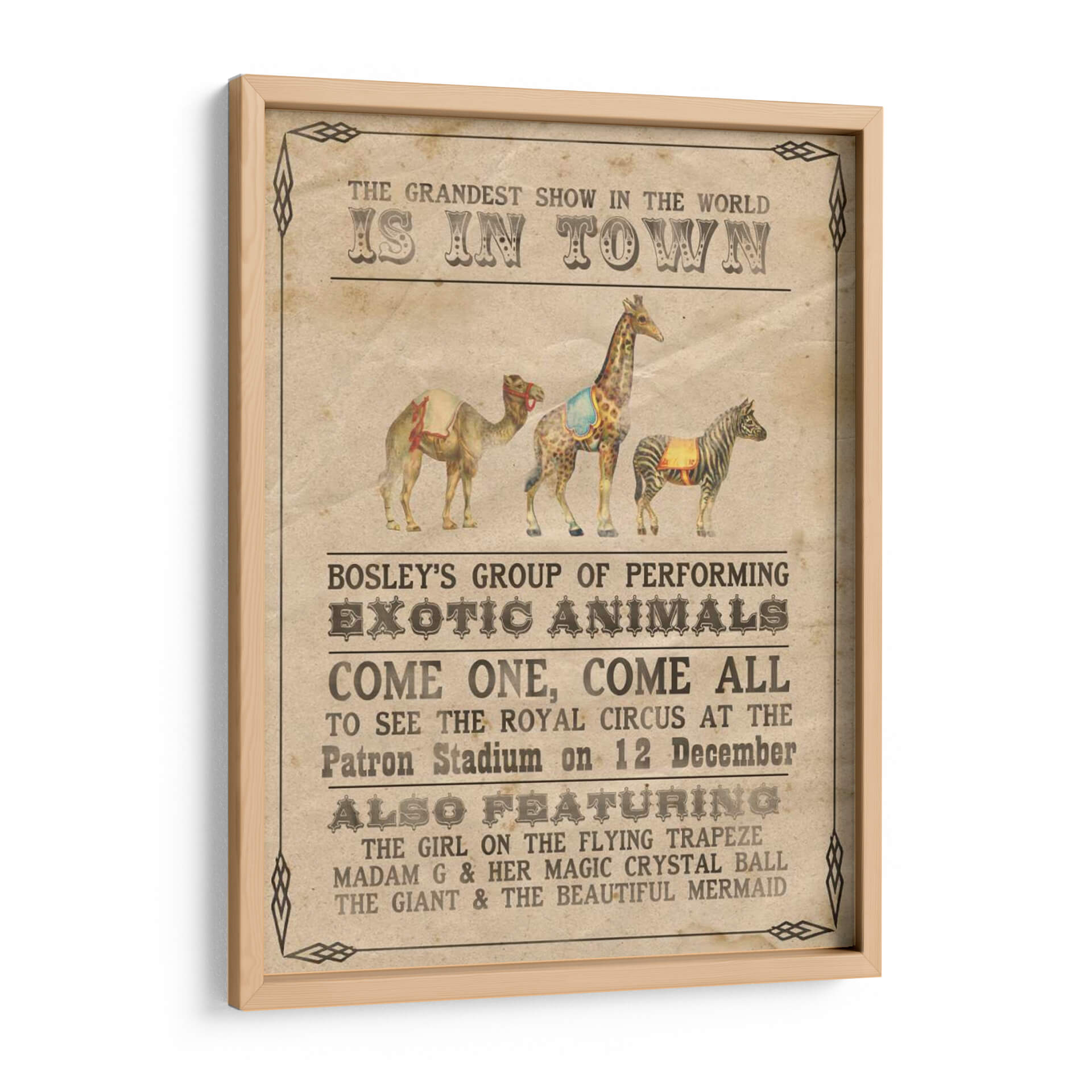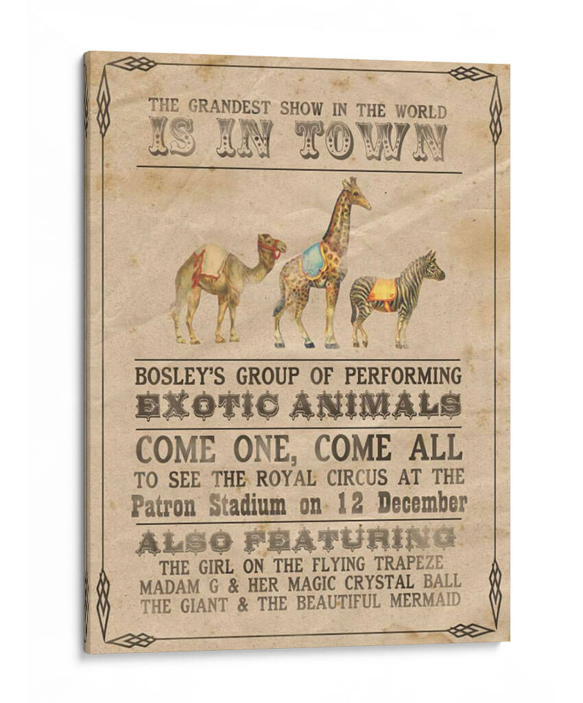Transporta a tu hogar la magia y el encanto del circo vintage con "Vintage Circus Iii", una cautivadora obra de arte de Grace Popp. Este cuadro decorativo evoca la nostalgia de los espectáculos itinerantes, presentando una composición vibrante y detallada de animales exóticos y anuncios circenses clásicos. La paleta de colores cálidos y terrosos, junto con un estilo que recuerda a los carteles de principios del siglo XX, crea una atmósfera de emoción y aventura. Cada elemento, desde el majestuoso camello hasta la elegante cebra y la imponente jirafa, está representado con un encanto rústico que invita a soñar. Ideal para añadir un toque de carácter y un punto de conversación a tu sala de estar, estudio u oficina. "Vintage Circus Iii" es más que una simple decoración de pared; es una invitación a revivir la maravilla del gran espectáculo, transformando cualquier espacio en un lugar lleno de historia y fantasía. Descubre la pieza perfecta para amantes del arte retro y entusiastas del circo que buscan una decoración única y con personalidad.