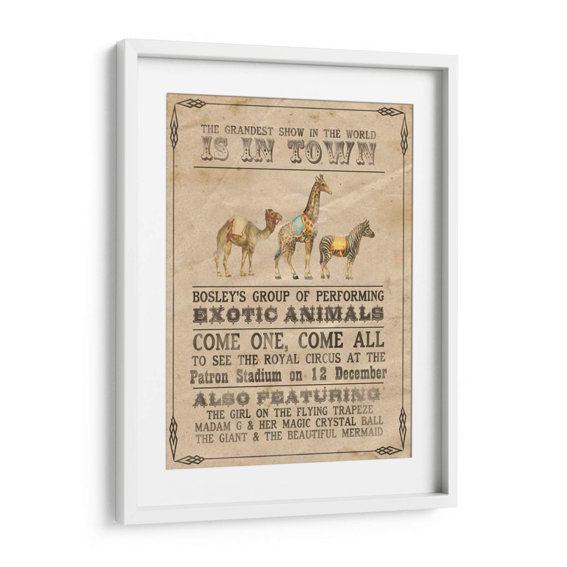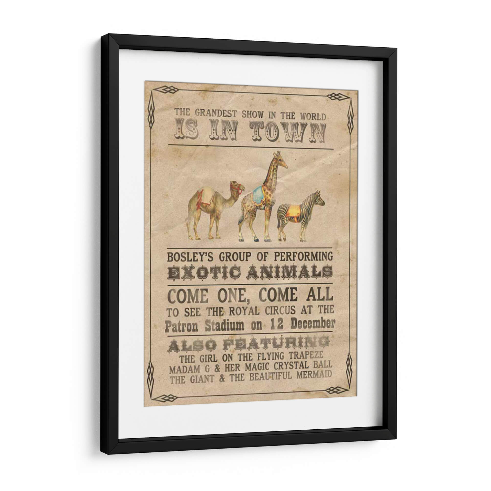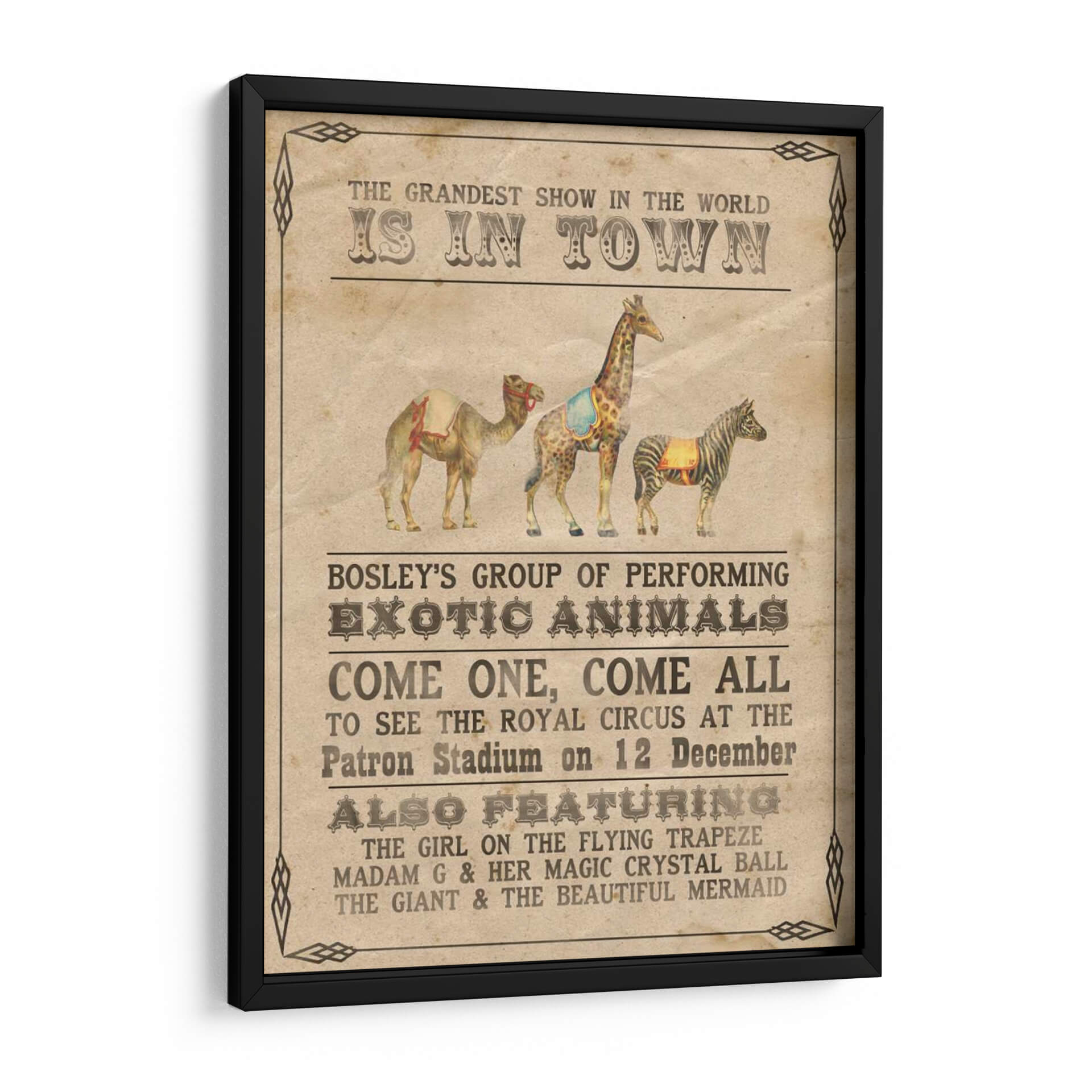 Transporta a tu hogar la magia y el encanto del circo vintage con "Vintage Circus Iii", una cautivadora obra de arte de Grace Popp. Este cuadro decorativo evoca la nostalgia de los espectáculos itinerantes, presentando una composición vibrante y detallada de animales exóticos y anuncios circenses clásicos. La paleta de colores cálidos y terrosos, junto con un estilo que recuerda a los carteles de principios del siglo XX, crea una atmósfera de emoción y aventura. Cada elemento, desde el majestuoso camello hasta la elegante cebra y la imponente jirafa, está representado con un encanto rústico que invita a soñar. Ideal para añadir un toque de carácter y un punto de conversación a tu sala de estar, estudio u oficina. "Vintage Circus Iii" es más que una simple decoración de pared; es una invitación a revivir la maravilla del gran espectáculo, transformando cualquier espacio en un lugar lleno de historia y fantasía. Descubre la pieza perfecta para amantes del arte retro y entusiastas del circo que buscan una decoración única y con personalidad.