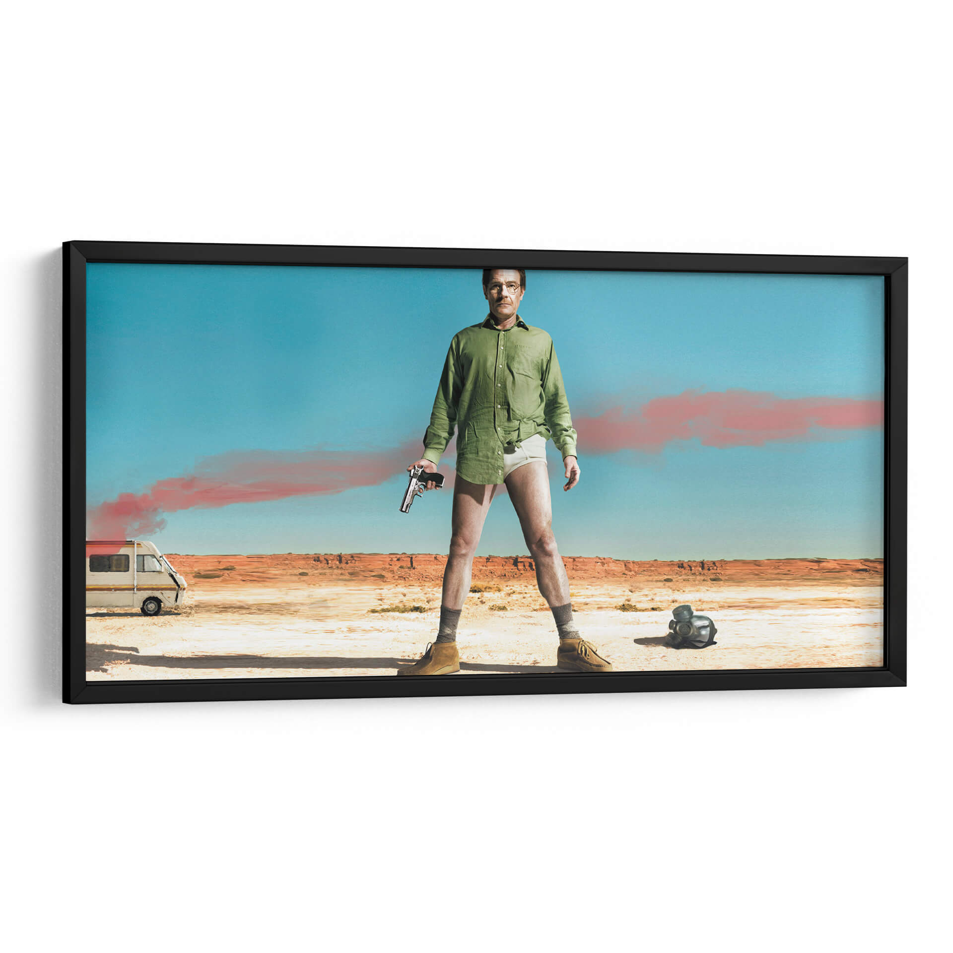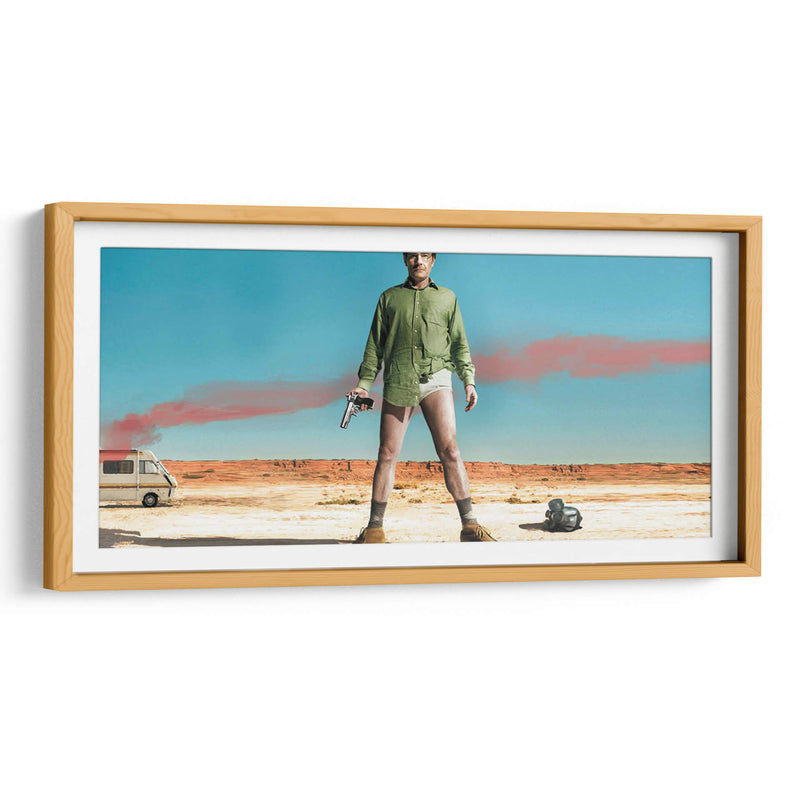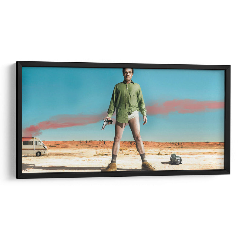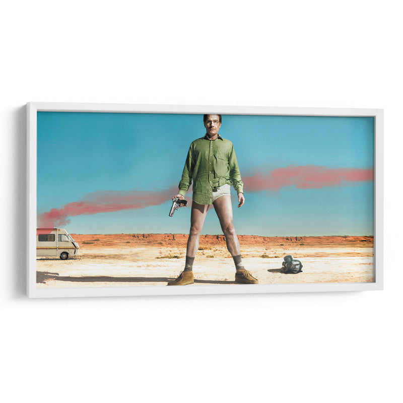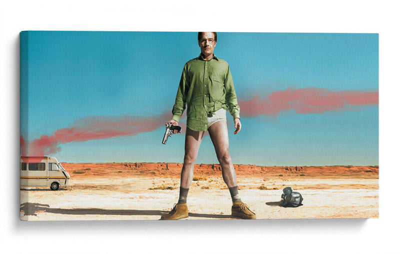 Sumérgete en la atmósfera icónica y cruda de este cuadro decorativo, inspirado en una escena memorable que evoca tensión y transformación. La obra presenta a un hombre de pie, en un paisaje desértico bajo un cielo azul vibrante, sosteniendo un arma y con una nube de humo rojizo de fondo. La composición, con el personaje central en primer plano y elementos como una furgoneta y un equipo de protección dispersos, crea una narrativa visual potente. La paleta de colores, dominada por el azul del cielo, los tonos ocres del desierto y el contraste del rojo, genera una atmósfera dramática y electrizante. Este cuadro decorativo es ideal para espacios que buscan un toque de audacia y carácter, como una sala de estar moderna, un estudio o una oficina con personalidad. Su estilo fotográfico y su temática intrigante lo convierten en una pieza de conversación, perfecta para los admiradores del arte que no temen explorar narrativas complejas. Añade un elemento de impacto visual y una historia implícita a tu decoración con esta impactante obra.