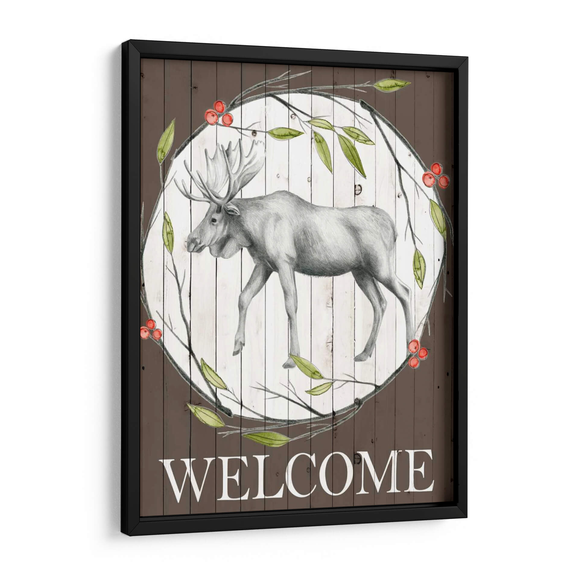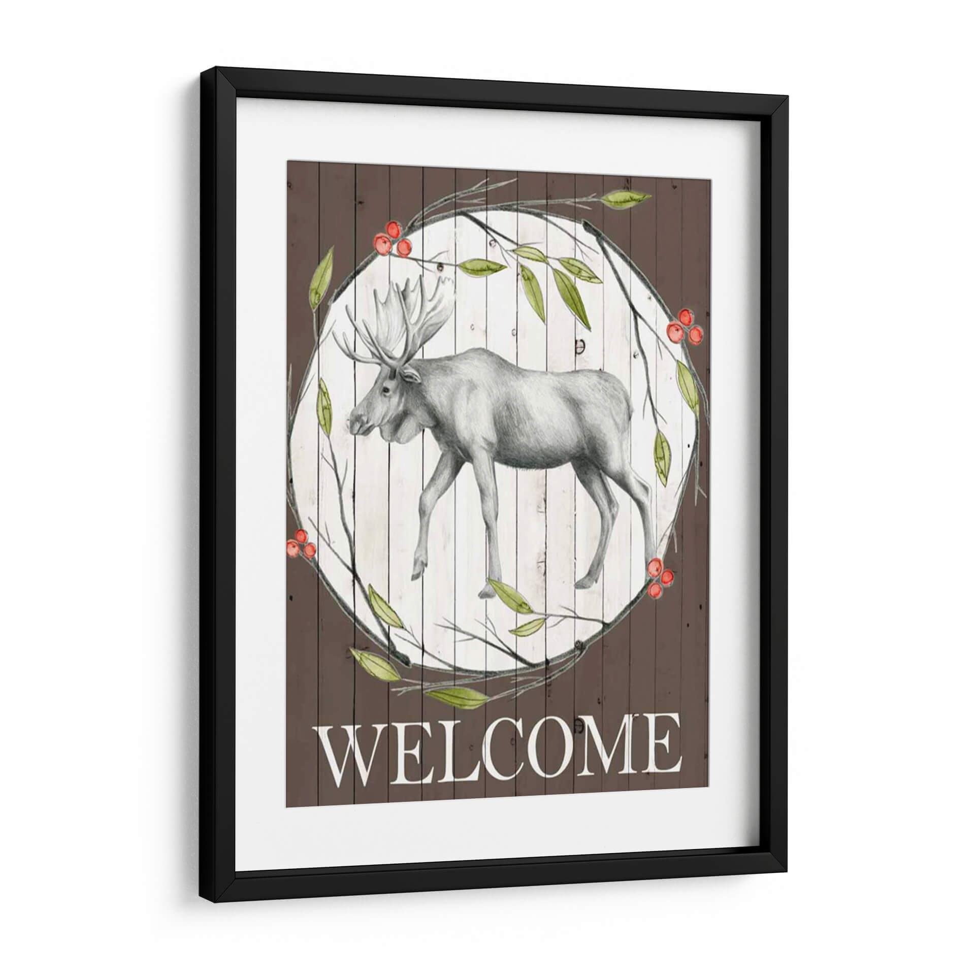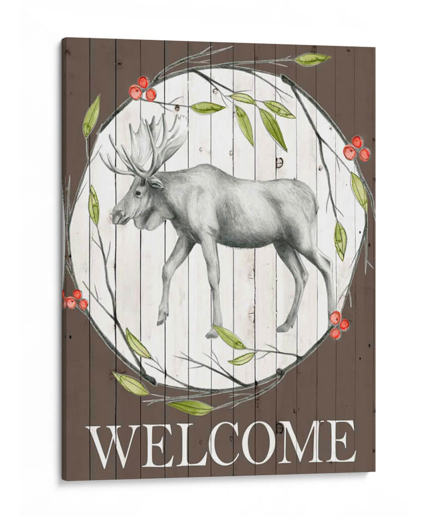 Dando la bienvenida a tu hogar con elegancia rústica, esta obra de arte "Woodland Walk II" de Grace Popp captura la majestuosidad de un alce en un entorno natural sereno. La pieza presenta un detallado boceto a lápiz de un alce en tonos grises, enmarcado por un círculo de ramas verdes y bayas rojas vibrantes, sobre un fondo texturizado de tablones de madera blanca desgastada. El contraste entre la delicadeza del dibujo del alce y los elementos rústicos del fondo crea una atmósfera acogedora y de conexión con la naturaleza. La paleta de colores, dominada por el marrón terroso, el verde hoja y los toques rojos de las bayas, evoca una sensación de tranquilidad y calidez otoñal. La inscripción "WELCOME" en la parte inferior refuerza su propósito de dar la bienvenida, haciendo de este cuadro decorativo una pieza ideal para recibidores, salas de estar o incluso estudios con temática rústica o de la naturaleza. Su estilo se sitúa entre lo figurativo y lo rústico, aportando un toque de sofisticación campestre a cualquier espacio, perfecto para quienes buscan añadir carácter y un sentido de pertenencia a su decoración de pared. Es una invitación visual a la paz y la belleza del bosque.