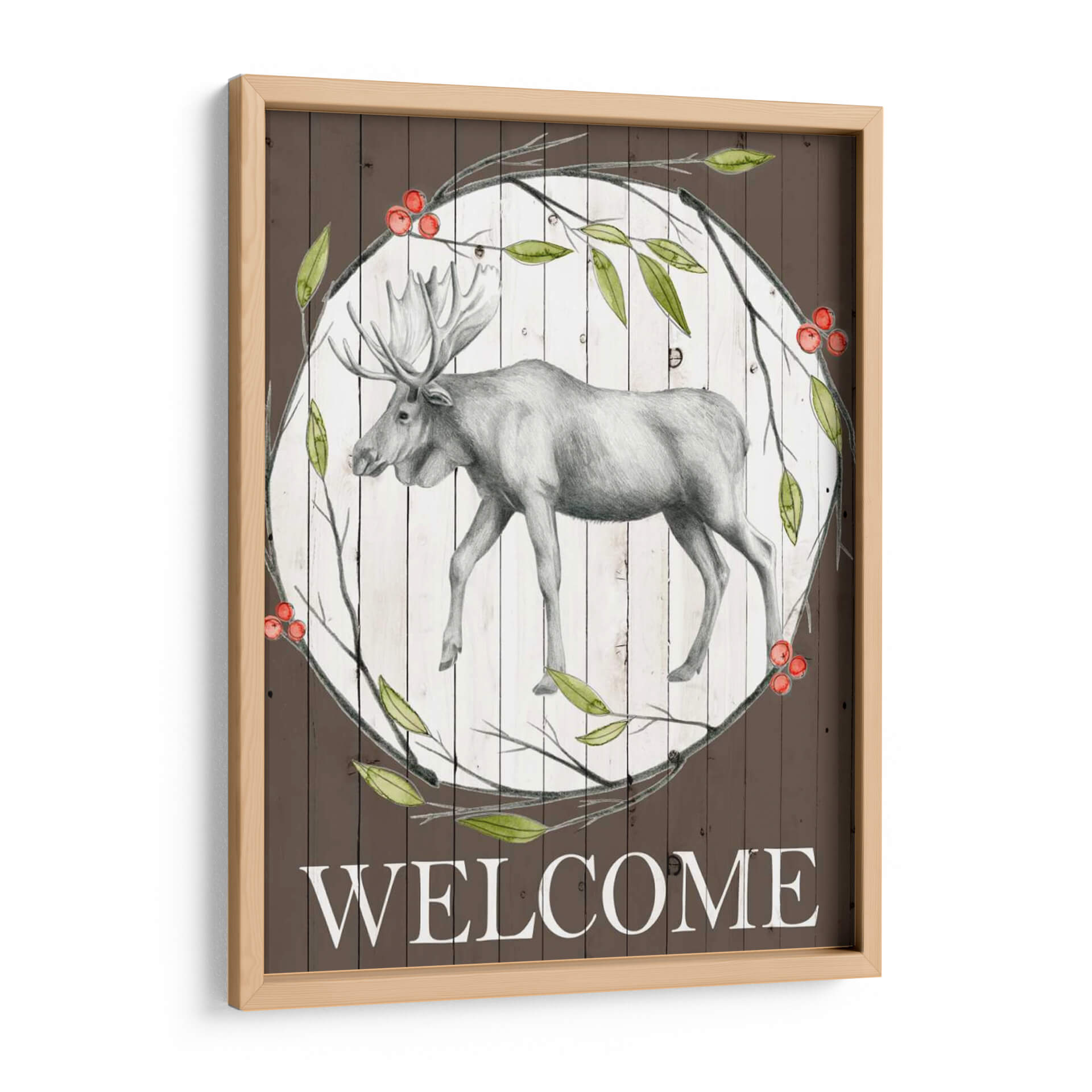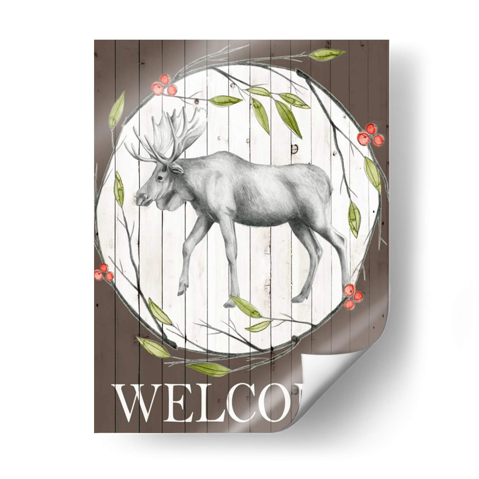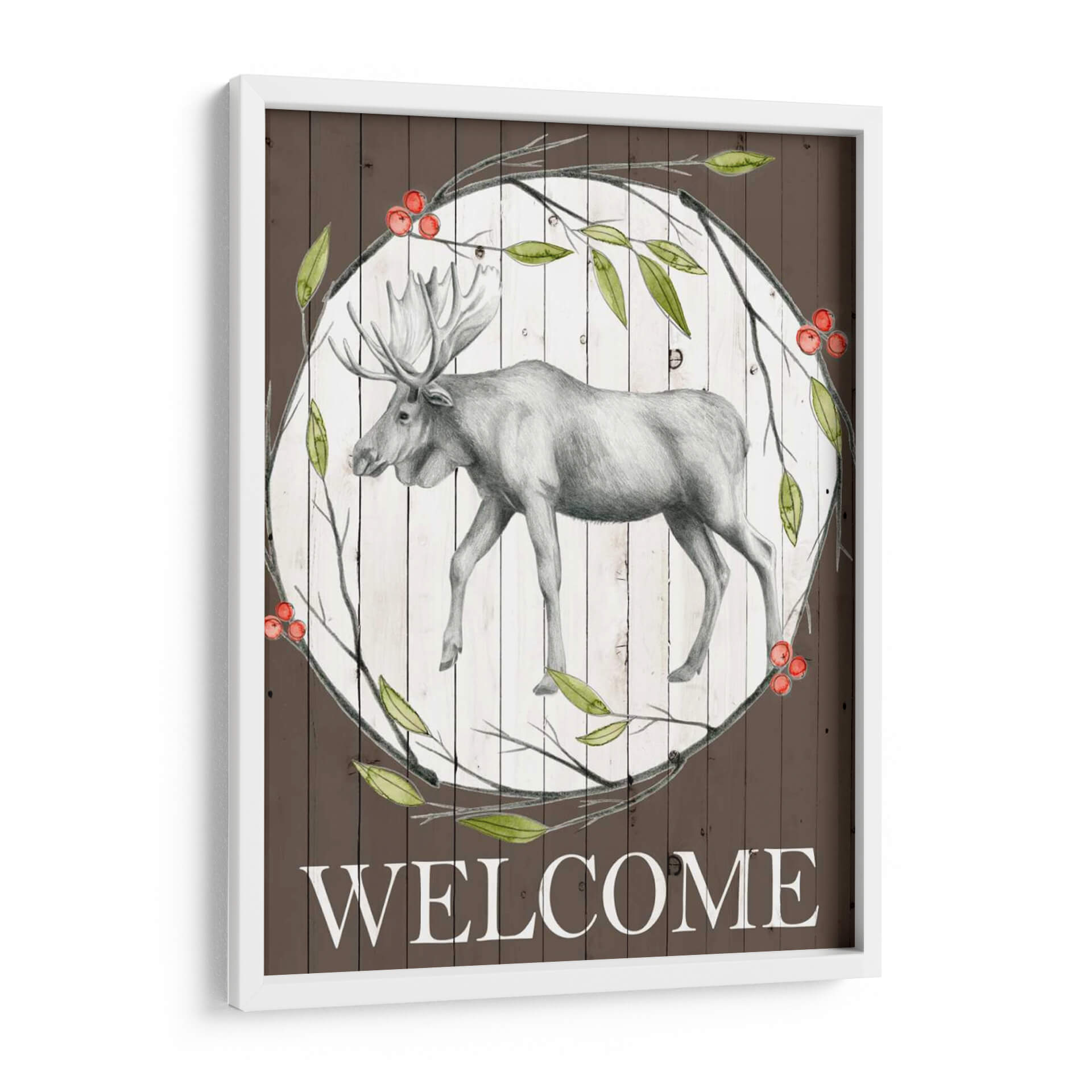 Dando la bienvenida a tu hogar con elegancia rústica, esta obra de arte "Woodland Walk II" de Grace Popp captura la majestuosidad de un alce en un entorno natural sereno. La pieza presenta un detallado boceto a lápiz de un alce en tonos grises, enmarcado por un círculo de ramas verdes y bayas rojas vibrantes, sobre un fondo texturizado de tablones de madera blanca desgastada. El contraste entre la delicadeza del dibujo del alce y los elementos rústicos del fondo crea una atmósfera acogedora y de conexión con la naturaleza. La paleta de colores, dominada por el marrón terroso, el verde hoja y los toques rojos de las bayas, evoca una sensación de tranquilidad y calidez otoñal. La inscripción "WELCOME" en la parte inferior refuerza su propósito de dar la bienvenida, haciendo de este cuadro decorativo una pieza ideal para recibidores, salas de estar o incluso estudios con temática rústica o de la naturaleza. Su estilo se sitúa entre lo figurativo y lo rústico, aportando un toque de sofisticación campestre a cualquier espacio, perfecto para quienes buscan añadir carácter y un sentido de pertenencia a su decoración de pared. Es una invitación visual a la paz y la belleza del bosque.