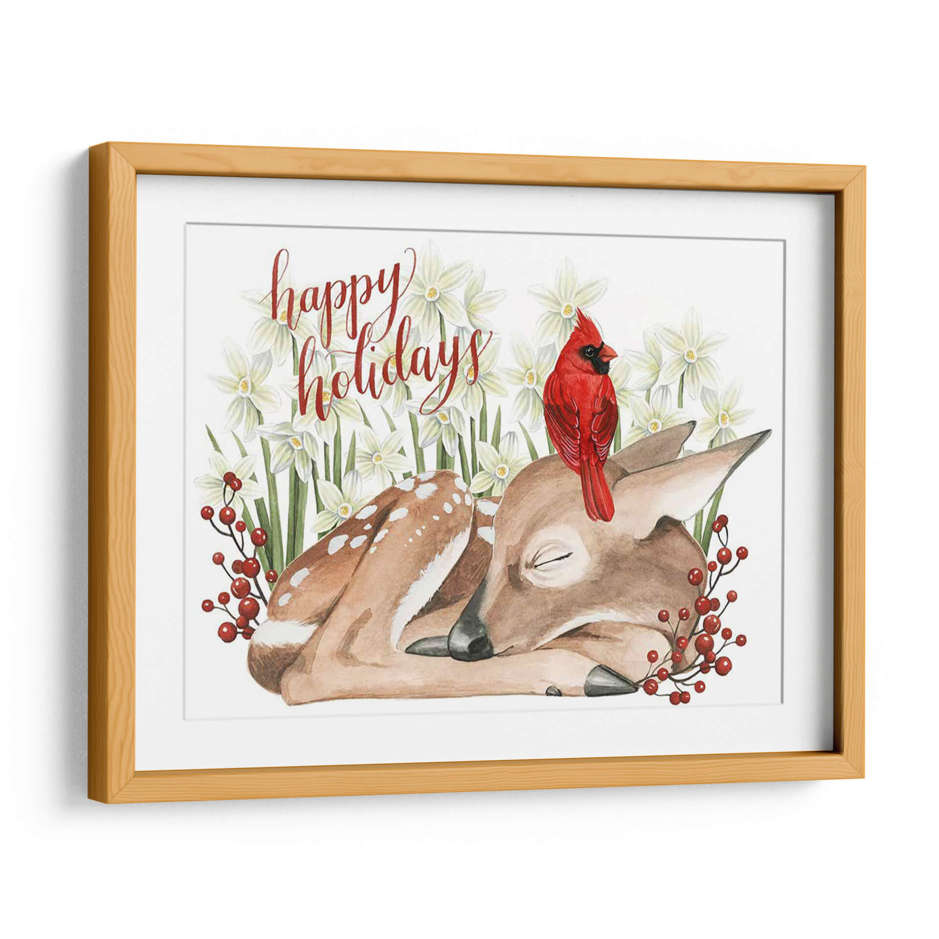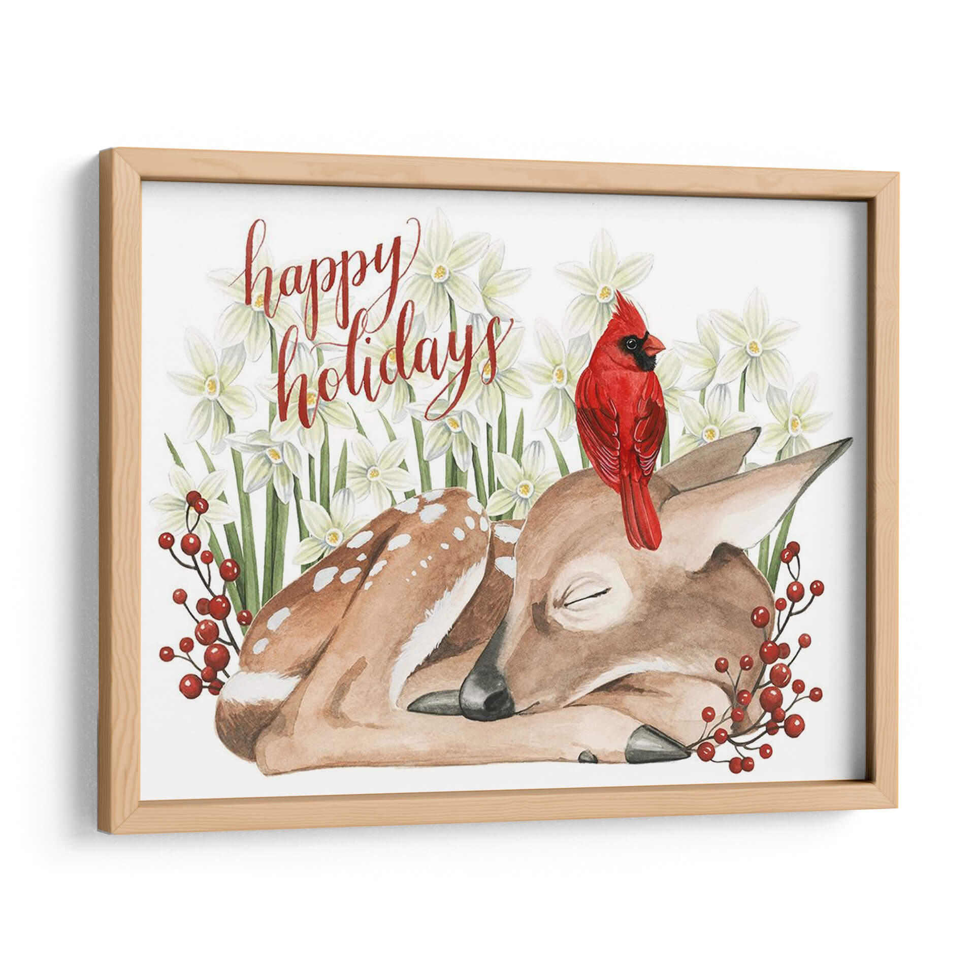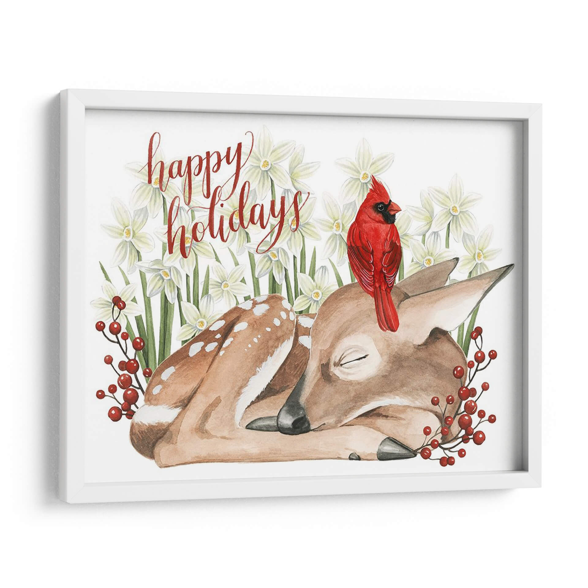 Captura la esencia de la temporada festiva con este encantador cuadro decorativo titulado 'Yuletide Darlings Collection A' del artista Grace Popp. La obra presenta una delicada acuarela de un tierno cervatillo durmiendo, adornado con un vibrante cardenal rojo posado sobre su cabeza. El fondo está compuesto por un delicado despliegue de flores blancas y verdes tallos, evocando la frescura del invierno. La frase 'happy holidays' en caligrafía roja añade un toque festivo y cálido a la composición. Los tonos tierra del cervatillo contrastan maravillosamente con el rojo intenso del pájaro y el blanco sereno de las flores, creando una atmósfera de paz y alegría invernal. Este cuadro es perfecto para añadir un toque de dulzura y celebración a cualquier espacio, ya sea un salón acogedor, una habitación infantil o una entrada que dé la bienvenida a los invitados durante las fiestas. Su estilo artístico, que recuerda a las ilustraciones de libros clásicos, lo convierte en una pieza versátil y atemporal para la decoración de paredes.