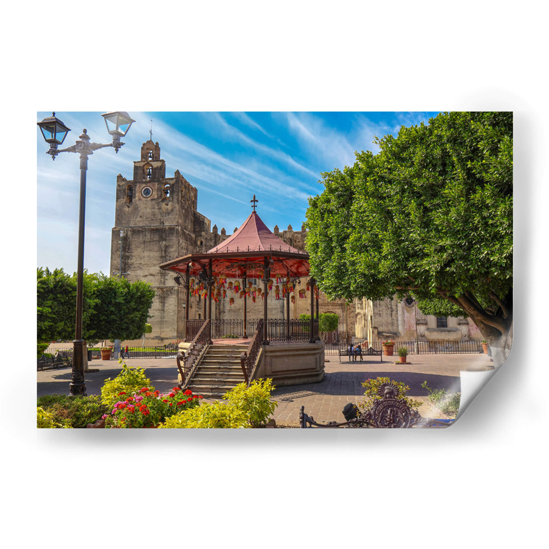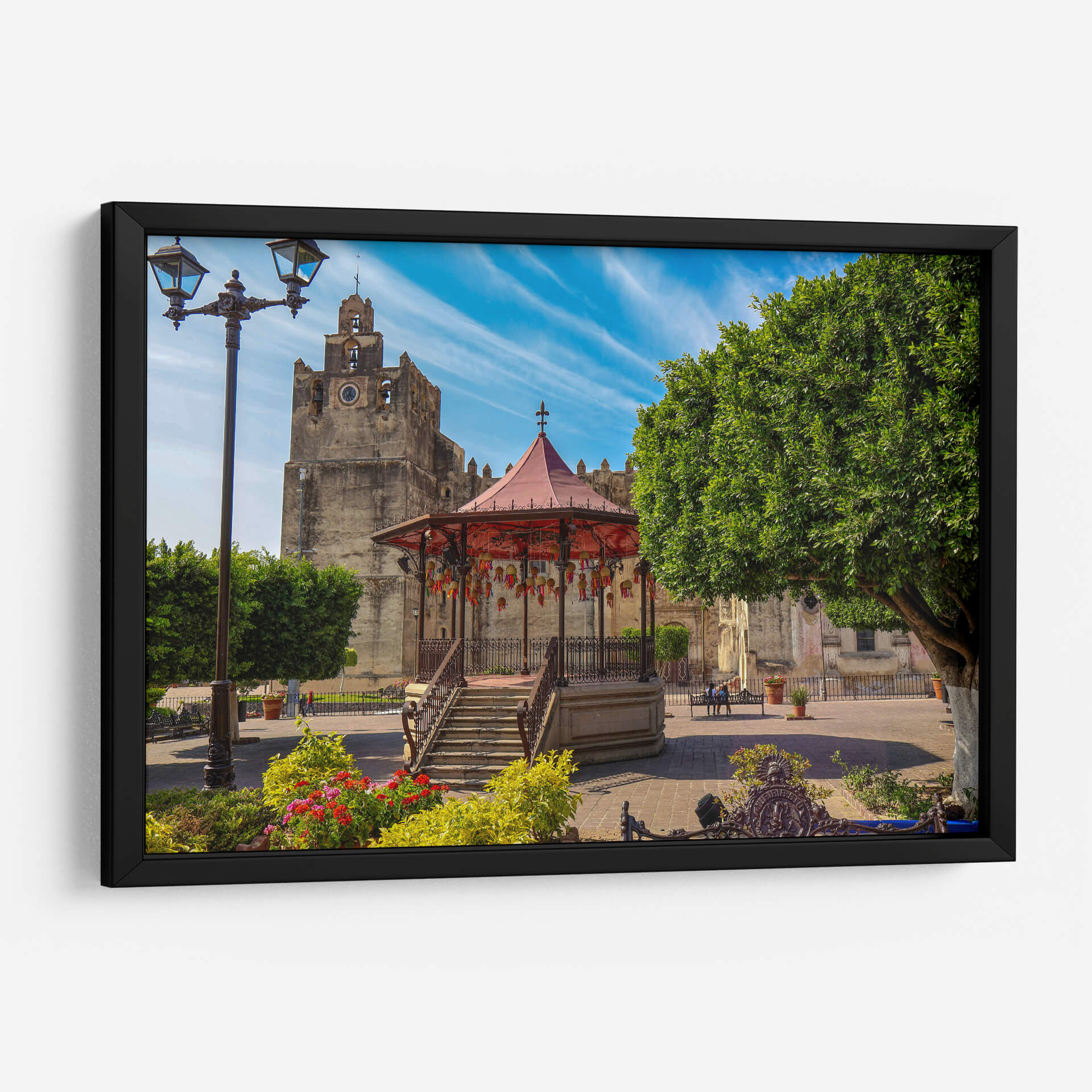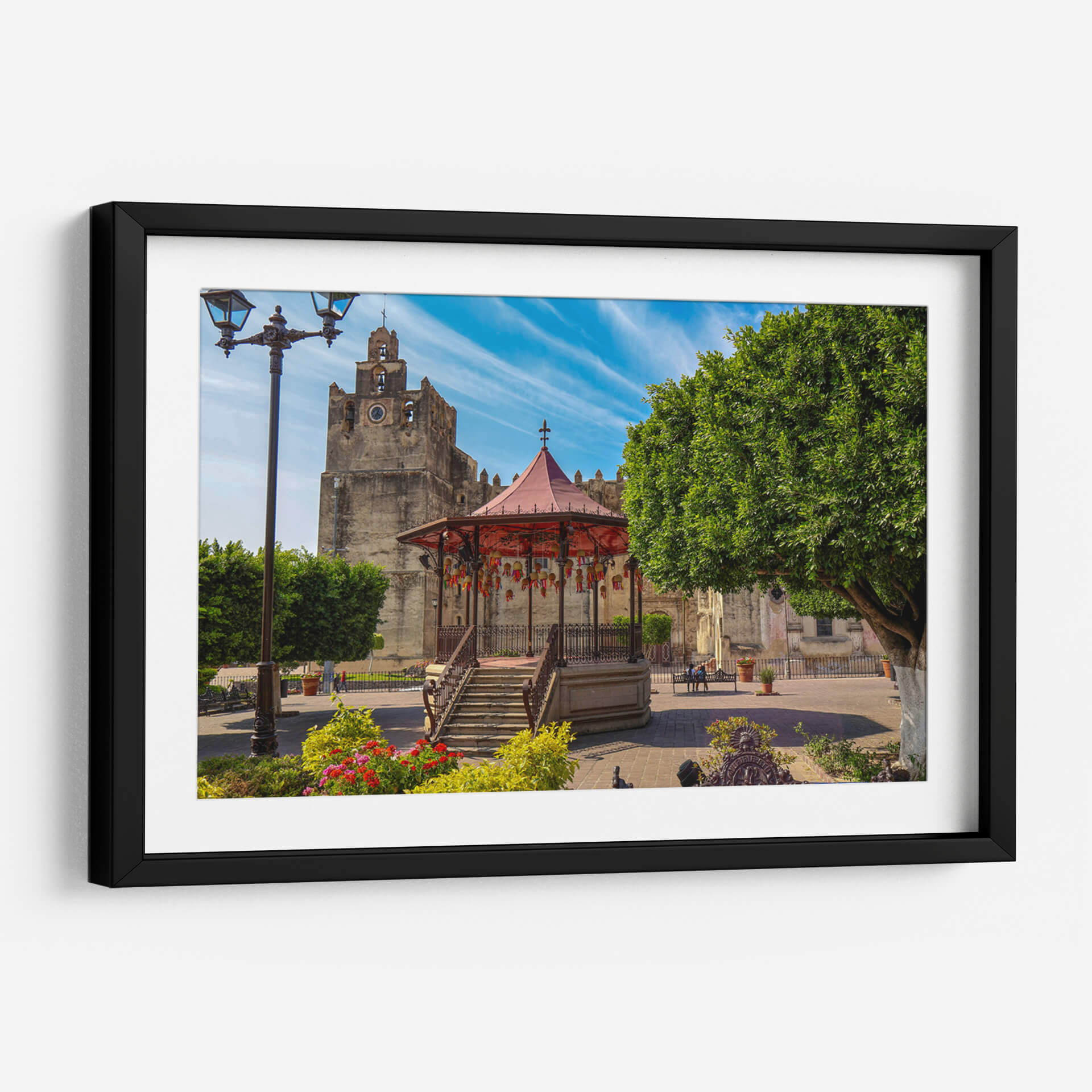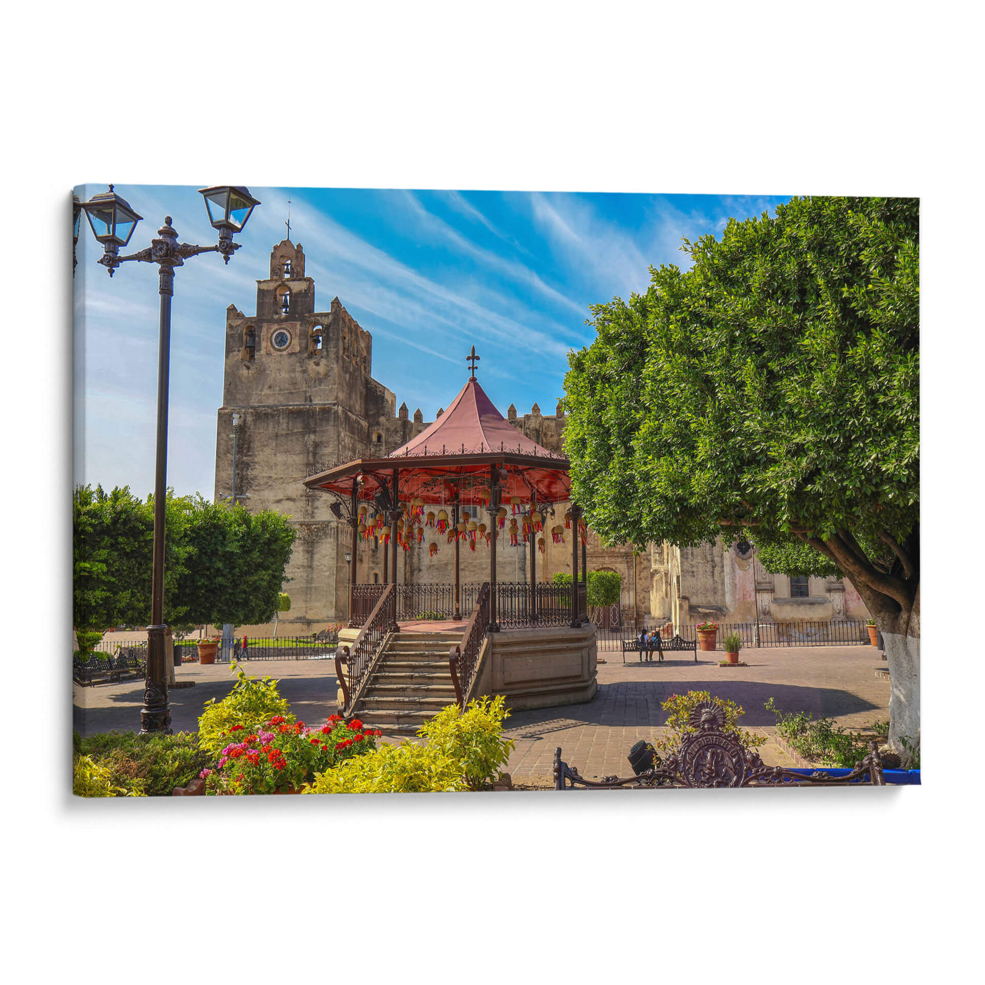 Capture la esencia vibrante de un pueblo mágico mexicano con este cautivador cuadro decorativo, "Yuridia Guanajuato", del artista Nosion. La obra transporta al espectador a una plaza pintoresca, dominada por un kiosco rojo adornado con festivas decoraciones que ondean suavemente. Detrás, se alza una imponente iglesia de piedra, testigo silencioso del paso del tiempo, con su campanario apuntando hacia un cielo azul intenso surcado por nubes alargadas. La composición se enriquece con la exuberante vegetación de árboles frondosos y flores coloridas en primer plano, creando un contraste dinámico entre la arquitectura histórica y la vitalidad de la naturaleza. Los tonos cálidos del kiosco y las flores se fusionan con la frescura del cielo y el verdor de los árboles, evocando una sensación de alegría y serenidad. Este cuadro es ideal para añadir un toque de encanto cultural y belleza escénica a cualquier sala de estar, comedor u oficina, convirtiéndose en un punto focal que invita a la contemplación y al disfrute de la atmósfera de un día soleado en México. Una pieza que celebra la arquitectura, la historia y la vida al aire libre, perfecta para quienes buscan arte con alma y narrativa.