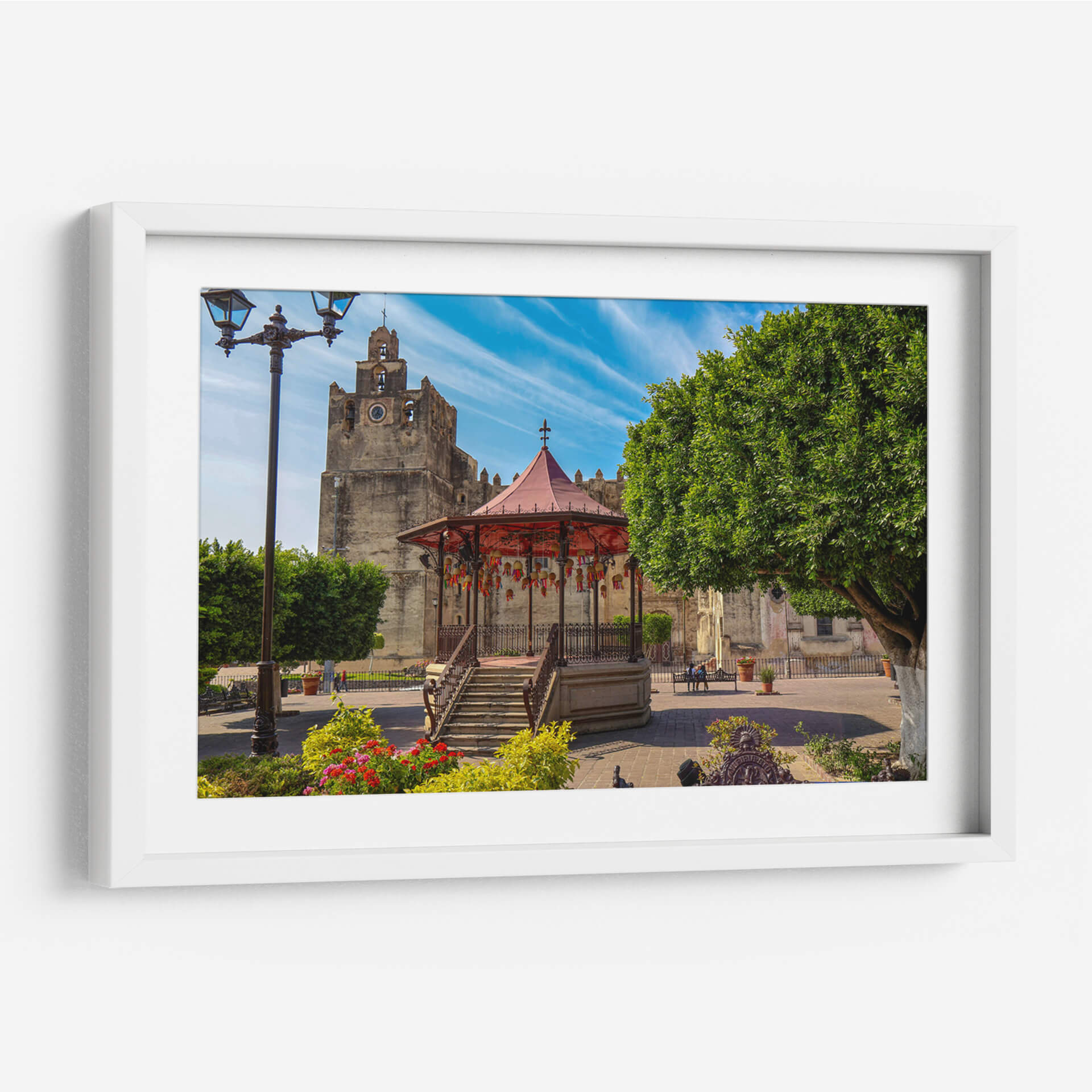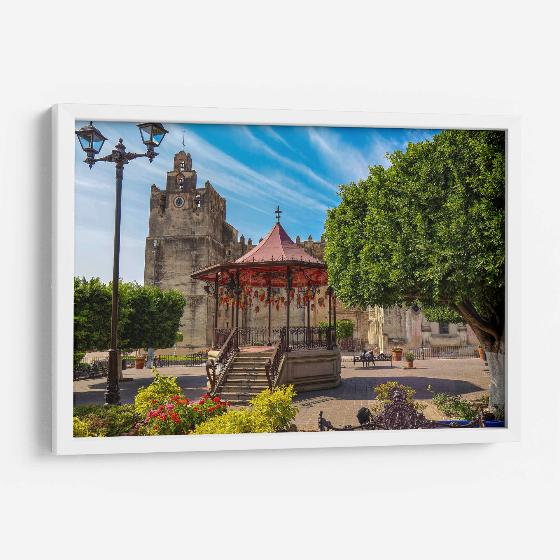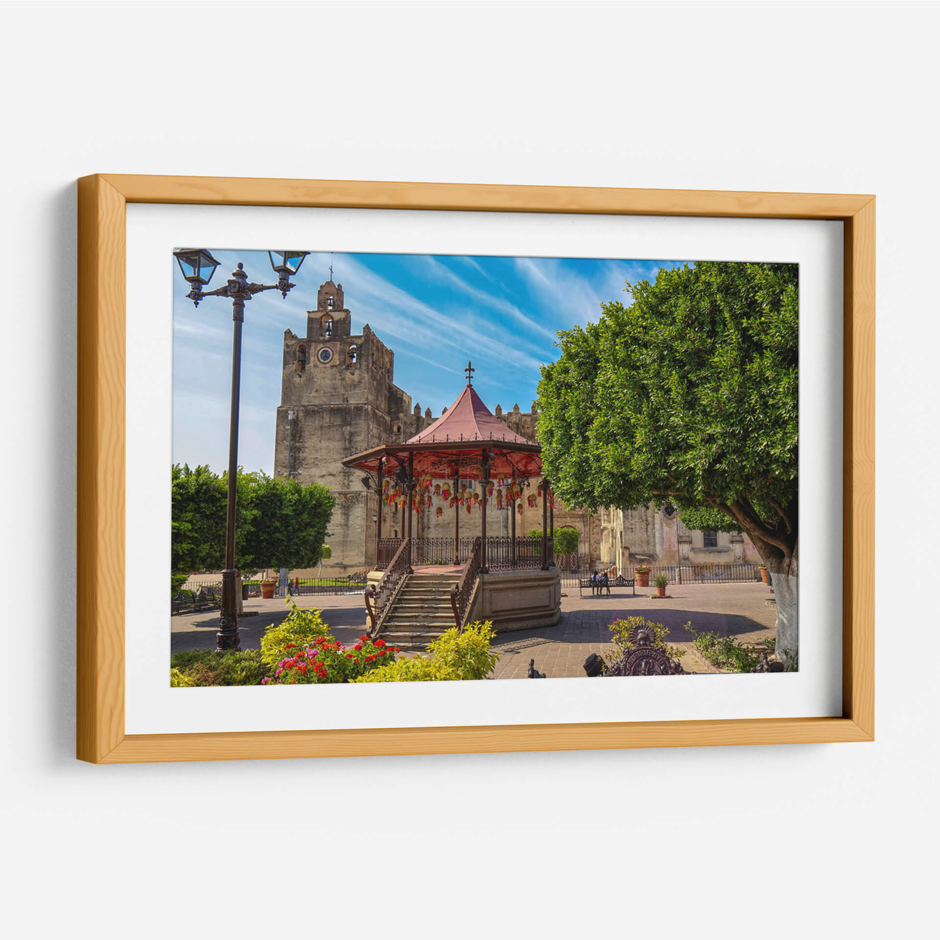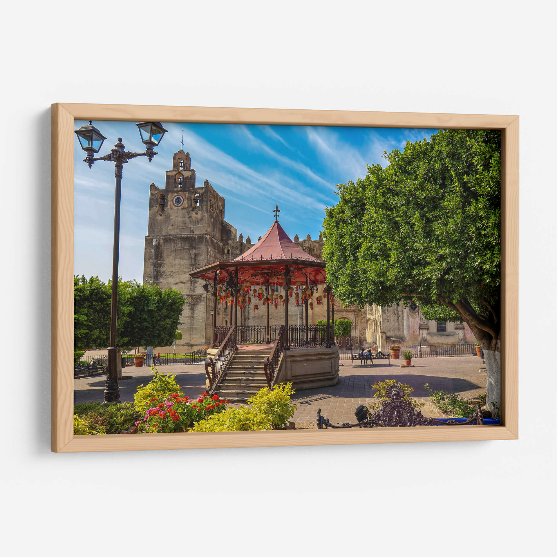 Capture la esencia vibrante de un pueblo mágico mexicano con este cautivador cuadro decorativo, "Yuridia Guanajuato", del artista Nosion. La obra transporta al espectador a una plaza pintoresca, dominada por un kiosco rojo adornado con festivas decoraciones que ondean suavemente. Detrás, se alza una imponente iglesia de piedra, testigo silencioso del paso del tiempo, con su campanario apuntando hacia un cielo azul intenso surcado por nubes alargadas. La composición se enriquece con la exuberante vegetación de árboles frondosos y flores coloridas en primer plano, creando un contraste dinámico entre la arquitectura histórica y la vitalidad de la naturaleza. Los tonos cálidos del kiosco y las flores se fusionan con la frescura del cielo y el verdor de los árboles, evocando una sensación de alegría y serenidad. Este cuadro es ideal para añadir un toque de encanto cultural y belleza escénica a cualquier sala de estar, comedor u oficina, convirtiéndose en un punto focal que invita a la contemplación y al disfrute de la atmósfera de un día soleado en México. Una pieza que celebra la arquitectura, la historia y la vida al aire libre, perfecta para quienes buscan arte con alma y narrativa.